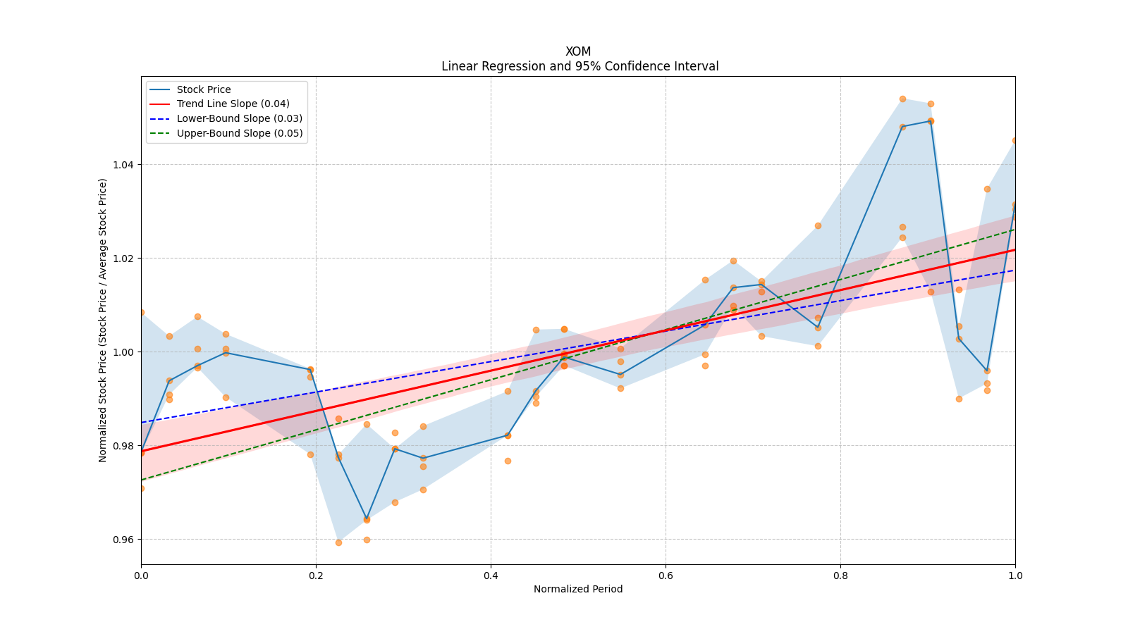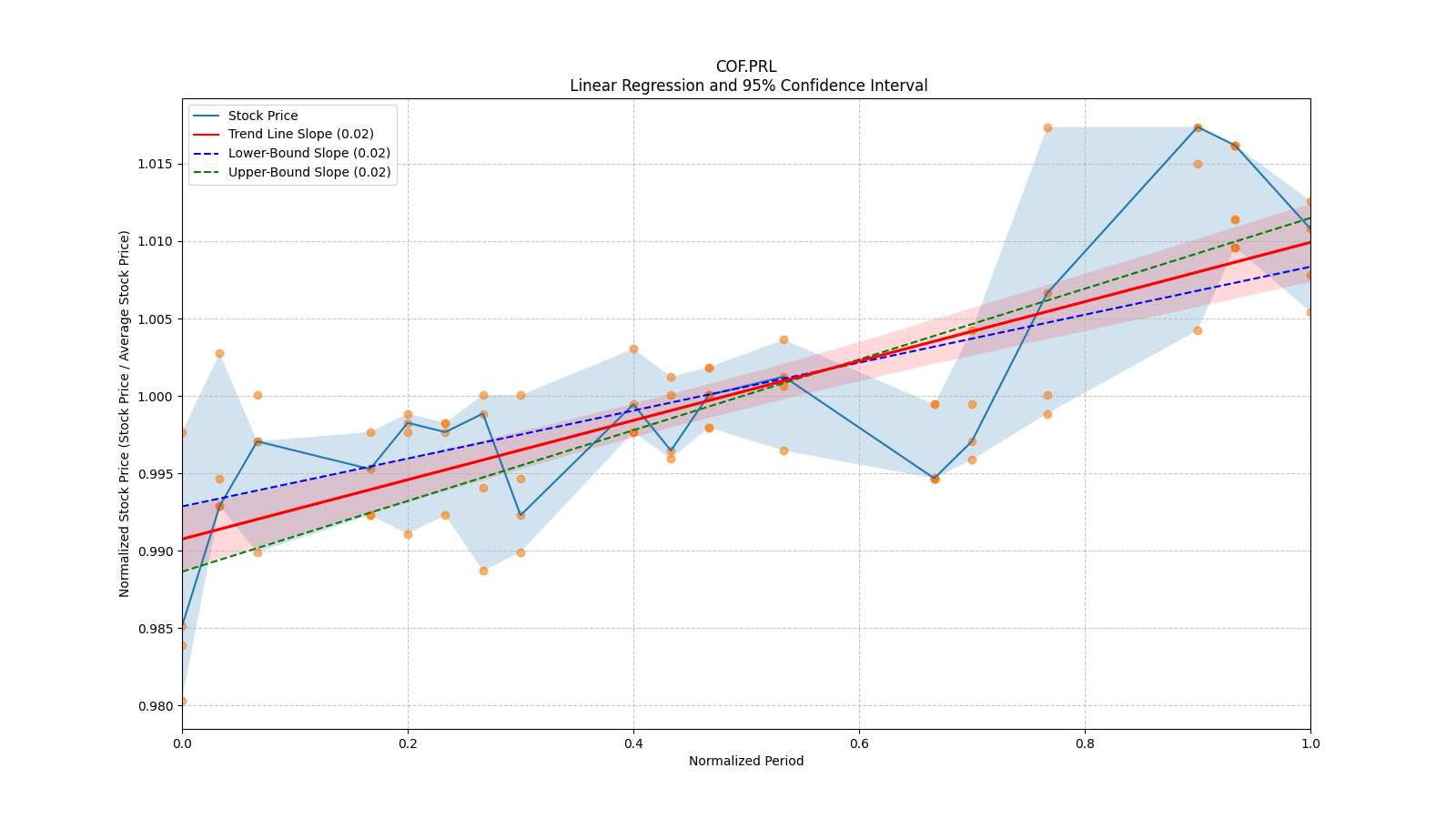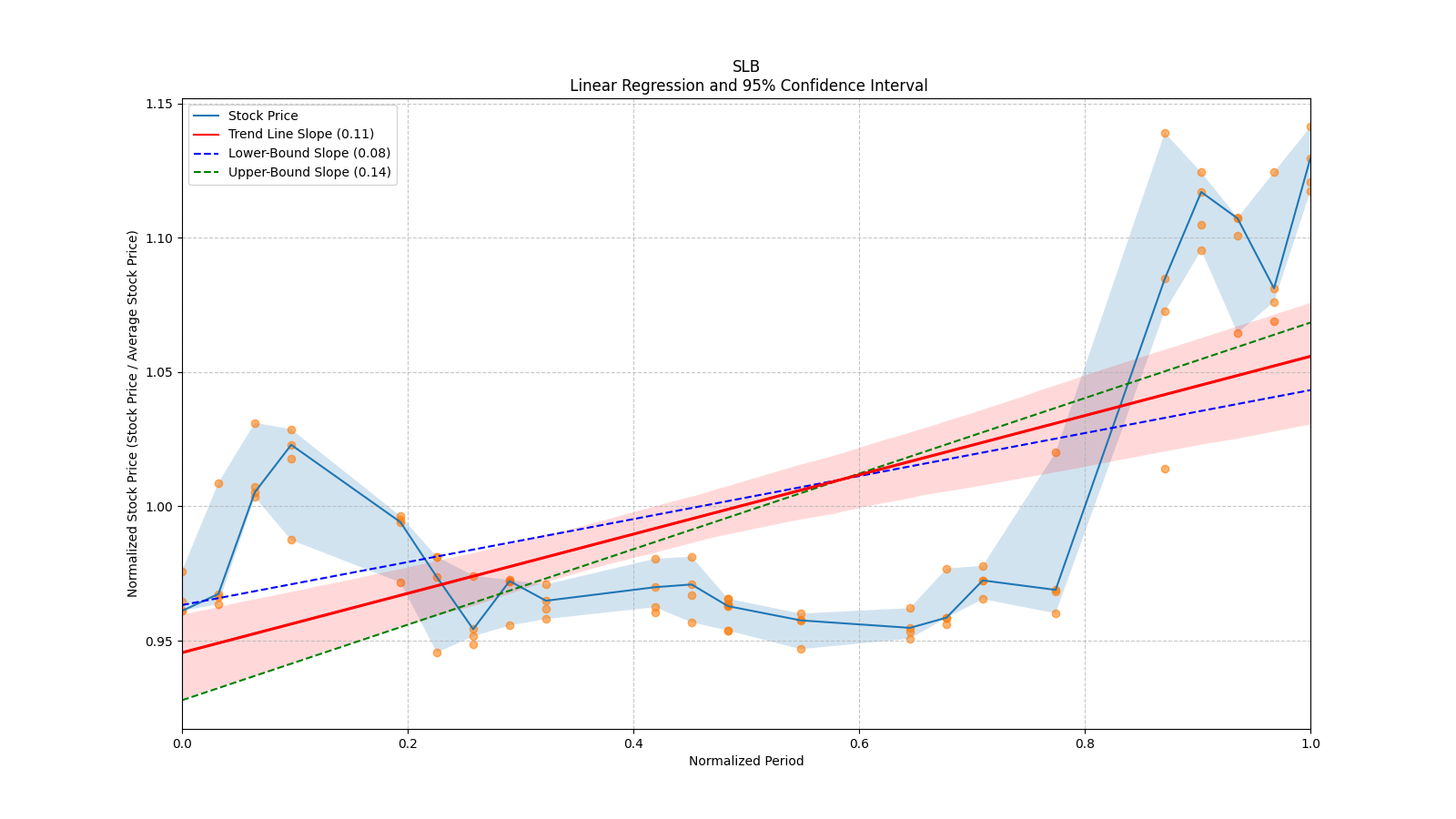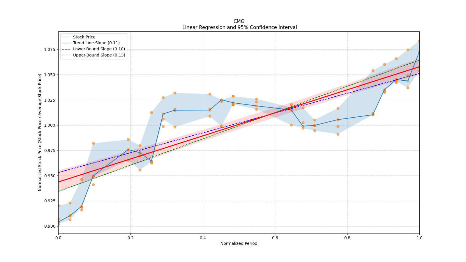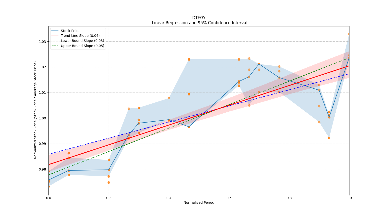 Stocks were filtered to have a high investor grade, analyzed using linear regression, and sorted by the lower-bound trendline slope. The lower-bound trendline slope has been normalized by the average stock price and calculated using a 95% confidence interval. This statistic provides a conservative estimate of stock price percentage growth, taking into account both the trends and volatility of the stock price over the past month. With these details, you can easily compare stocks by their historical performance.