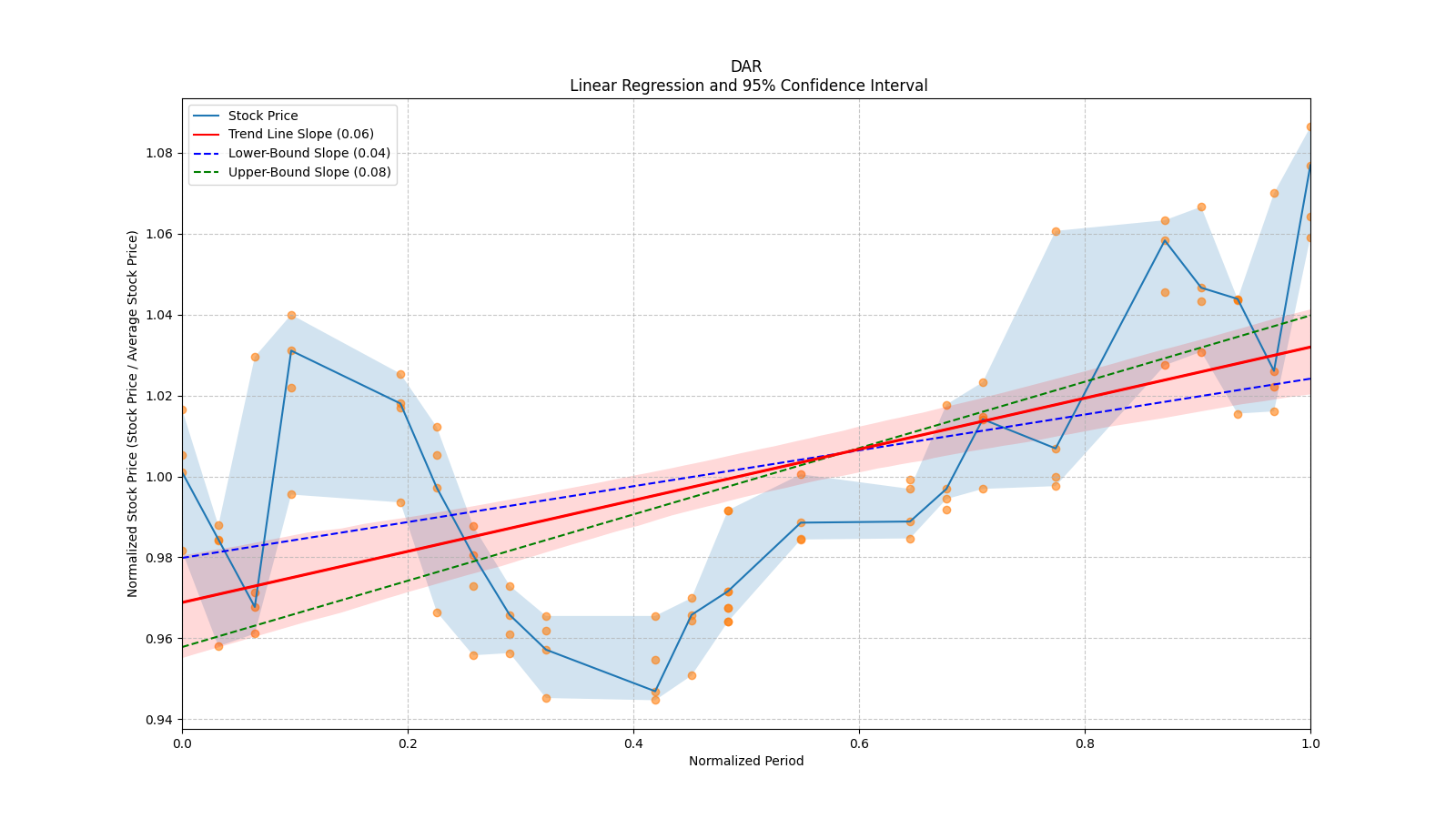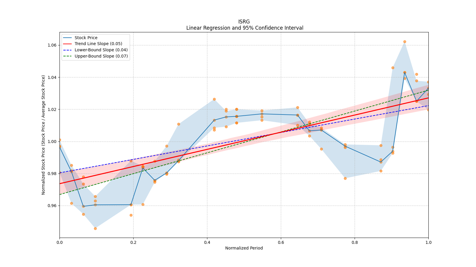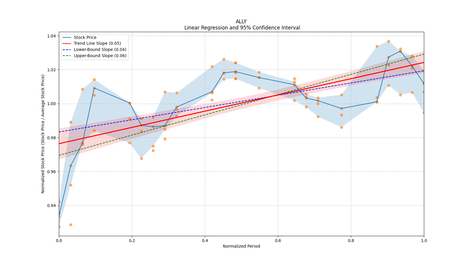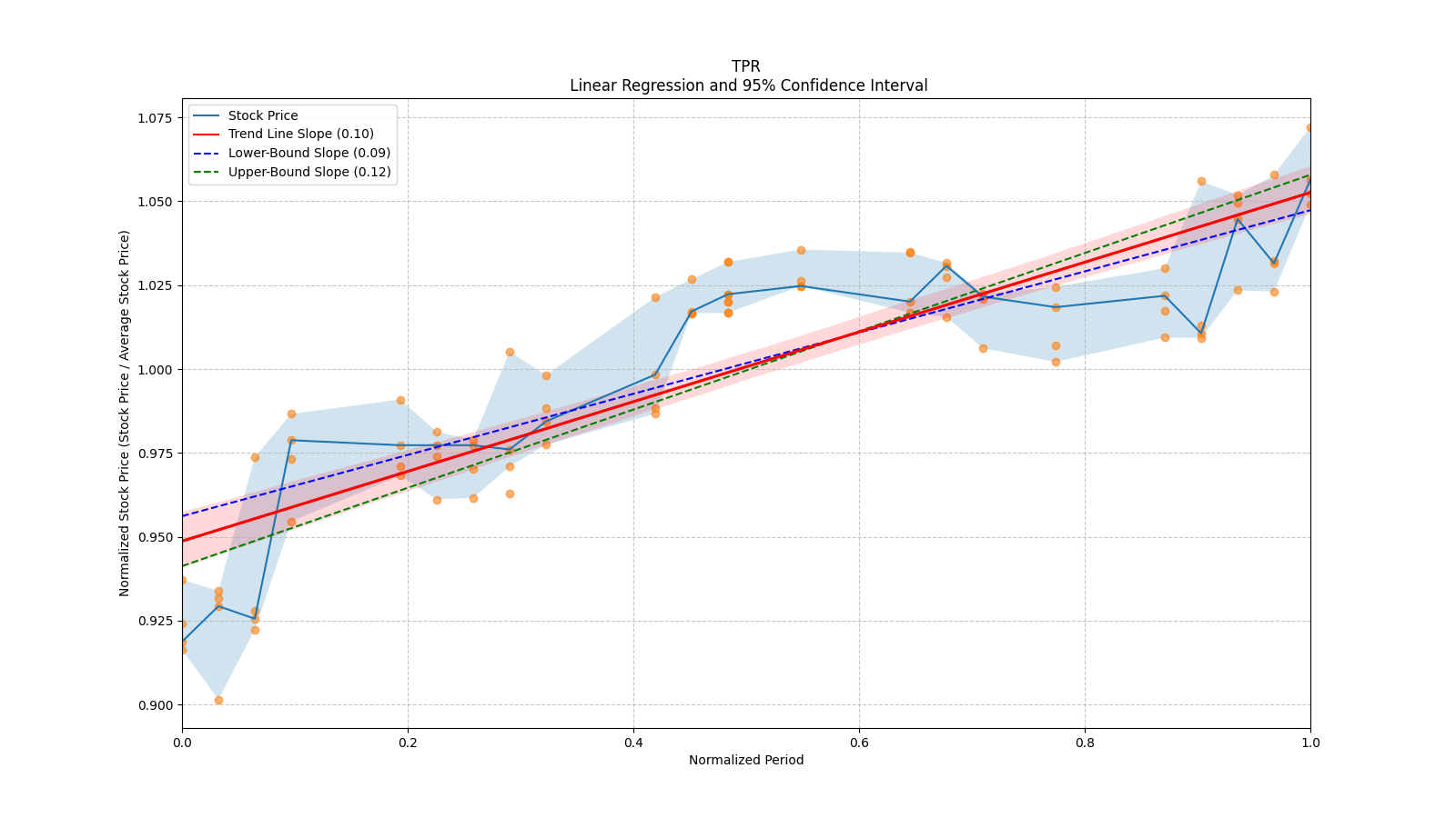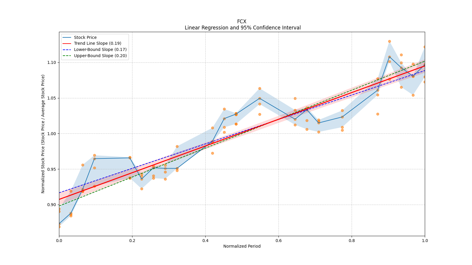 Stocks were filtered to have a high investor grade, analyzed using linear regression, and sorted by the lower-bound trendline slope. The lower-bound trendline slope has been normalized by the average stock price and calculated using a 95% confidence interval. This statistic provides a conservative estimate of stock price percentage growth, taking into account both the trends and volatility of the stock price over the past month. With these details, you can easily compare stocks by their historical performance.