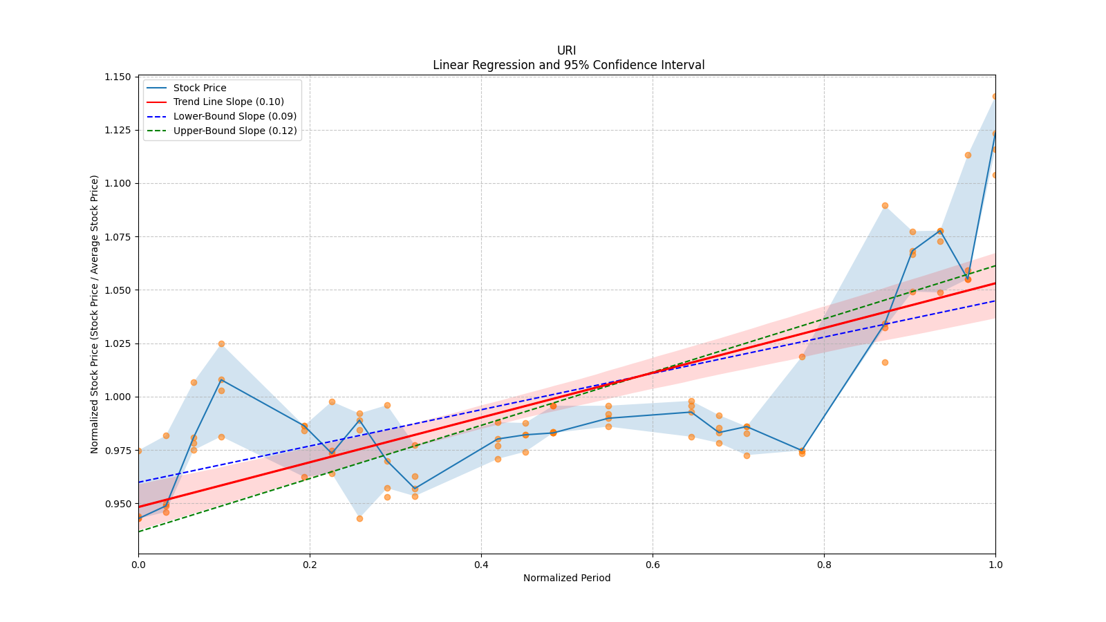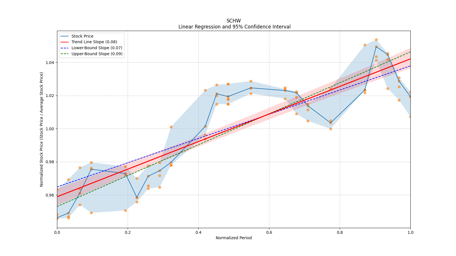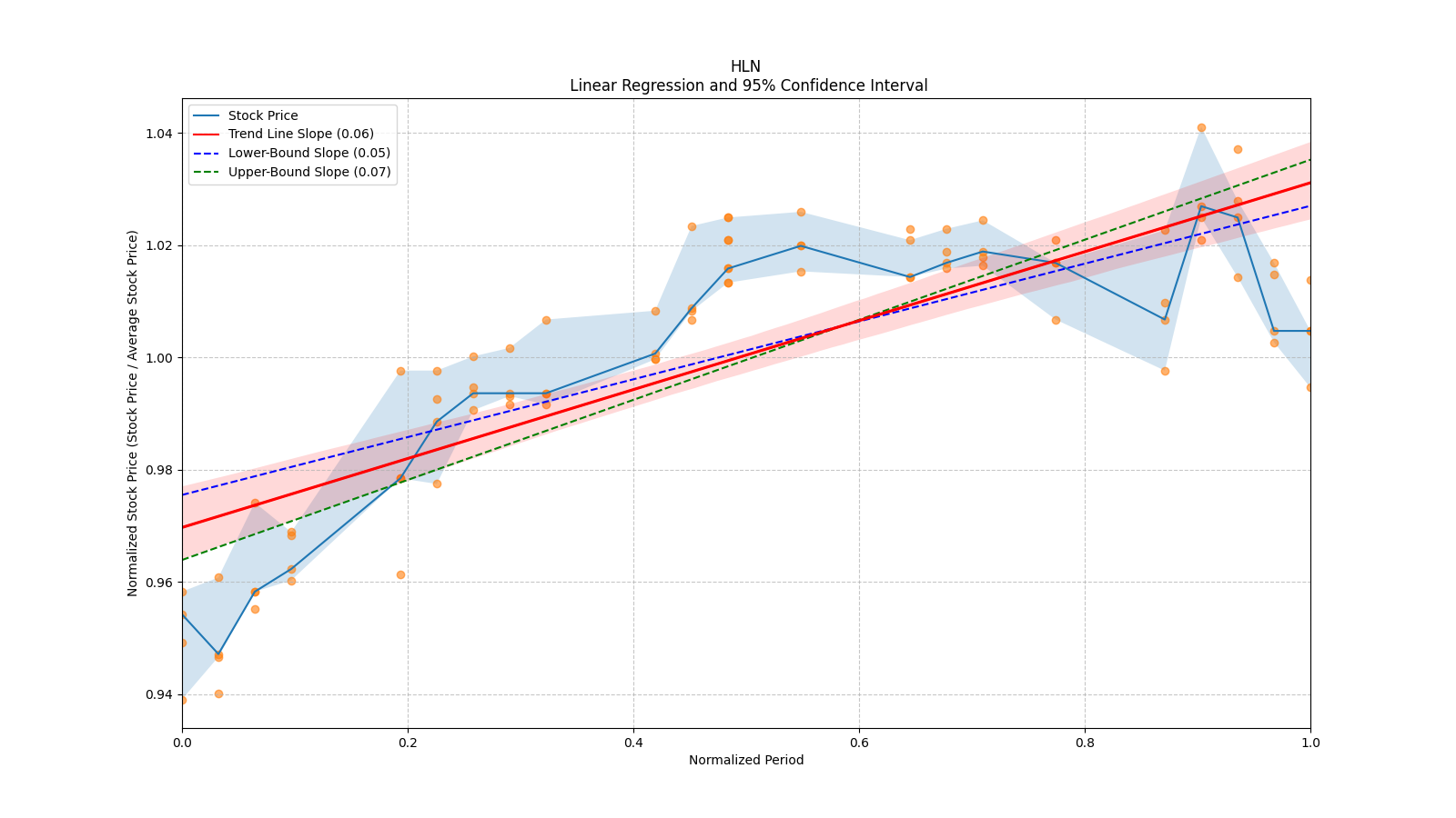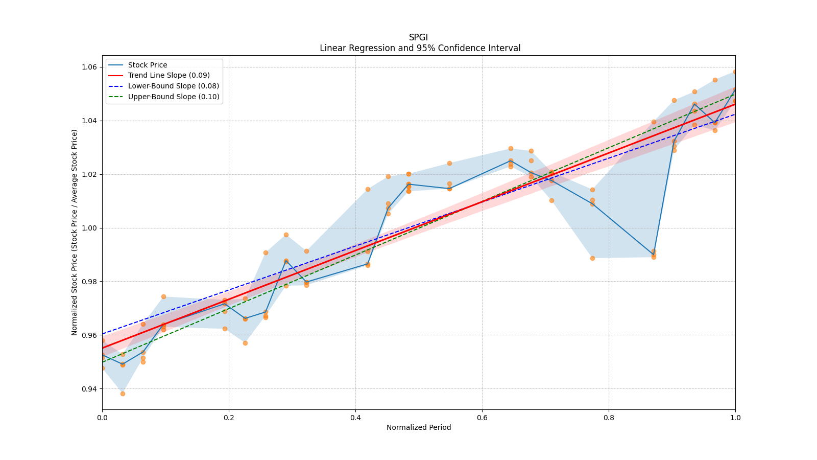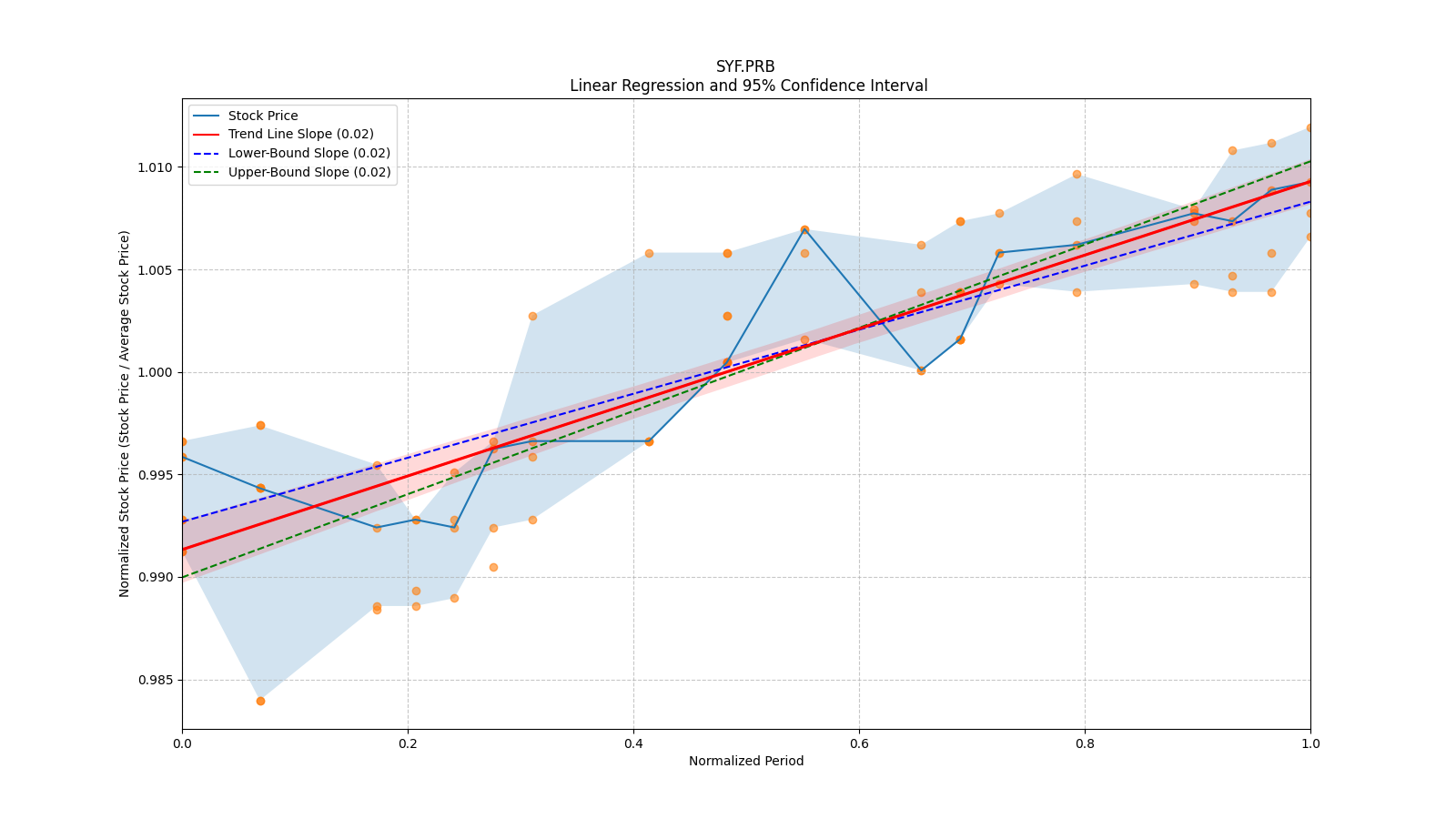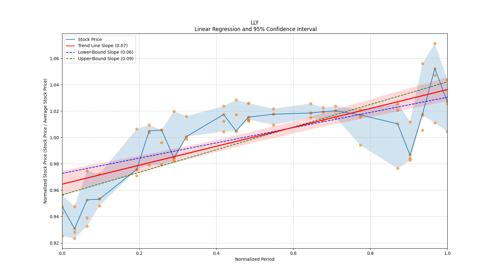 Stocks were filtered to have a high investor grade, analyzed using linear regression, and sorted by the lower-bound trendline slope. The lower-bound trendline slope has been normalized by the average stock price and calculated using a 95% confidence interval. This statistic provides a conservative estimate of stock price percentage growth, taking into account both the trends and volatility of the stock price over the past month. With these details, you can easily compare stocks by their historical performance.