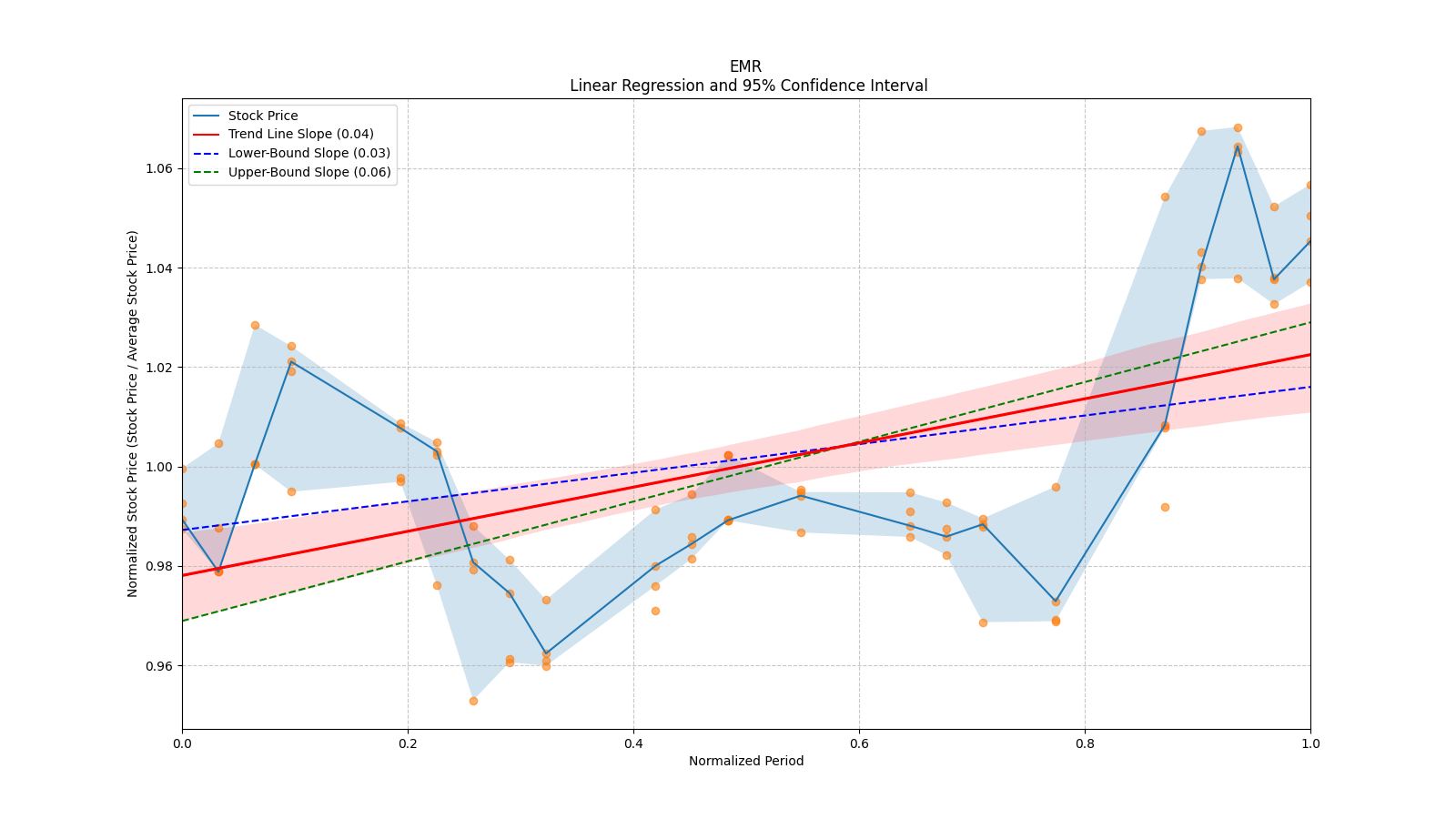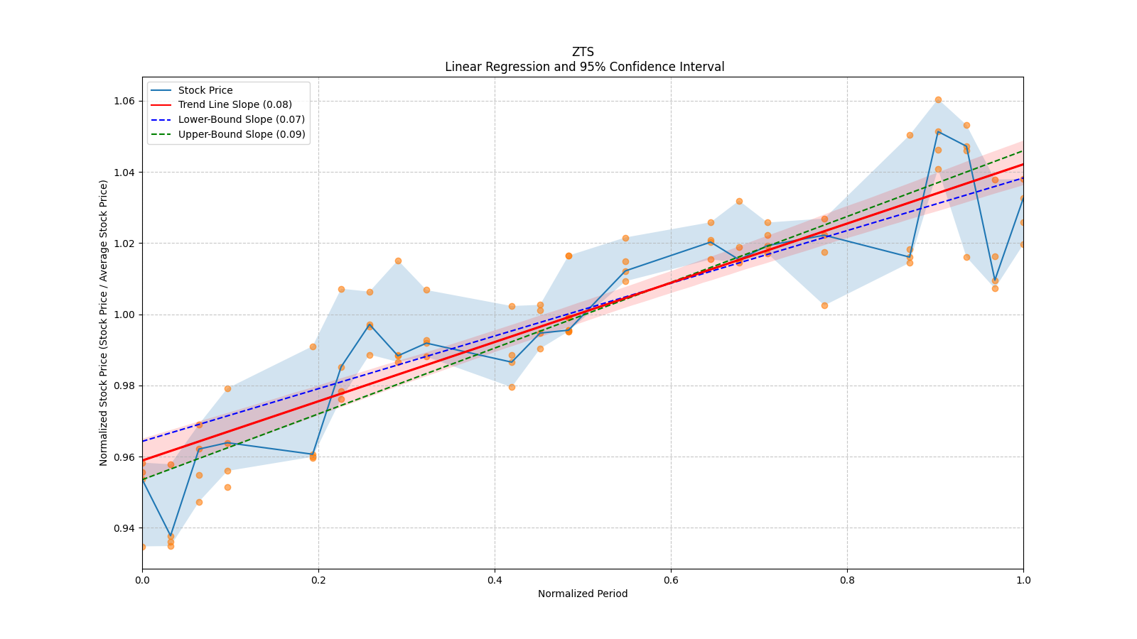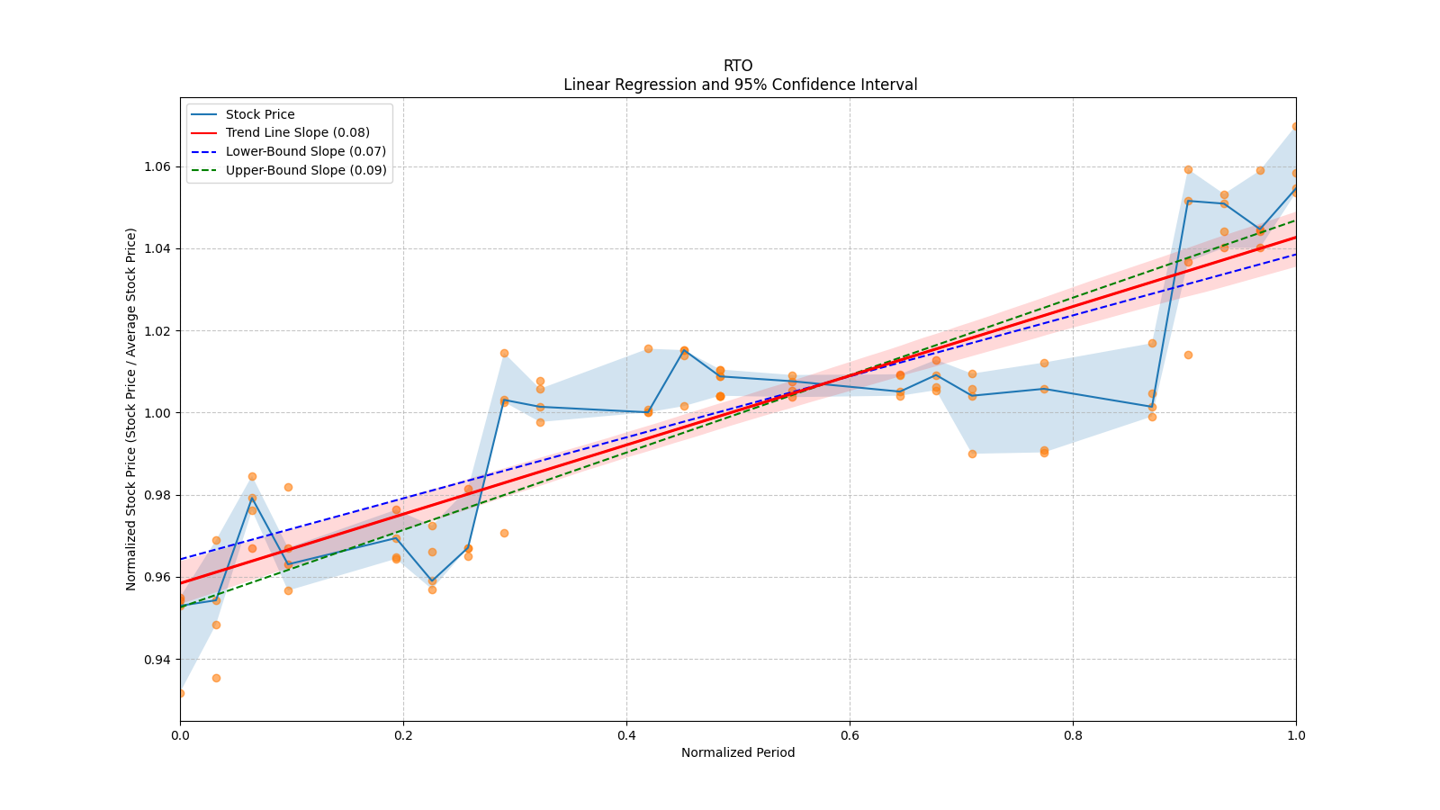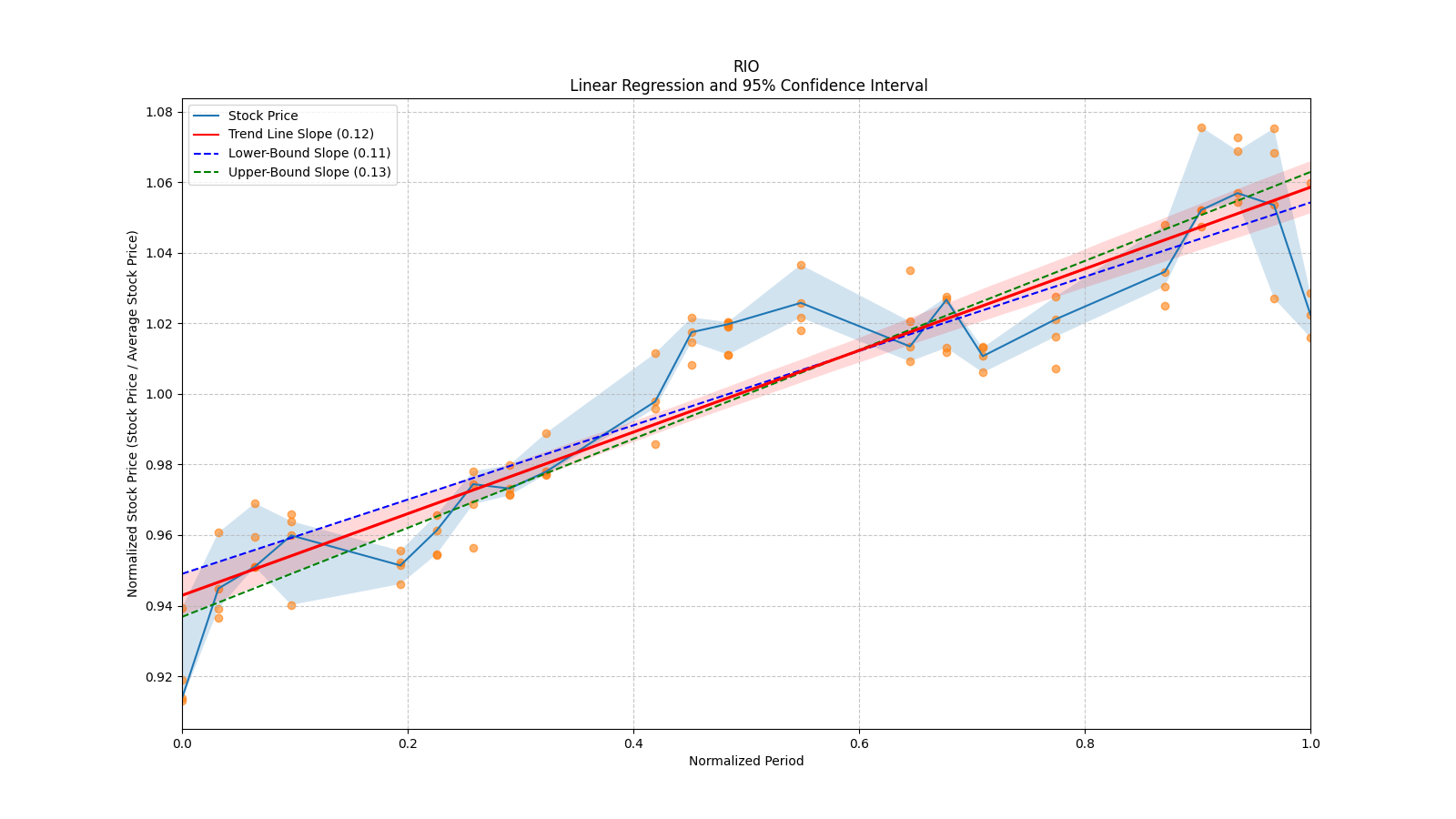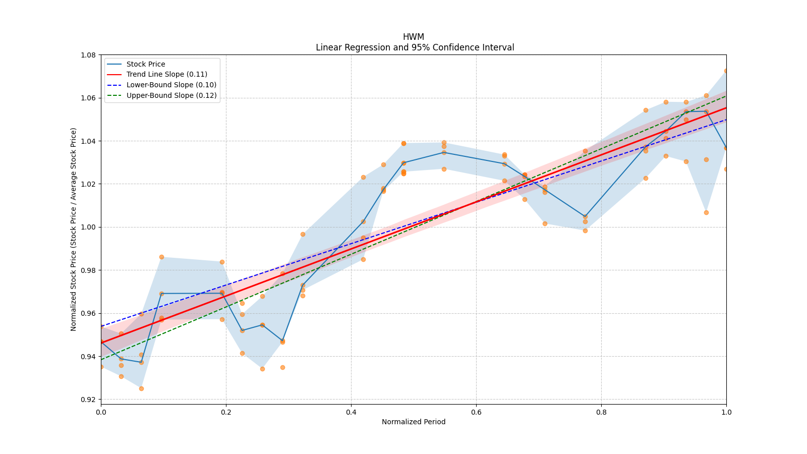 Stocks were filtered to have a high investor grade, analyzed using linear regression, and sorted by the lower-bound trendline slope. The lower-bound trendline slope has been normalized by the average stock price and calculated using a 95% confidence interval. This statistic provides a conservative estimate of stock price percentage growth, taking into account both the trends and volatility of the stock price over the past month. With these details, you can easily compare stocks by their historical performance.