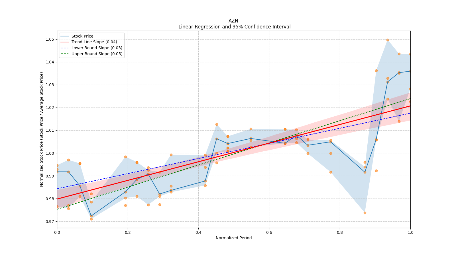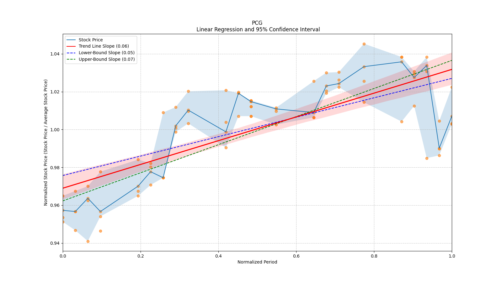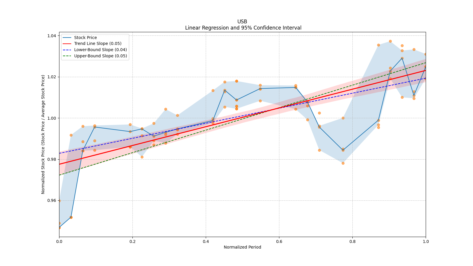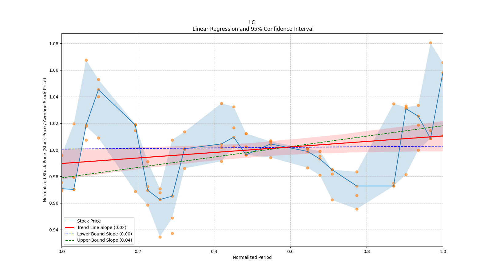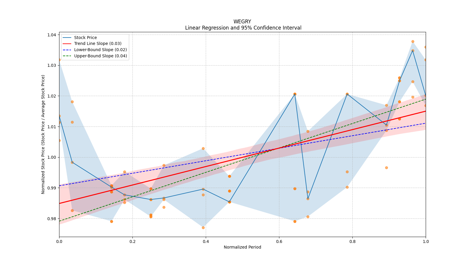 Stocks were filtered to have a high investor grade, analyzed using linear regression, and sorted by the lower-bound trendline slope. The lower-bound trendline slope has been normalized by the average stock price and calculated using a 95% confidence interval. This statistic provides a conservative estimate of stock price percentage growth, taking into account both the trends and volatility of the stock price over the past month. With these details, you can easily compare stocks by their historical performance.