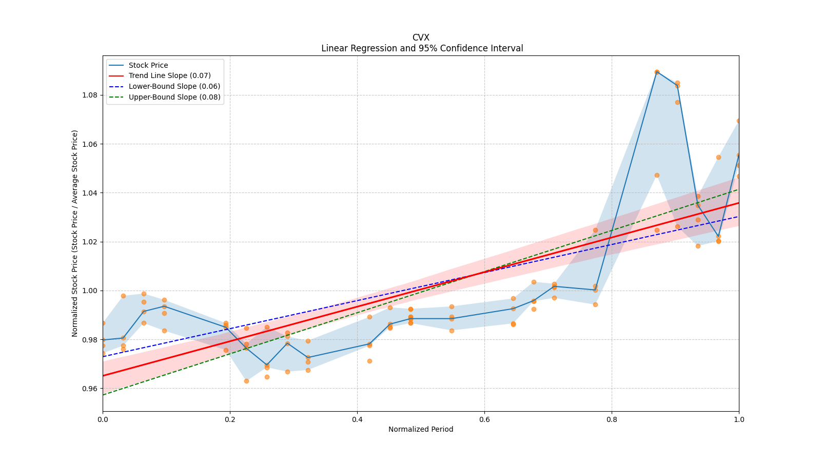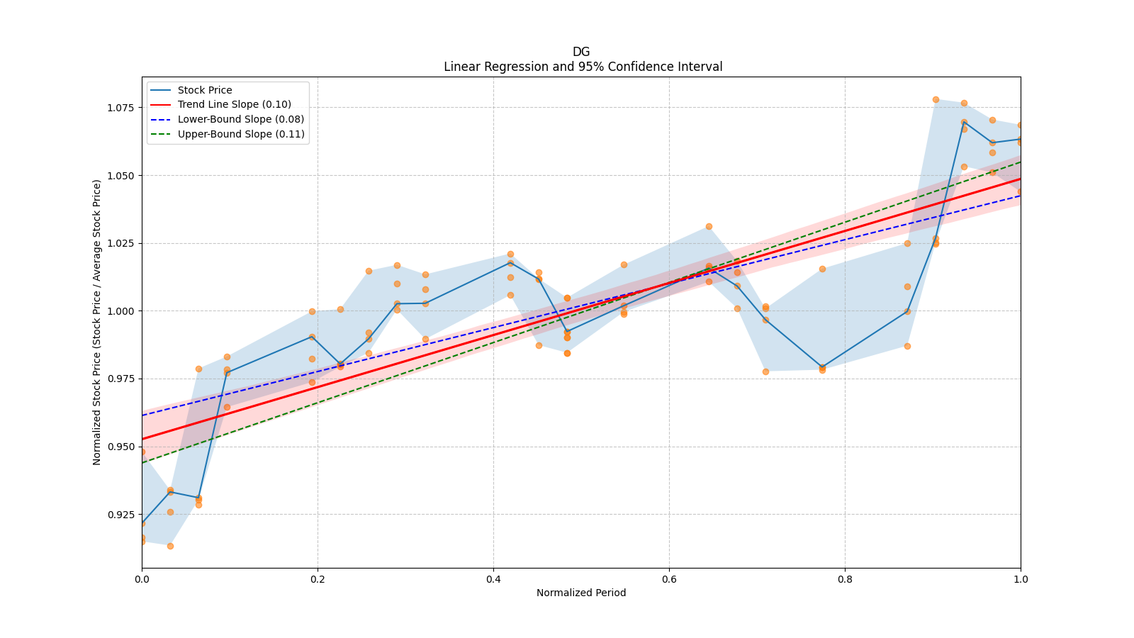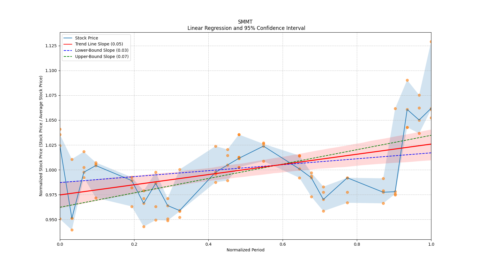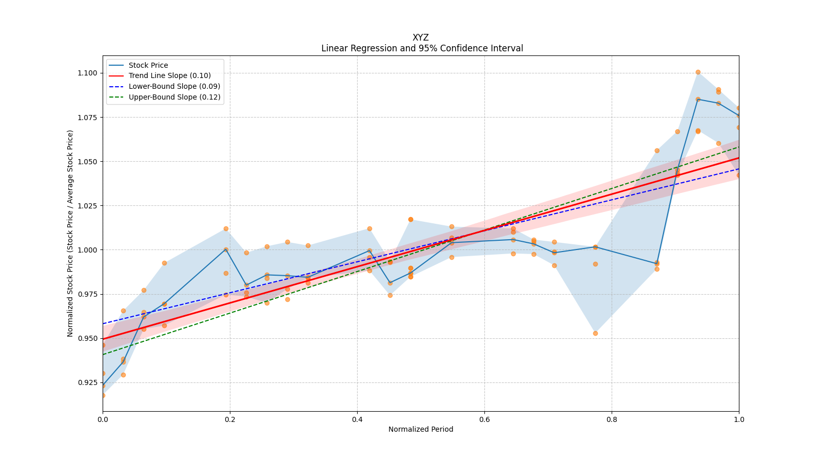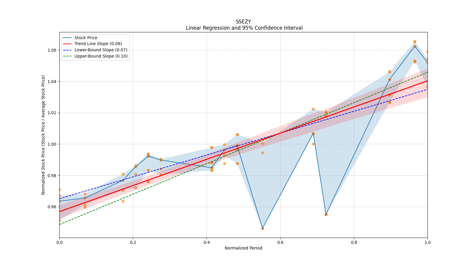Stocks were filtered to have a high investor grade, analyzed using linear regression, and sorted by the lower-bound trendline slope. The lower-bound trendline slope has been normalized by the average stock price and calculated using a 95% confidence interval. This statistic provides a conservative estimate of stock price percentage growth, taking into account both the trends and volatility of the stock price over the past month. With these details, you can easily compare stocks by their historical performance.