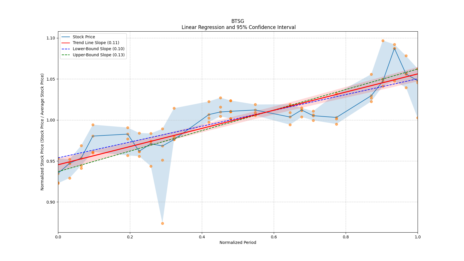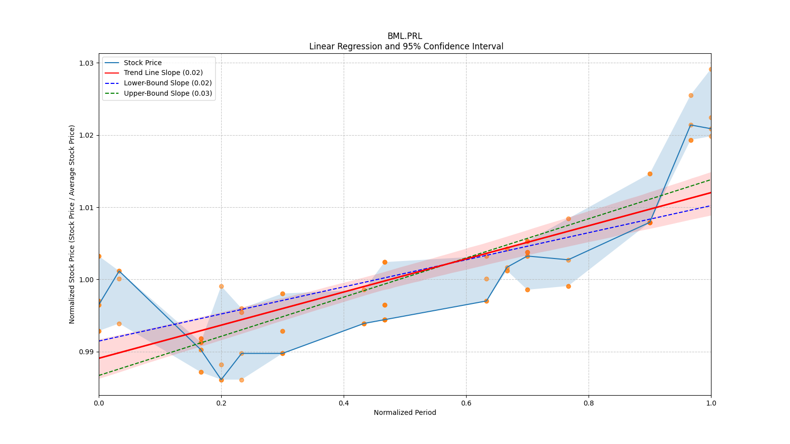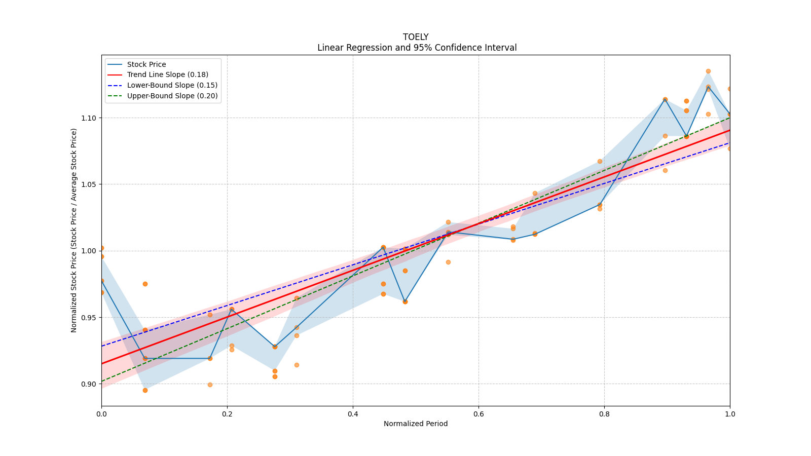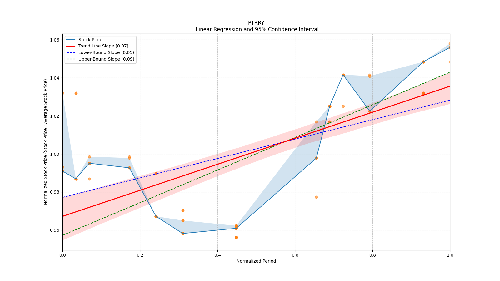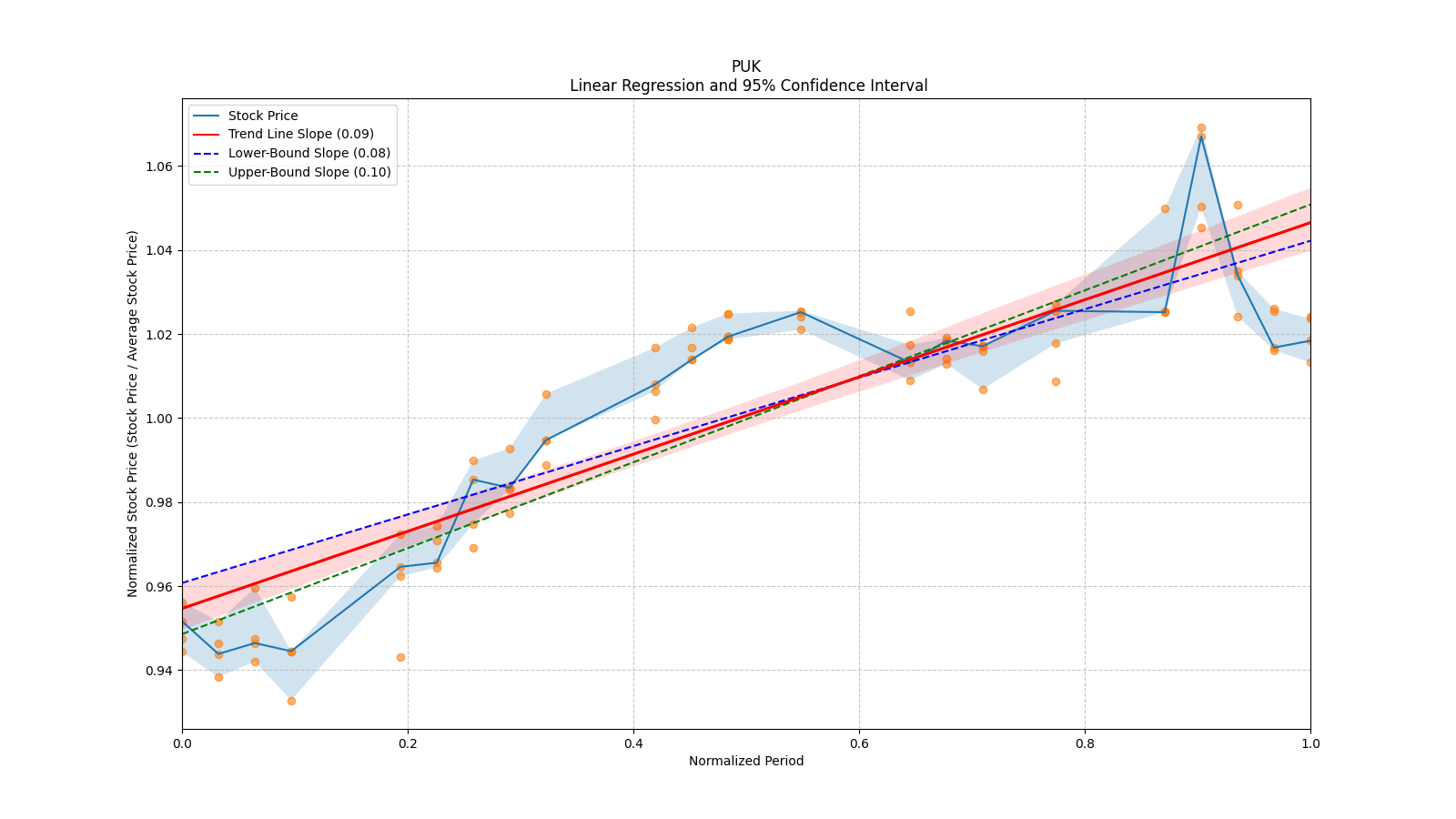 Stocks were filtered to have a high investor grade, analyzed using linear regression, and sorted by the lower-bound trendline slope. The lower-bound trendline slope has been normalized by the average stock price and calculated using a 95% confidence interval. This statistic provides a conservative estimate of stock price percentage growth, taking into account both the trends and volatility of the stock price over the past month. With these details, you can easily compare stocks by their historical performance.