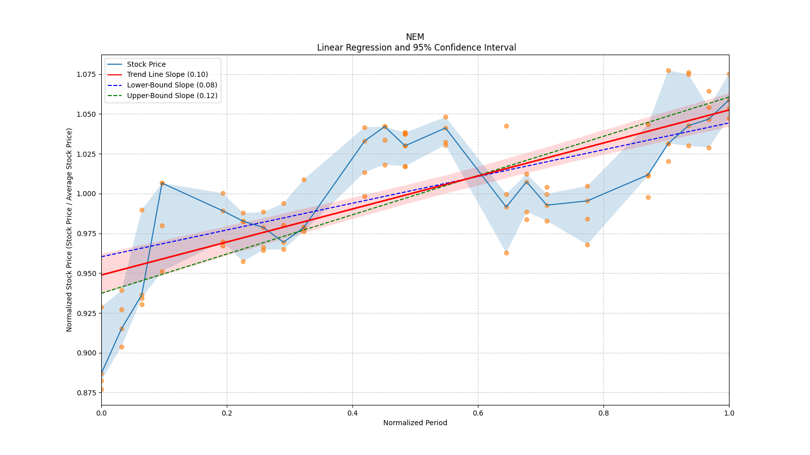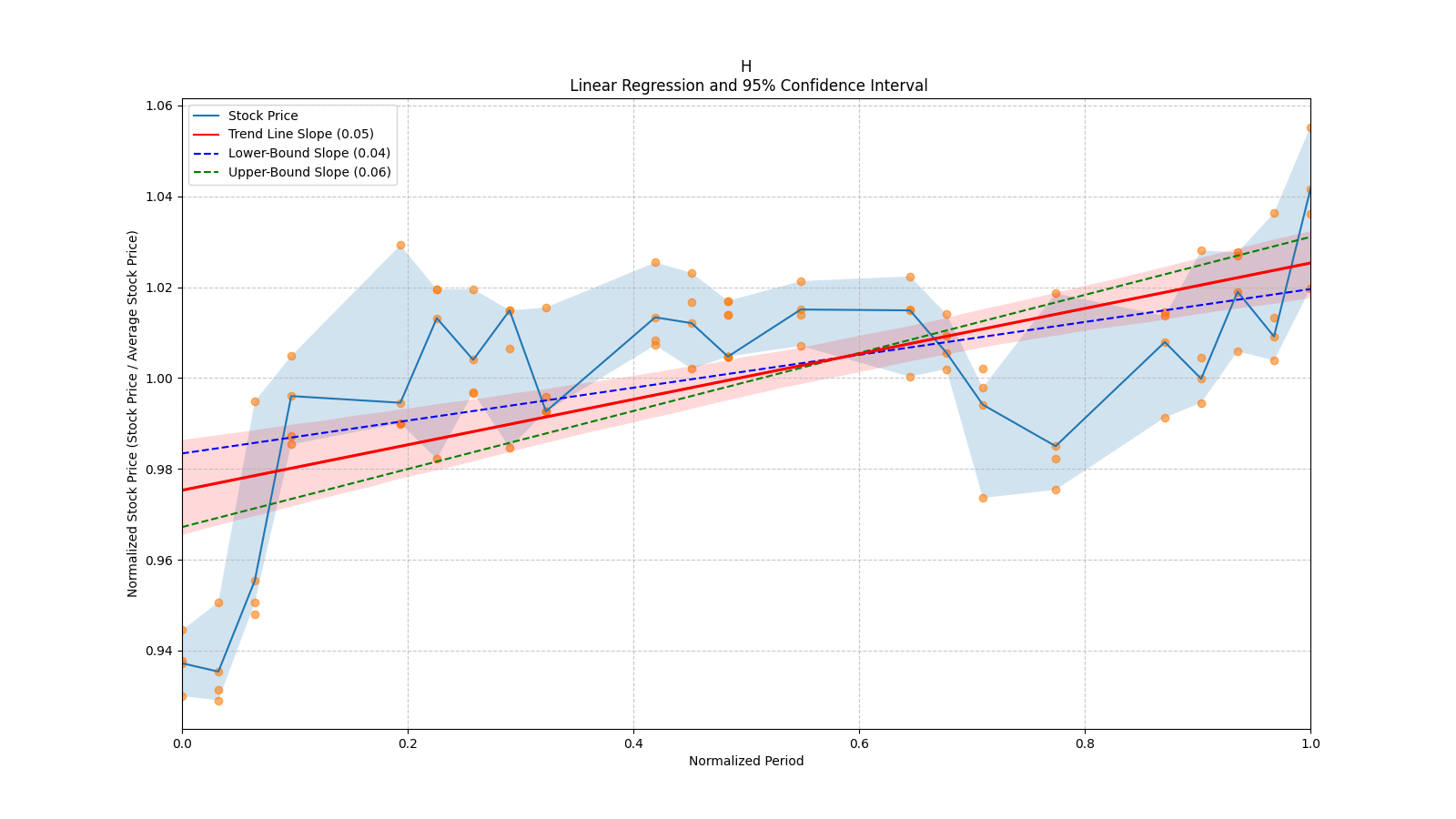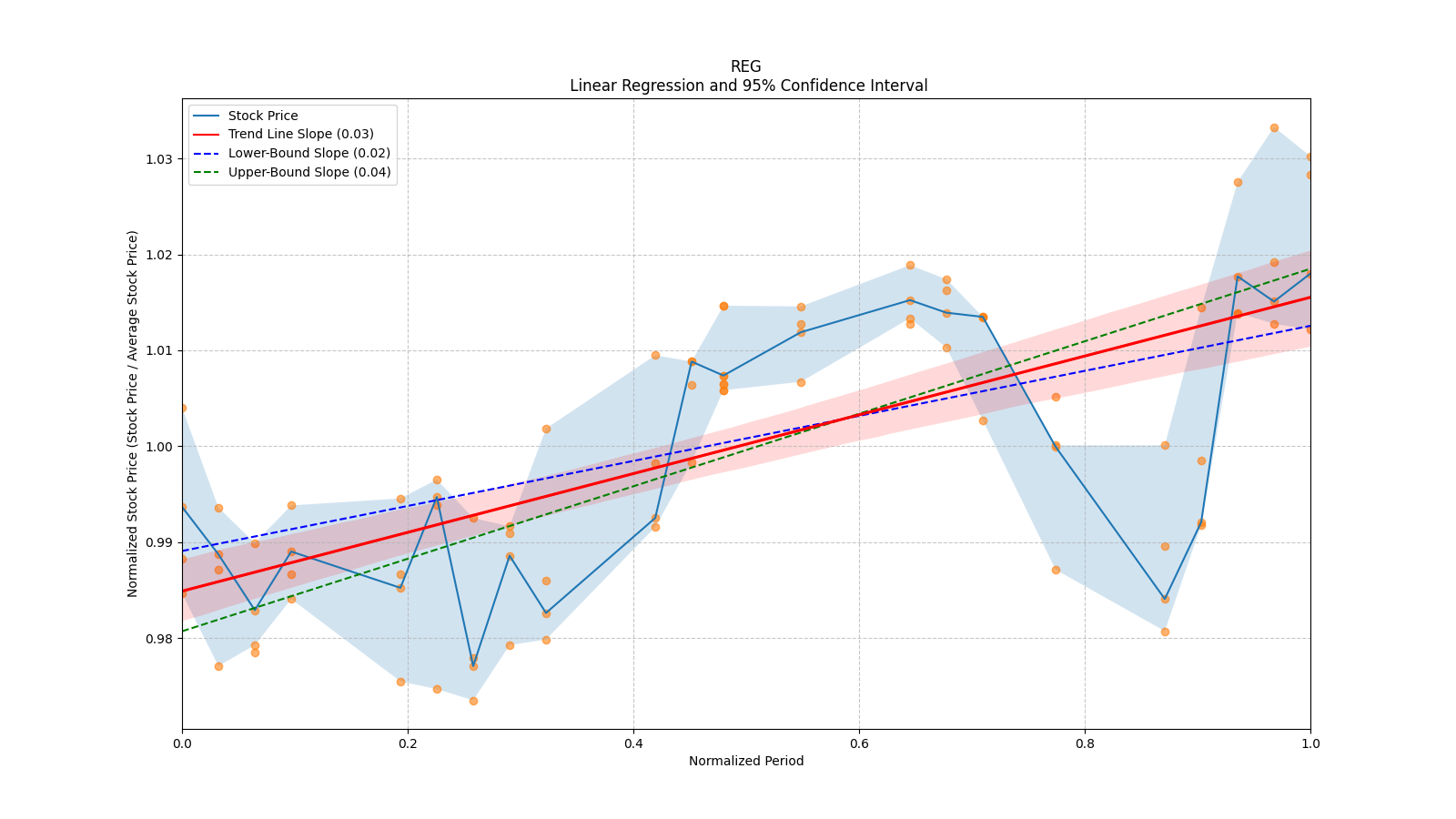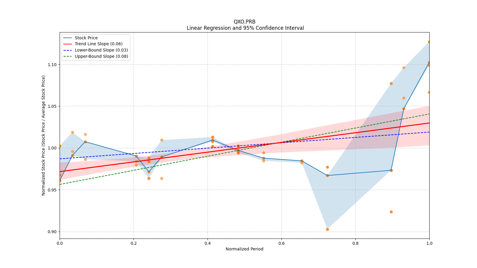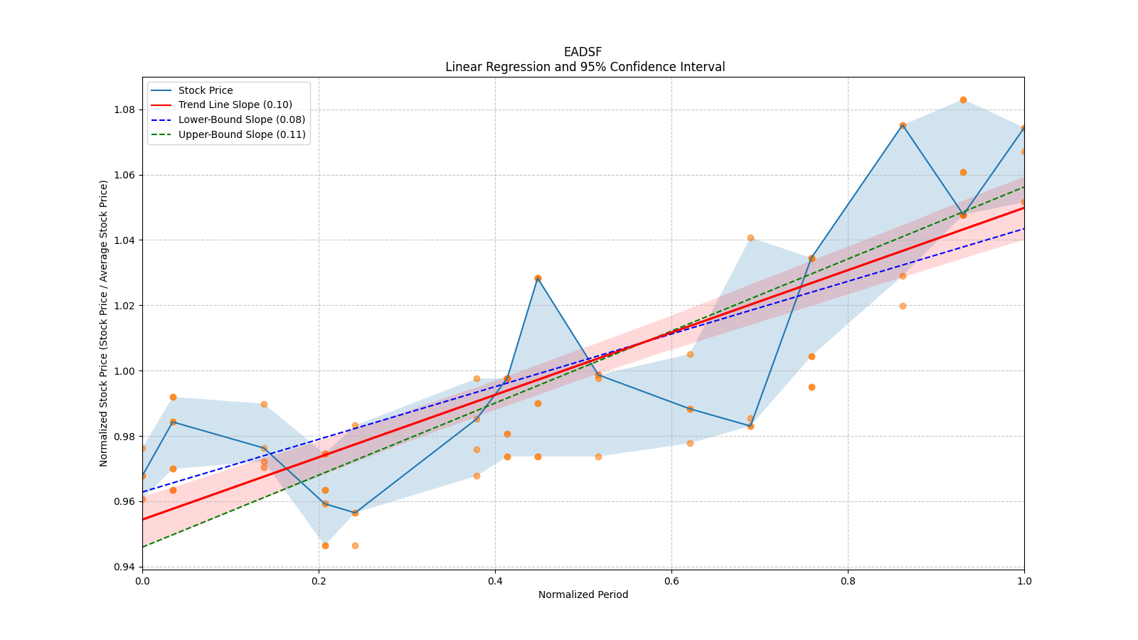Stocks were filtered to have a high investor grade, analyzed using linear regression, and sorted by the lower-bound trendline slope. The lower-bound trendline slope has been normalized by the average stock price and calculated using a 95% confidence interval. This statistic provides a conservative estimate of stock price percentage growth, taking into account both the trends and volatility of the stock price over the past month. With these details, you can easily compare stocks by their historical performance.