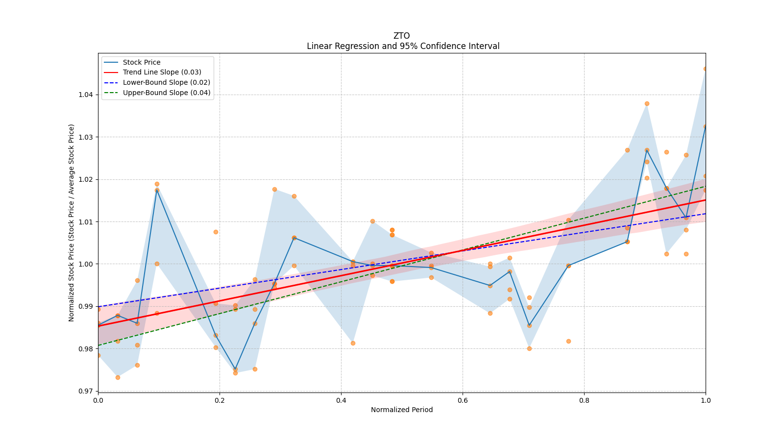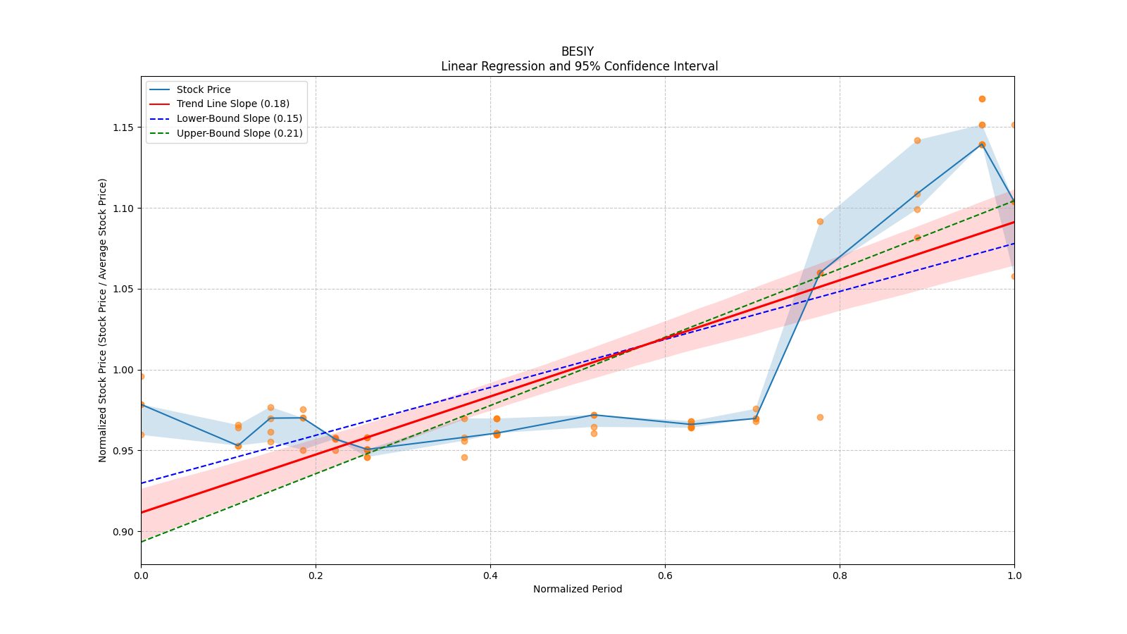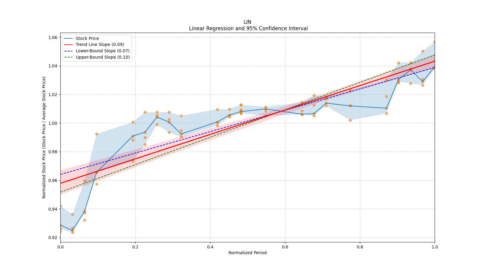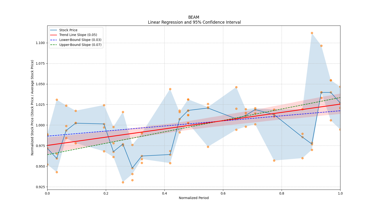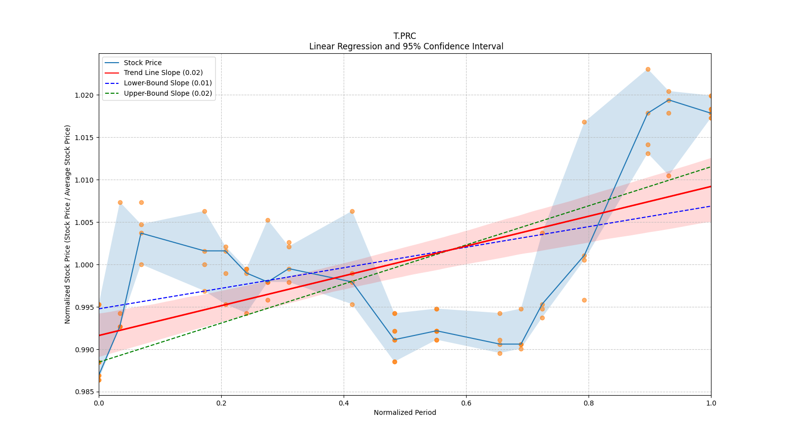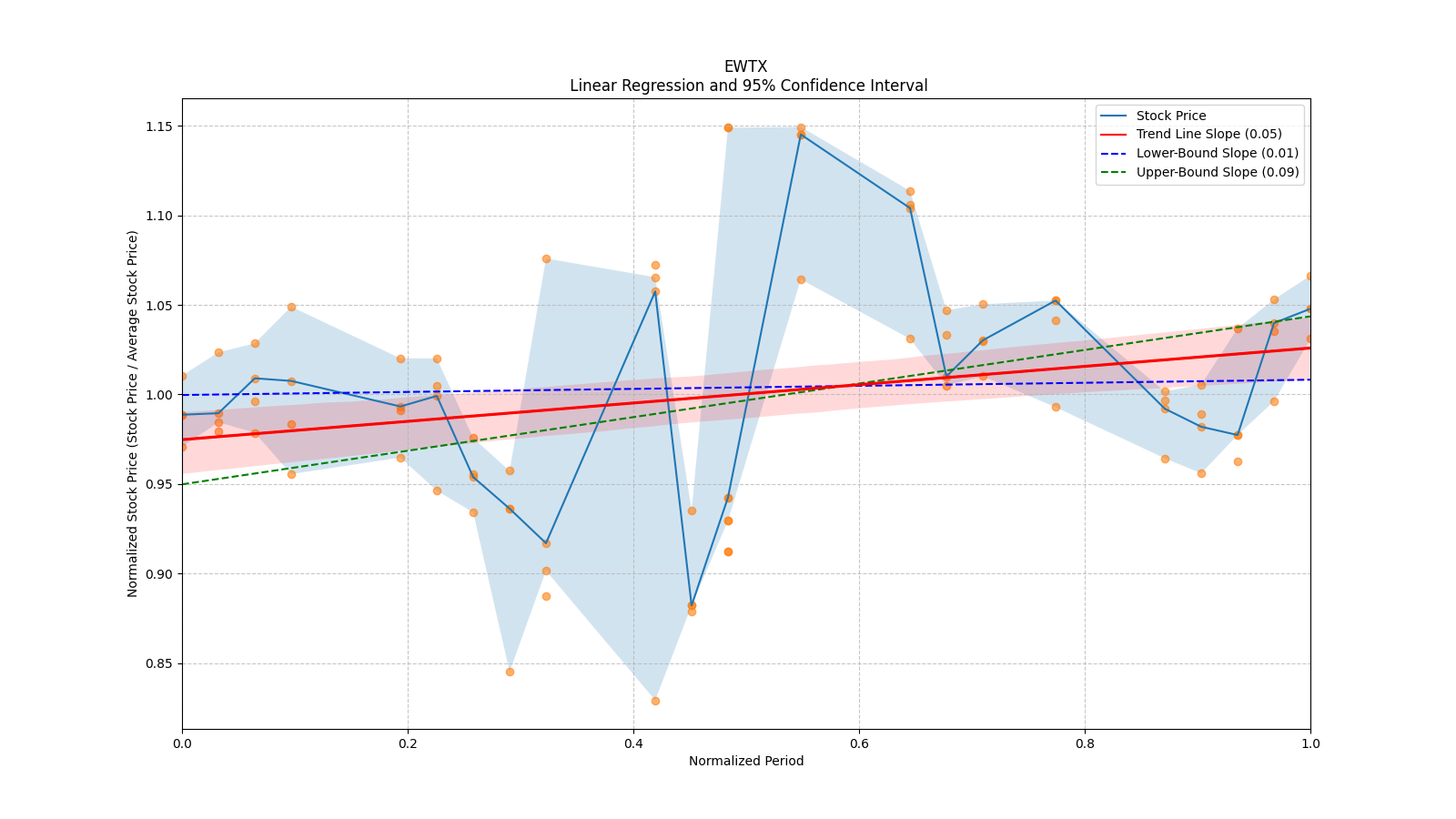 Stocks were filtered to have a high investor grade, analyzed using linear regression, and sorted by the lower-bound trendline slope. The lower-bound trendline slope has been normalized by the average stock price and calculated using a 95% confidence interval. This statistic provides a conservative estimate of stock price percentage growth, taking into account both the trends and volatility of the stock price over the past month. With these details, you can easily compare stocks by their historical performance.