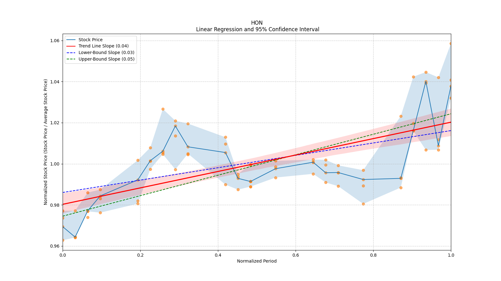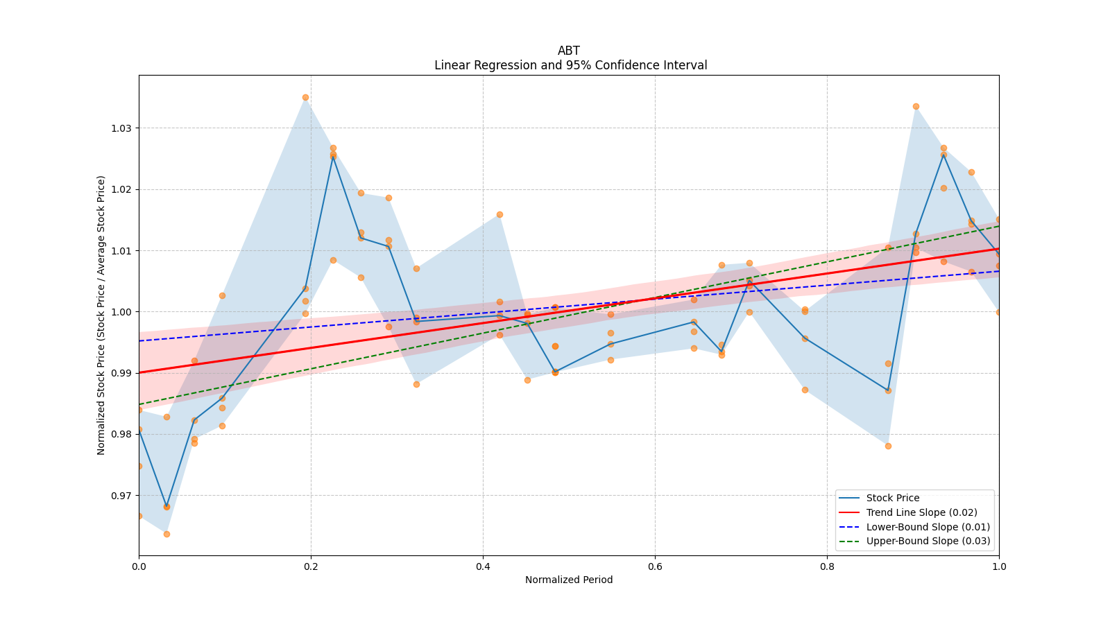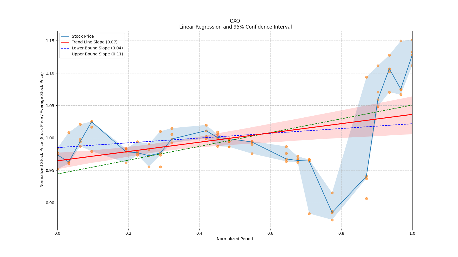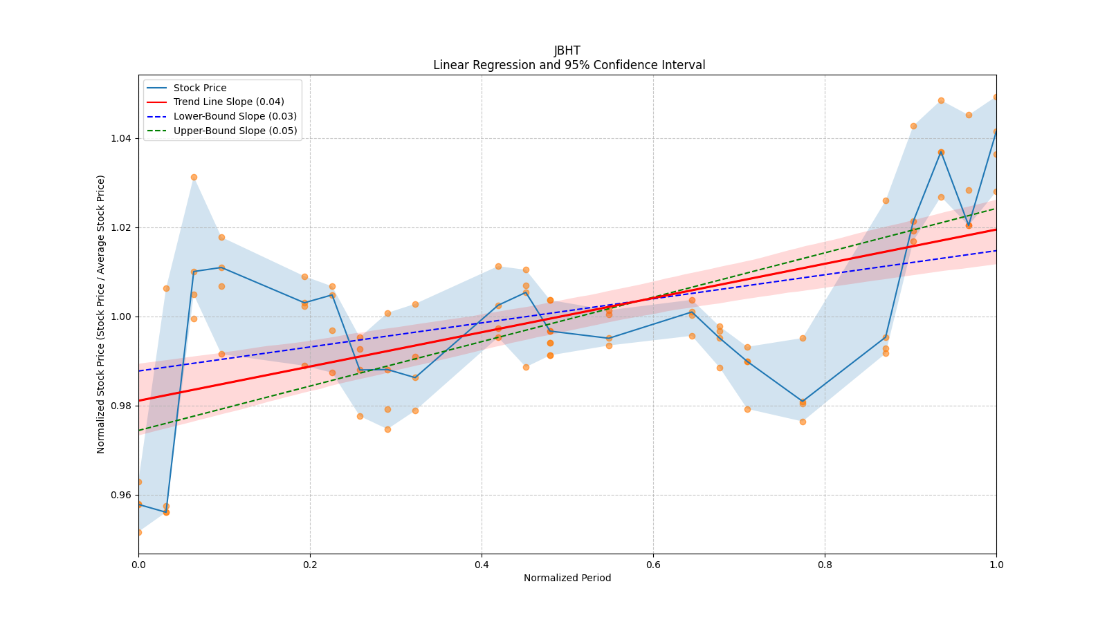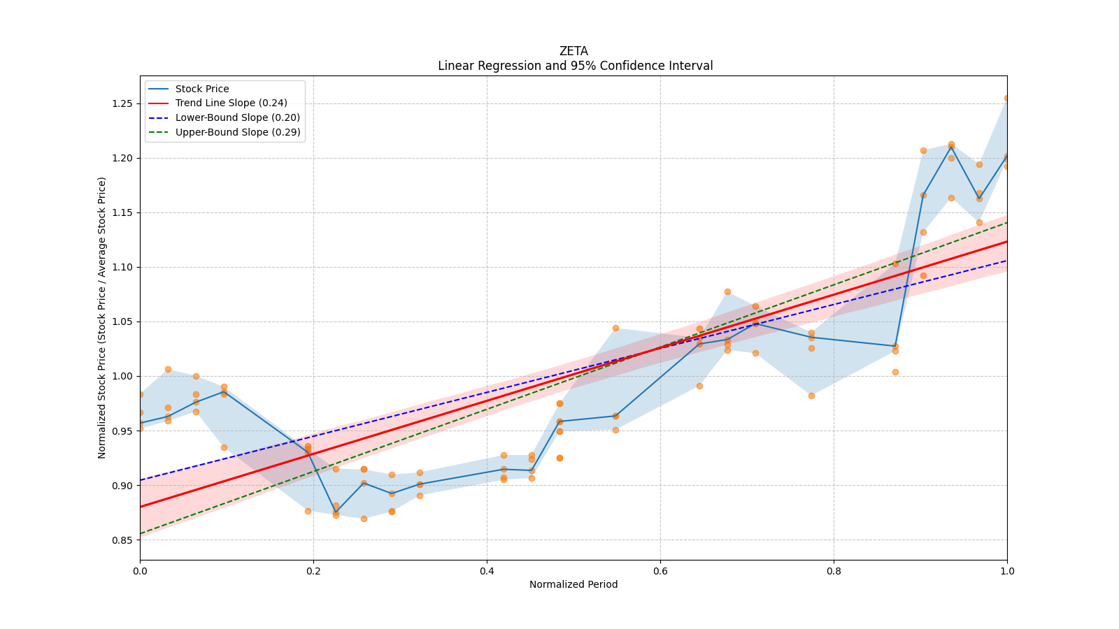 Stocks were filtered to have a high investor grade, analyzed using linear regression, and sorted by the lower-bound trendline slope. The lower-bound trendline slope has been normalized by the average stock price and calculated using a 95% confidence interval. This statistic provides a conservative estimate of stock price percentage growth, taking into account both the trends and volatility of the stock price over the past month. With these details, you can easily compare stocks by their historical performance.