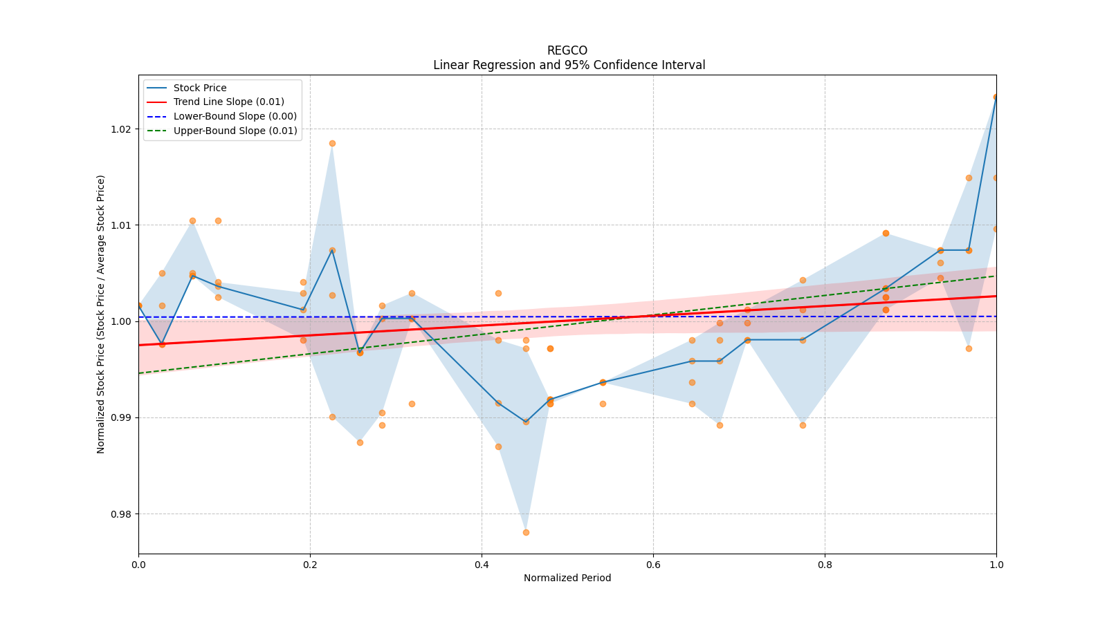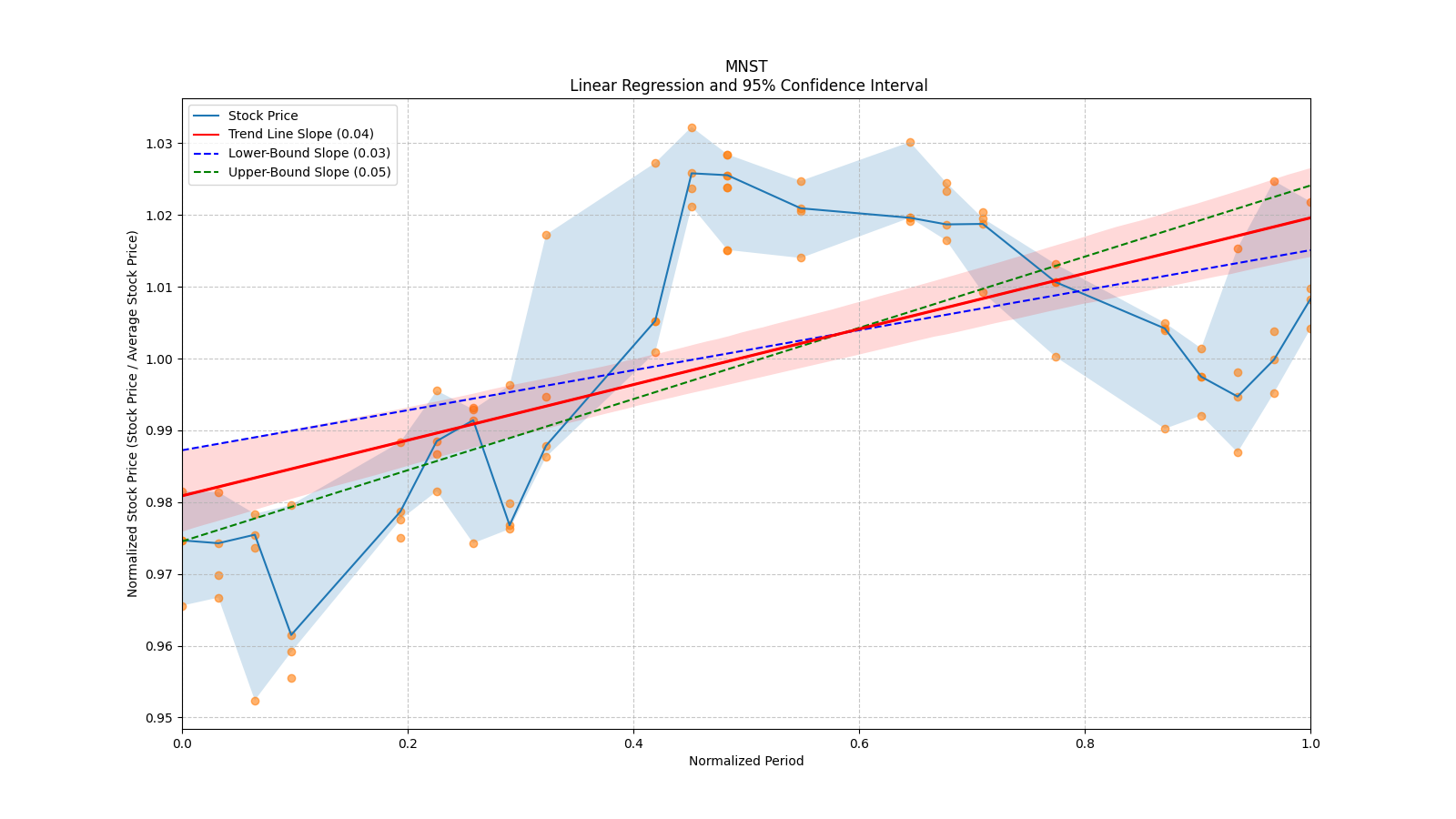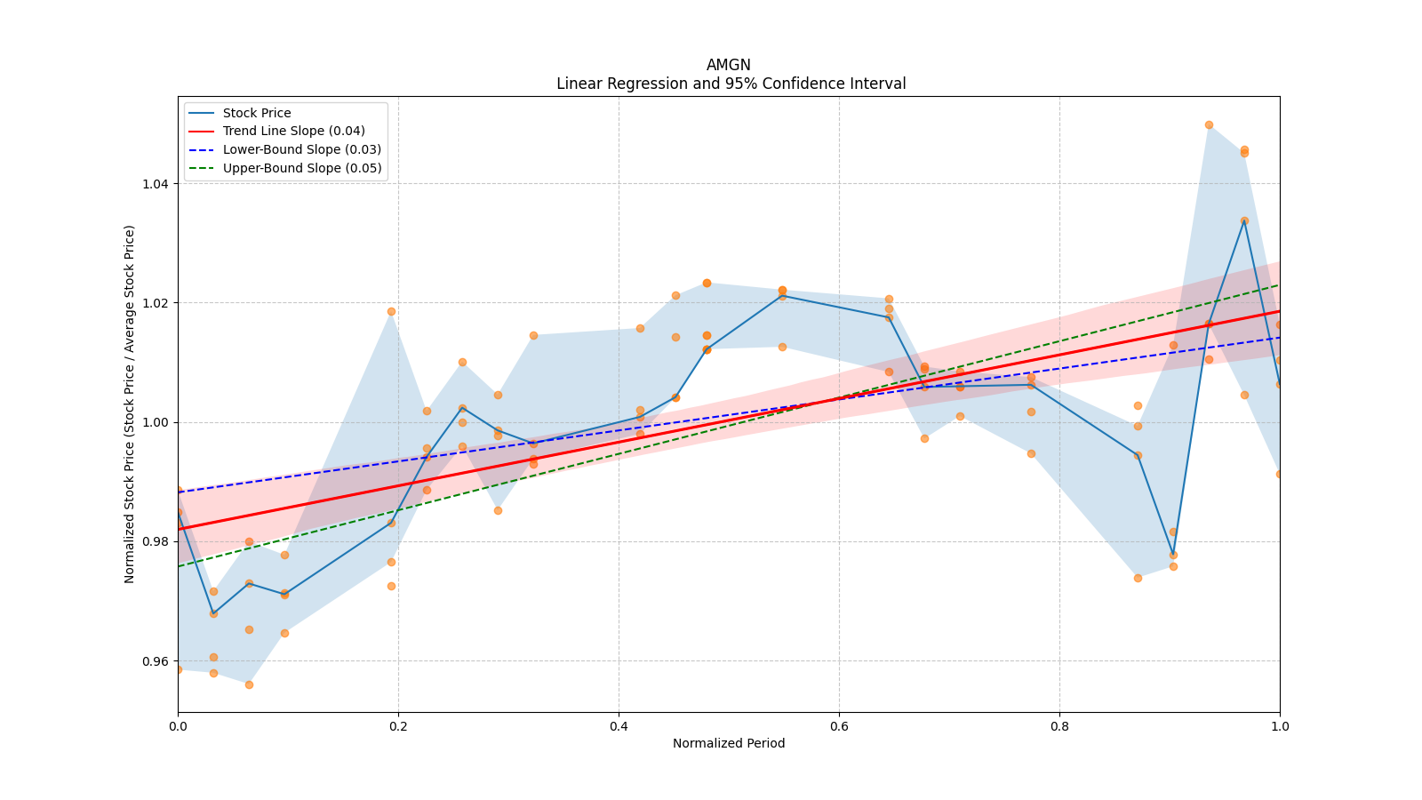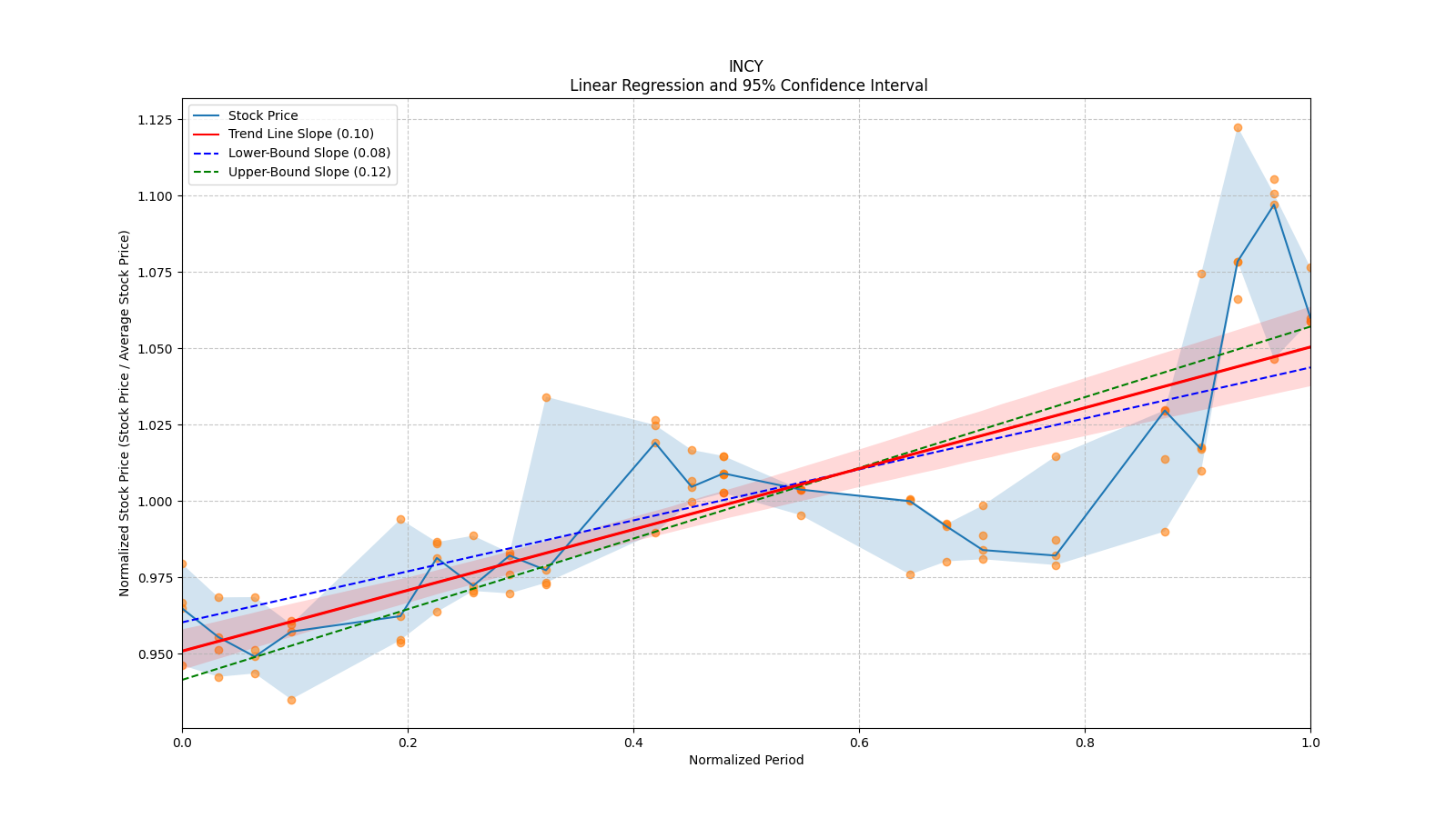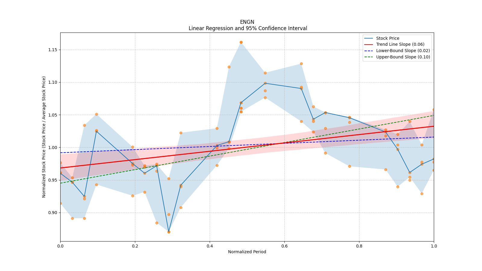 Stocks were filtered to have a high investor grade, analyzed using linear regression, and sorted by the lower-bound trendline slope. The lower-bound trendline slope has been normalized by the average stock price and calculated using a 95% confidence interval. This statistic provides a conservative estimate of stock price percentage growth, taking into account both the trends and volatility of the stock price over the past month. With these details, you can easily compare stocks by their historical performance.