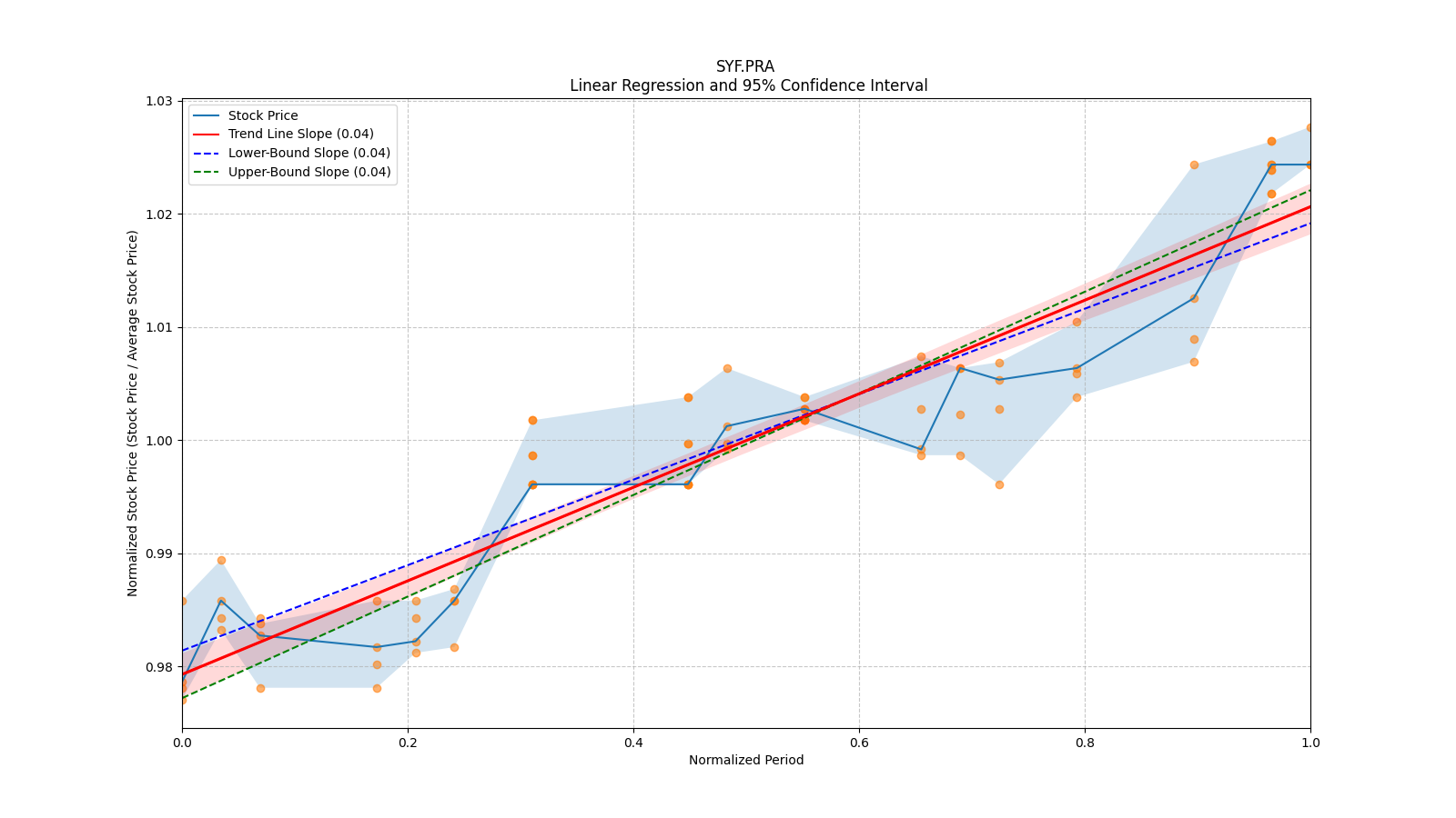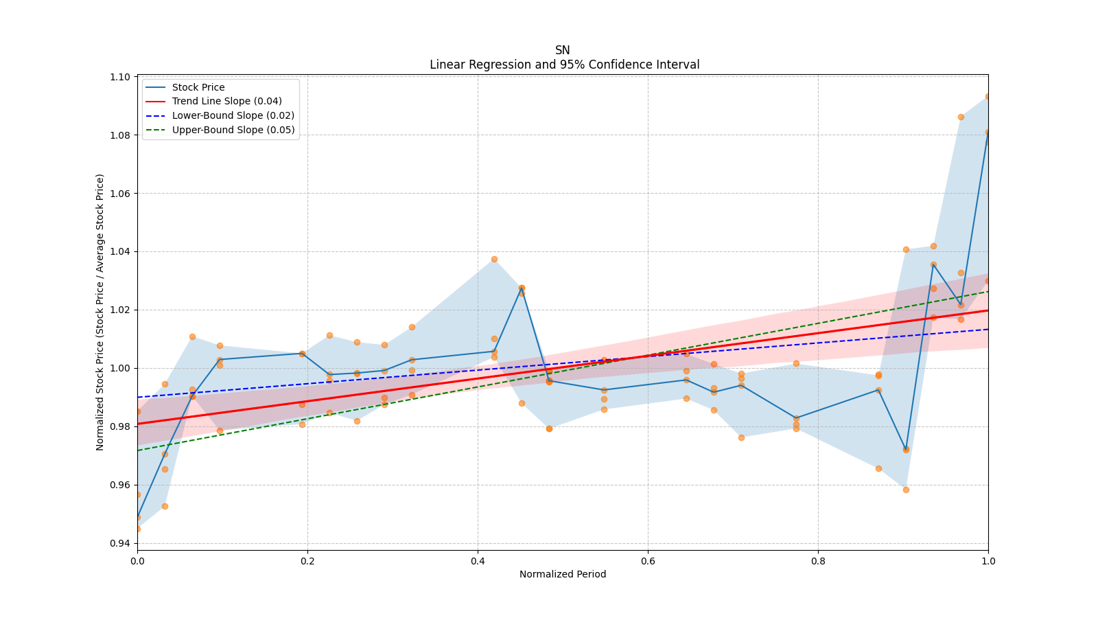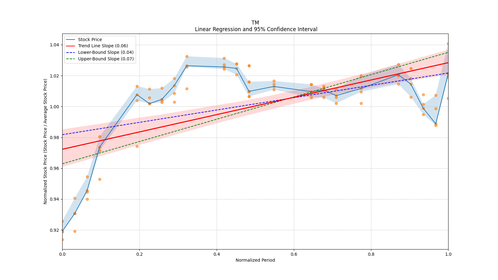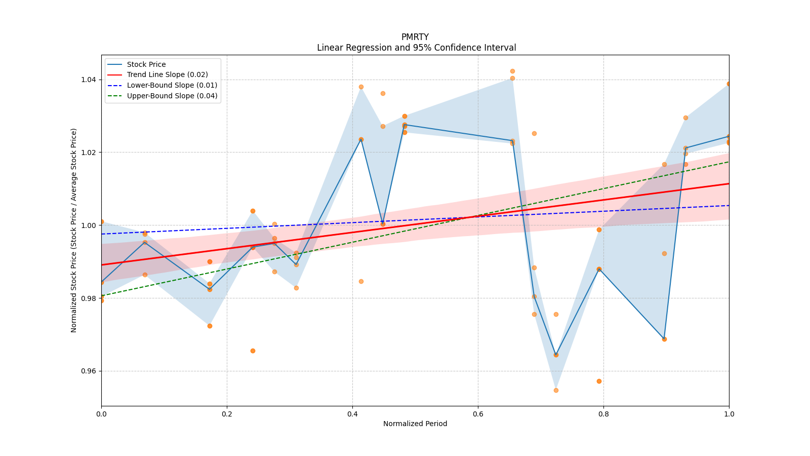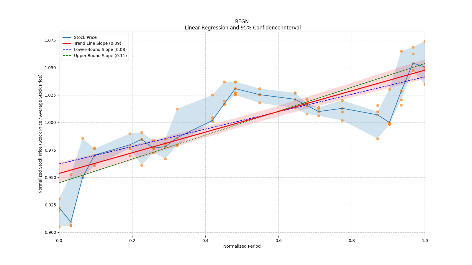 Stocks were filtered to have a high investor grade, analyzed using linear regression, and sorted by the lower-bound trendline slope. The lower-bound trendline slope has been normalized by the average stock price and calculated using a 95% confidence interval. This statistic provides a conservative estimate of stock price percentage growth, taking into account both the trends and volatility of the stock price over the past month. With these details, you can easily compare stocks by their historical performance.