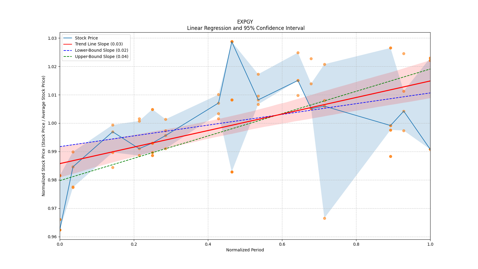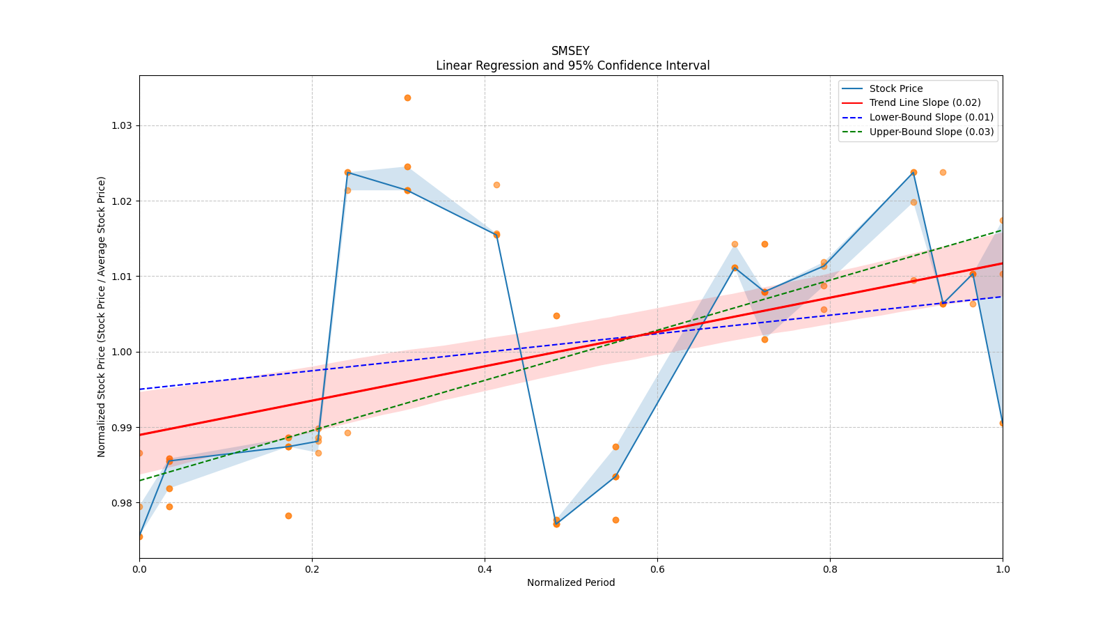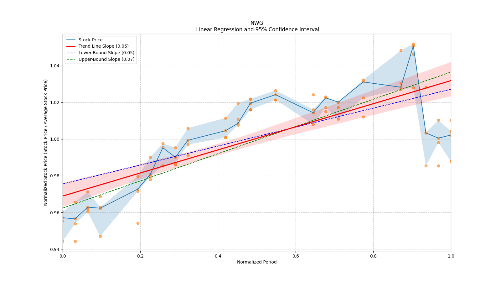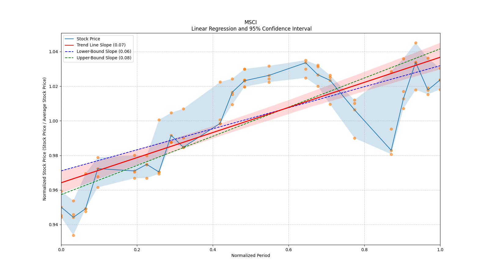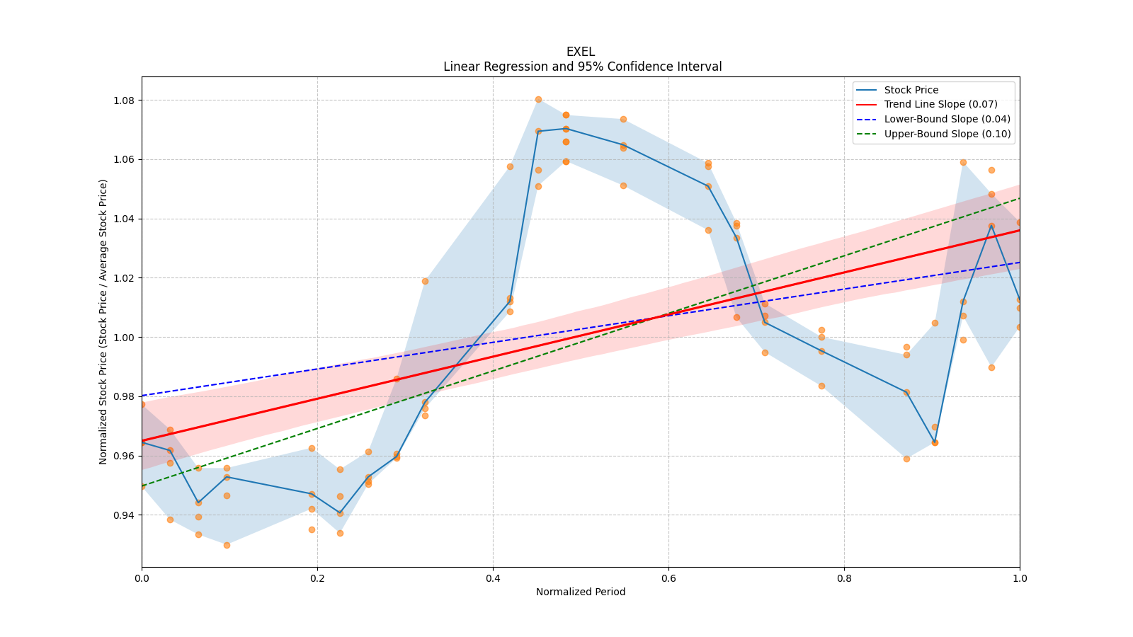 Stocks were filtered to have a high investor grade, analyzed using linear regression, and sorted by the lower-bound trendline slope. The lower-bound trendline slope has been normalized by the average stock price and calculated using a 95% confidence interval. This statistic provides a conservative estimate of stock price percentage growth, taking into account both the trends and volatility of the stock price over the past month. With these details, you can easily compare stocks by their historical performance.