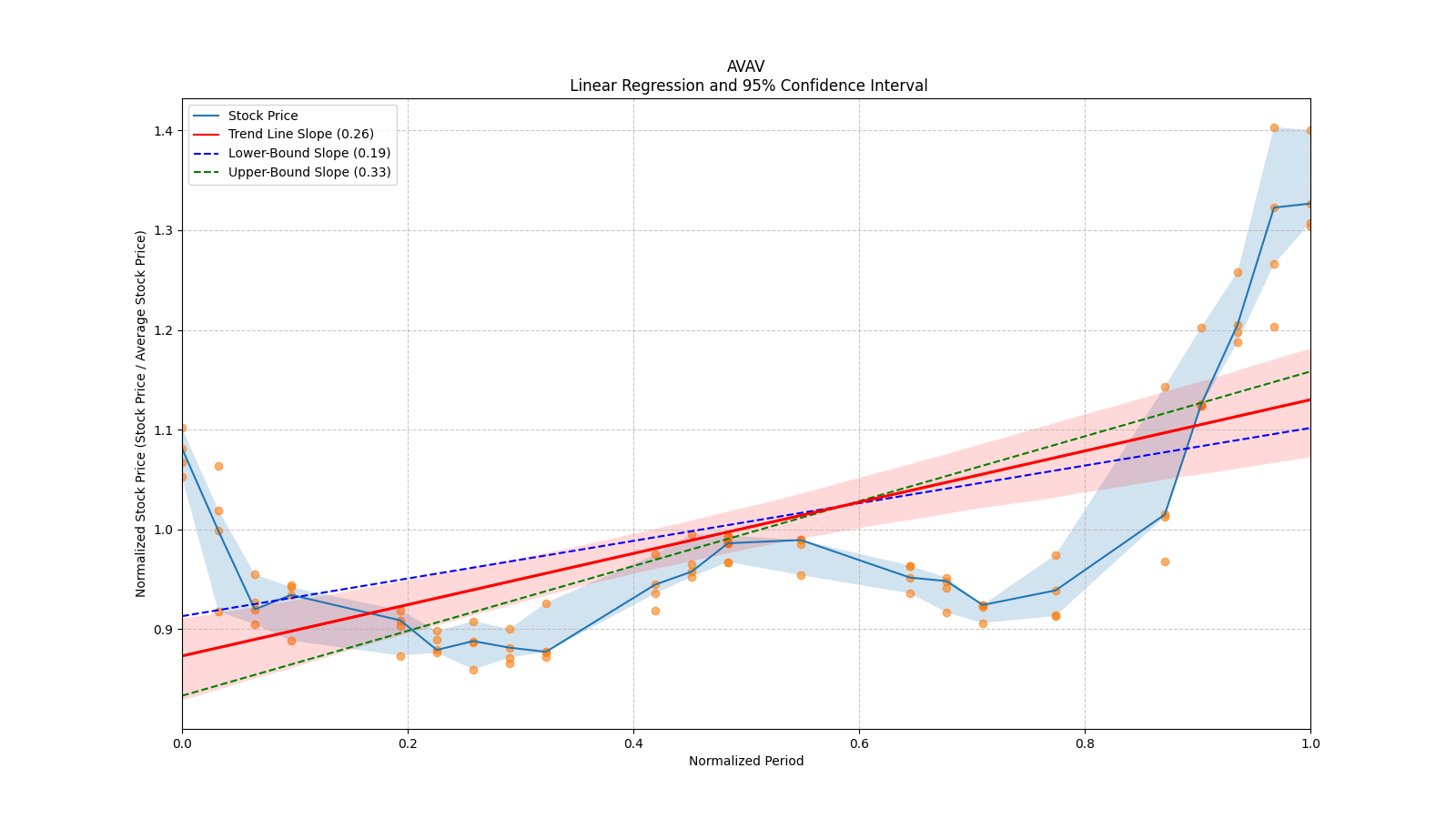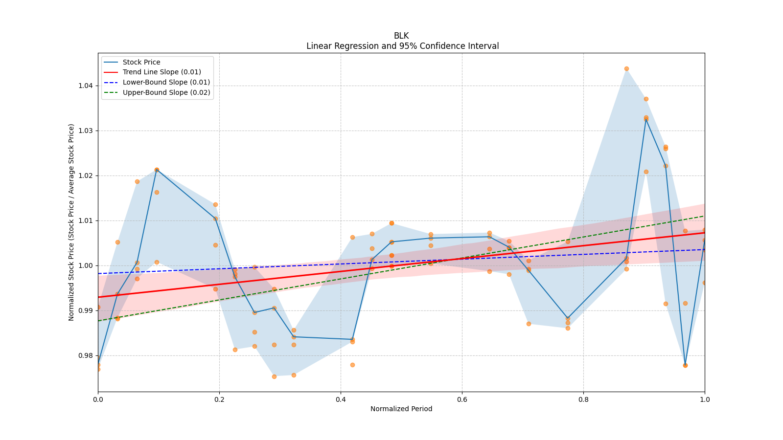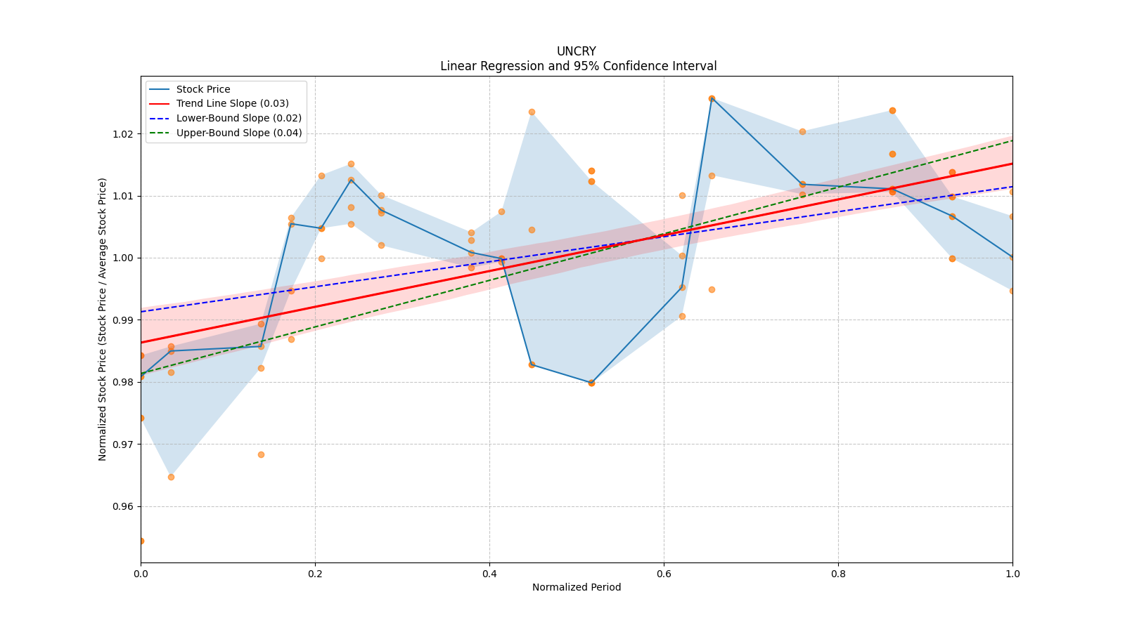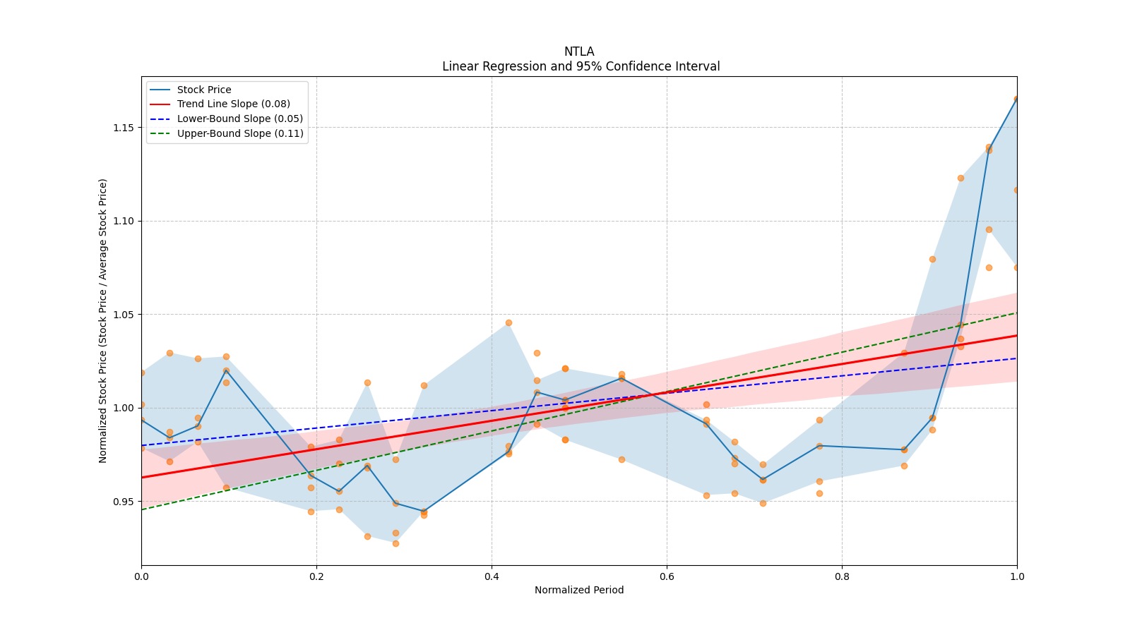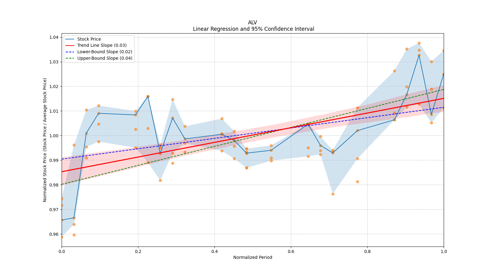 Stocks were filtered to have a high investor grade, analyzed using linear regression, and sorted by the lower-bound trendline slope. The lower-bound trendline slope has been normalized by the average stock price and calculated using a 95% confidence interval. This statistic provides a conservative estimate of stock price percentage growth, taking into account both the trends and volatility of the stock price over the past month. With these details, you can easily compare stocks by their historical performance.