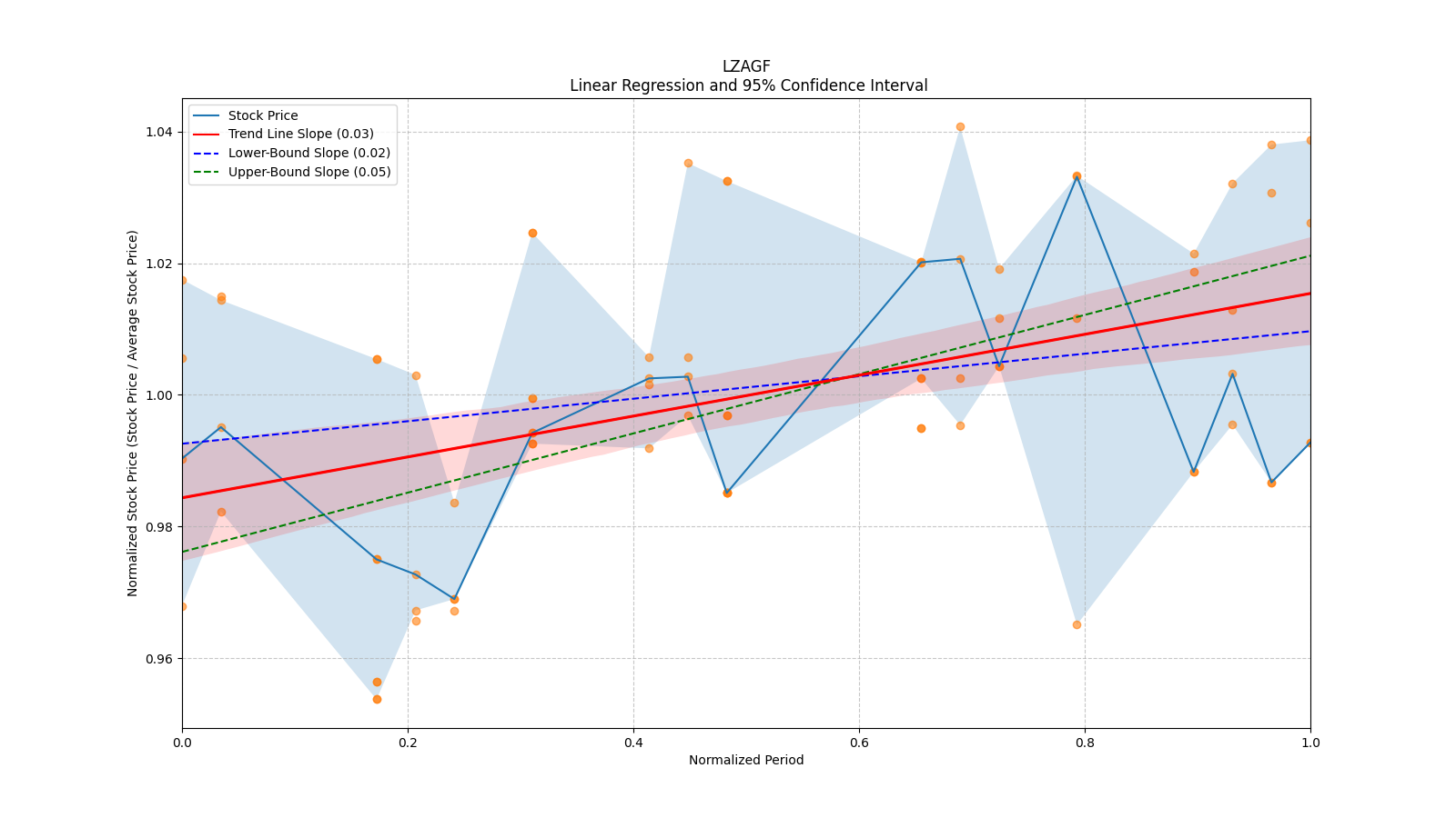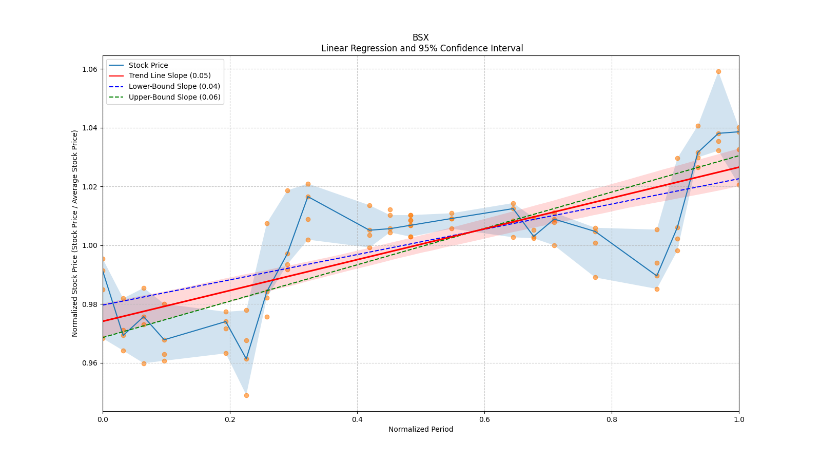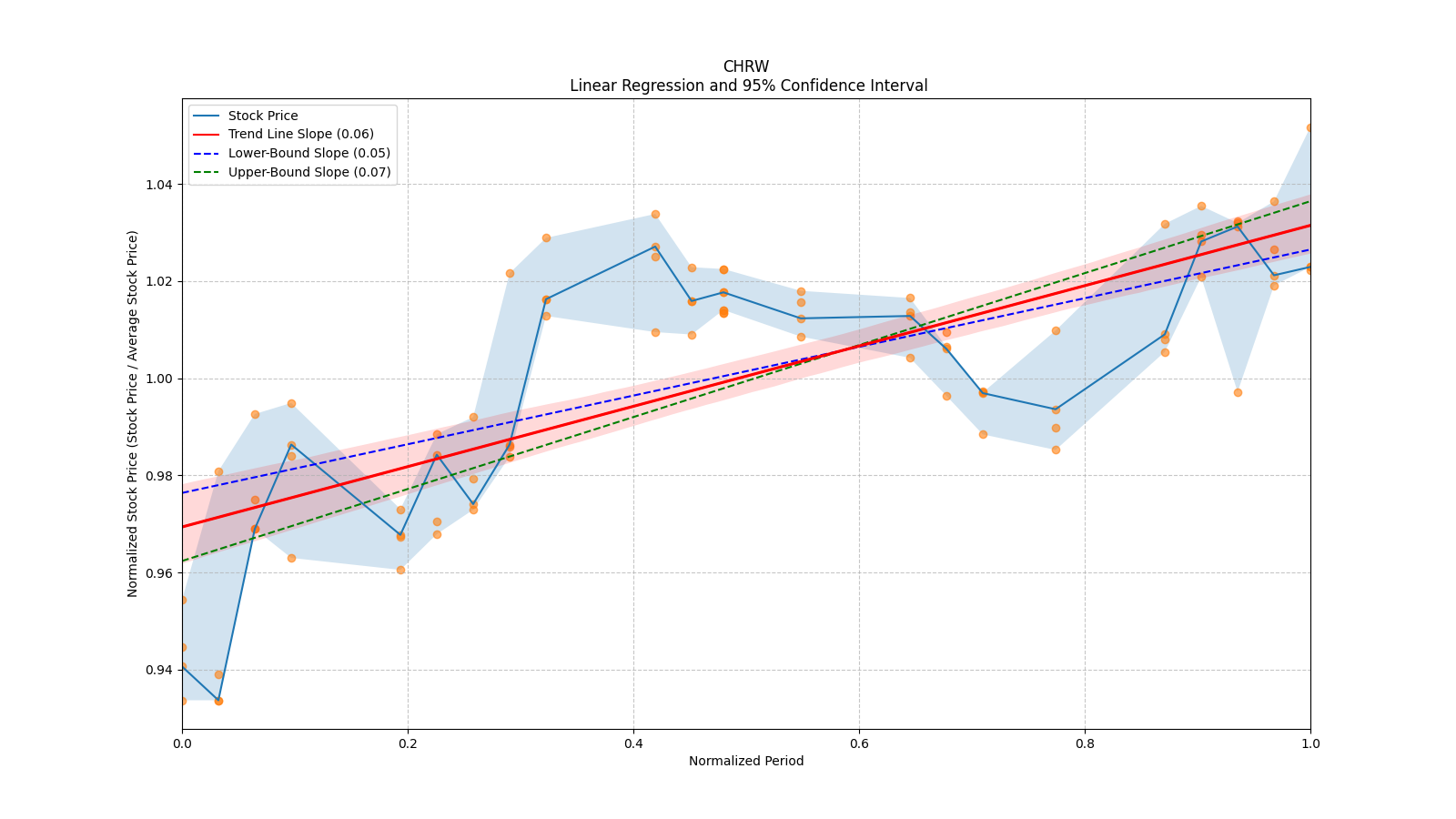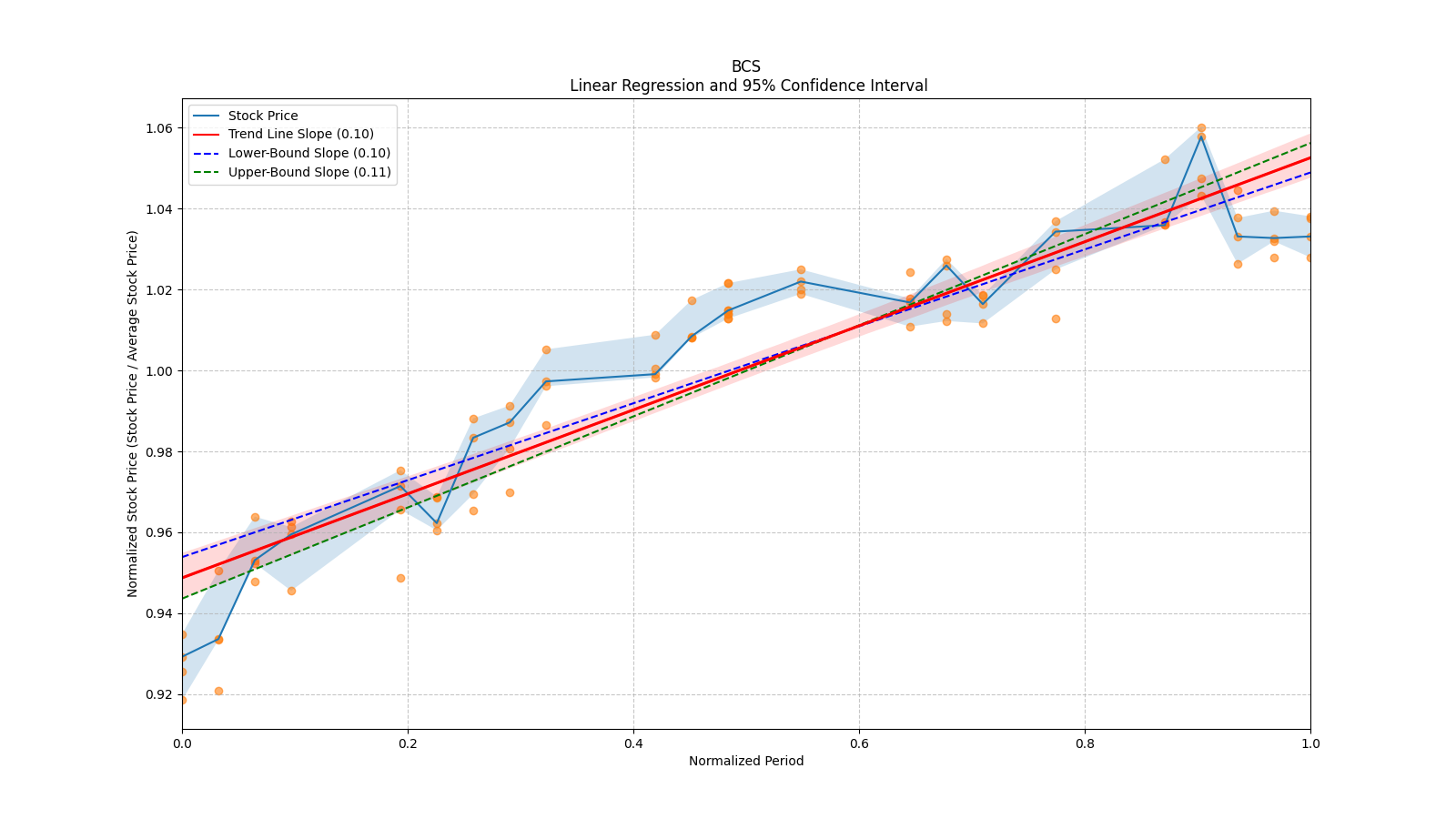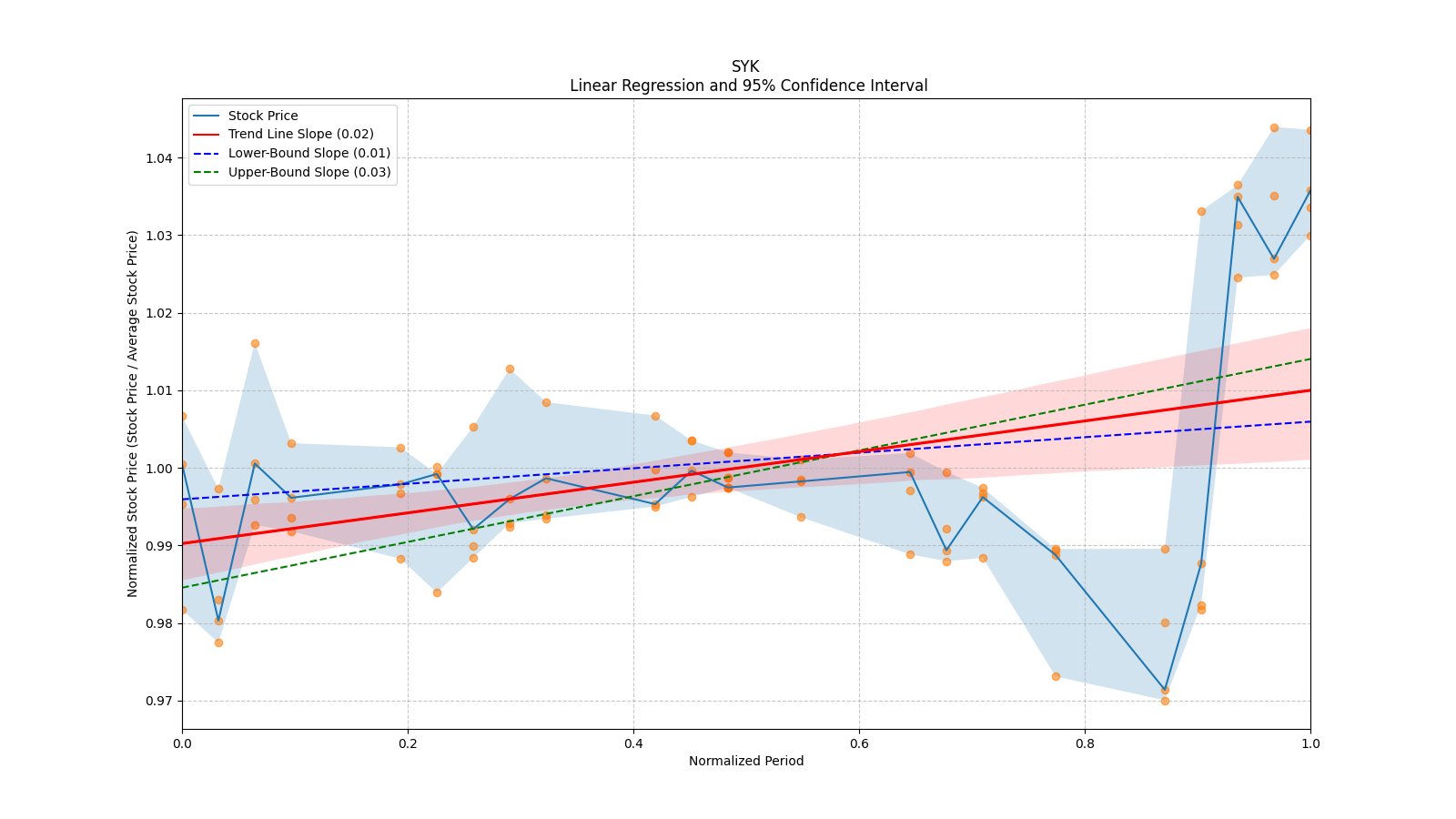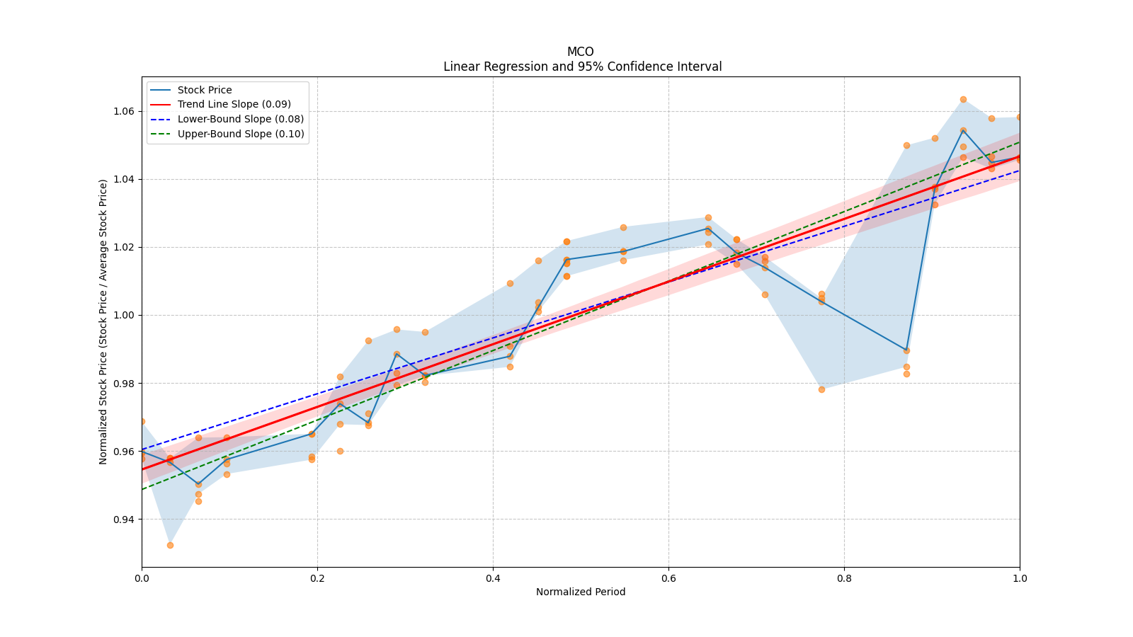 Stocks were filtered to have a high investor grade, analyzed using linear regression, and sorted by the lower-bound trendline slope. The lower-bound trendline slope has been normalized by the average stock price and calculated using a 95% confidence interval. This statistic provides a conservative estimate of stock price percentage growth, taking into account both the trends and volatility of the stock price over the past month. With these details, you can easily compare stocks by their historical performance.