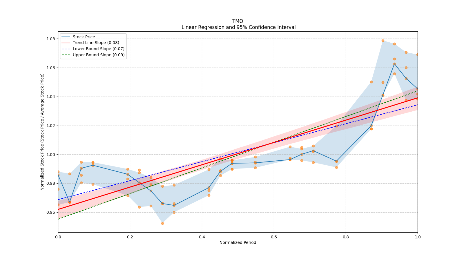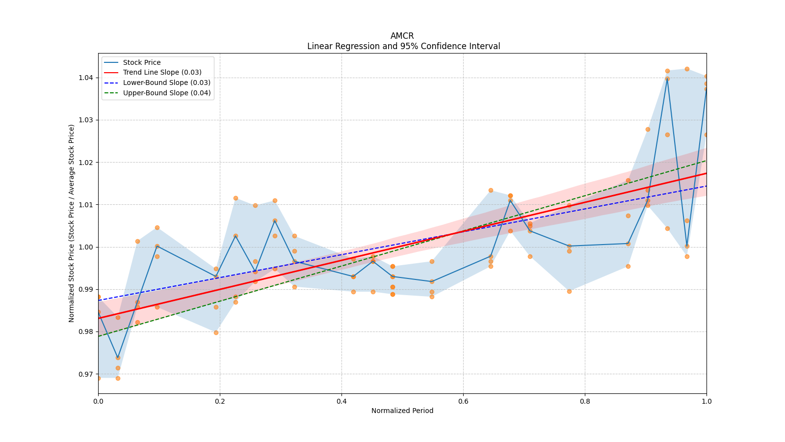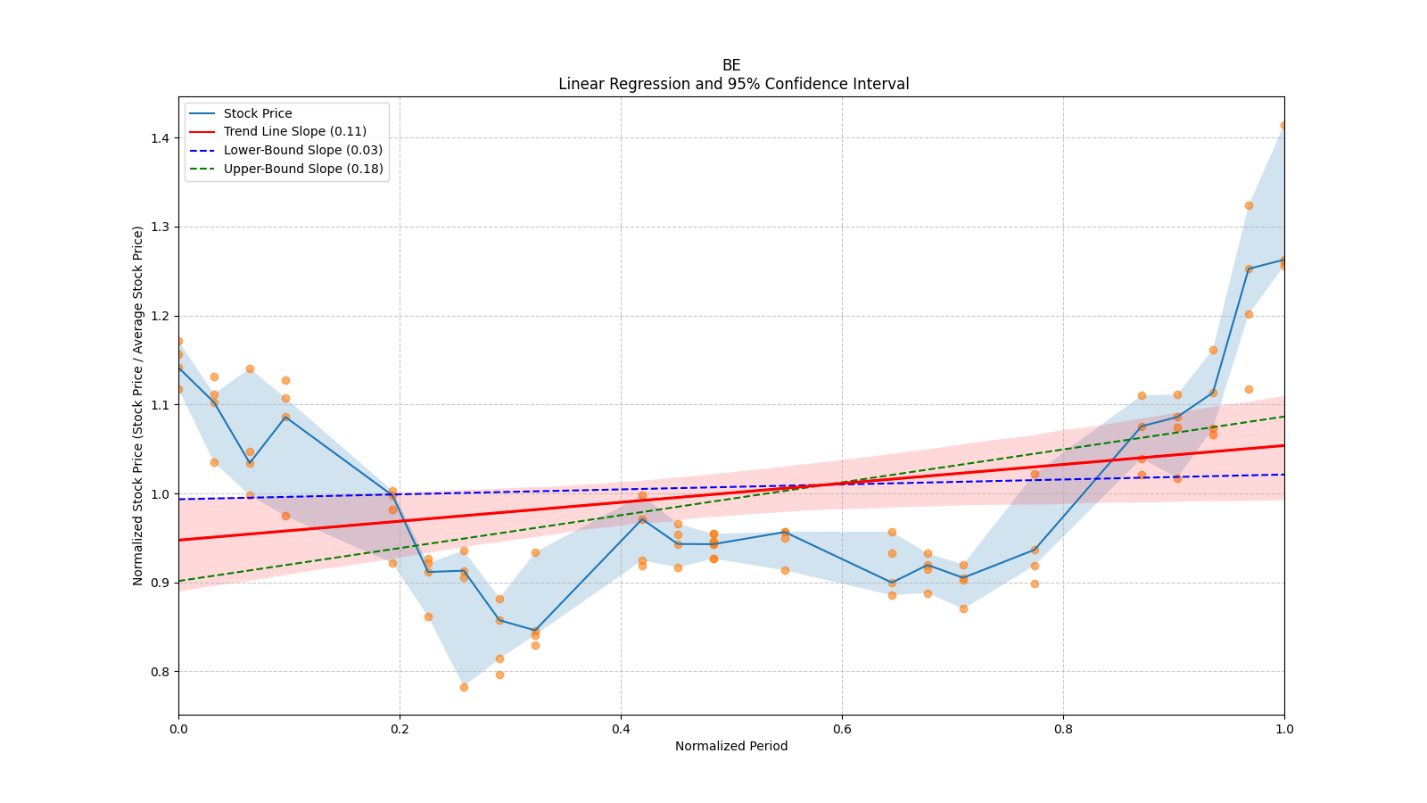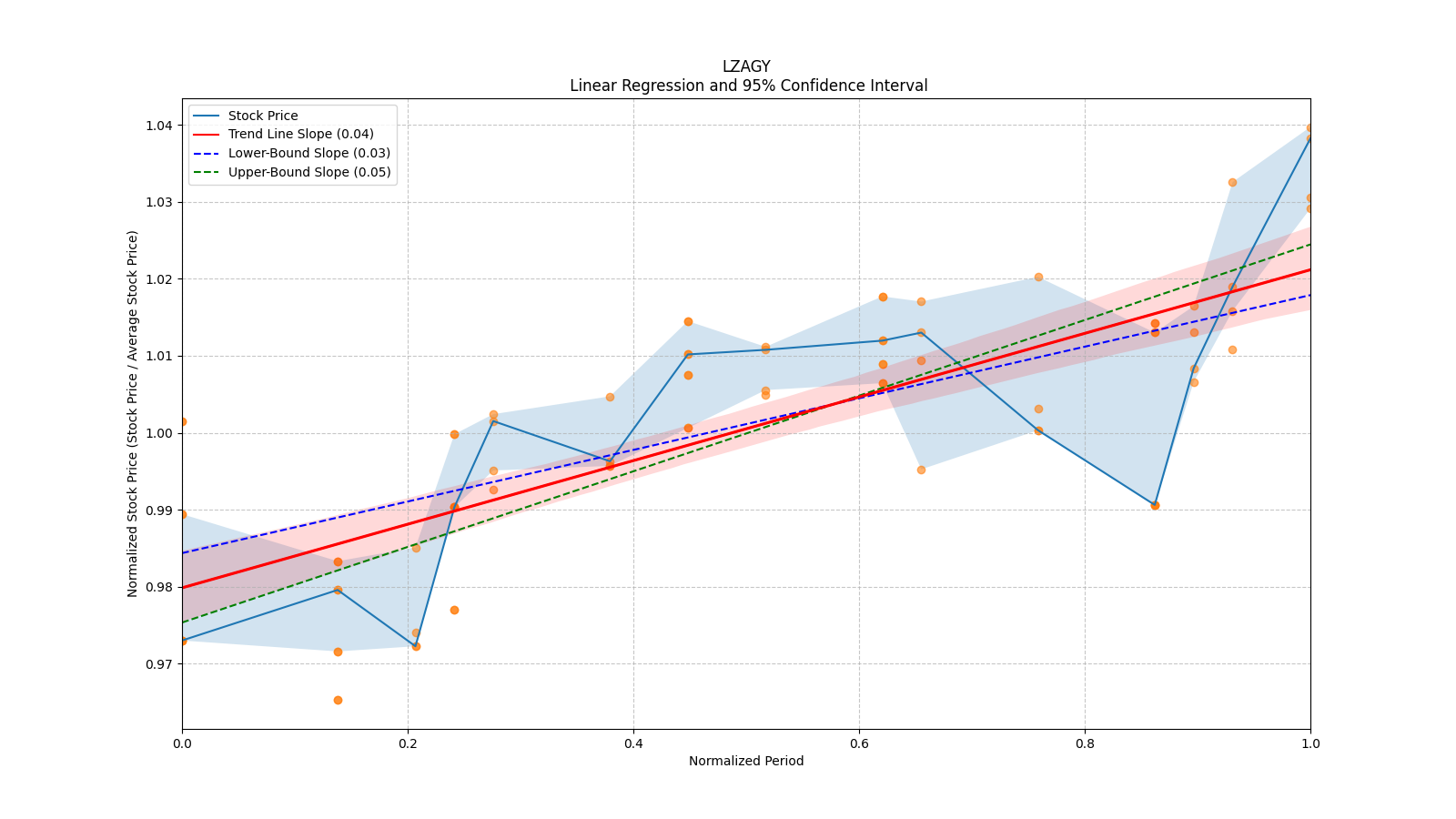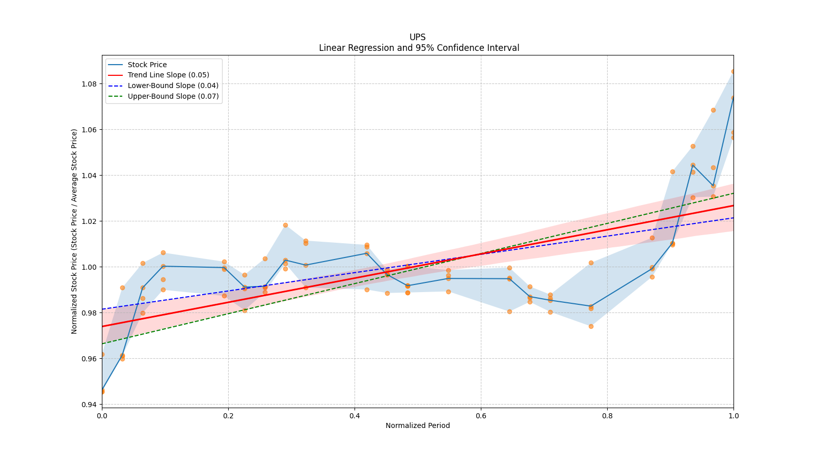 Stocks were filtered to have a high investor grade, analyzed using linear regression, and sorted by the lower-bound trendline slope. The lower-bound trendline slope has been normalized by the average stock price and calculated using a 95% confidence interval. This statistic provides a conservative estimate of stock price percentage growth, taking into account both the trends and volatility of the stock price over the past month. With these details, you can easily compare stocks by their historical performance.
