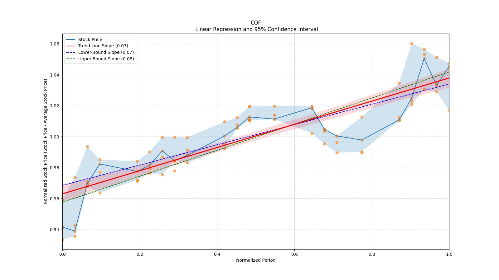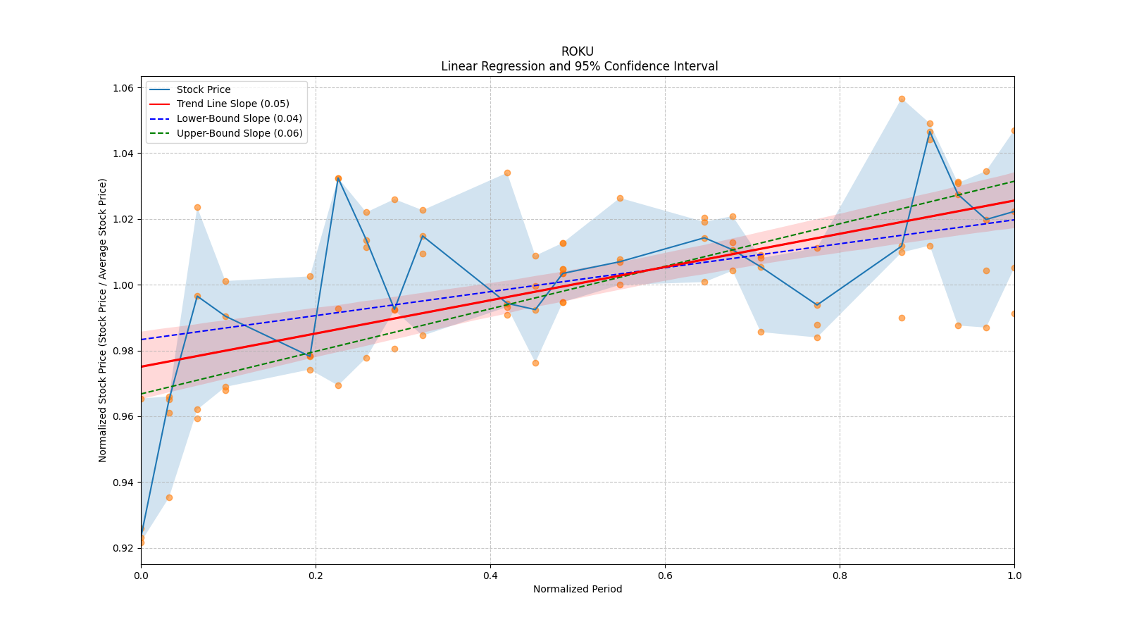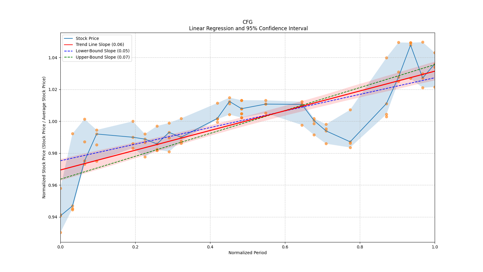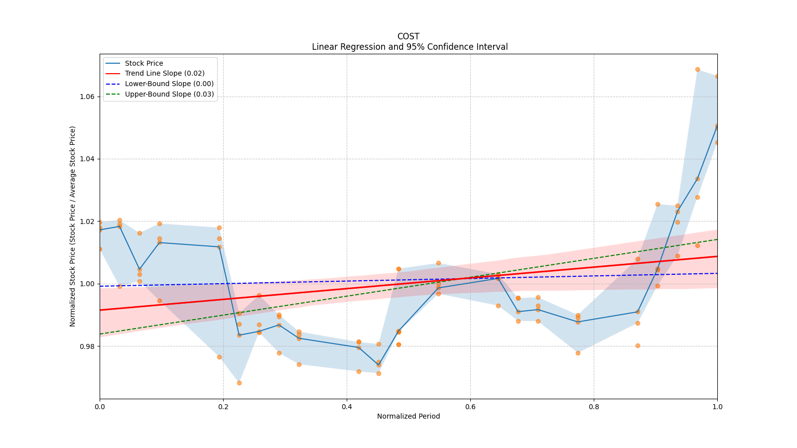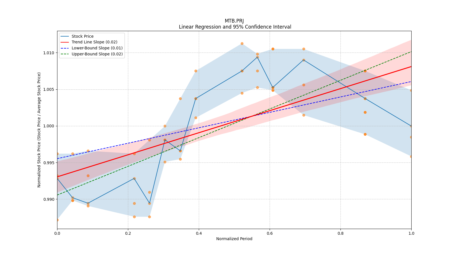 Stocks were filtered to have a high investor grade, analyzed using linear regression, and sorted by the lower-bound trendline slope. The lower-bound trendline slope has been normalized by the average stock price and calculated using a 95% confidence interval. This statistic provides a conservative estimate of stock price percentage growth, taking into account both the trends and volatility of the stock price over the past month. With these details, you can easily compare stocks by their historical performance.