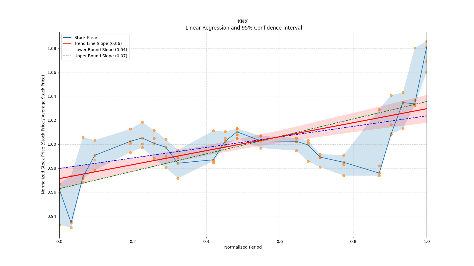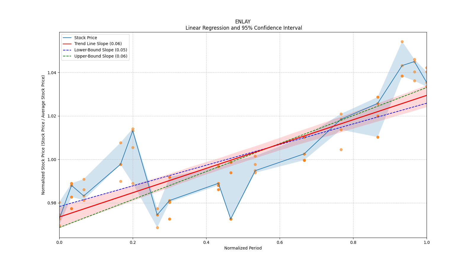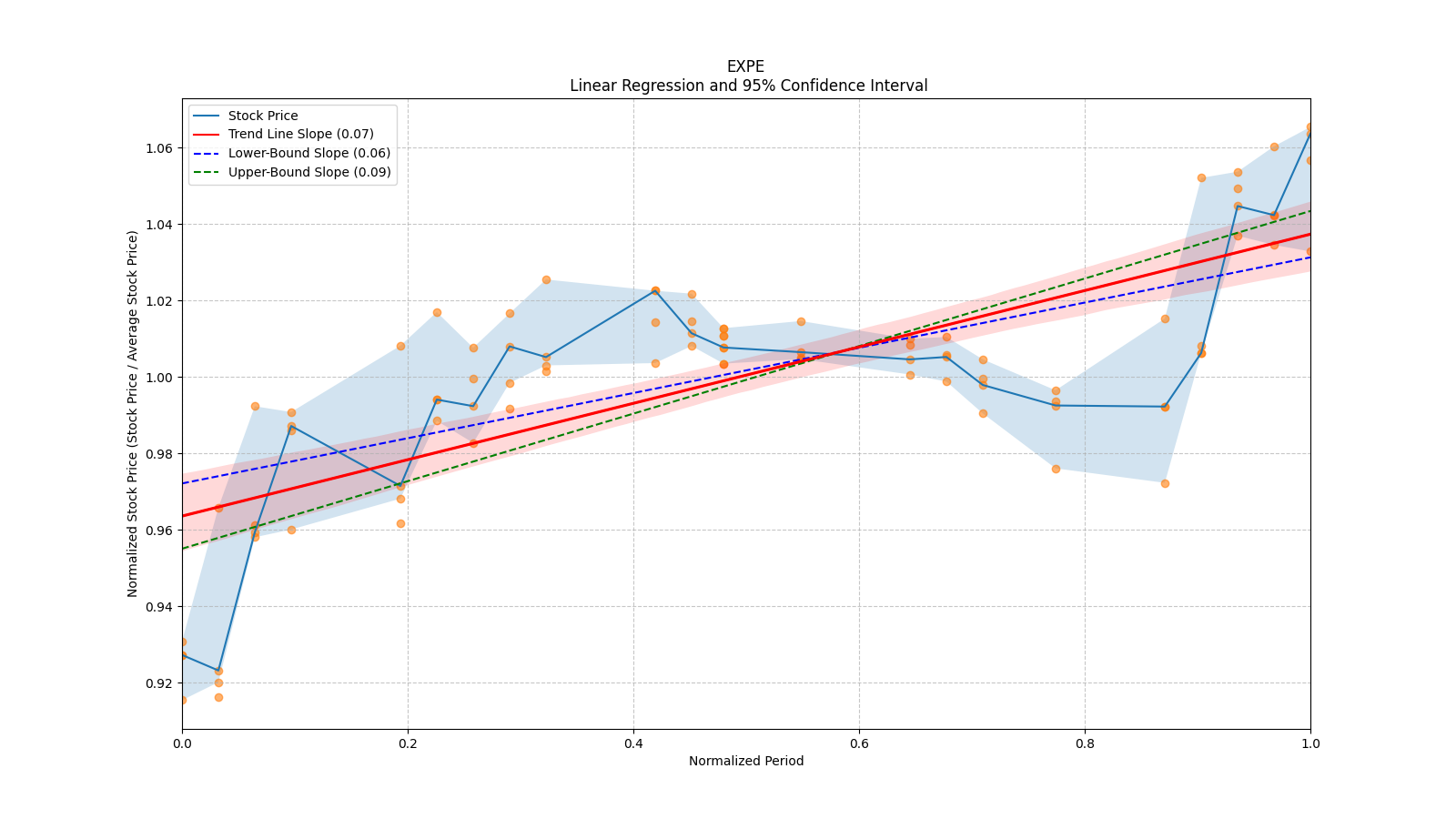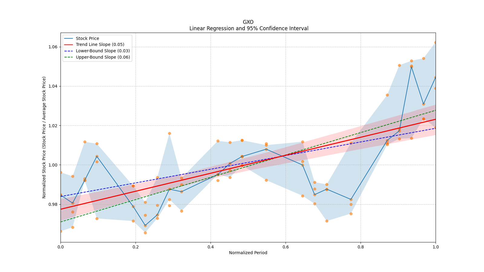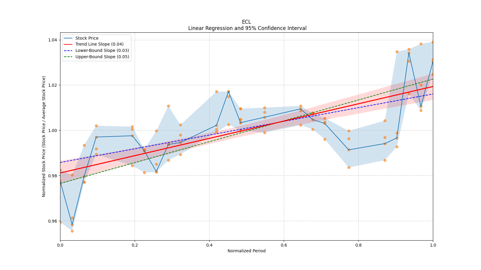 Stocks were filtered to have a high investor grade, analyzed using linear regression, and sorted by the lower-bound trendline slope. The lower-bound trendline slope has been normalized by the average stock price and calculated using a 95% confidence interval. This statistic provides a conservative estimate of stock price percentage growth, taking into account both the trends and volatility of the stock price over the past month. With these details, you can easily compare stocks by their historical performance.