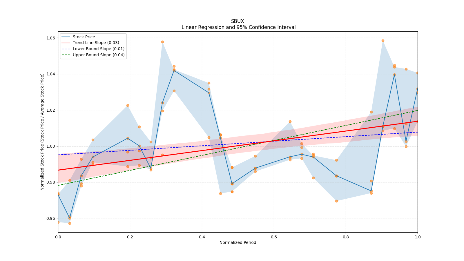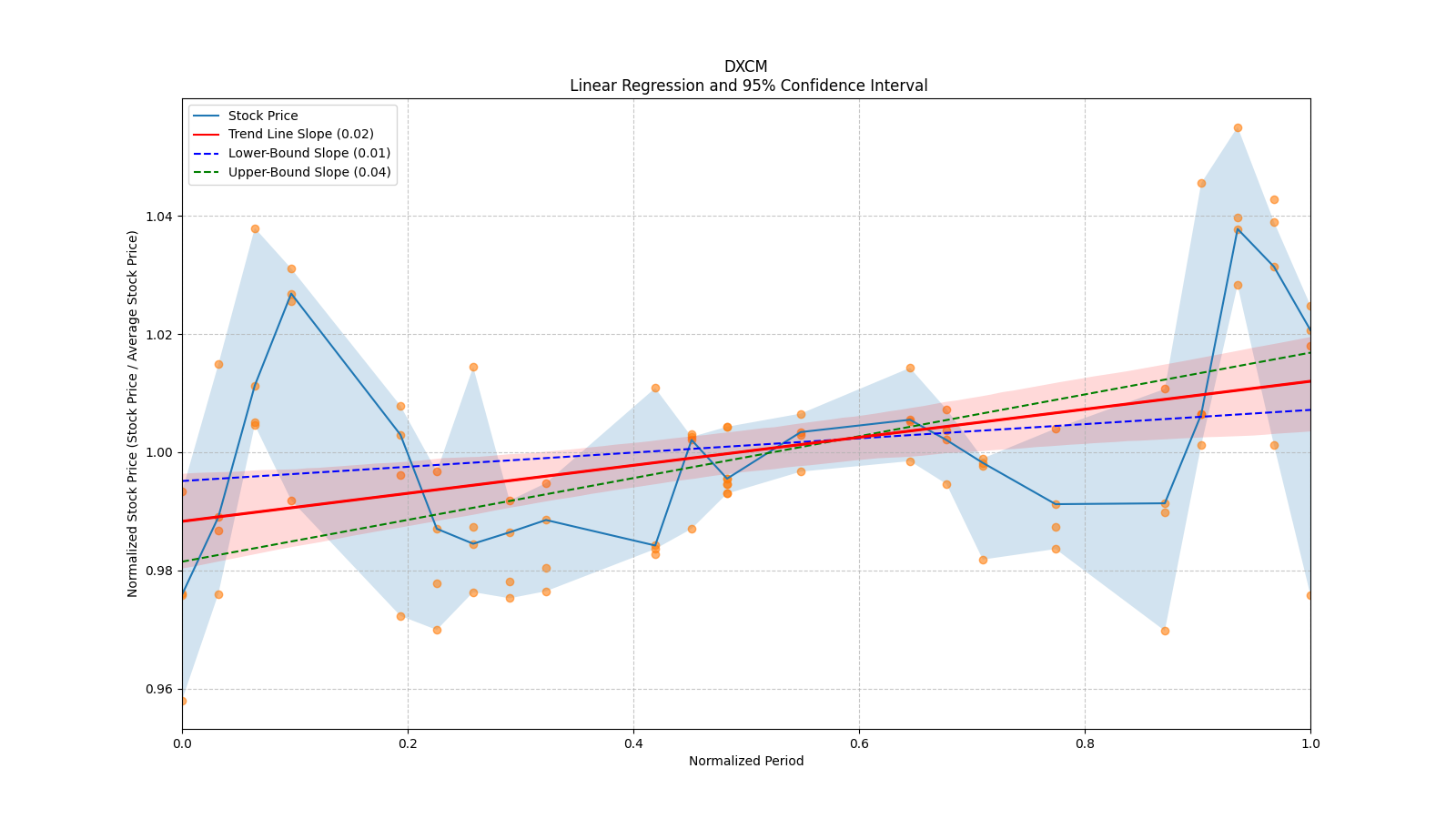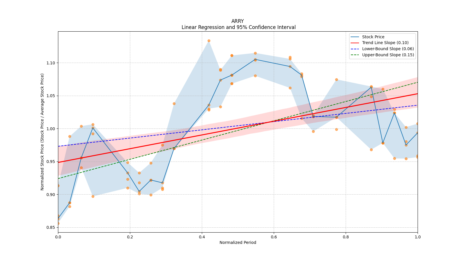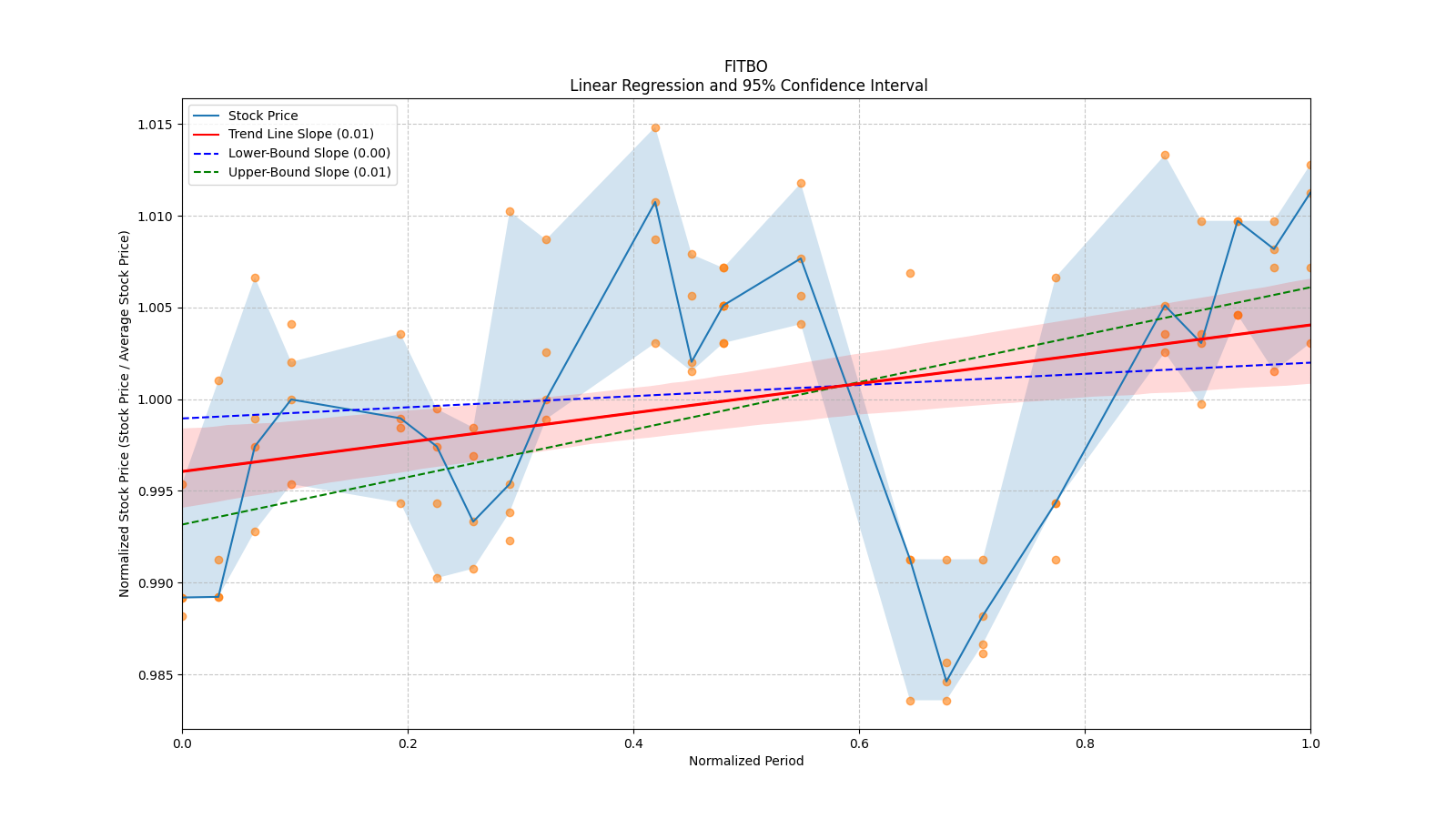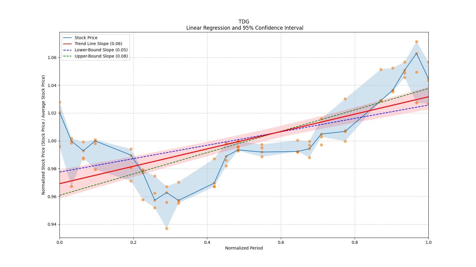 Stocks were filtered to have a high investor grade, analyzed using linear regression, and sorted by the lower-bound trendline slope. The lower-bound trendline slope has been normalized by the average stock price and calculated using a 95% confidence interval. This statistic provides a conservative estimate of stock price percentage growth, taking into account both the trends and volatility of the stock price over the past month. With these details, you can easily compare stocks by their historical performance.