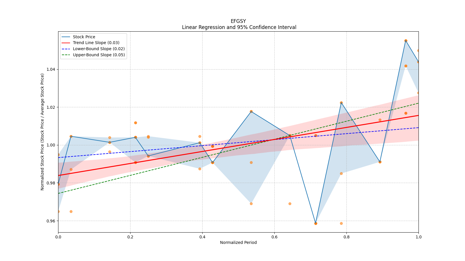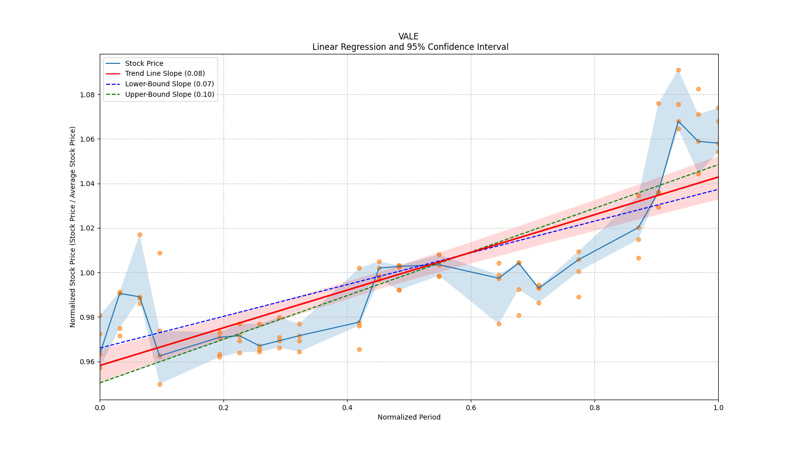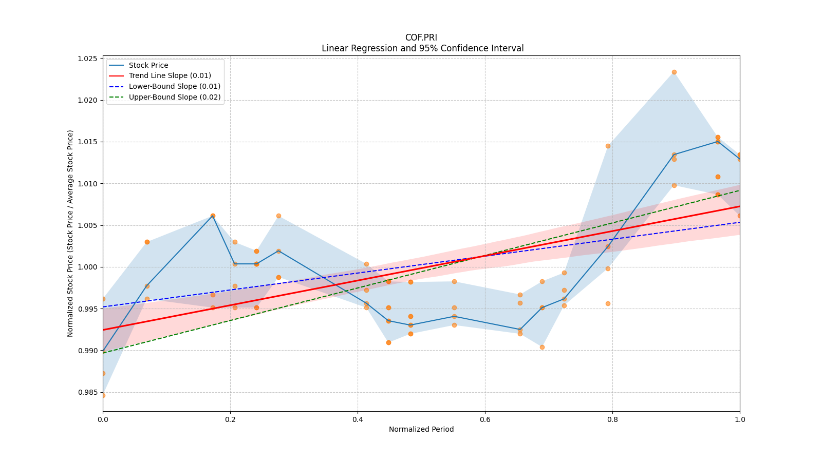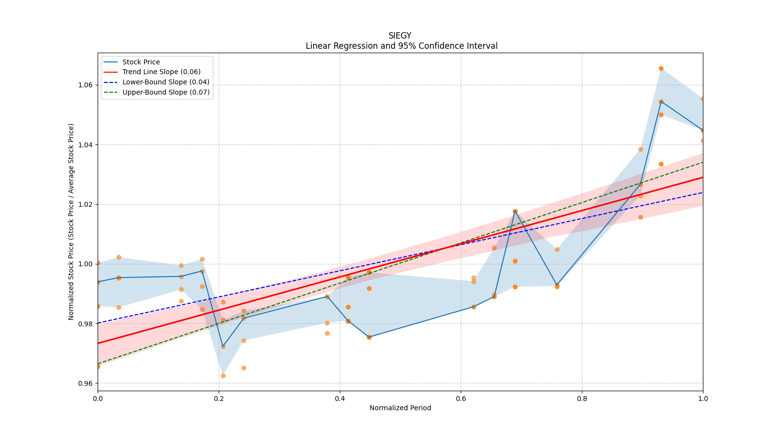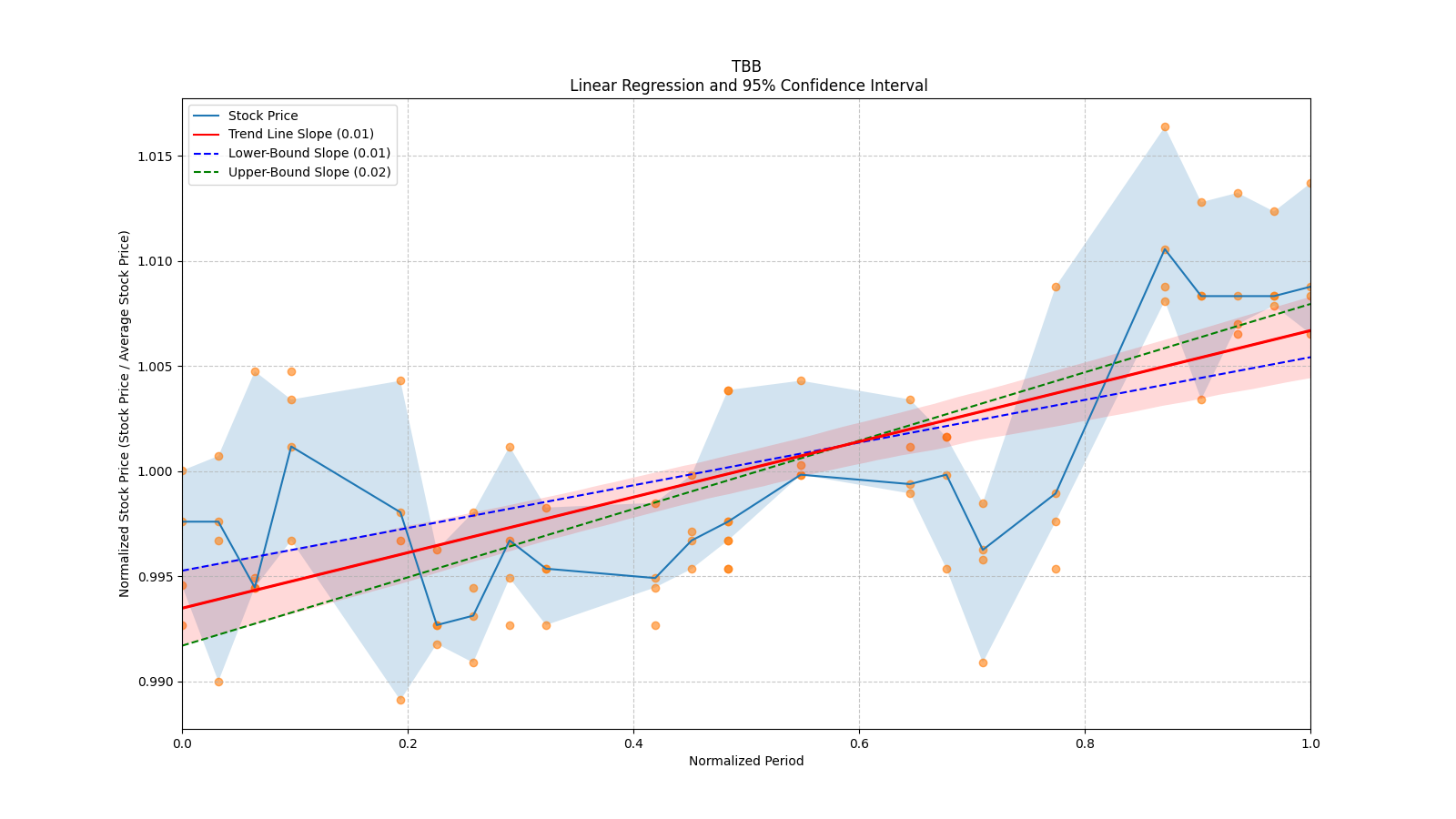 Stocks were filtered to have a high investor grade, analyzed using linear regression, and sorted by the lower-bound trendline slope. The lower-bound trendline slope has been normalized by the average stock price and calculated using a 95% confidence interval. This statistic provides a conservative estimate of stock price percentage growth, taking into account both the trends and volatility of the stock price over the past month. With these details, you can easily compare stocks by their historical performance.