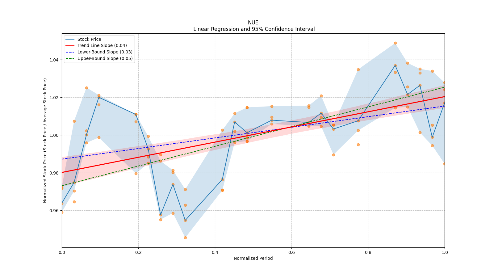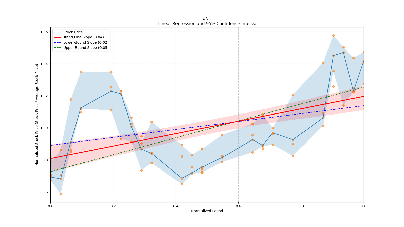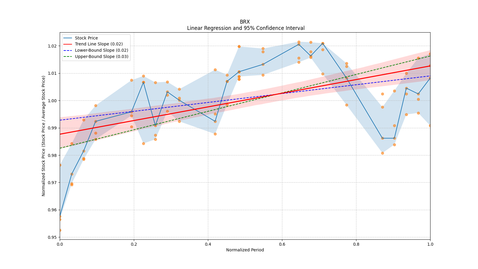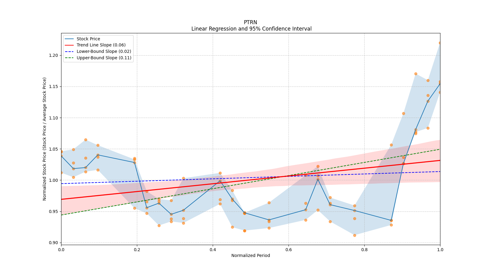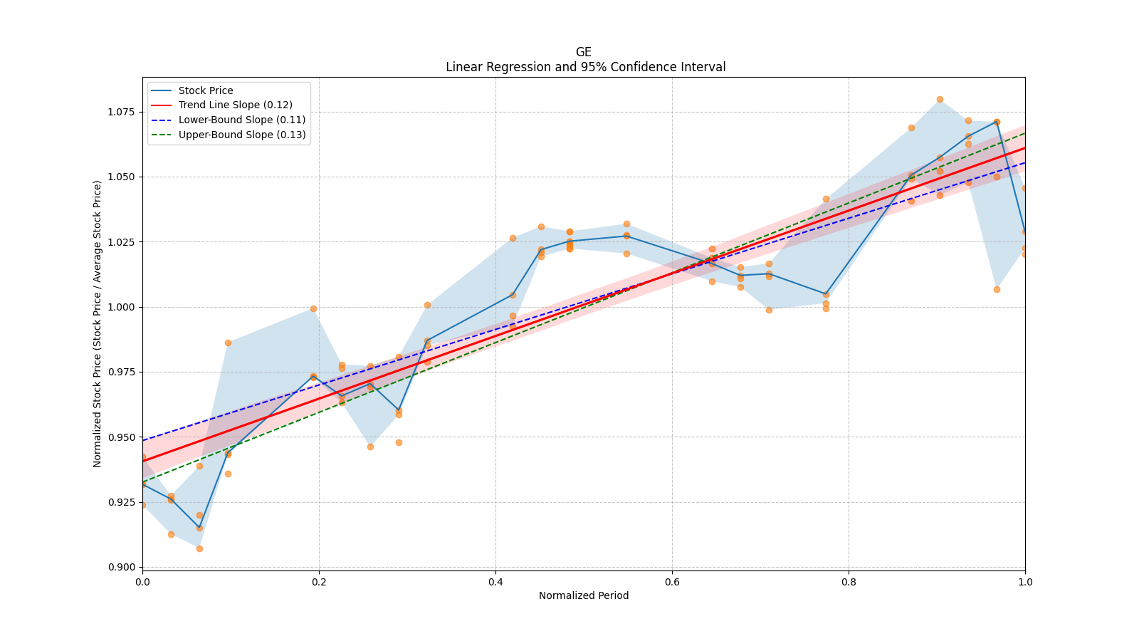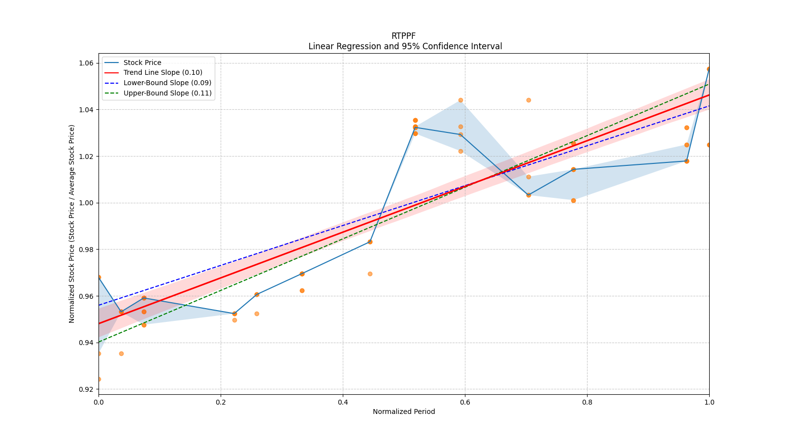 Stocks were filtered to have a high investor grade, analyzed using linear regression, and sorted by the lower-bound trendline slope. The lower-bound trendline slope has been normalized by the average stock price and calculated using a 95% confidence interval. This statistic provides a conservative estimate of stock price percentage growth, taking into account both the trends and volatility of the stock price over the past month. With these details, you can easily compare stocks by their historical performance.
