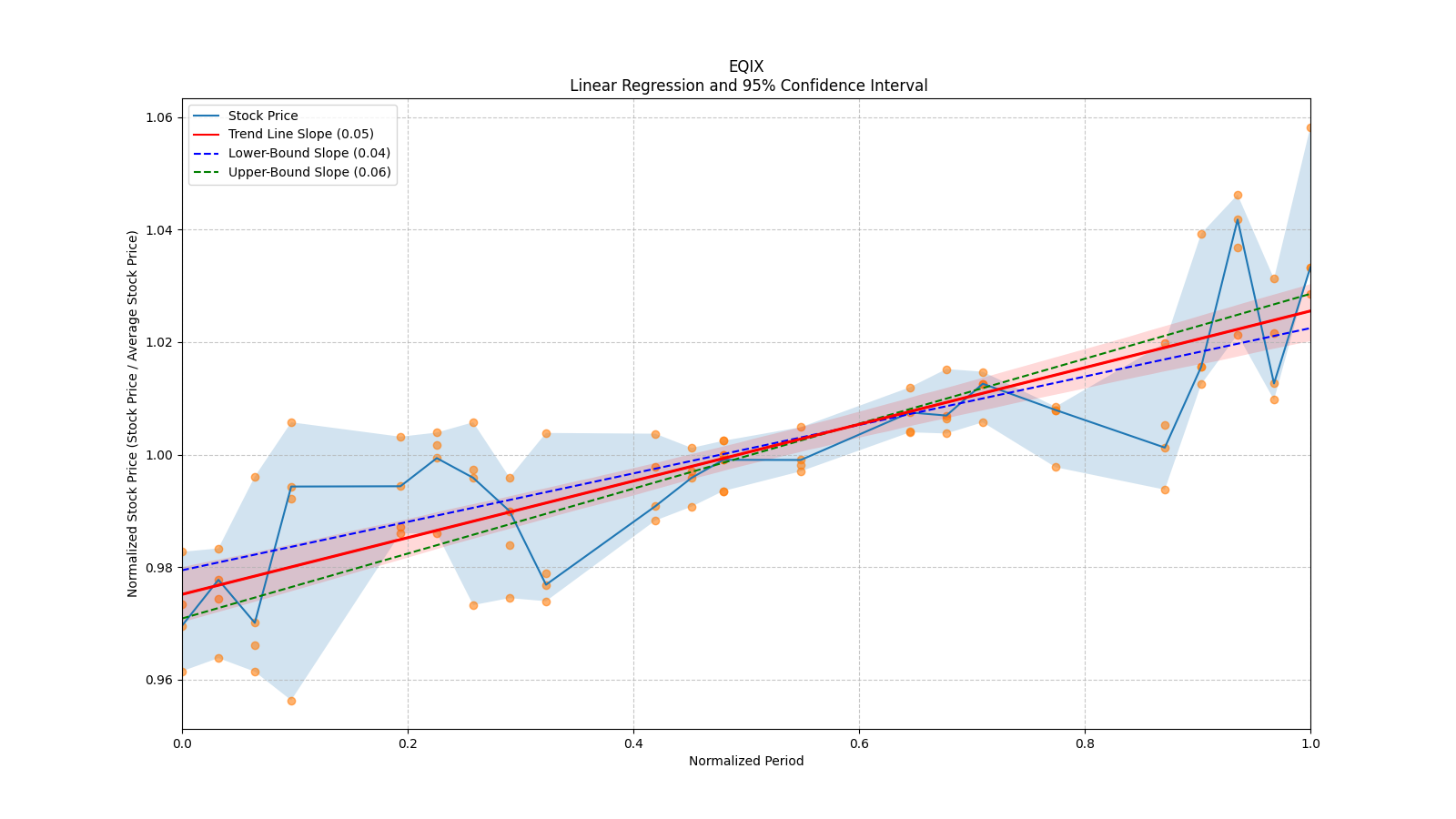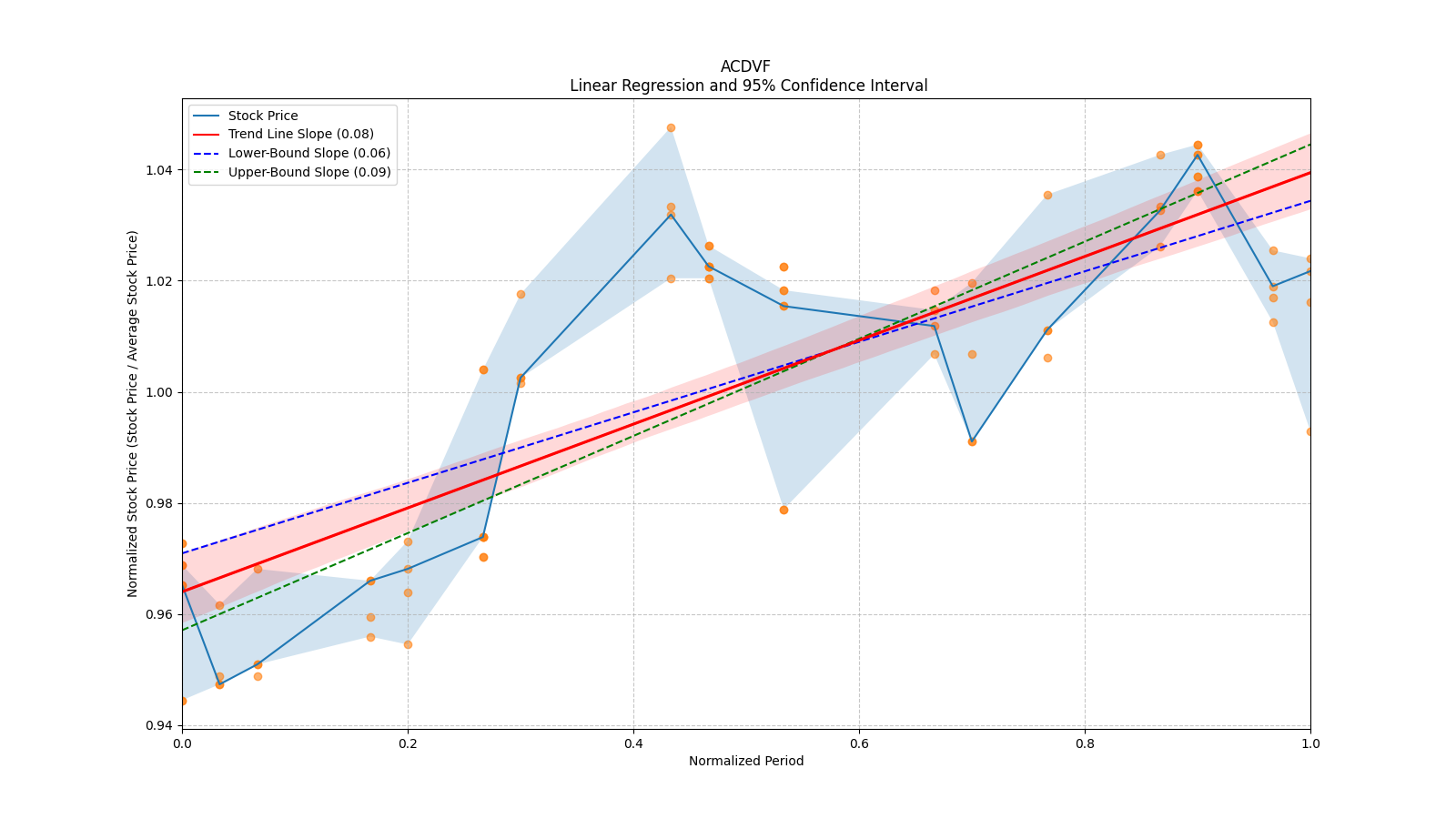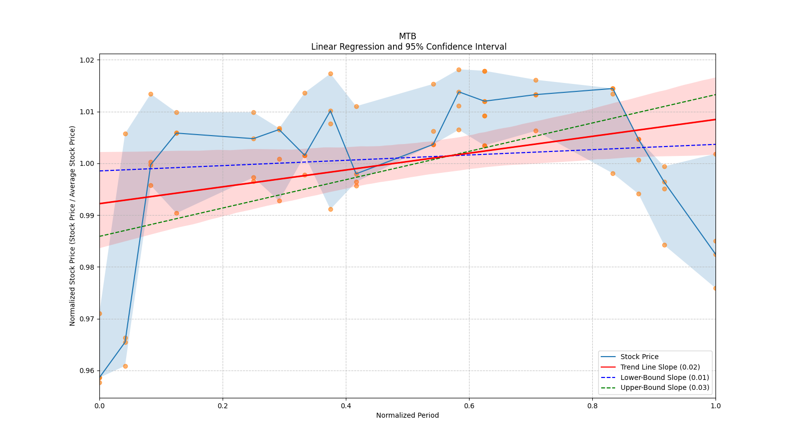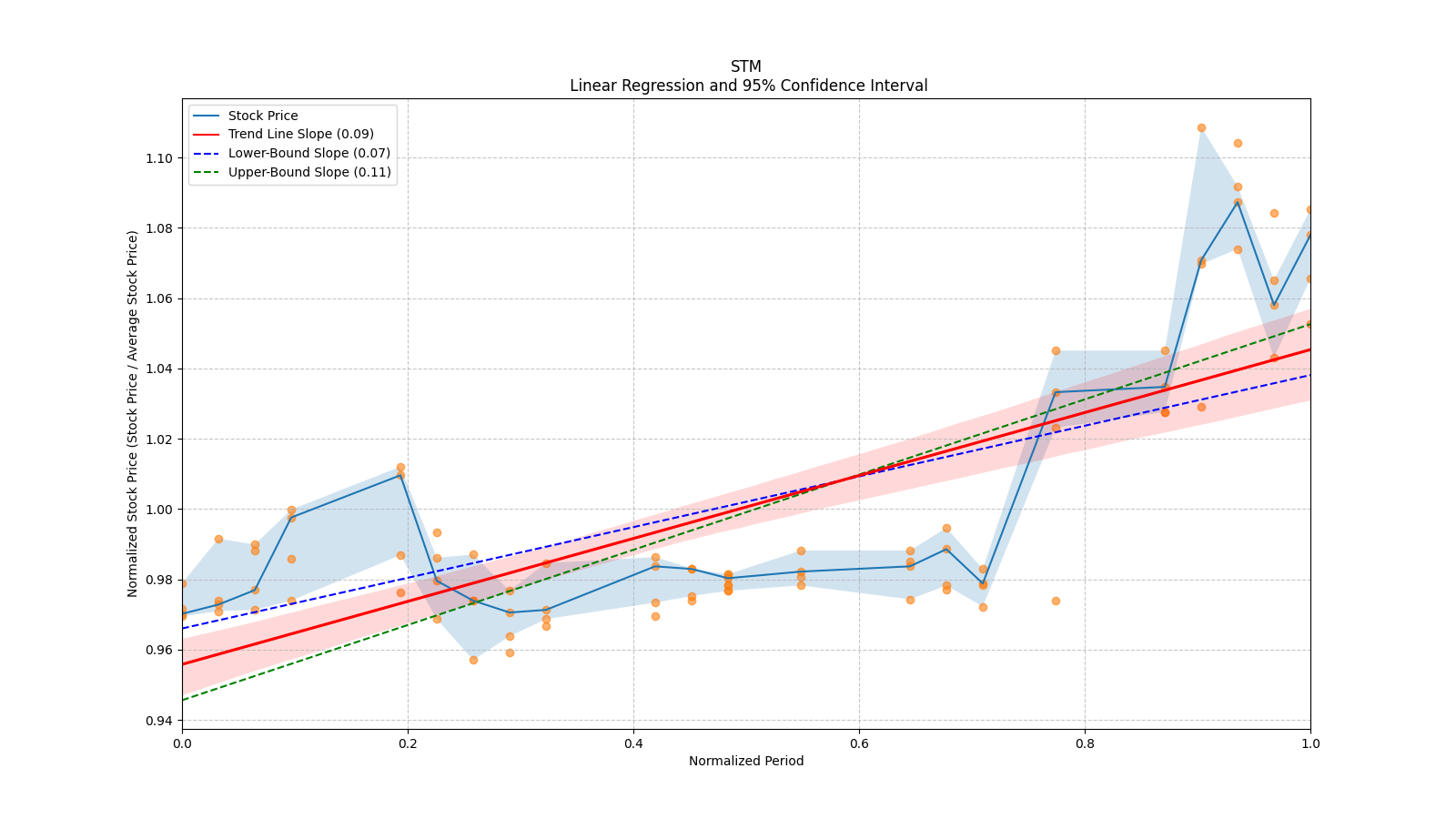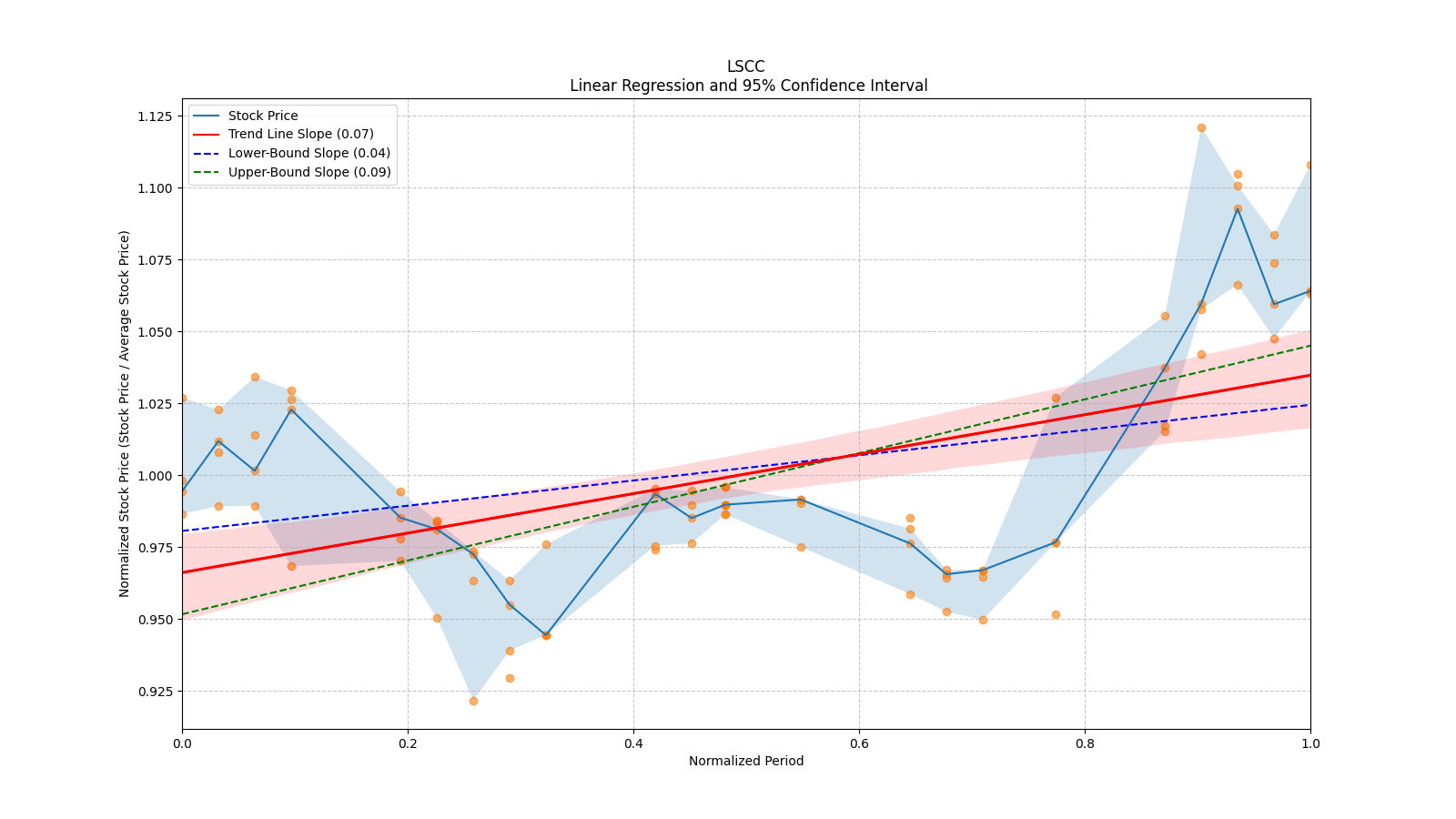Stocks were filtered to have a high investor grade, analyzed using linear regression, and sorted by the lower-bound trendline slope. The lower-bound trendline slope has been normalized by the average stock price and calculated using a 95% confidence interval. This statistic provides a conservative estimate of stock price percentage growth, taking into account both the trends and volatility of the stock price over the past month. With these details, you can easily compare stocks by their historical performance.