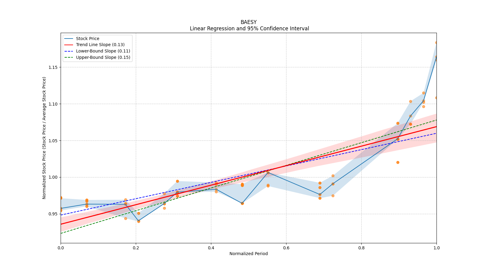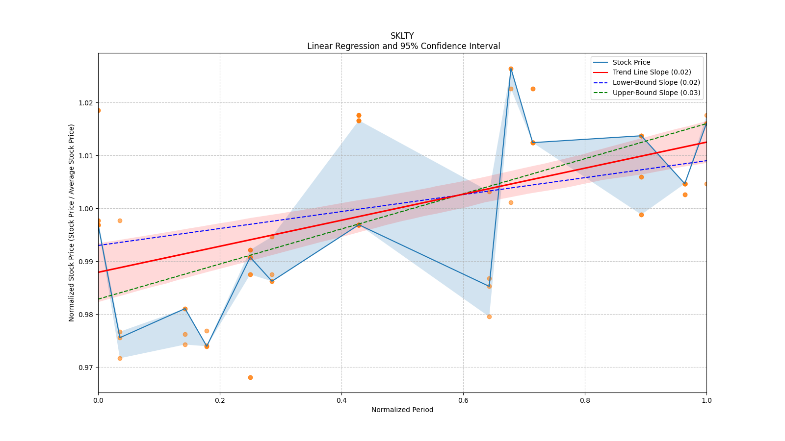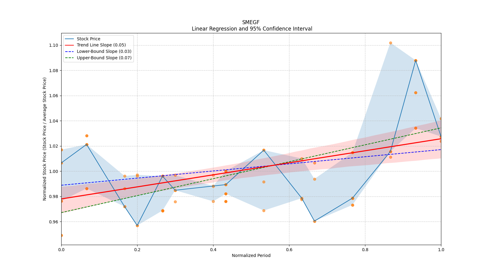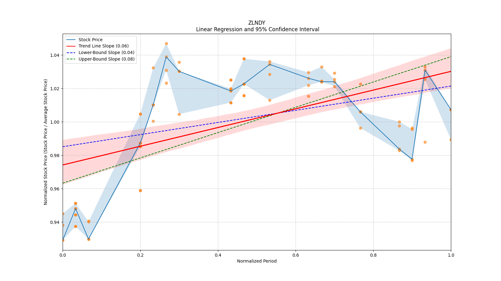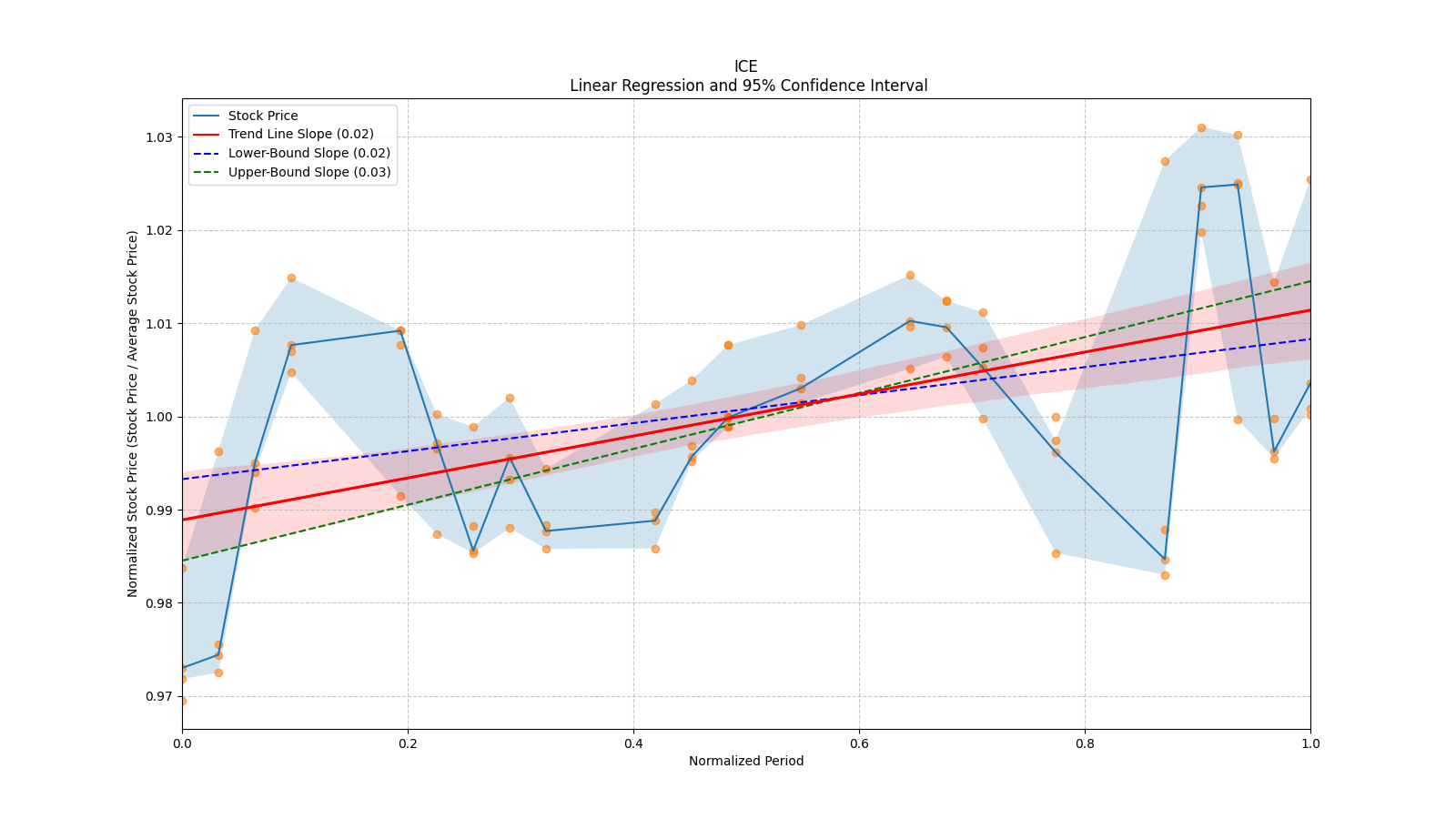 Stocks were filtered to have a high investor grade, analyzed using linear regression, and sorted by the lower-bound trendline slope. The lower-bound trendline slope has been normalized by the average stock price and calculated using a 95% confidence interval. This statistic provides a conservative estimate of stock price percentage growth, taking into account both the trends and volatility of the stock price over the past month. With these details, you can easily compare stocks by their historical performance.