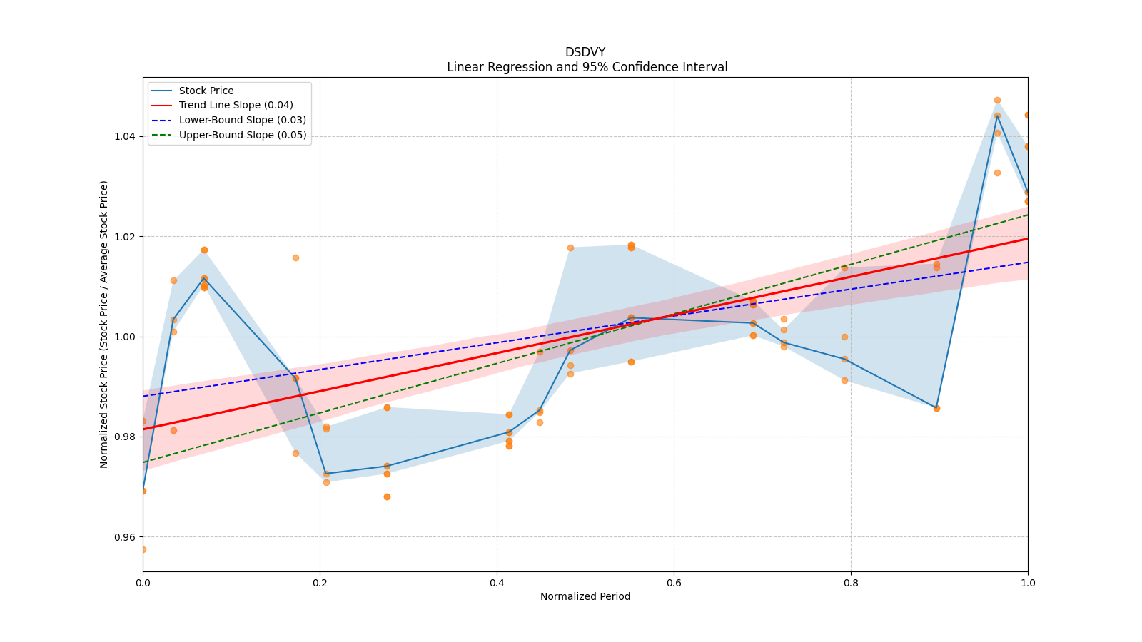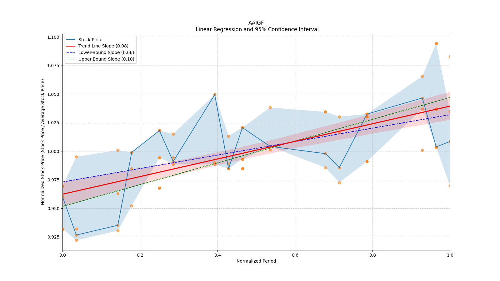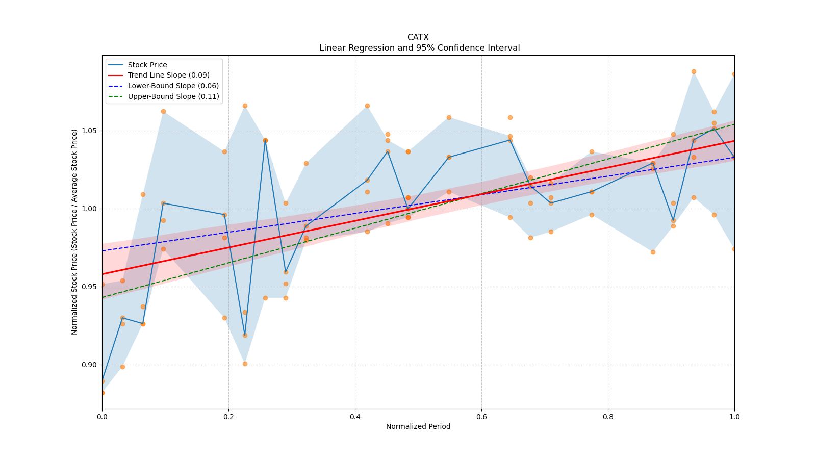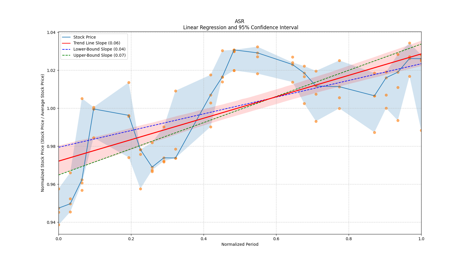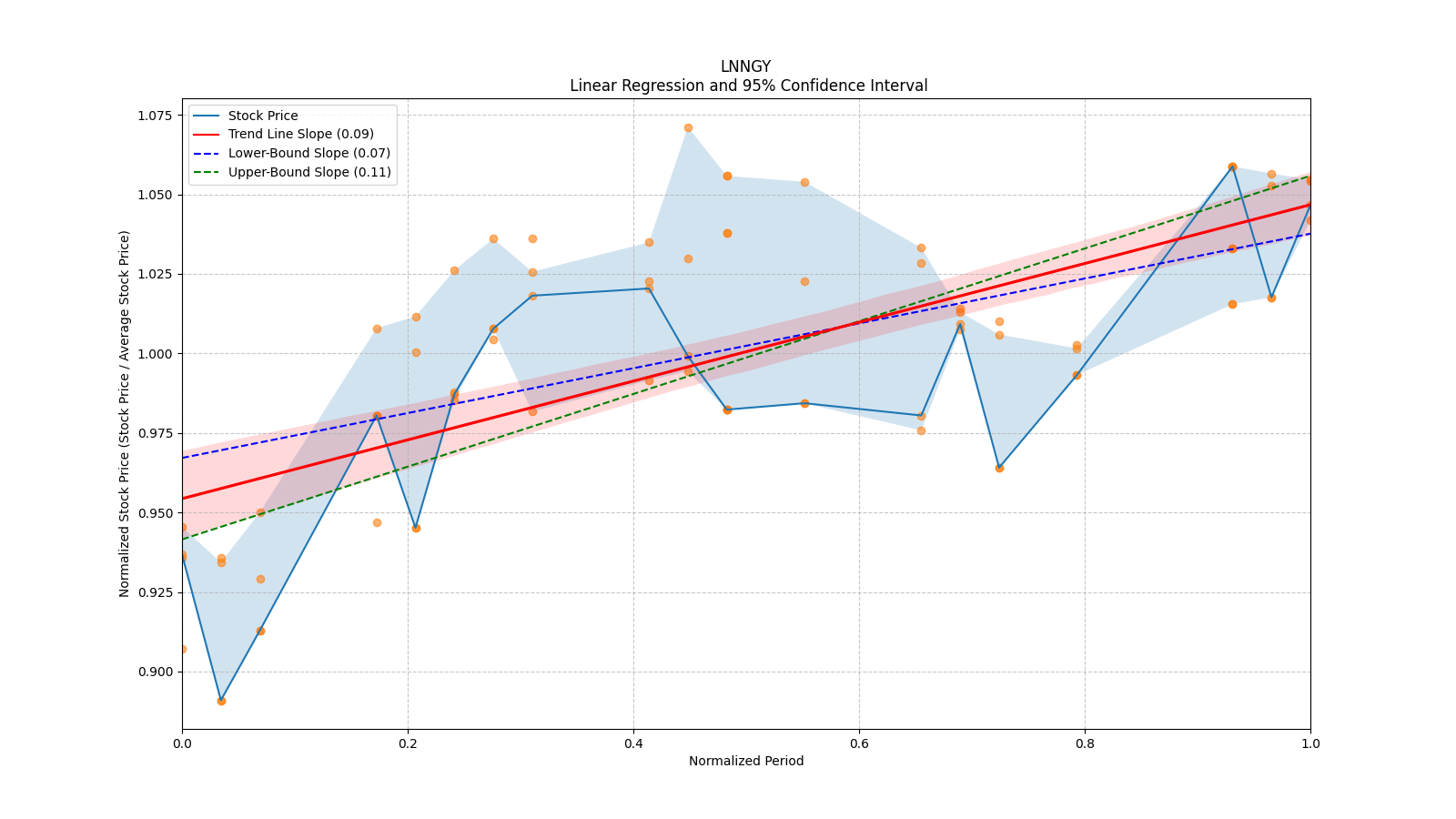 Stocks were filtered to have a high investor grade, analyzed using linear regression, and sorted by the lower-bound trendline slope. The lower-bound trendline slope has been normalized by the average stock price and calculated using a 95% confidence interval. This statistic provides a conservative estimate of stock price percentage growth, taking into account both the trends and volatility of the stock price over the past month. With these details, you can easily compare stocks by their historical performance.