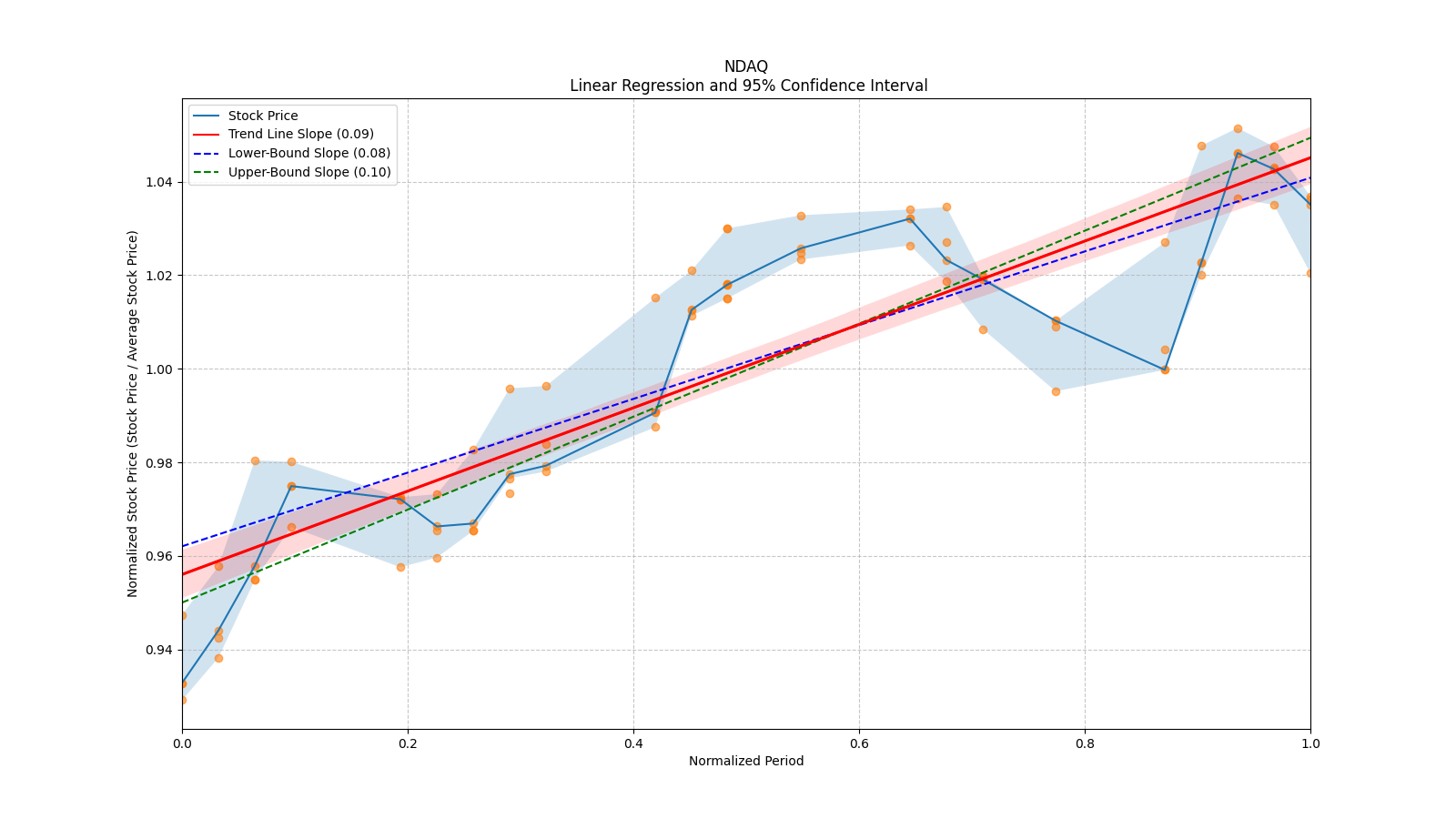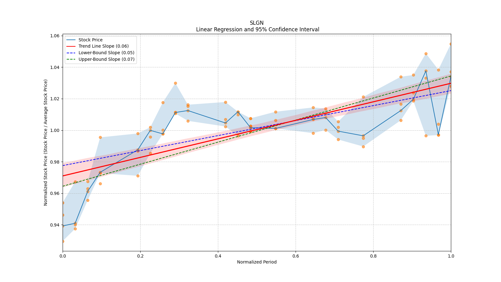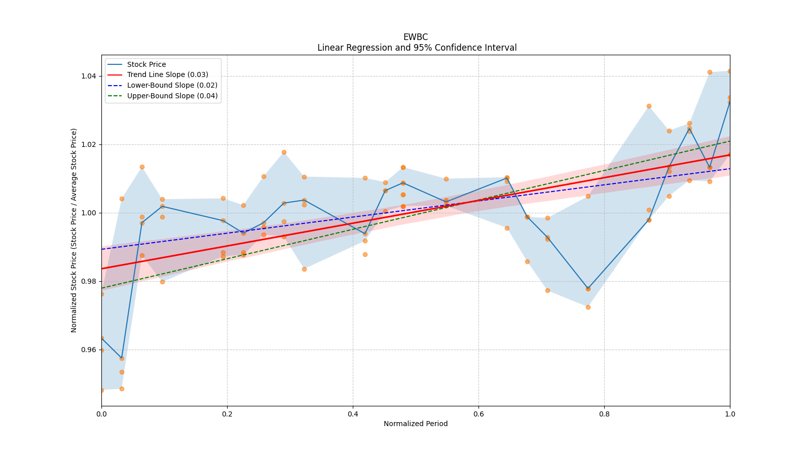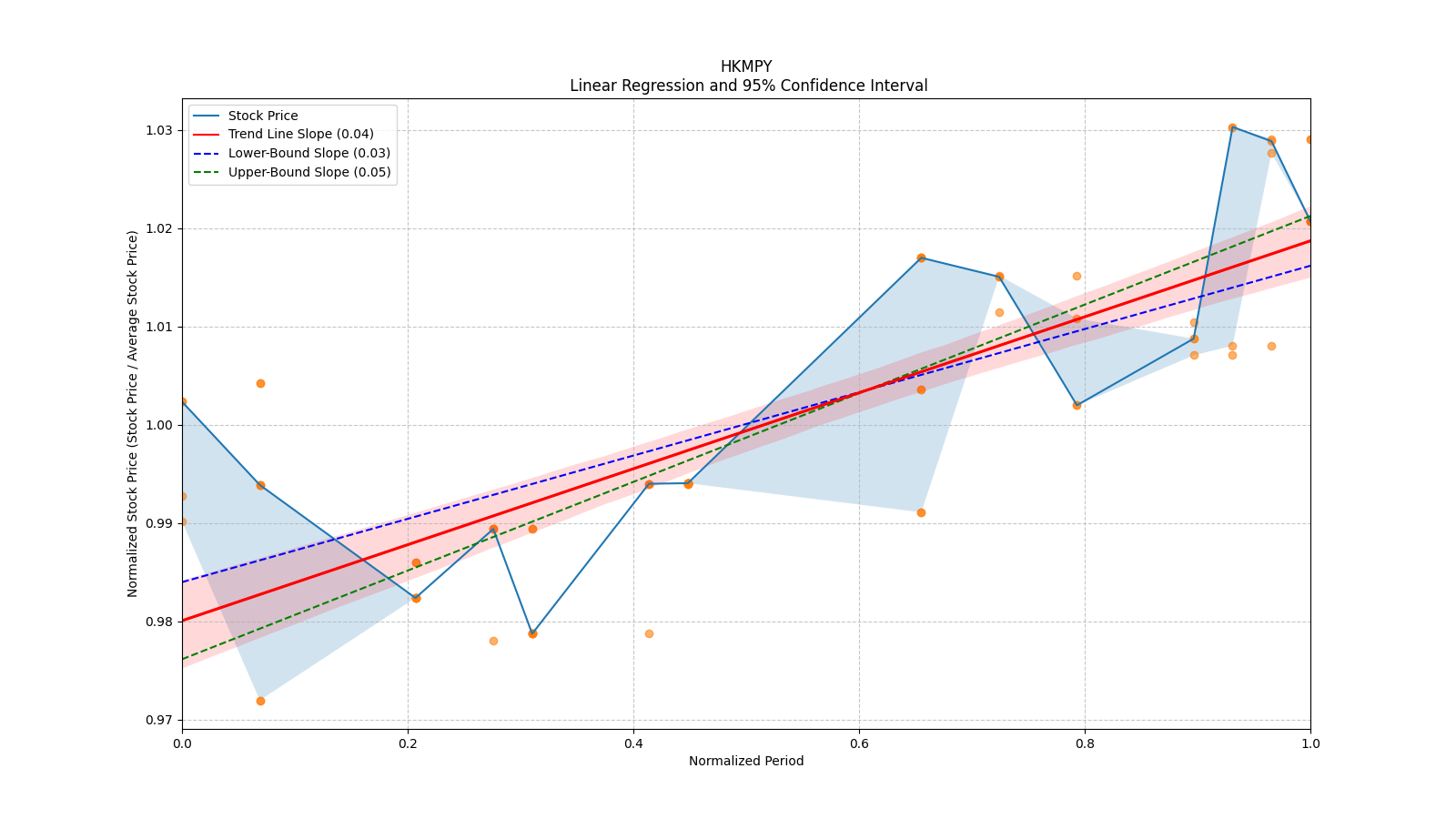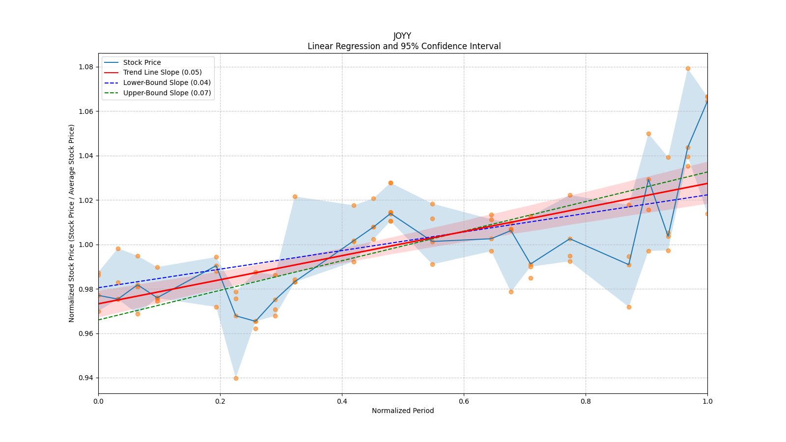 Stocks were filtered to have a high investor grade, analyzed using linear regression, and sorted by the lower-bound trendline slope. The lower-bound trendline slope has been normalized by the average stock price and calculated using a 95% confidence interval. This statistic provides a conservative estimate of stock price percentage growth, taking into account both the trends and volatility of the stock price over the past month. With these details, you can easily compare stocks by their historical performance.