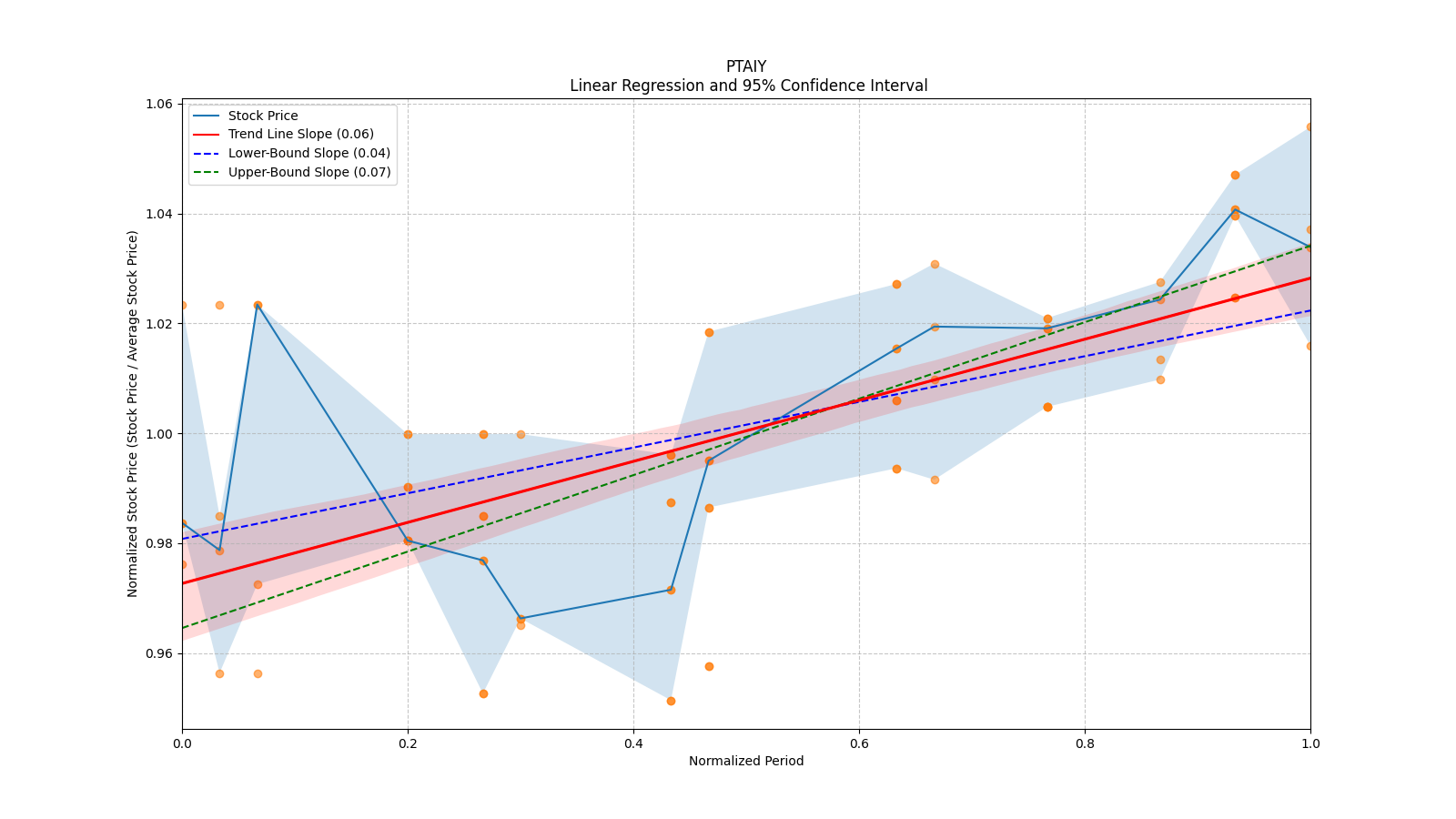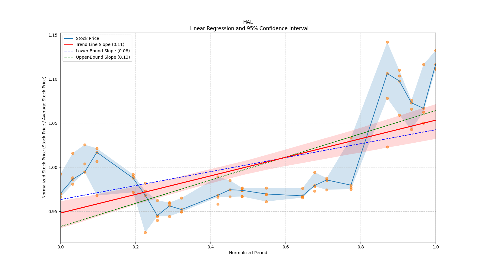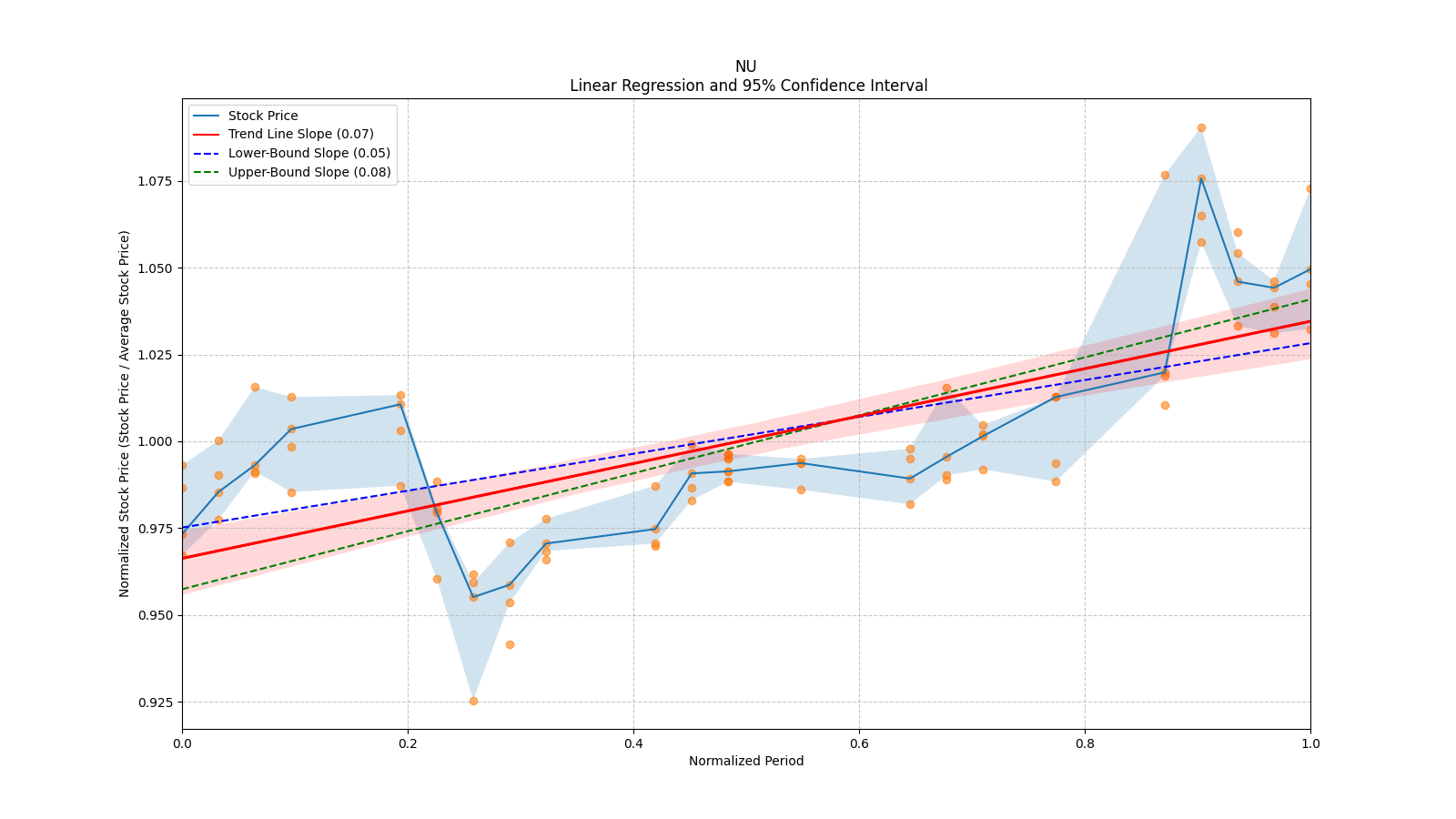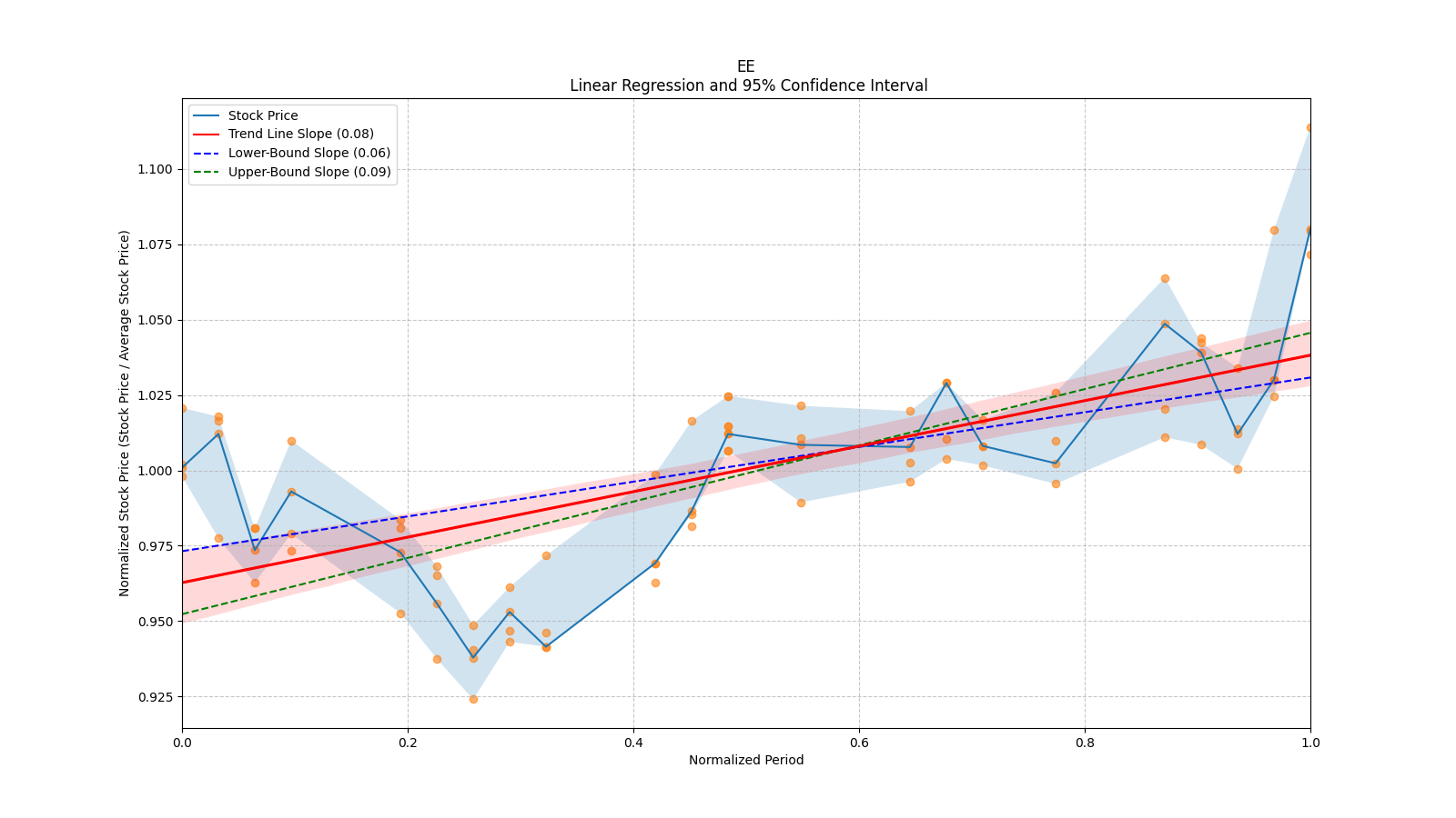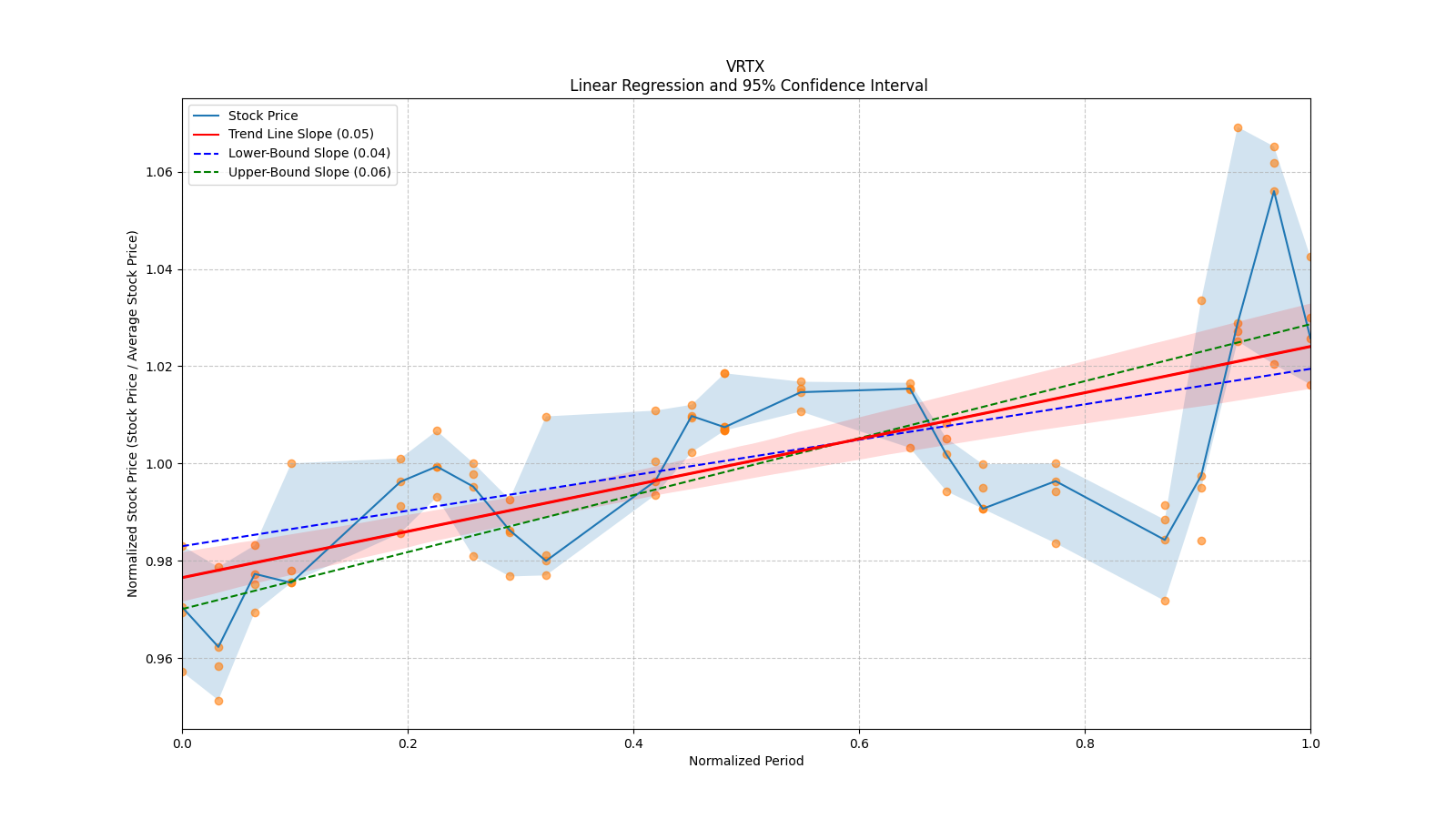 Stocks were filtered to have a high investor grade, analyzed using linear regression, and sorted by the lower-bound trendline slope. The lower-bound trendline slope has been normalized by the average stock price and calculated using a 95% confidence interval. This statistic provides a conservative estimate of stock price percentage growth, taking into account both the trends and volatility of the stock price over the past month. With these details, you can easily compare stocks by their historical performance.