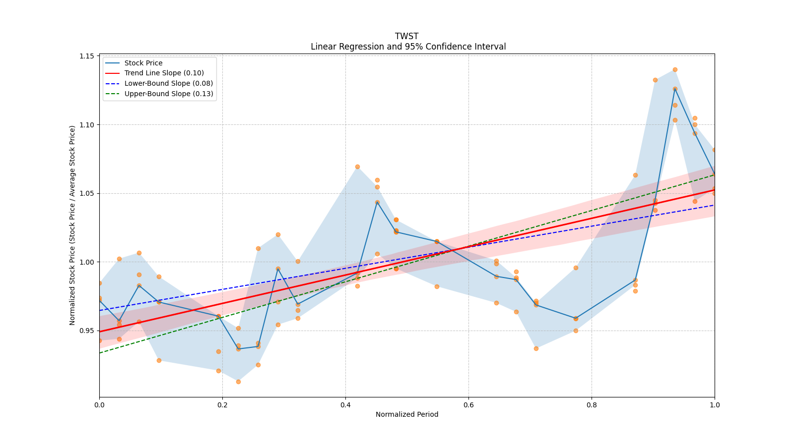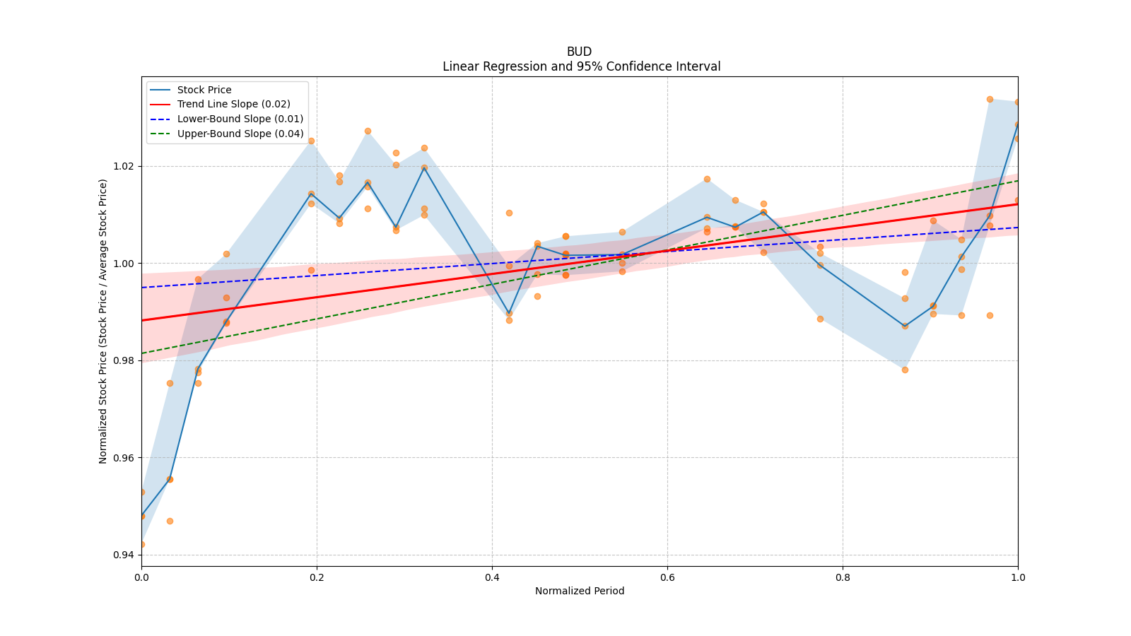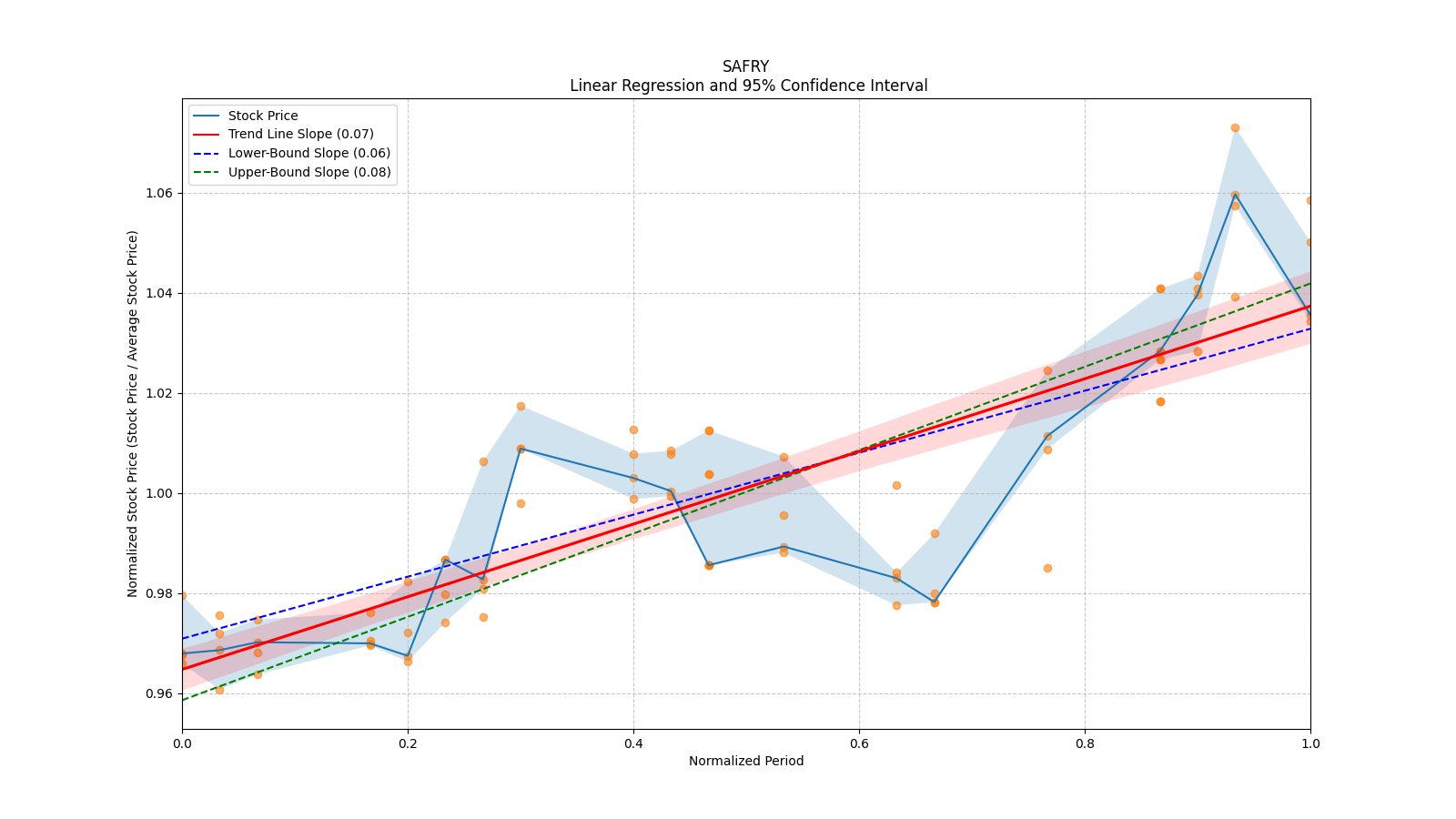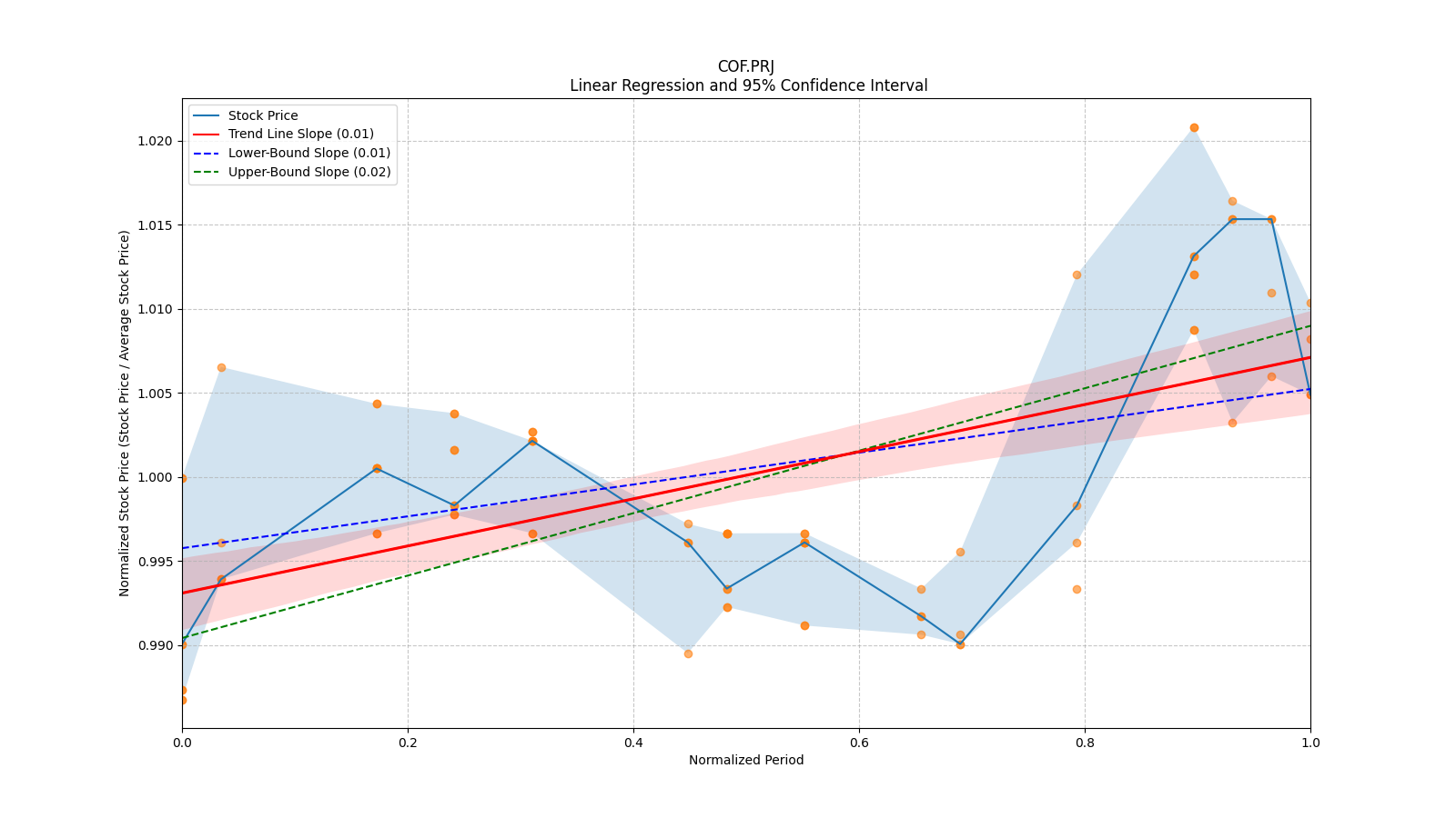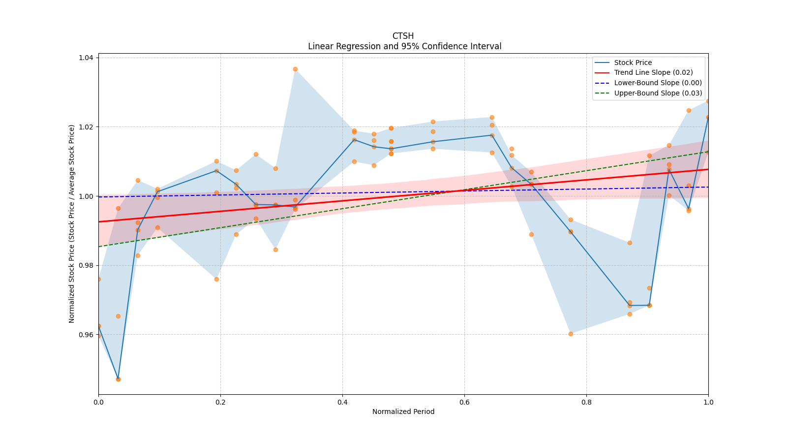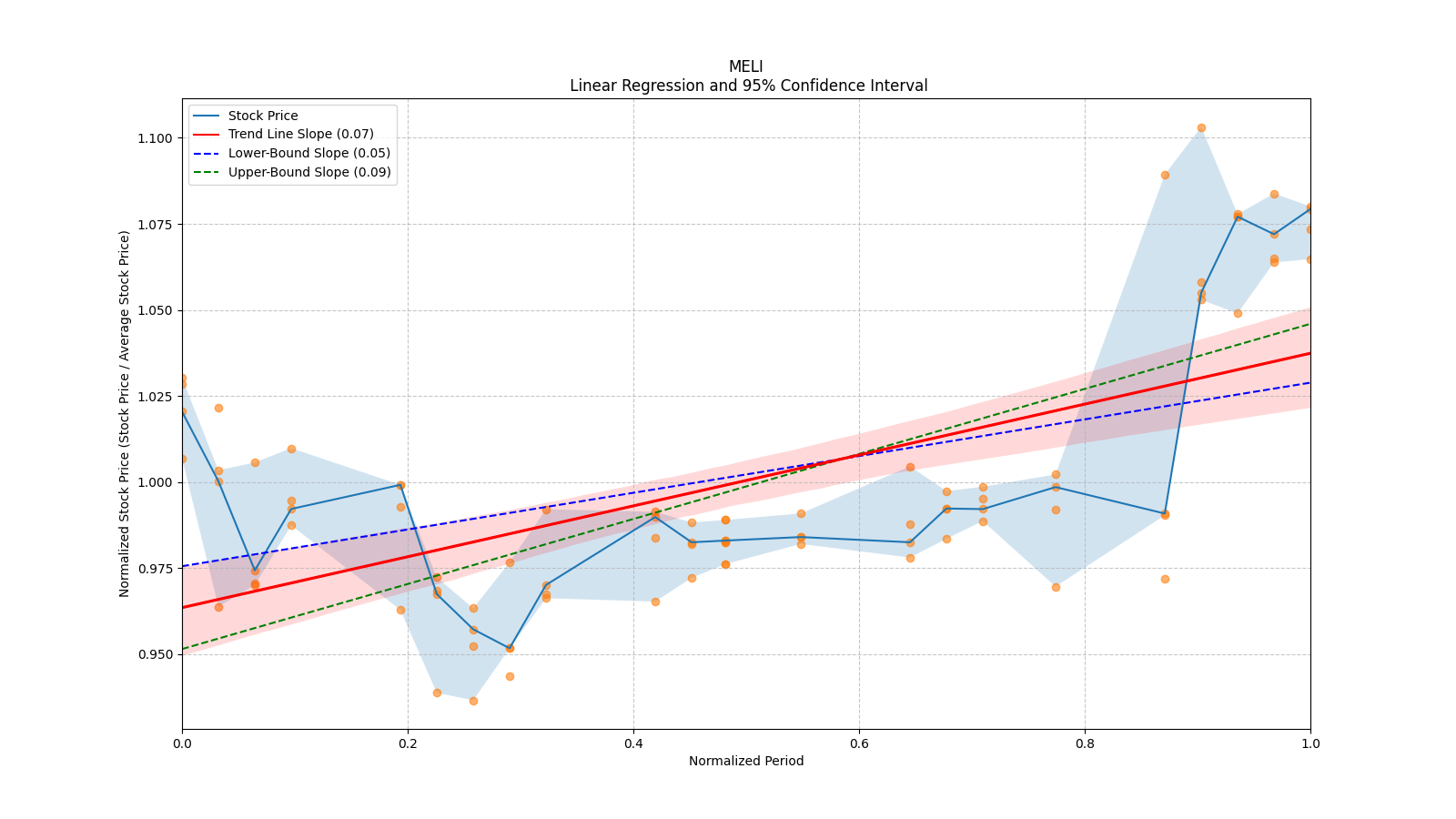 Stocks were filtered to have a high investor grade, analyzed using linear regression, and sorted by the lower-bound trendline slope. The lower-bound trendline slope has been normalized by the average stock price and calculated using a 95% confidence interval. This statistic provides a conservative estimate of stock price percentage growth, taking into account both the trends and volatility of the stock price over the past month. With these details, you can easily compare stocks by their historical performance.