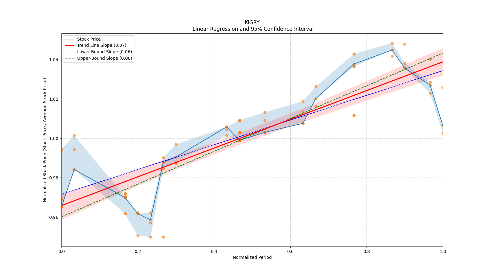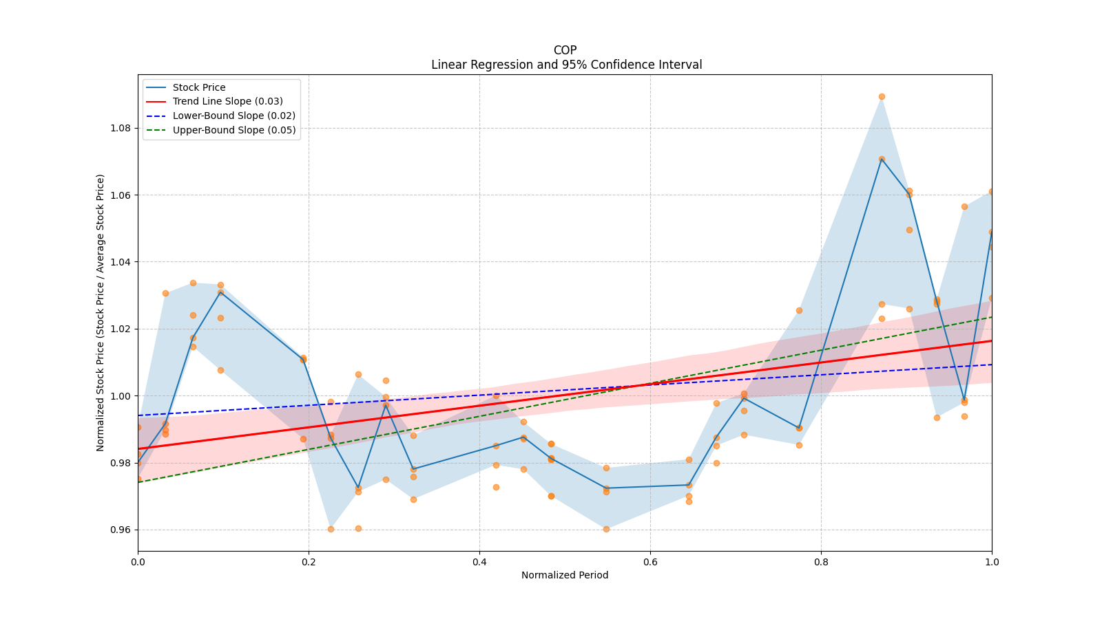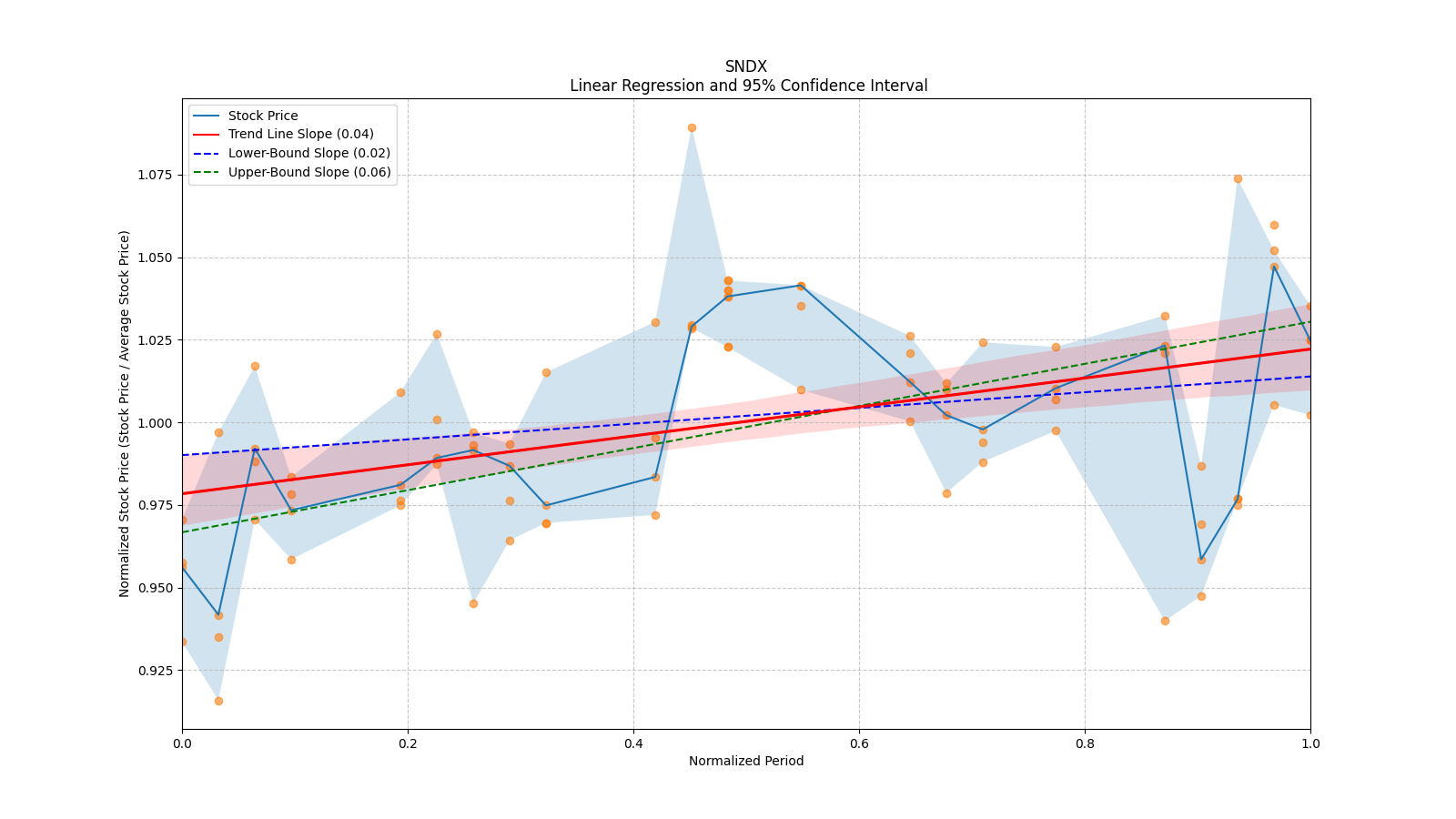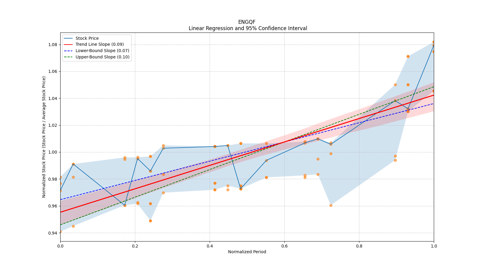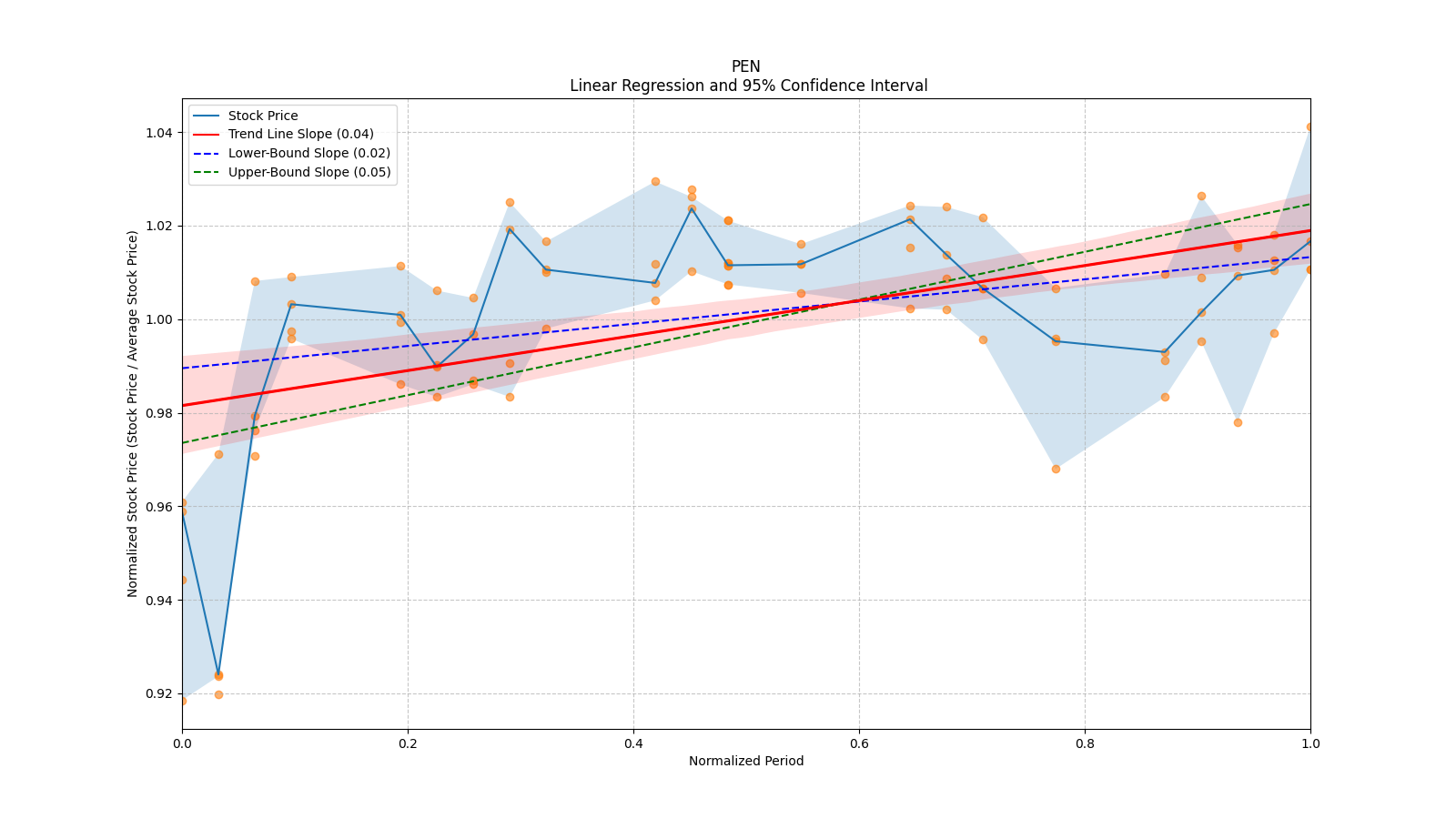 Stocks were filtered to have a high investor grade, analyzed using linear regression, and sorted by the lower-bound trendline slope. The lower-bound trendline slope has been normalized by the average stock price and calculated using a 95% confidence interval. This statistic provides a conservative estimate of stock price percentage growth, taking into account both the trends and volatility of the stock price over the past month. With these details, you can easily compare stocks by their historical performance.