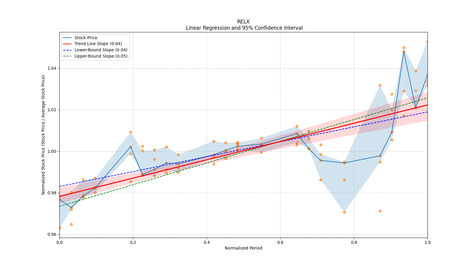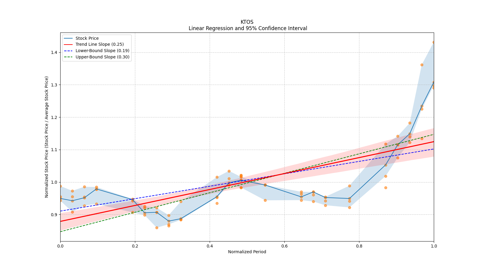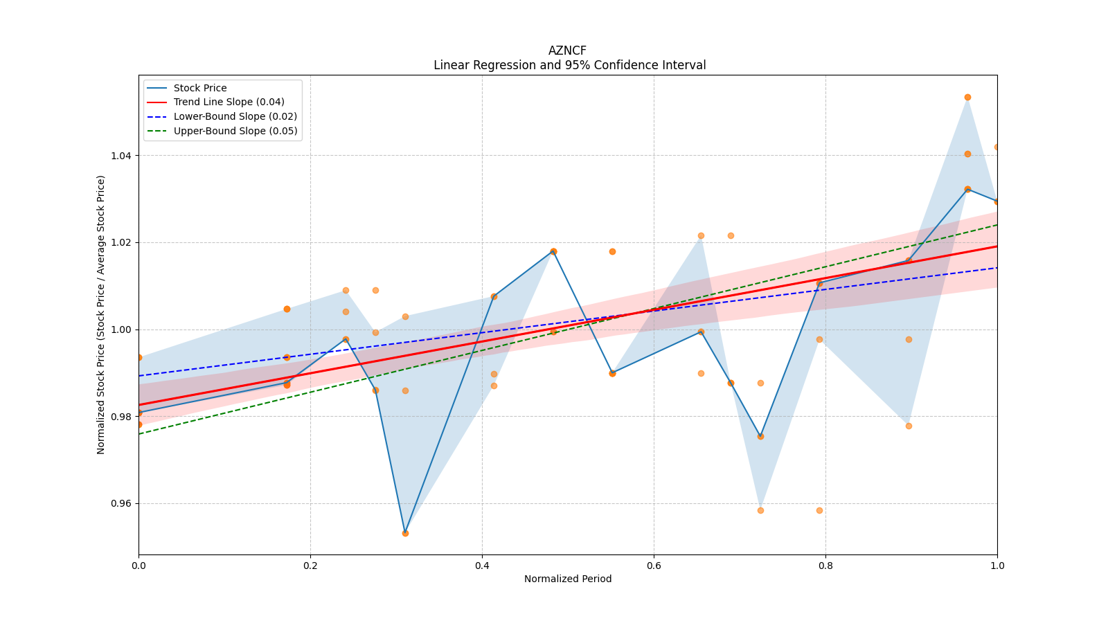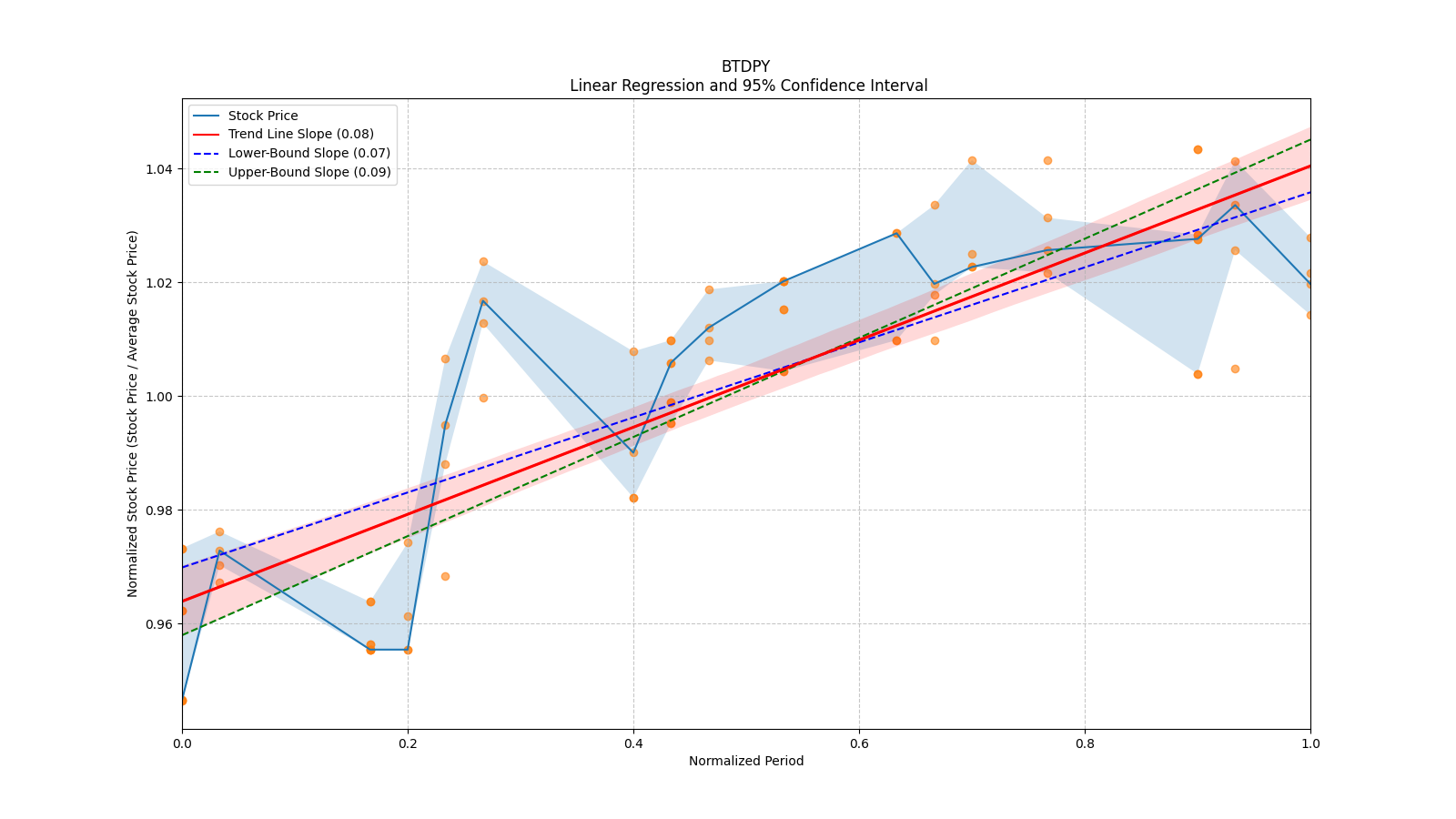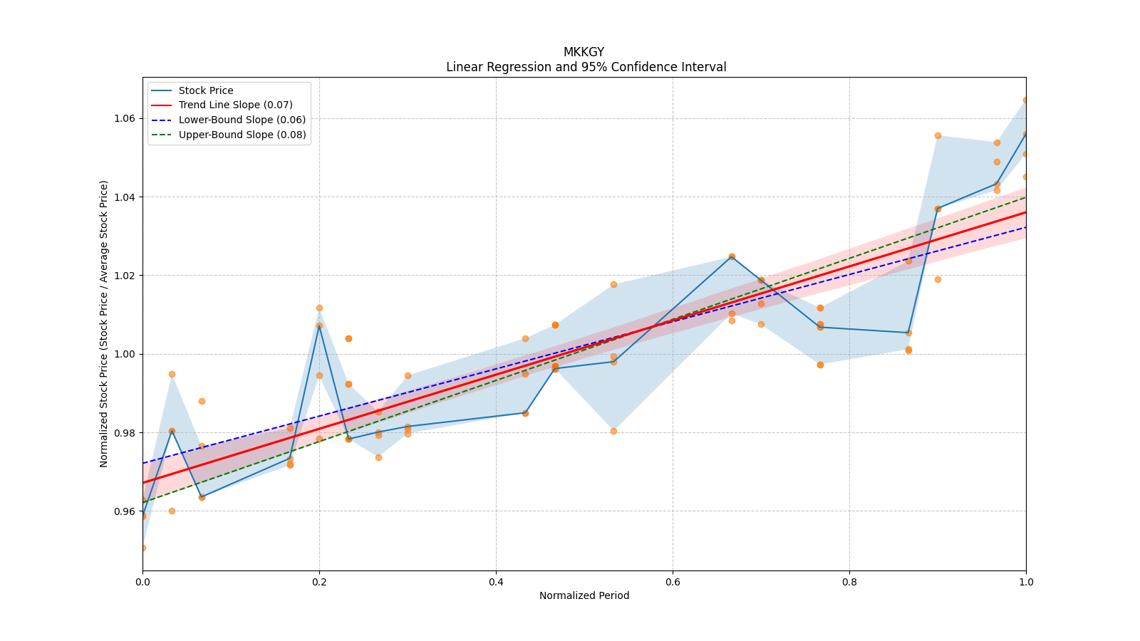 Stocks were filtered to have a high investor grade, analyzed using linear regression, and sorted by the lower-bound trendline slope. The lower-bound trendline slope has been normalized by the average stock price and calculated using a 95% confidence interval. This statistic provides a conservative estimate of stock price percentage growth, taking into account both the trends and volatility of the stock price over the past month. With these details, you can easily compare stocks by their historical performance.