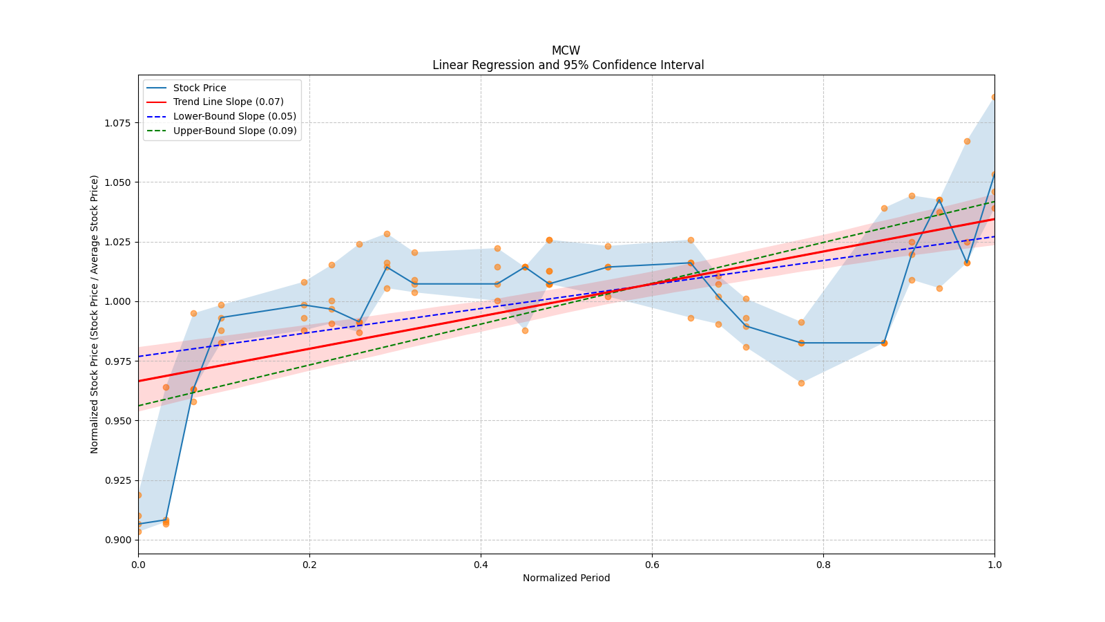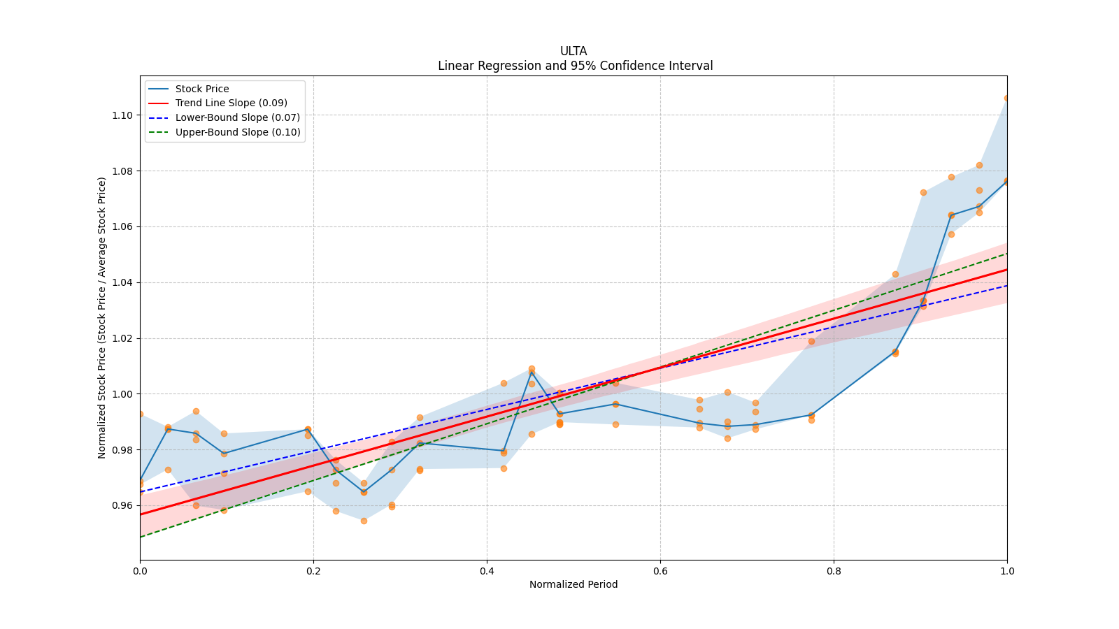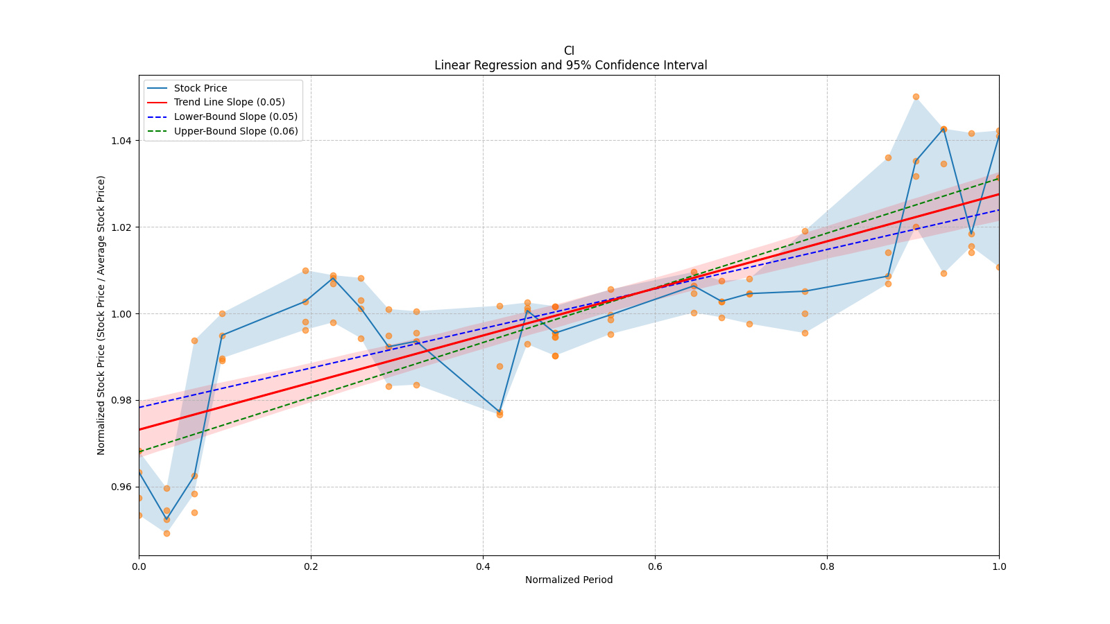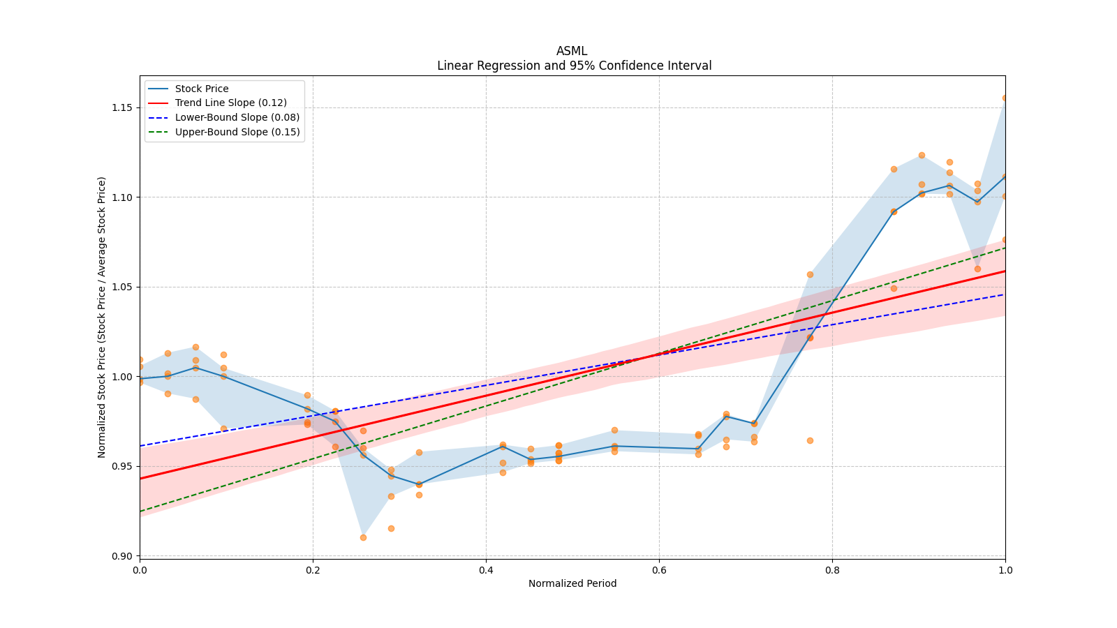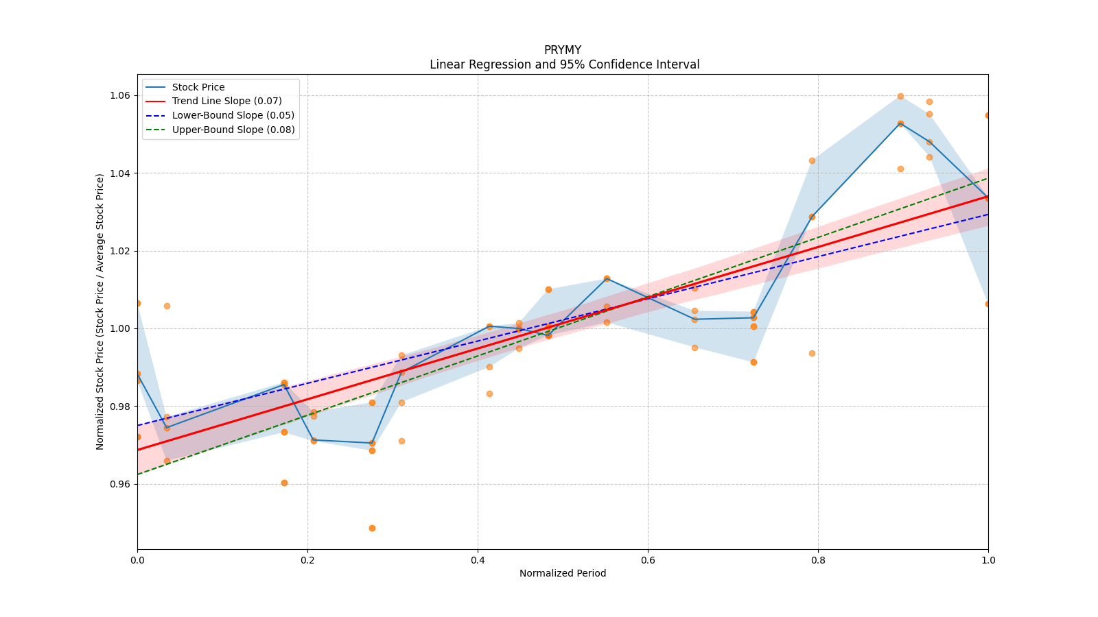 Stocks were filtered to have a high investor grade, analyzed using linear regression, and sorted by the lower-bound trendline slope. The lower-bound trendline slope has been normalized by the average stock price and calculated using a 95% confidence interval. This statistic provides a conservative estimate of stock price percentage growth, taking into account both the trends and volatility of the stock price over the past month. With these details, you can easily compare stocks by their historical performance.