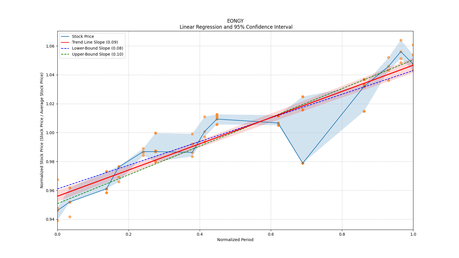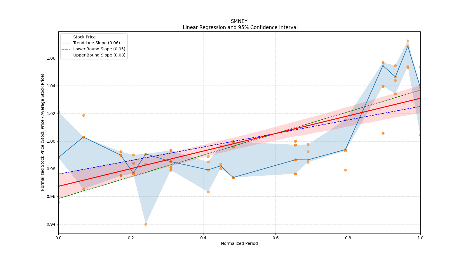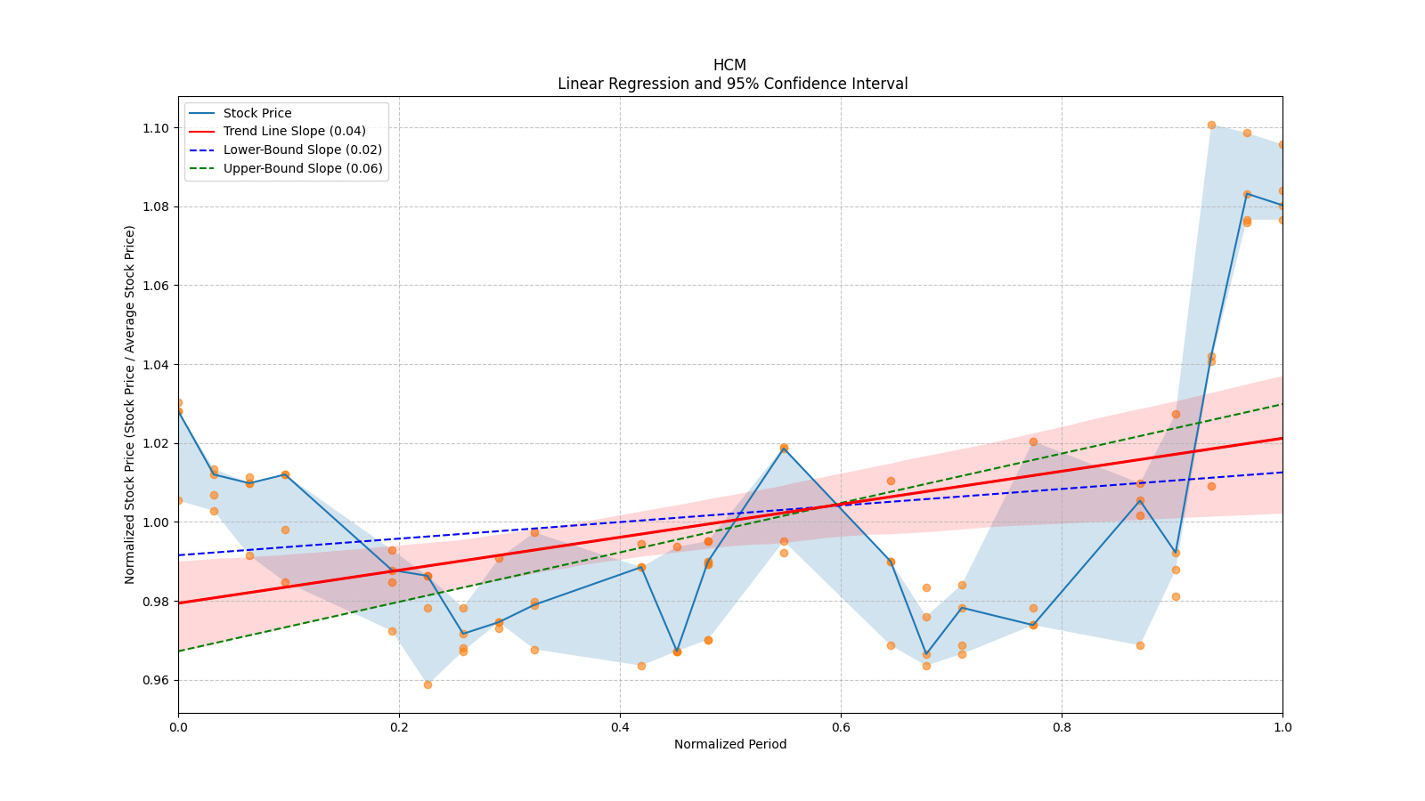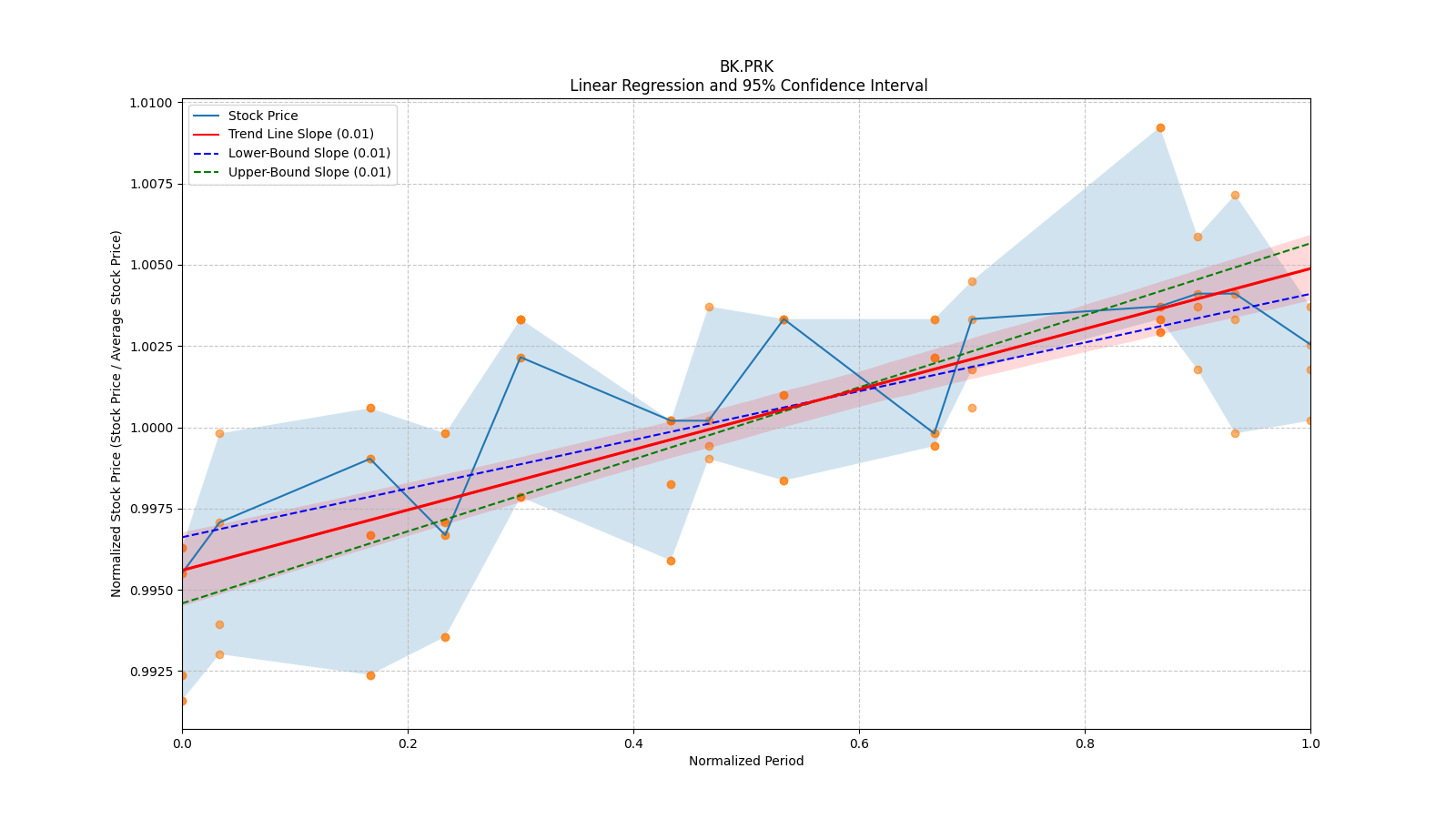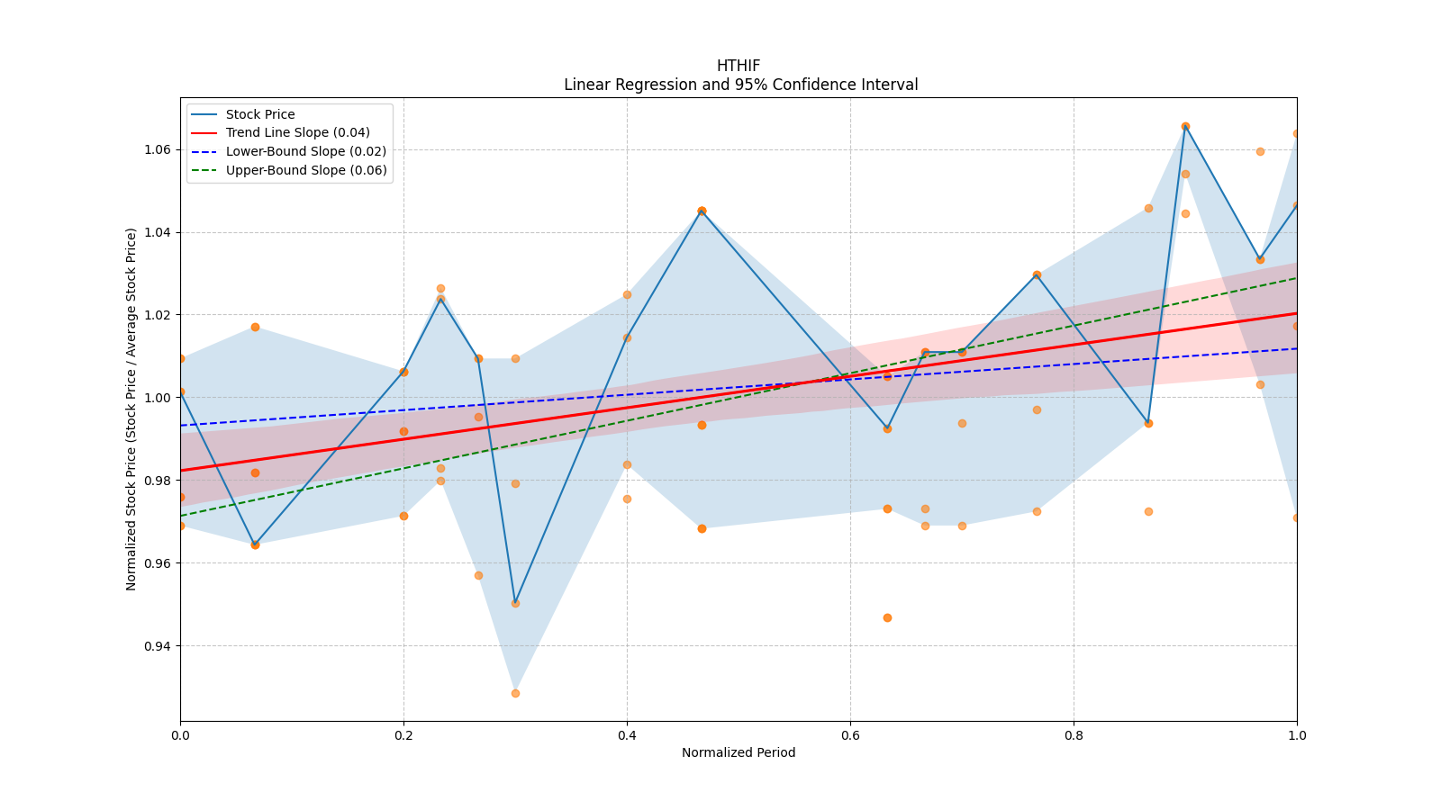 Stocks were filtered to have a high investor grade, analyzed using linear regression, and sorted by the lower-bound trendline slope. The lower-bound trendline slope has been normalized by the average stock price and calculated using a 95% confidence interval. This statistic provides a conservative estimate of stock price percentage growth, taking into account both the trends and volatility of the stock price over the past month. With these details, you can easily compare stocks by their historical performance.