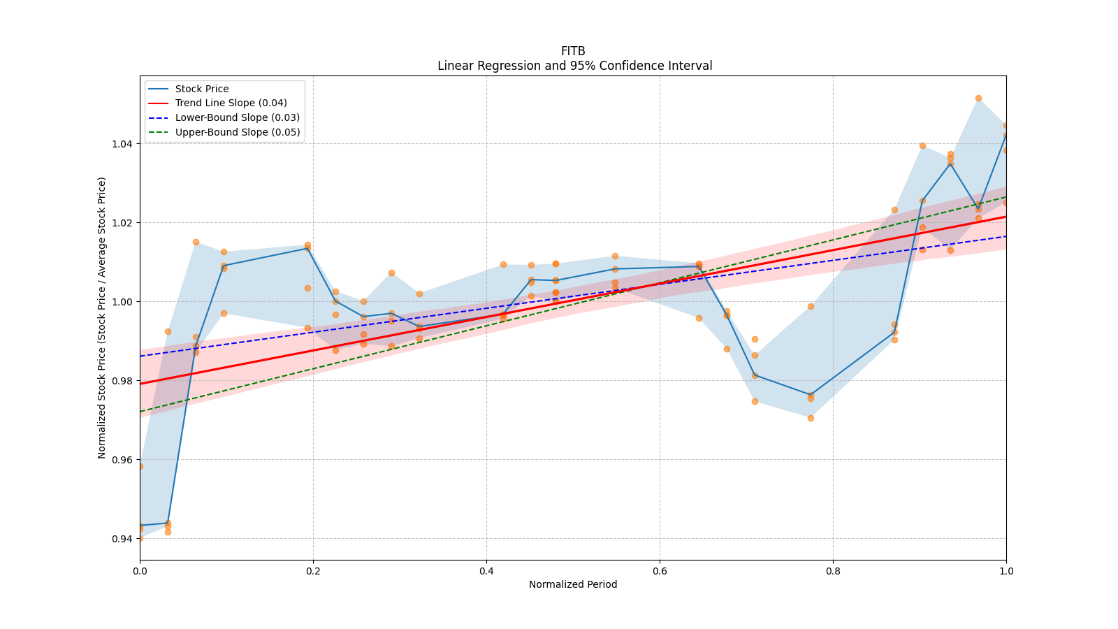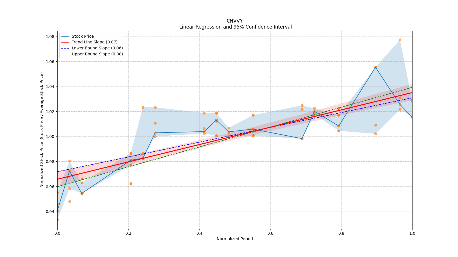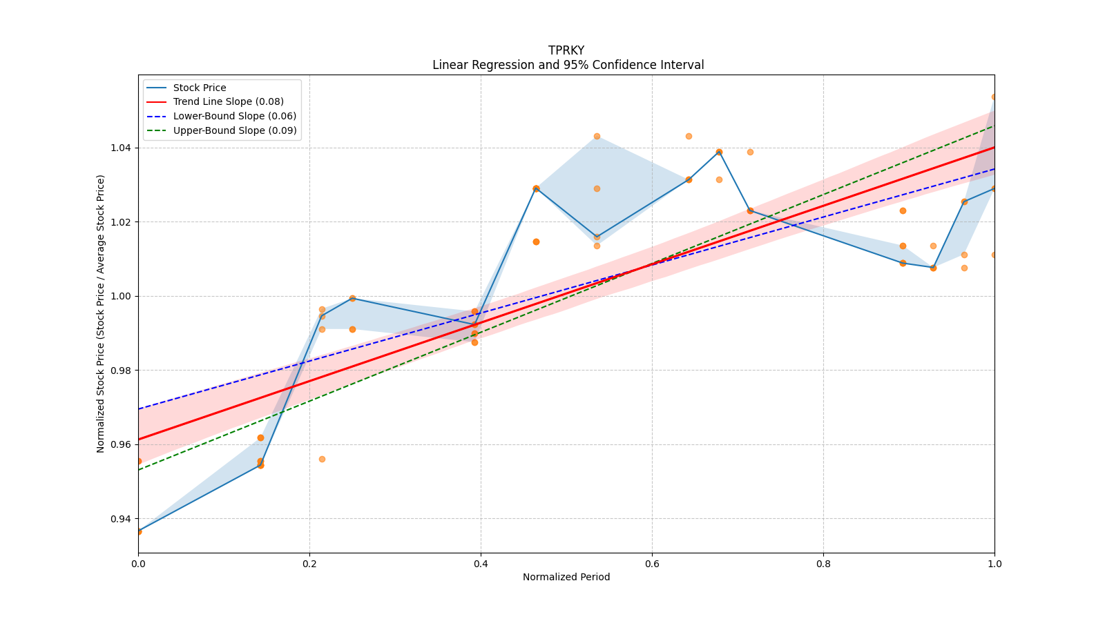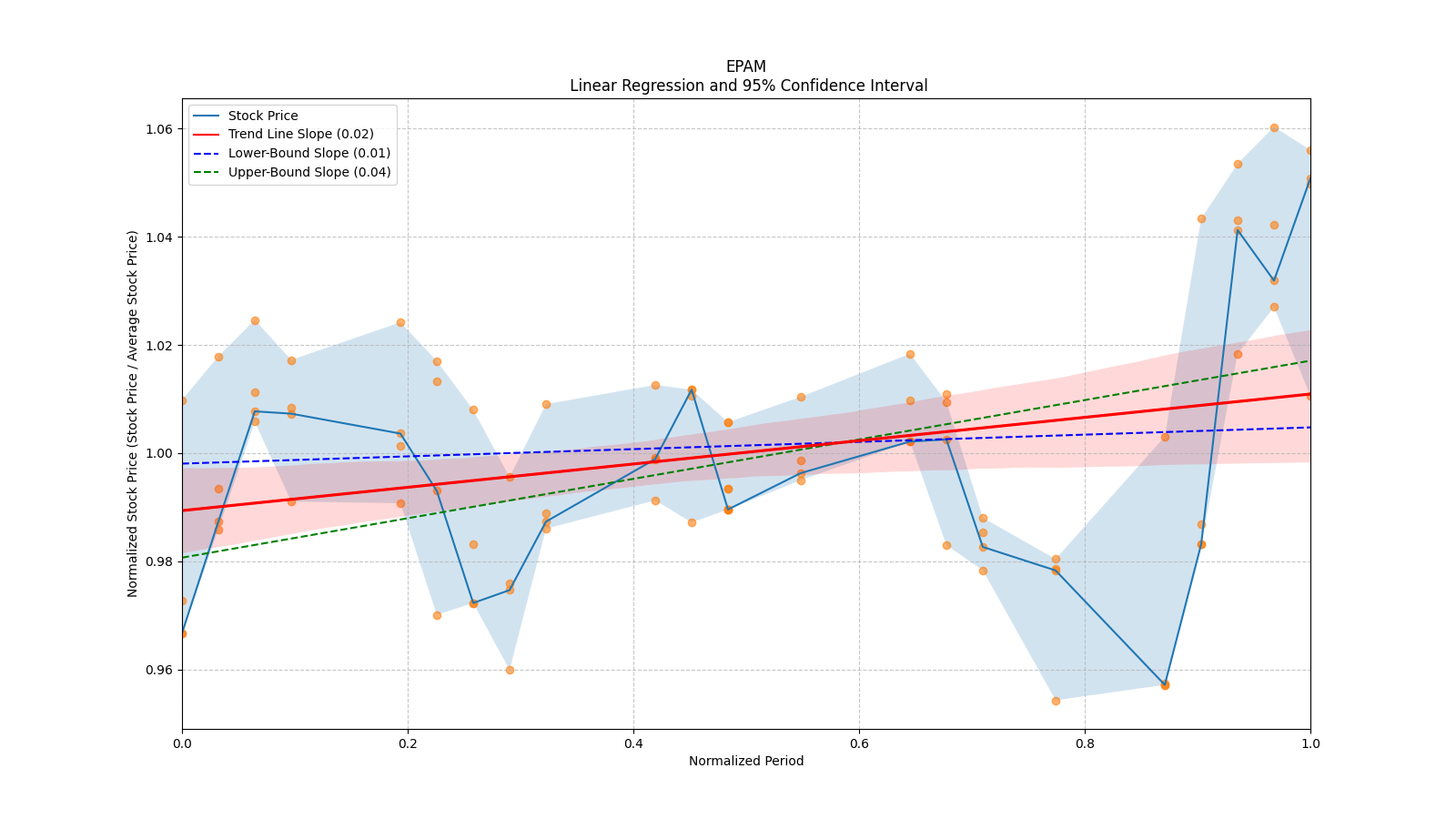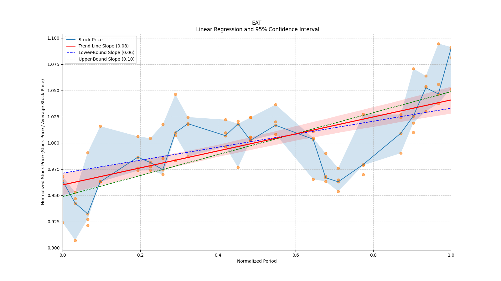 Stocks were filtered to have a high investor grade, analyzed using linear regression, and sorted by the lower-bound trendline slope. The lower-bound trendline slope has been normalized by the average stock price and calculated using a 95% confidence interval. This statistic provides a conservative estimate of stock price percentage growth, taking into account both the trends and volatility of the stock price over the past month. With these details, you can easily compare stocks by their historical performance.