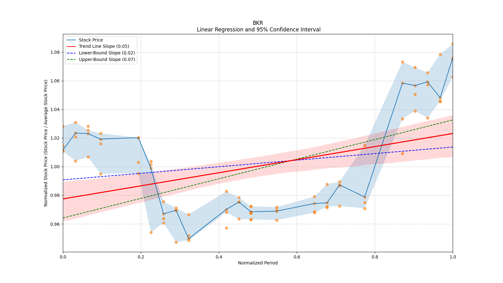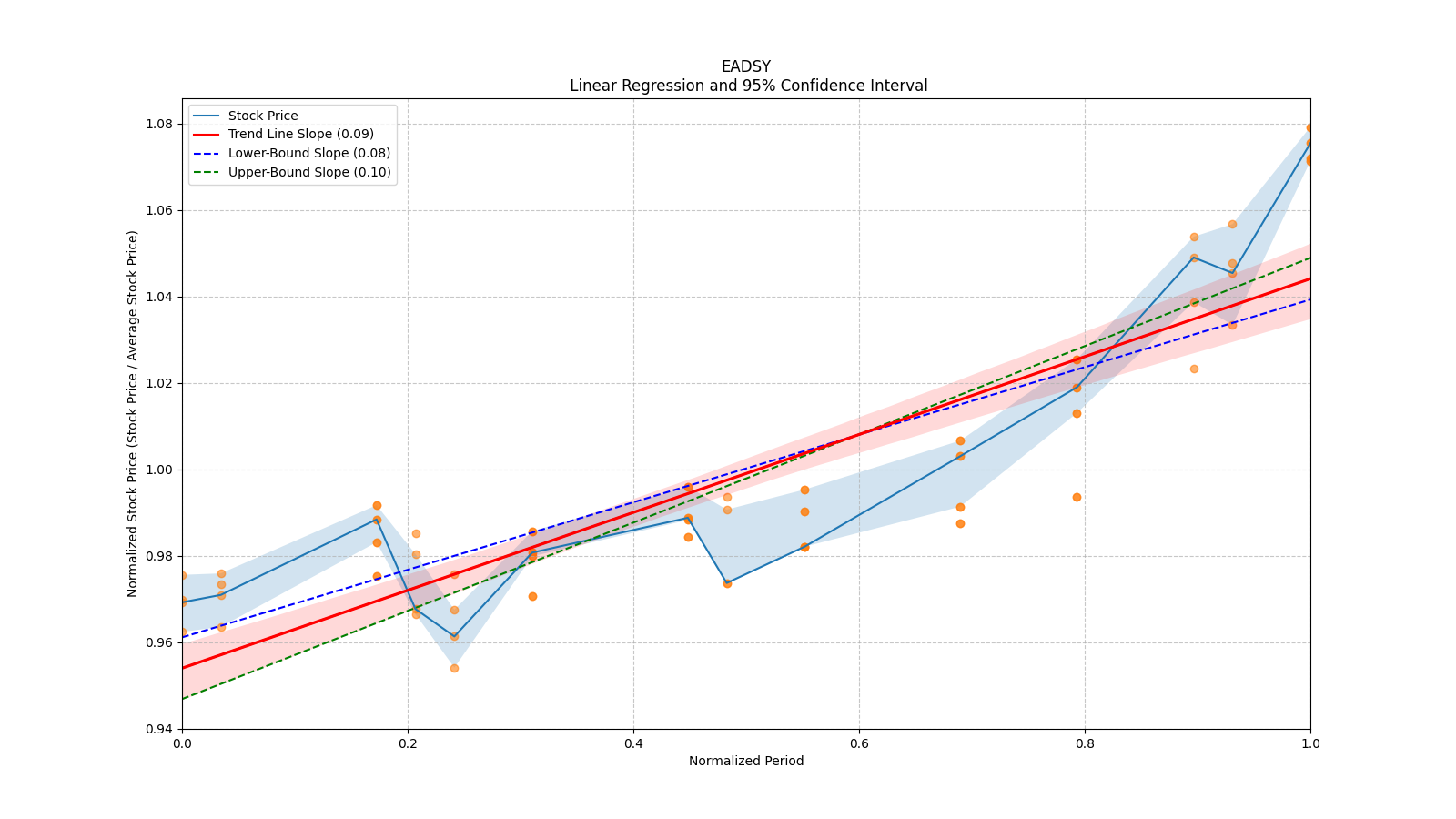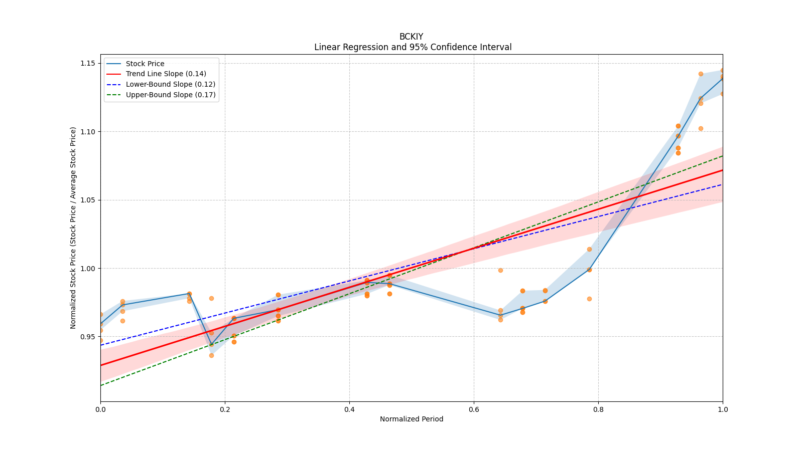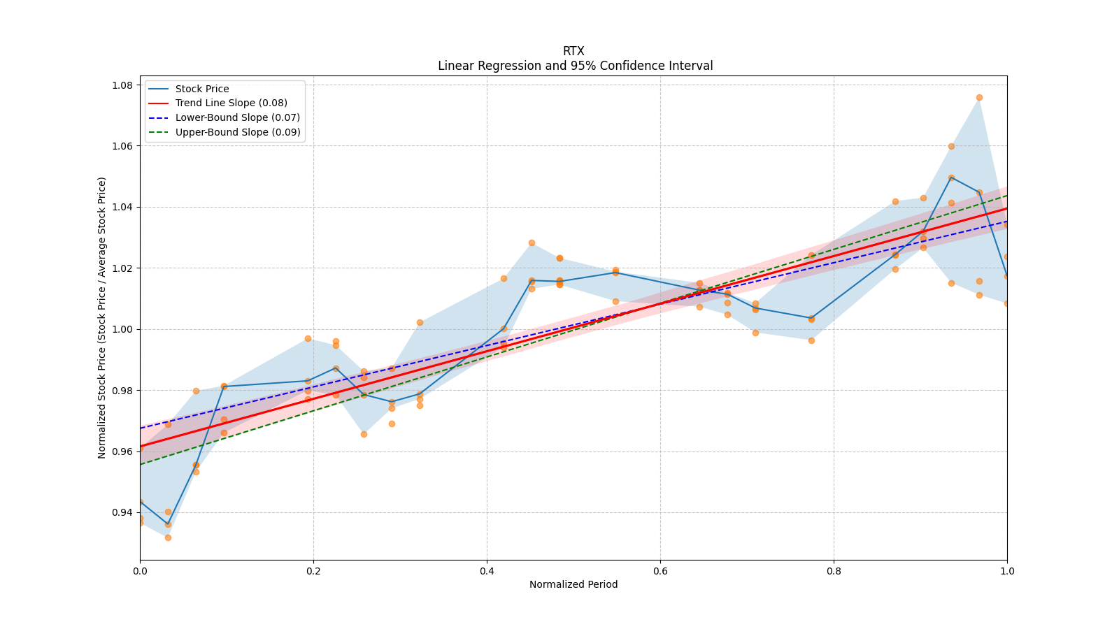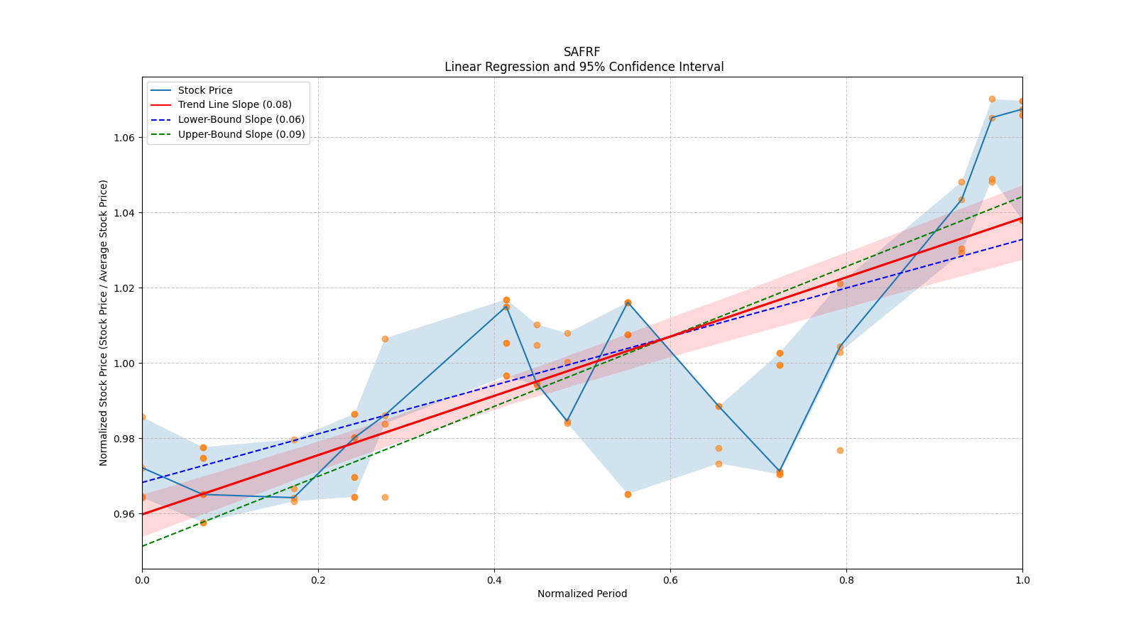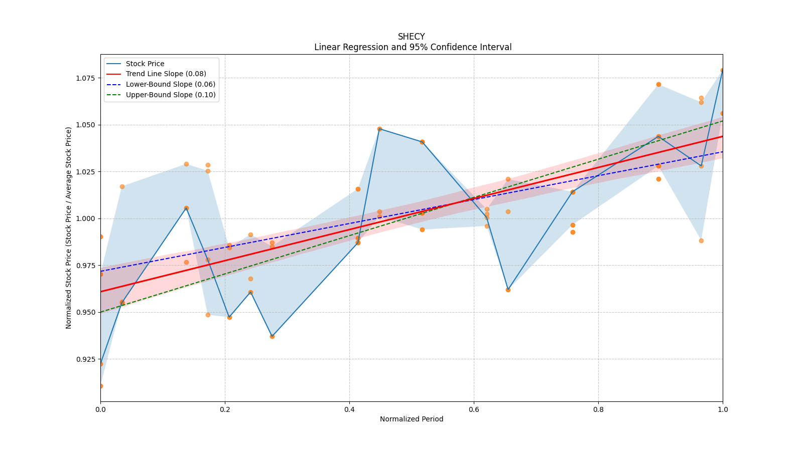 Stocks were filtered to have a high investor grade, analyzed using linear regression, and sorted by the lower-bound trendline slope. The lower-bound trendline slope has been normalized by the average stock price and calculated using a 95% confidence interval. This statistic provides a conservative estimate of stock price percentage growth, taking into account both the trends and volatility of the stock price over the past month. With these details, you can easily compare stocks by their historical performance.