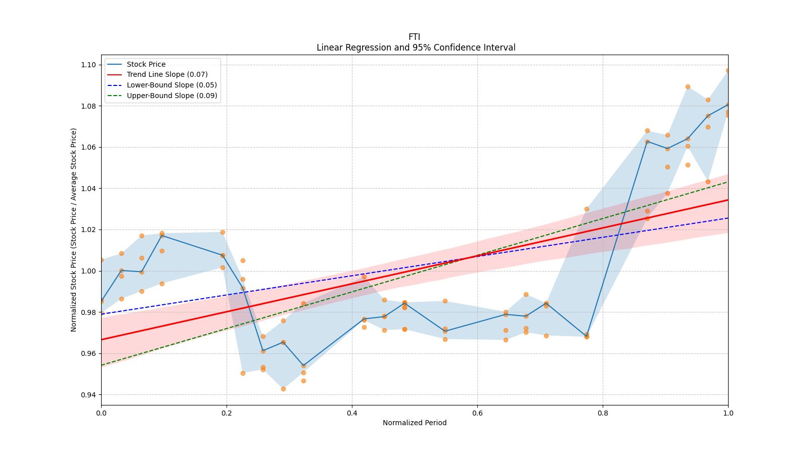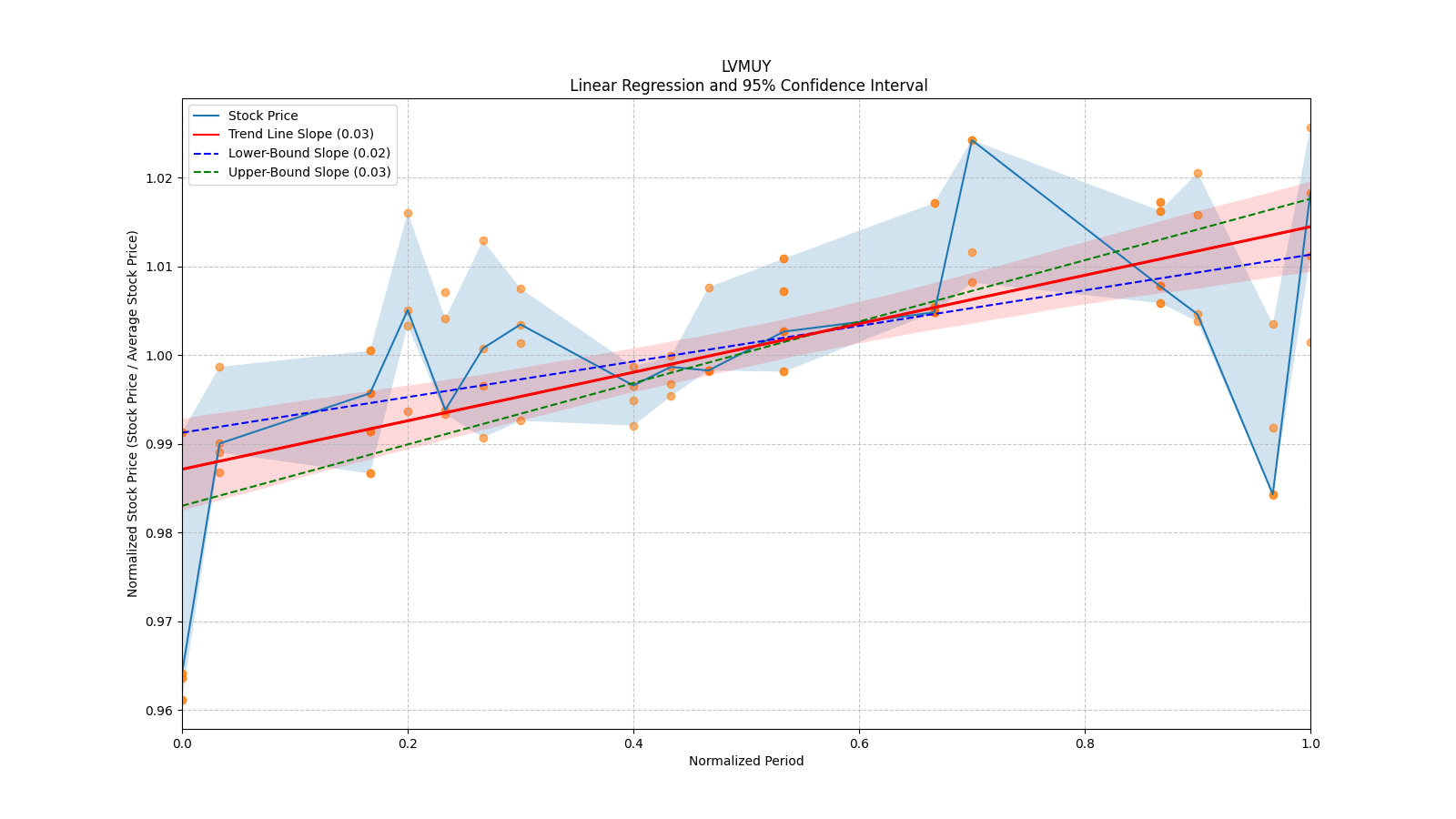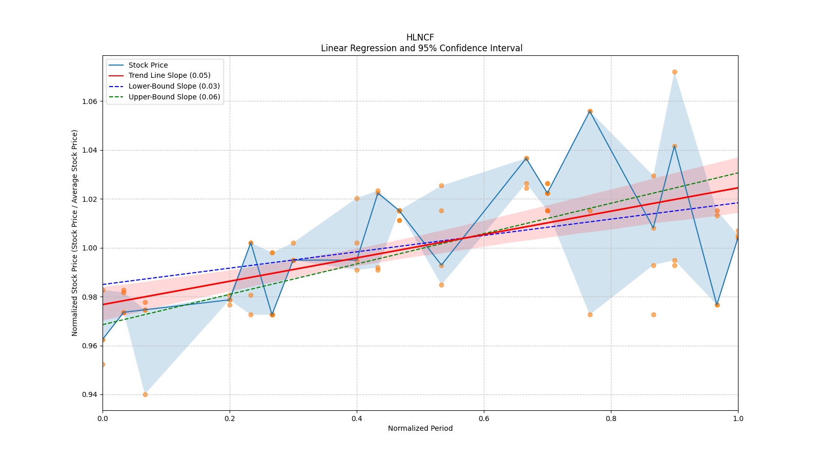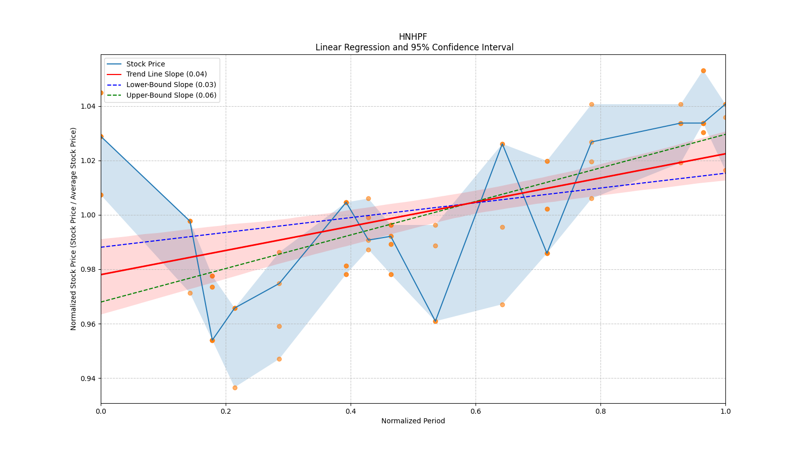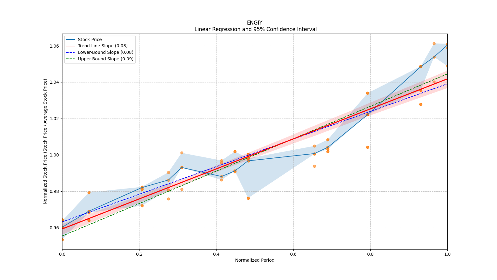 Stocks were filtered to have a high investor grade, analyzed using linear regression, and sorted by the lower-bound trendline slope. The lower-bound trendline slope has been normalized by the average stock price and calculated using a 95% confidence interval. This statistic provides a conservative estimate of stock price percentage growth, taking into account both the trends and volatility of the stock price over the past month. With these details, you can easily compare stocks by their historical performance.
