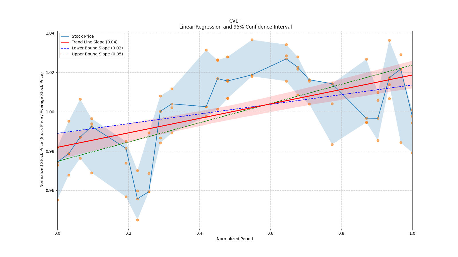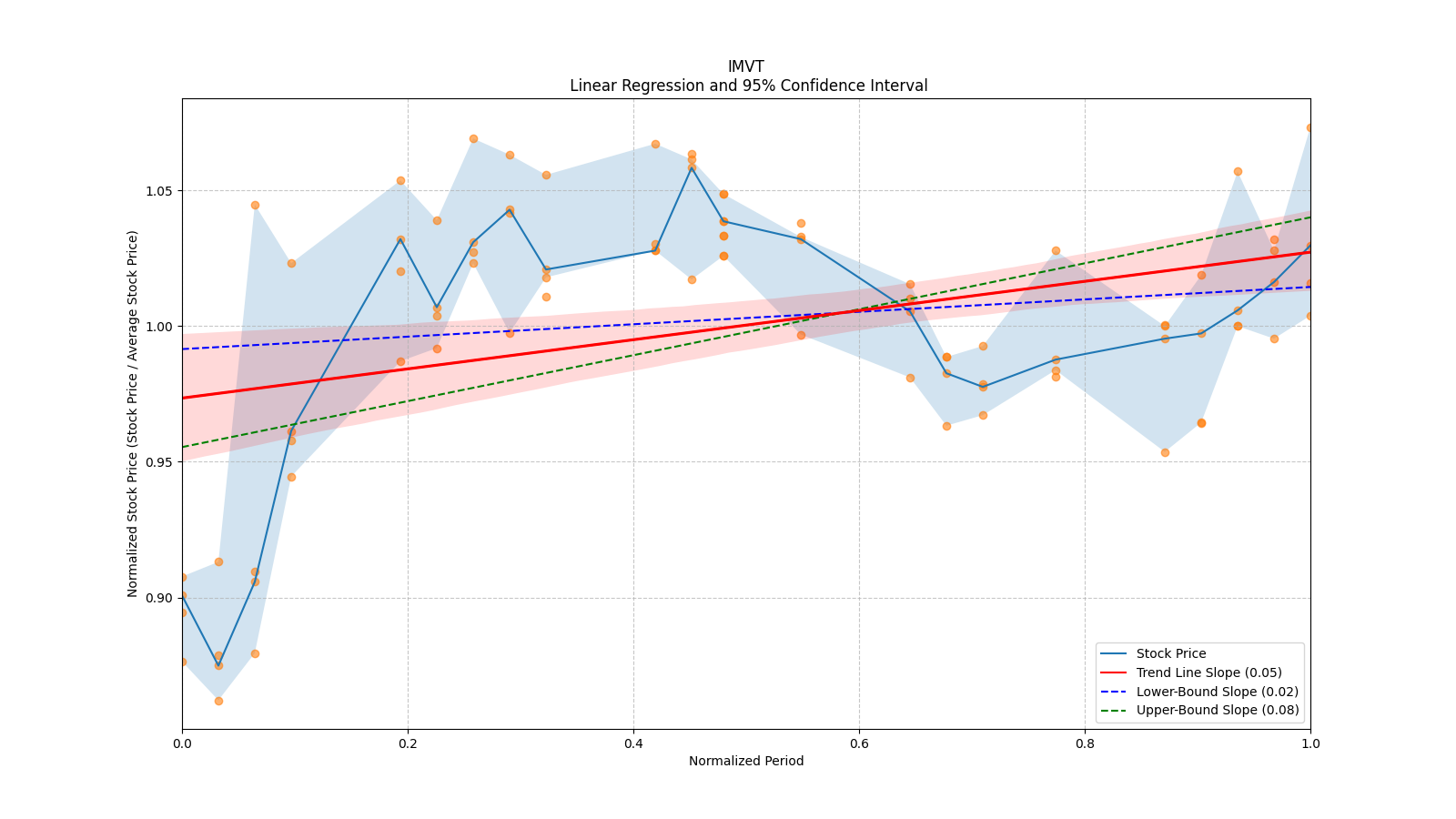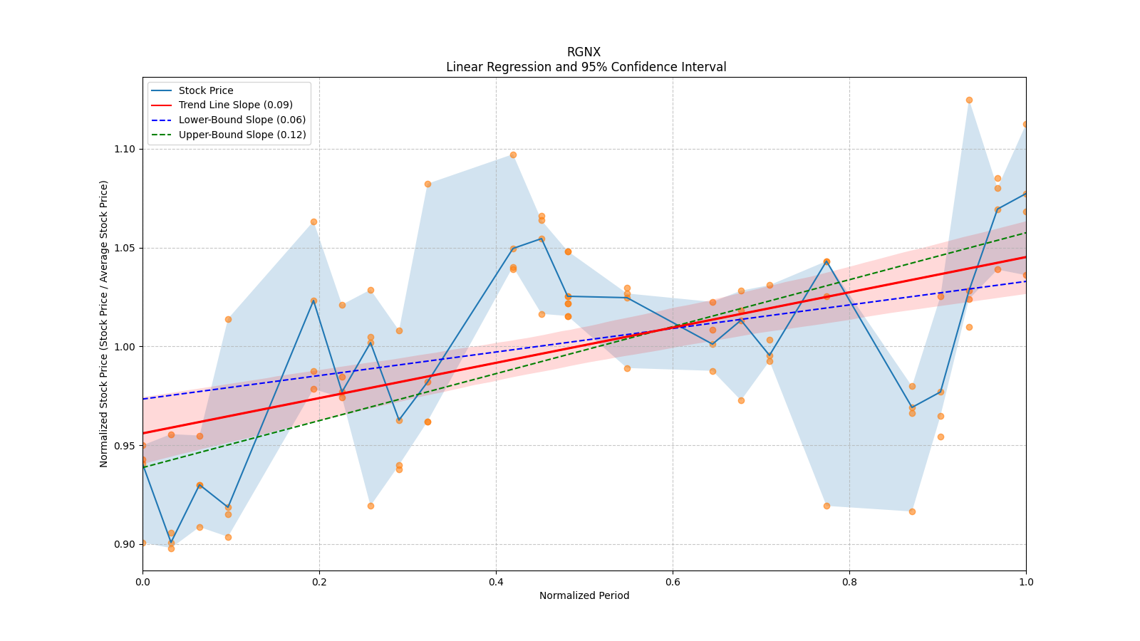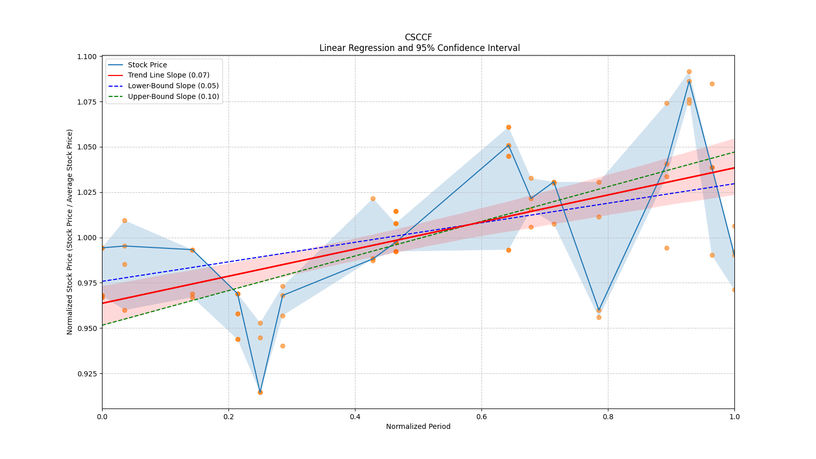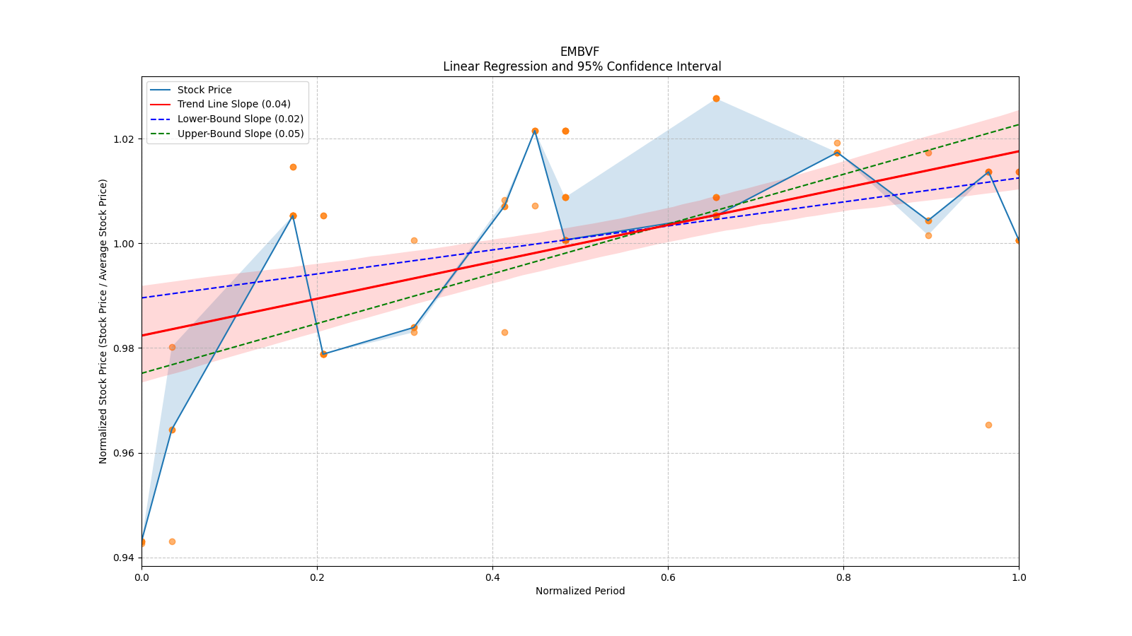 Stocks were filtered to have a high investor grade, analyzed using linear regression, and sorted by the lower-bound trendline slope. The lower-bound trendline slope has been normalized by the average stock price and calculated using a 95% confidence interval. This statistic provides a conservative estimate of stock price percentage growth, taking into account both the trends and volatility of the stock price over the past month. With these details, you can easily compare stocks by their historical performance.