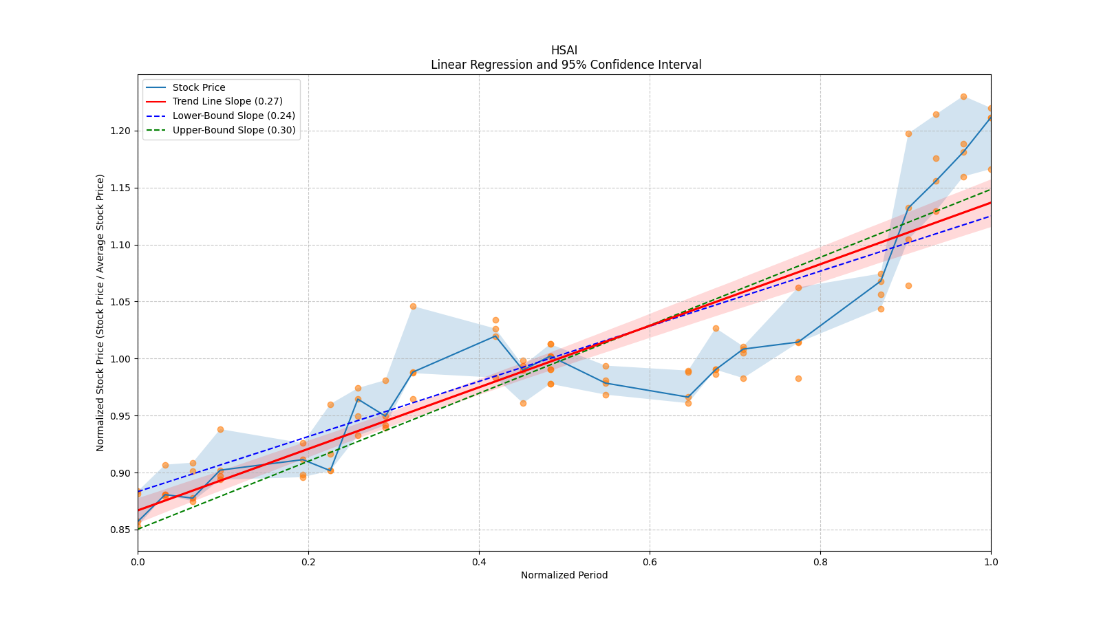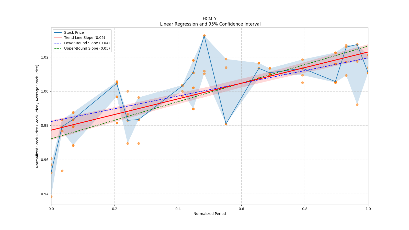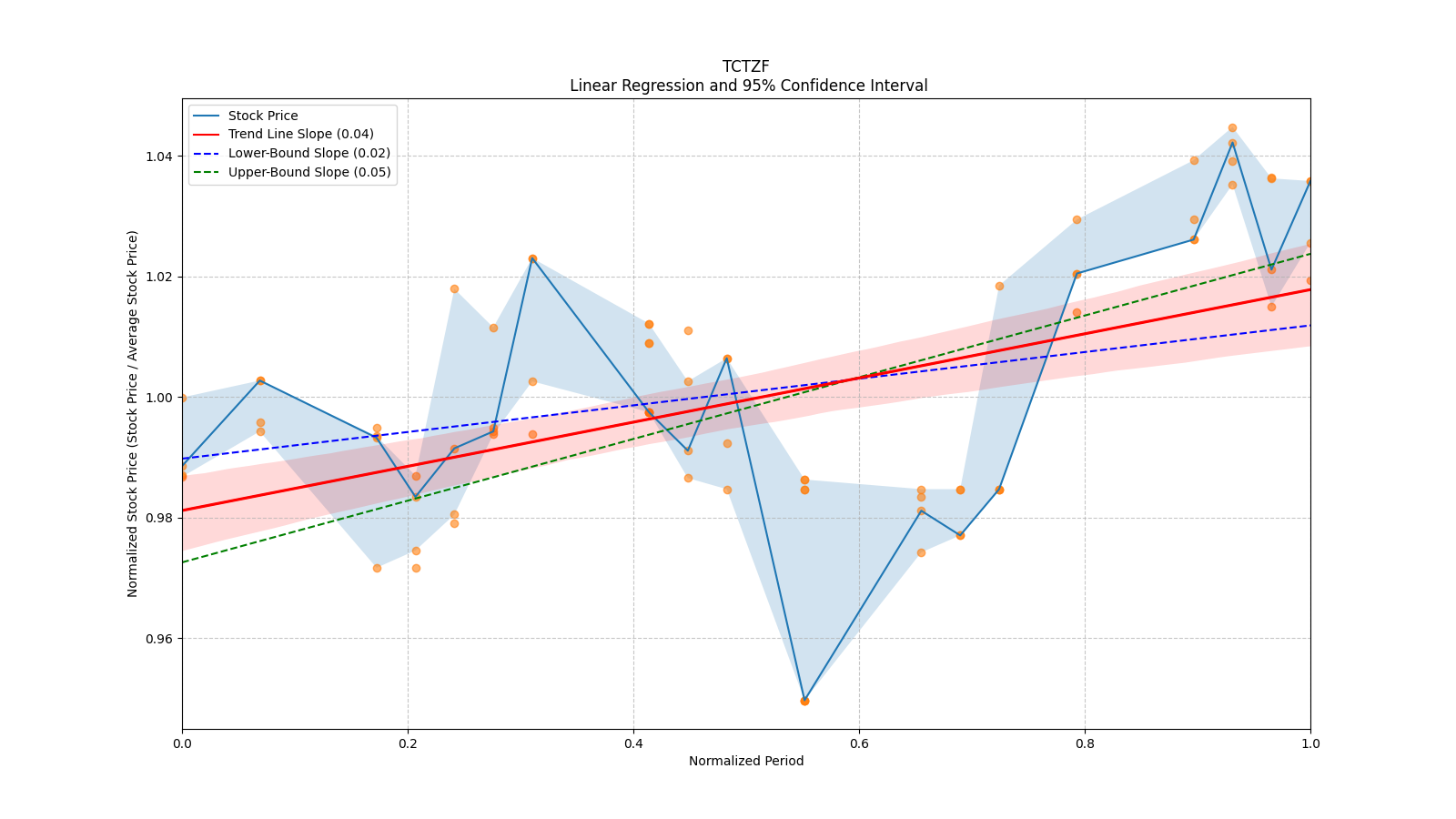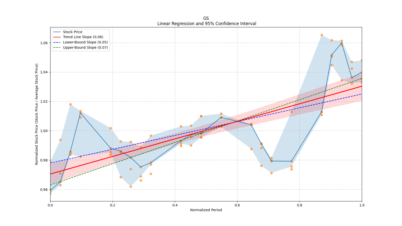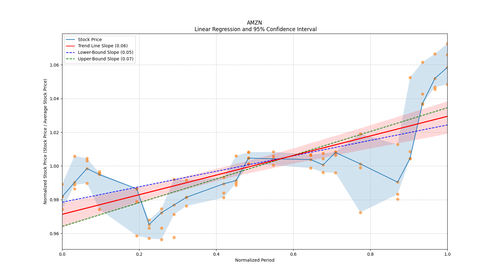 Stocks were filtered to have a high investor grade, analyzed using linear regression, and sorted by the lower-bound trendline slope. The lower-bound trendline slope has been normalized by the average stock price and calculated using a 95% confidence interval. This statistic provides a conservative estimate of stock price percentage growth, taking into account both the trends and volatility of the stock price over the past month. With these details, you can easily compare stocks by their historical performance.