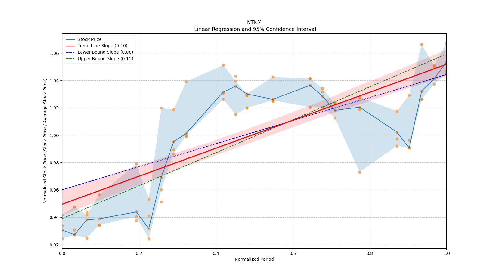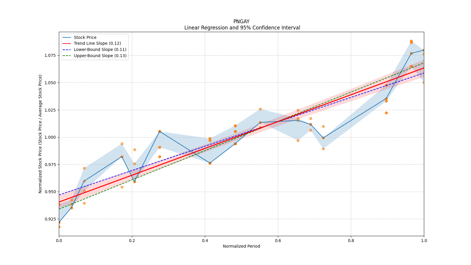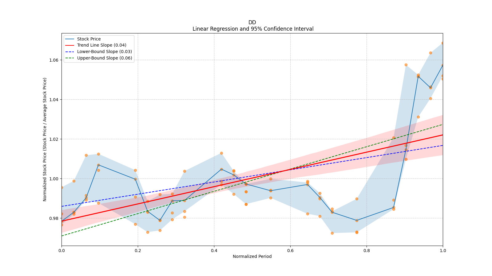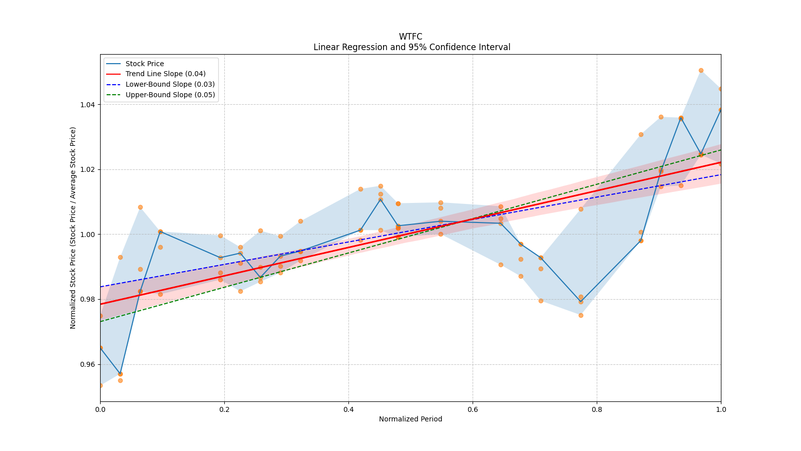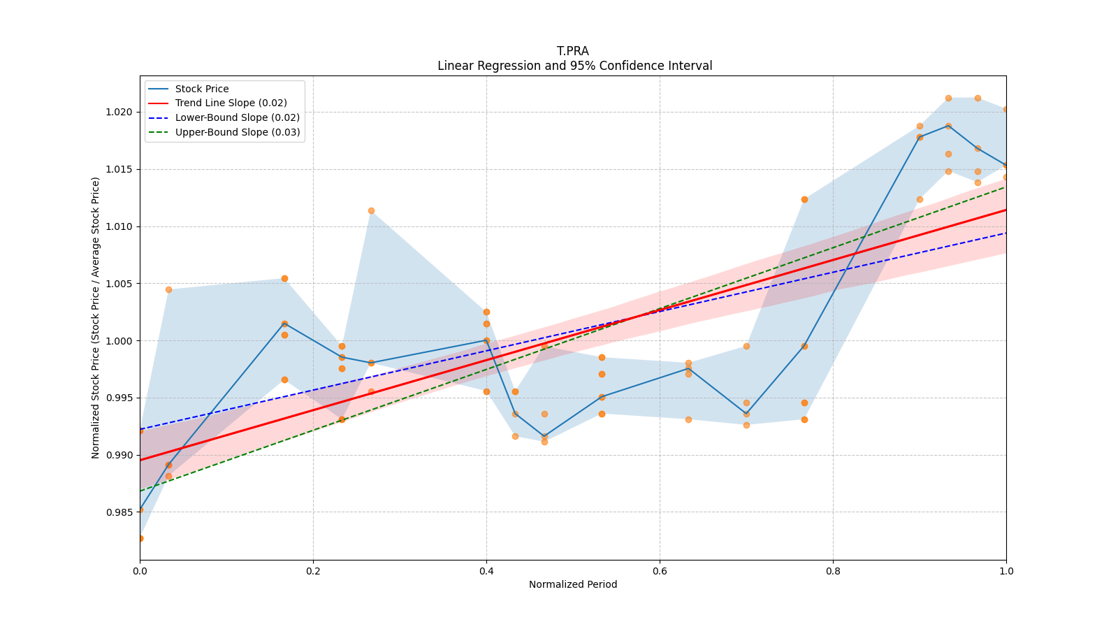 Stocks were filtered to have a high investor grade, analyzed using linear regression, and sorted by the lower-bound trendline slope. The lower-bound trendline slope has been normalized by the average stock price and calculated using a 95% confidence interval. This statistic provides a conservative estimate of stock price percentage growth, taking into account both the trends and volatility of the stock price over the past month. With these details, you can easily compare stocks by their historical performance.