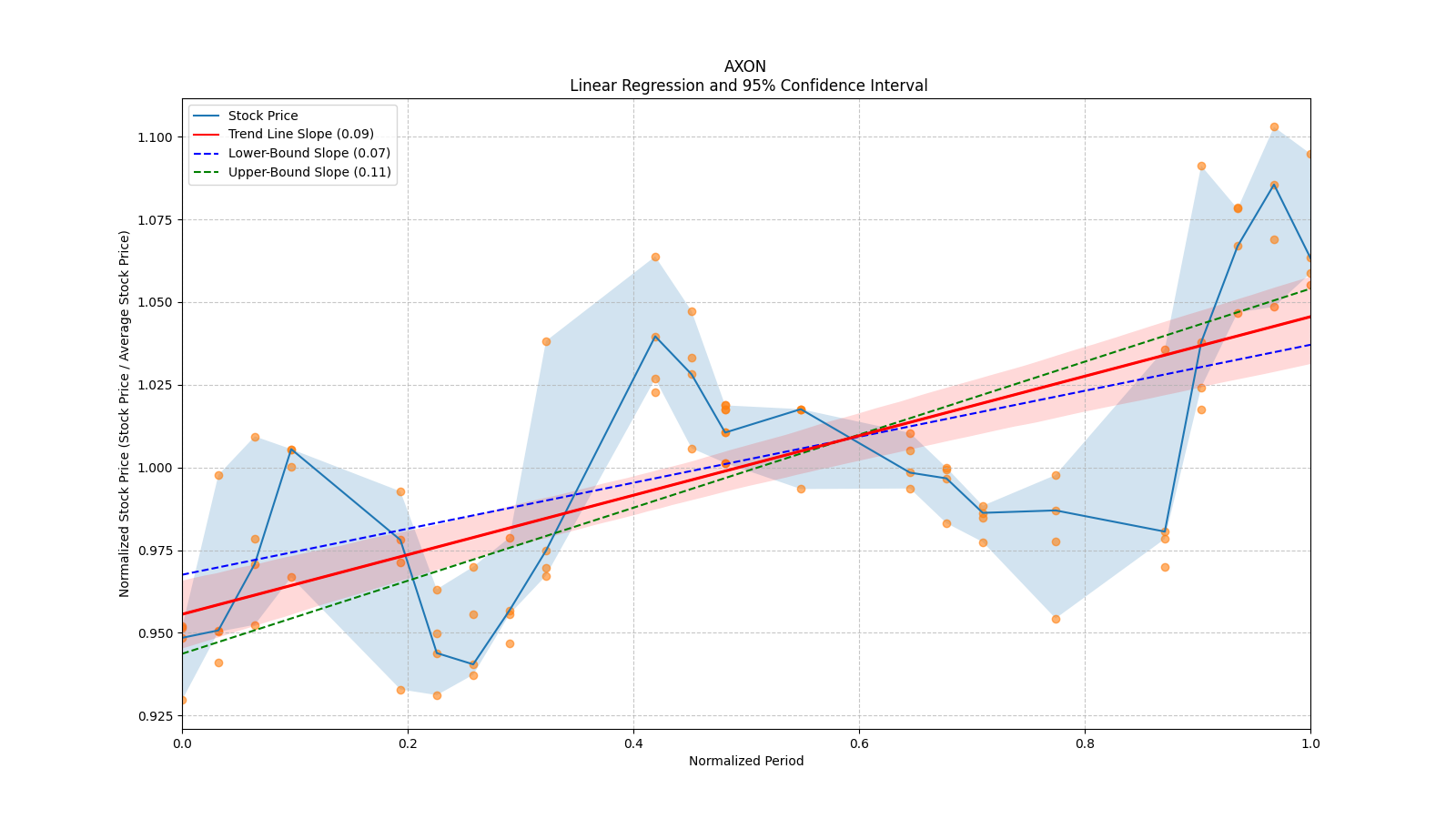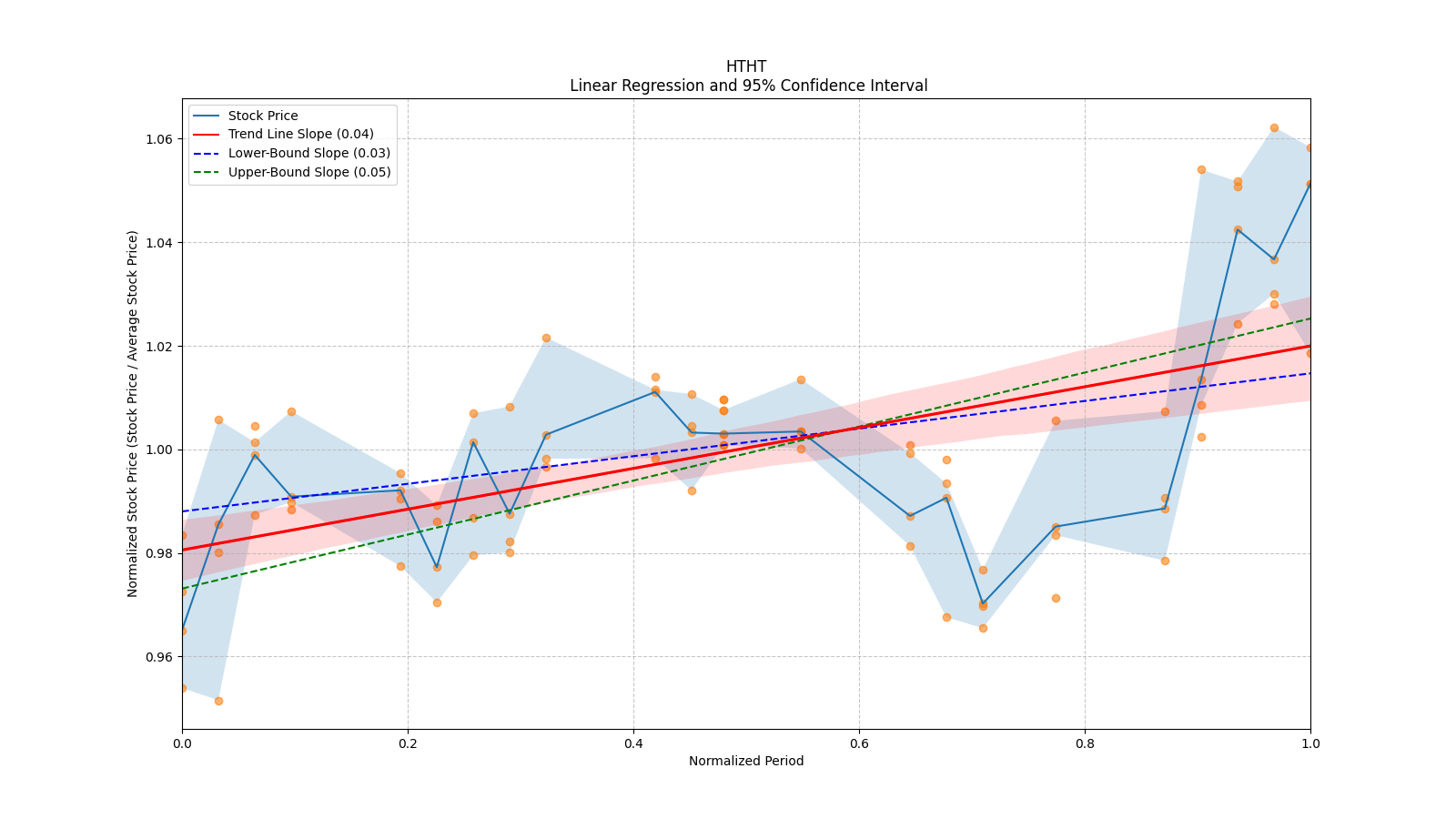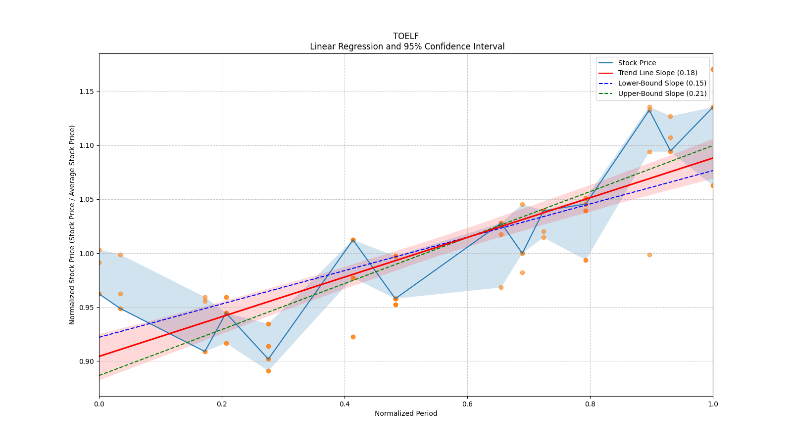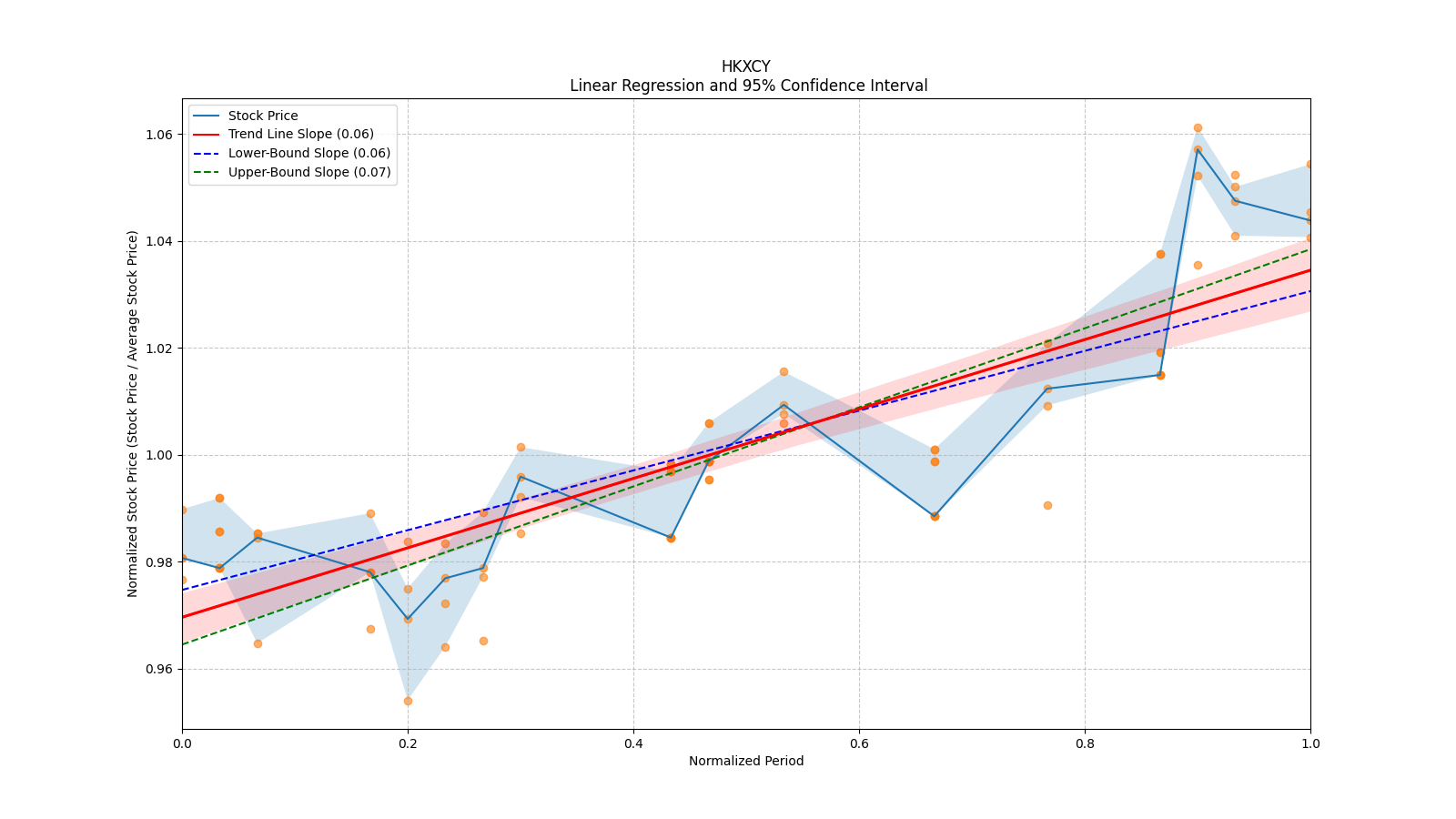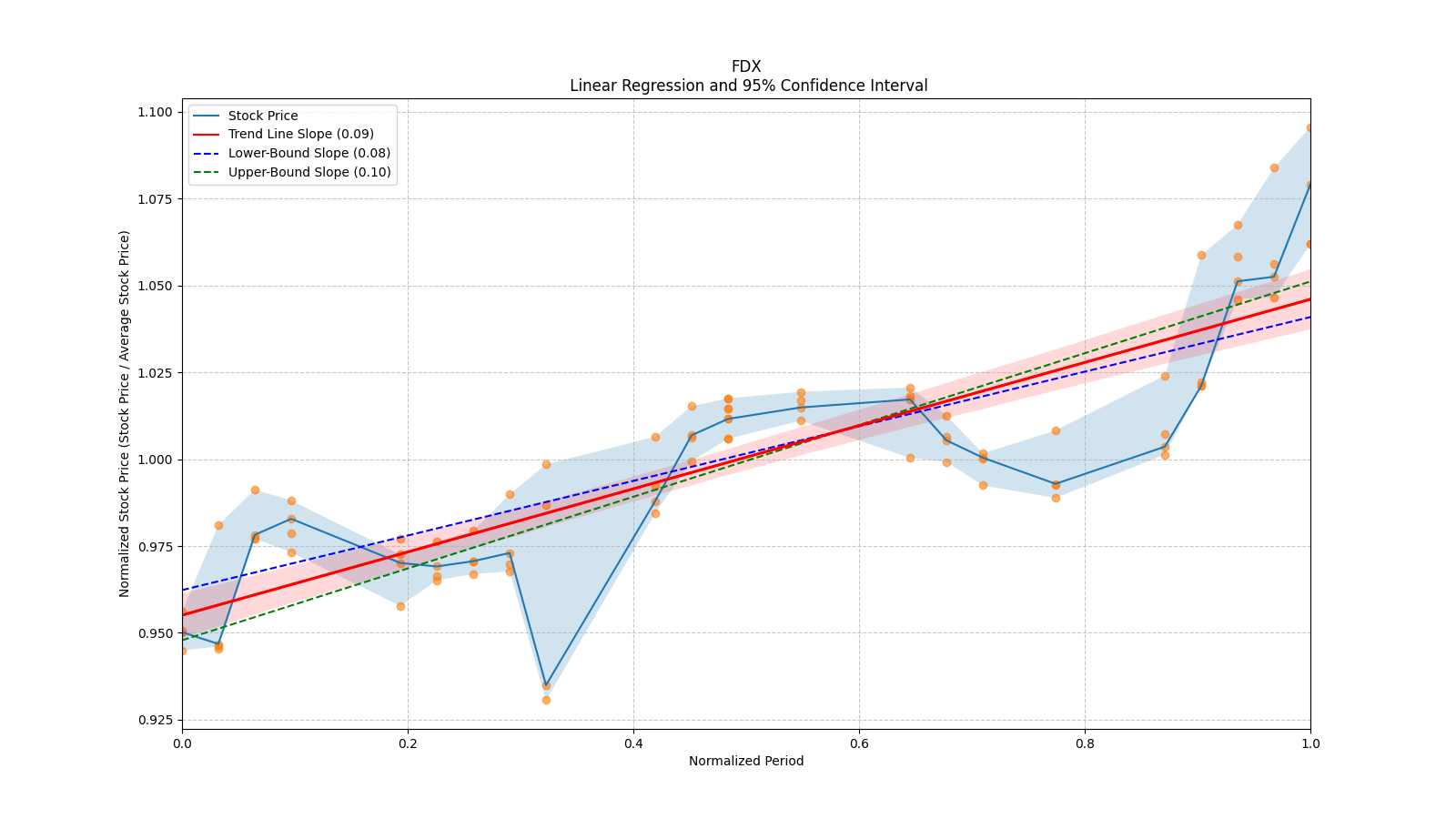 Stocks were filtered to have a high investor grade, analyzed using linear regression, and sorted by the lower-bound trendline slope. The lower-bound trendline slope has been normalized by the average stock price and calculated using a 95% confidence interval. This statistic provides a conservative estimate of stock price percentage growth, taking into account both the trends and volatility of the stock price over the past month. With these details, you can easily compare stocks by their historical performance.