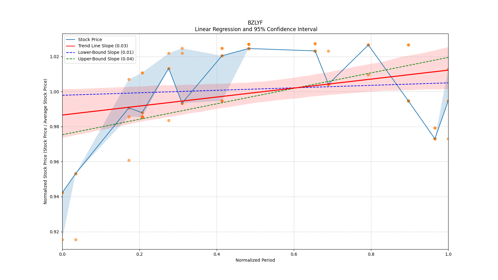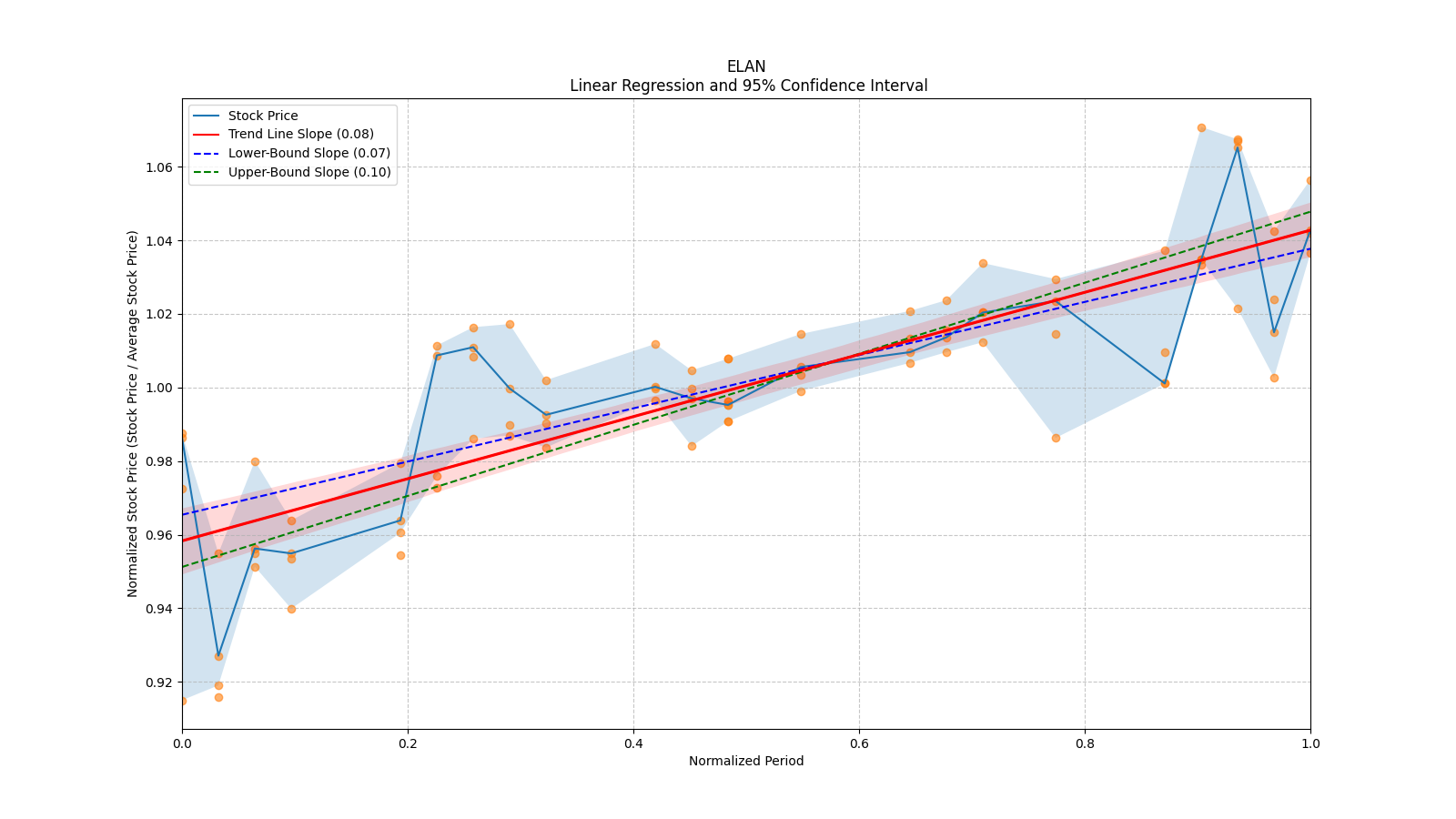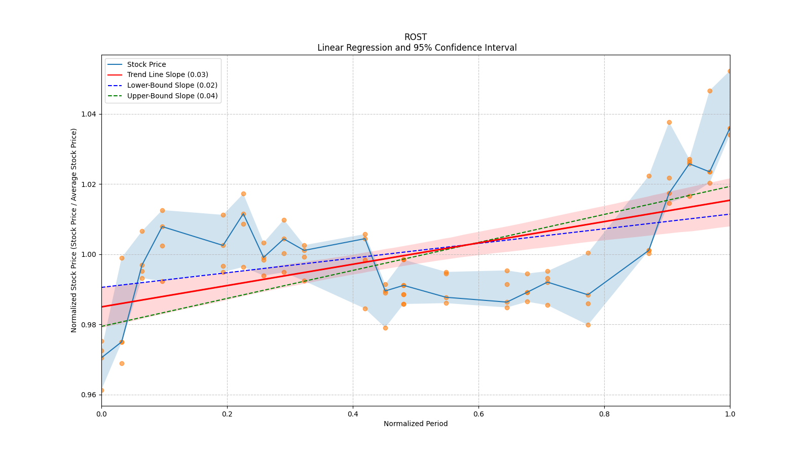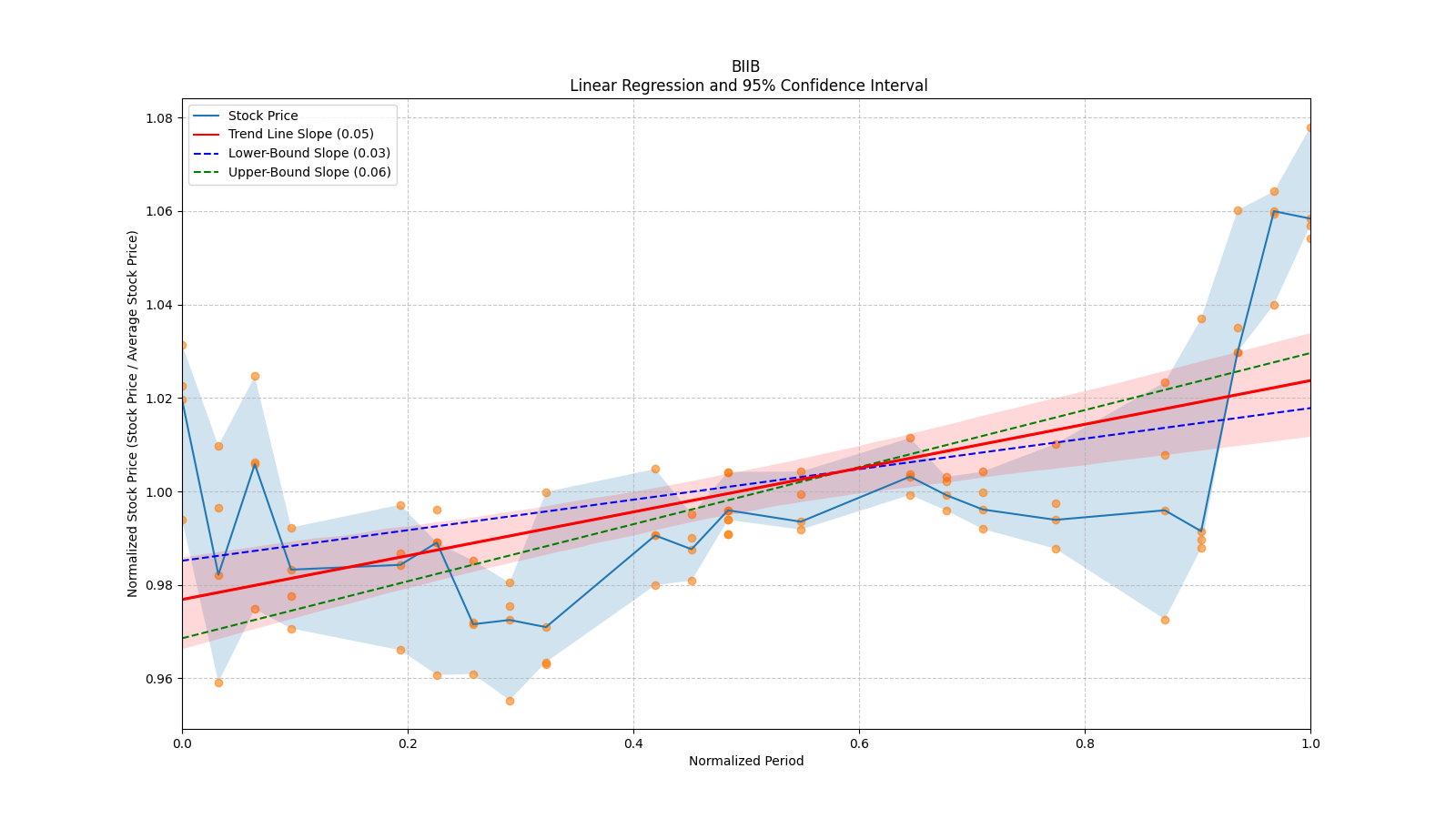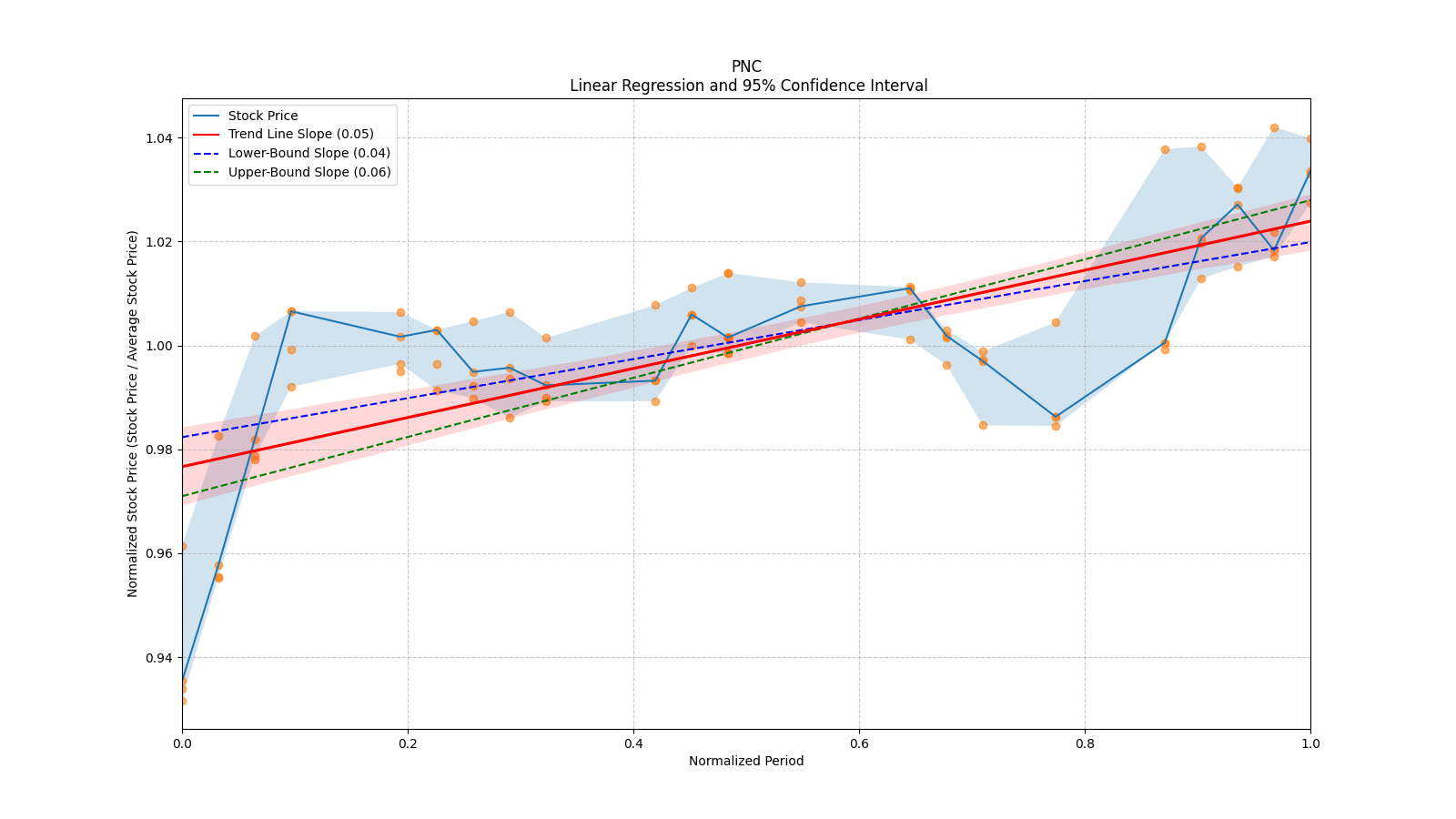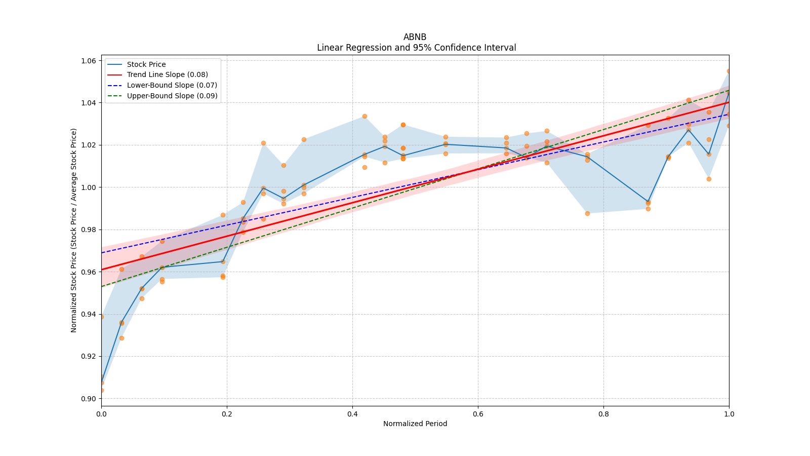 Stocks were filtered to have a high investor grade, analyzed using linear regression, and sorted by the lower-bound trendline slope. The lower-bound trendline slope has been normalized by the average stock price and calculated using a 95% confidence interval. This statistic provides a conservative estimate of stock price percentage growth, taking into account both the trends and volatility of the stock price over the past month. With these details, you can easily compare stocks by their historical performance.