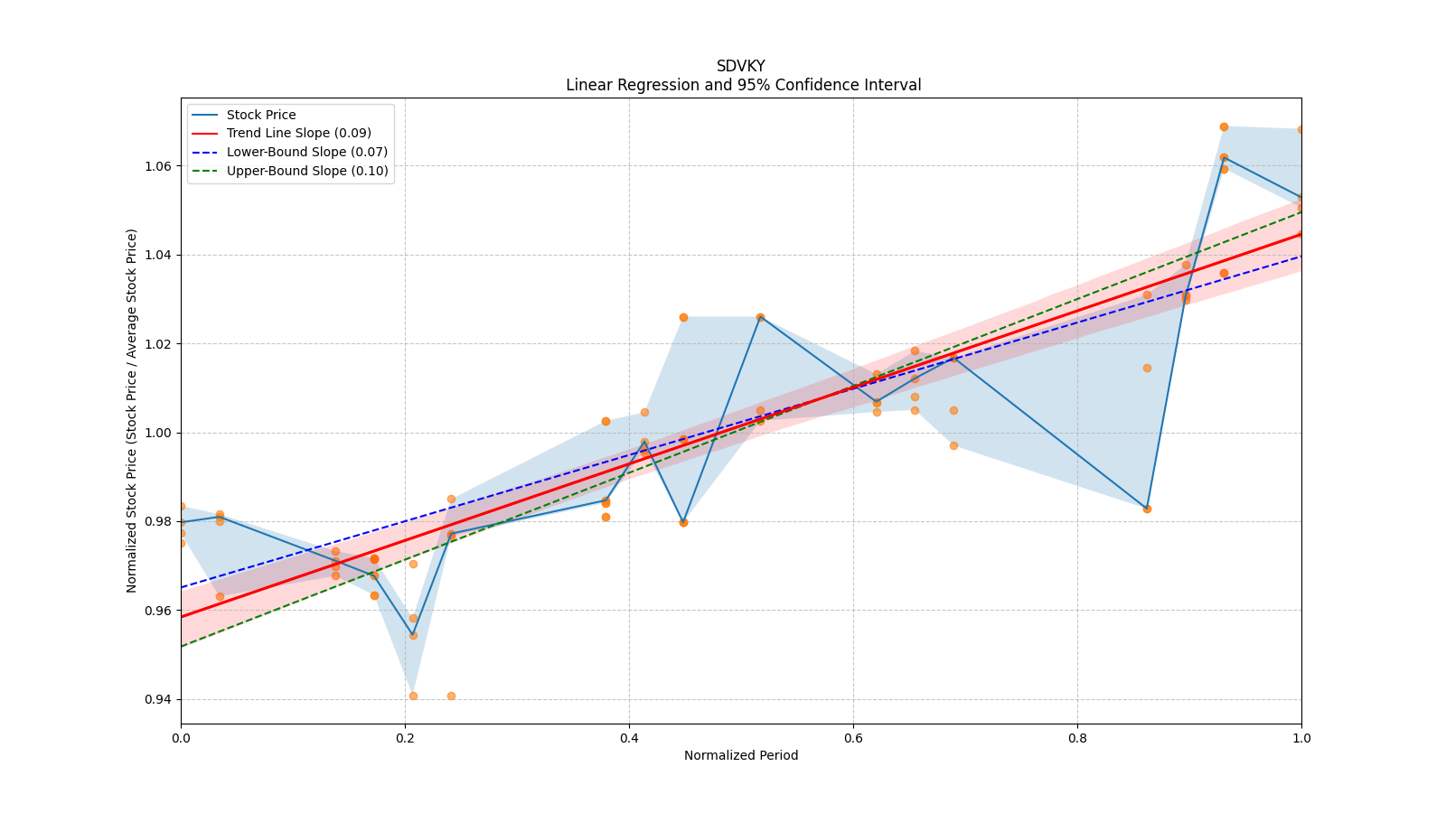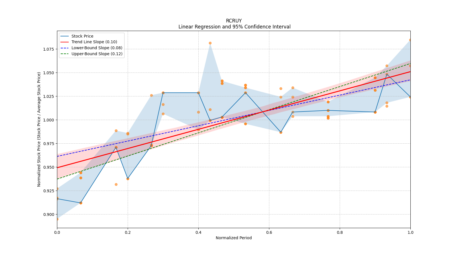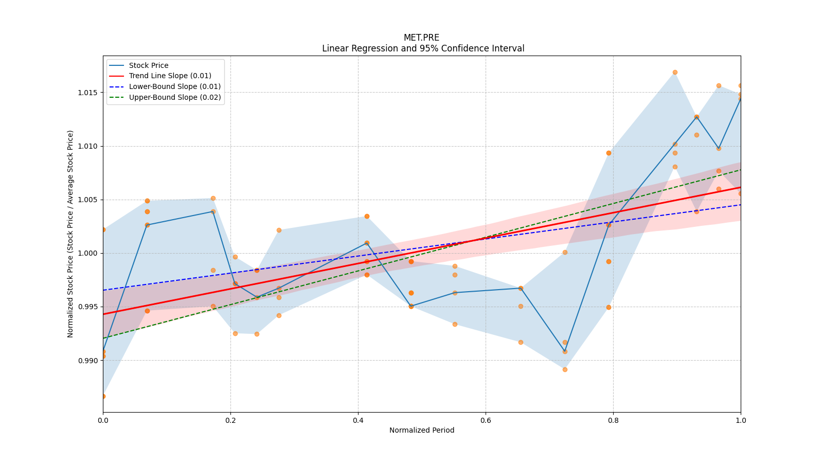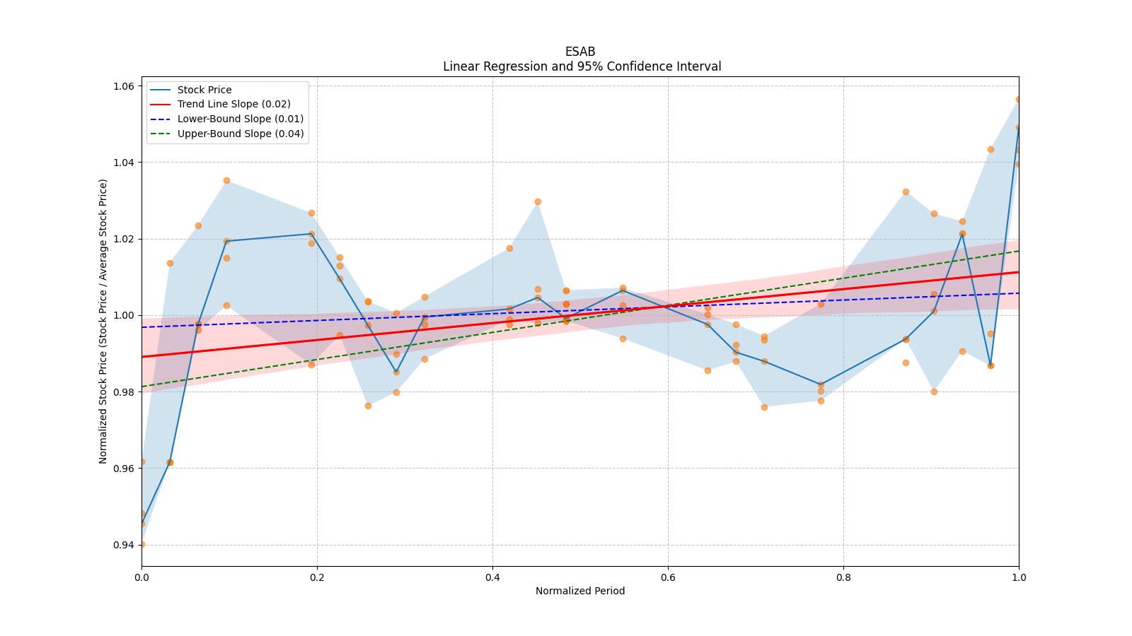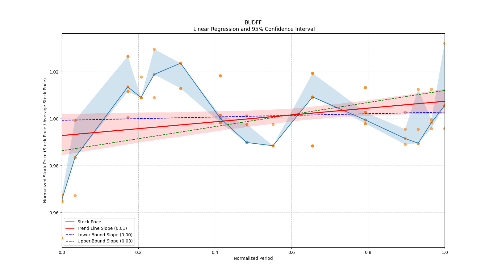 Stocks were filtered to have a high investor grade, analyzed using linear regression, and sorted by the lower-bound trendline slope. The lower-bound trendline slope has been normalized by the average stock price and calculated using a 95% confidence interval. This statistic provides a conservative estimate of stock price percentage growth, taking into account both the trends and volatility of the stock price over the past month. With these details, you can easily compare stocks by their historical performance.