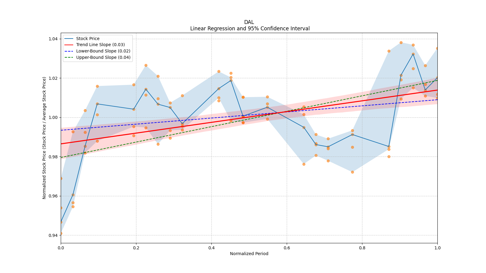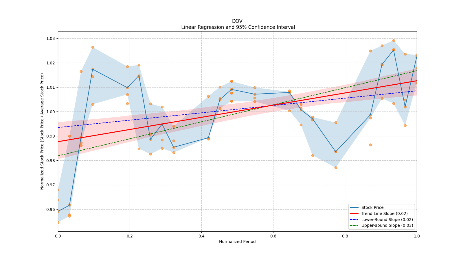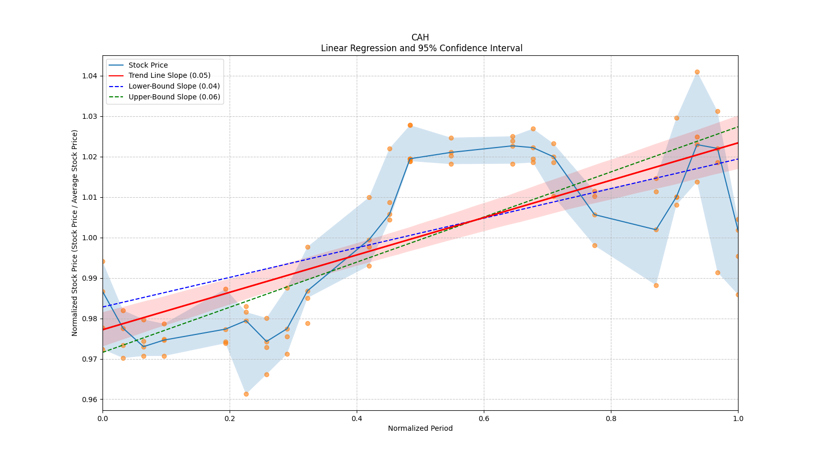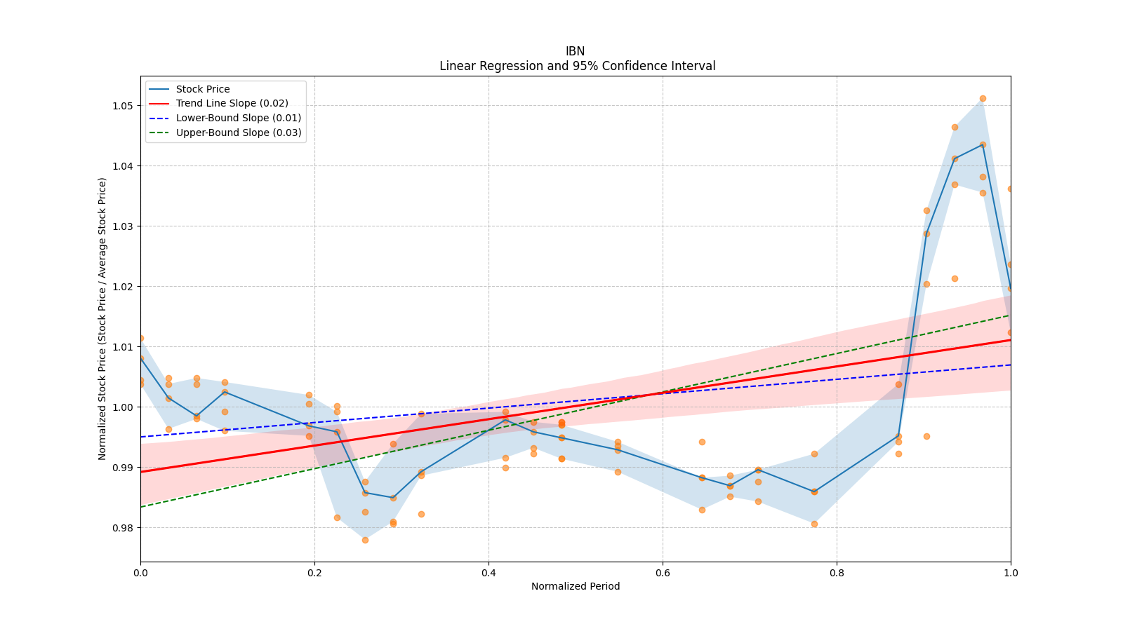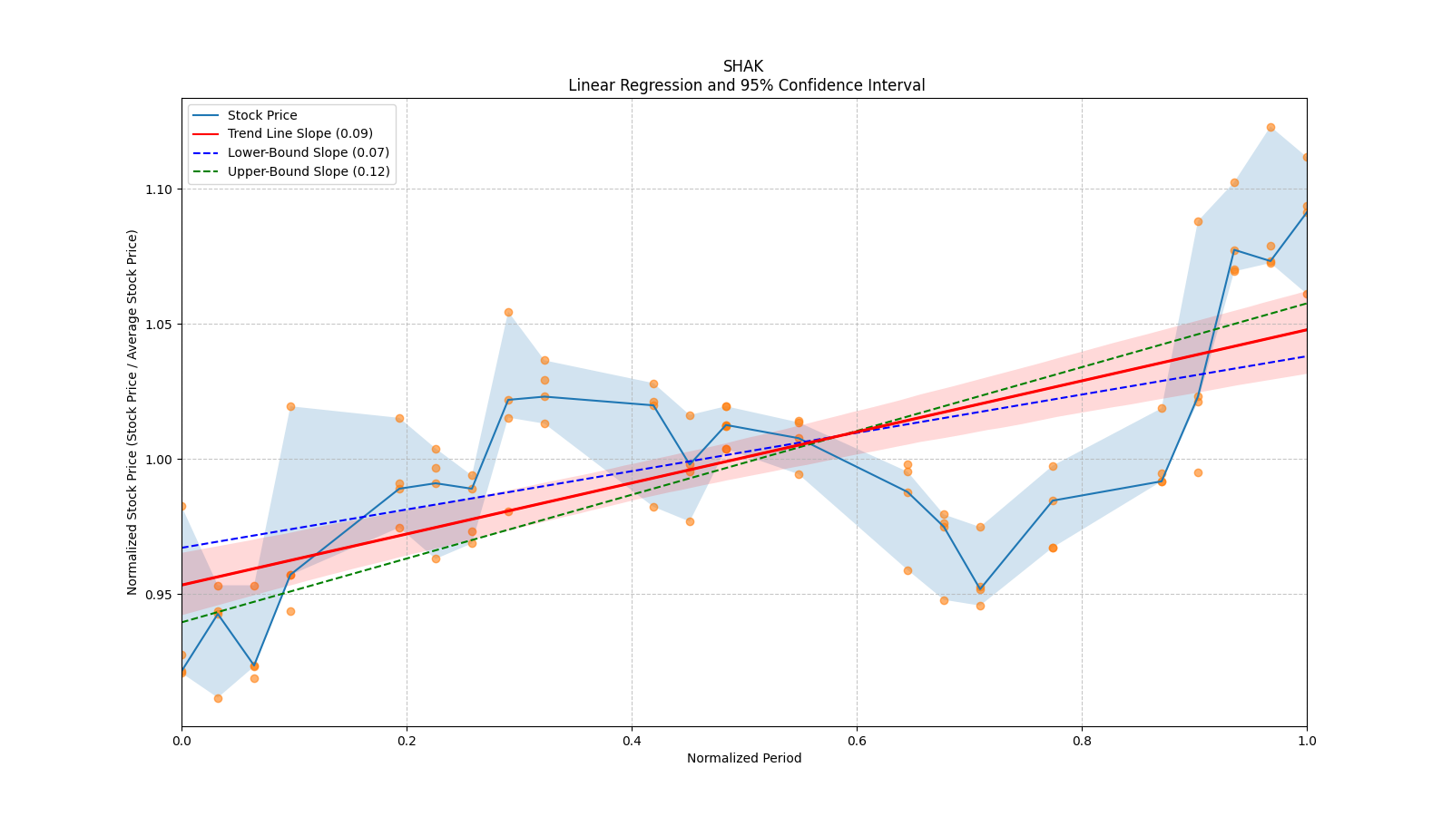 Stocks were filtered to have a high investor grade, analyzed using linear regression, and sorted by the lower-bound trendline slope. The lower-bound trendline slope has been normalized by the average stock price and calculated using a 95% confidence interval. This statistic provides a conservative estimate of stock price percentage growth, taking into account both the trends and volatility of the stock price over the past month. With these details, you can easily compare stocks by their historical performance.