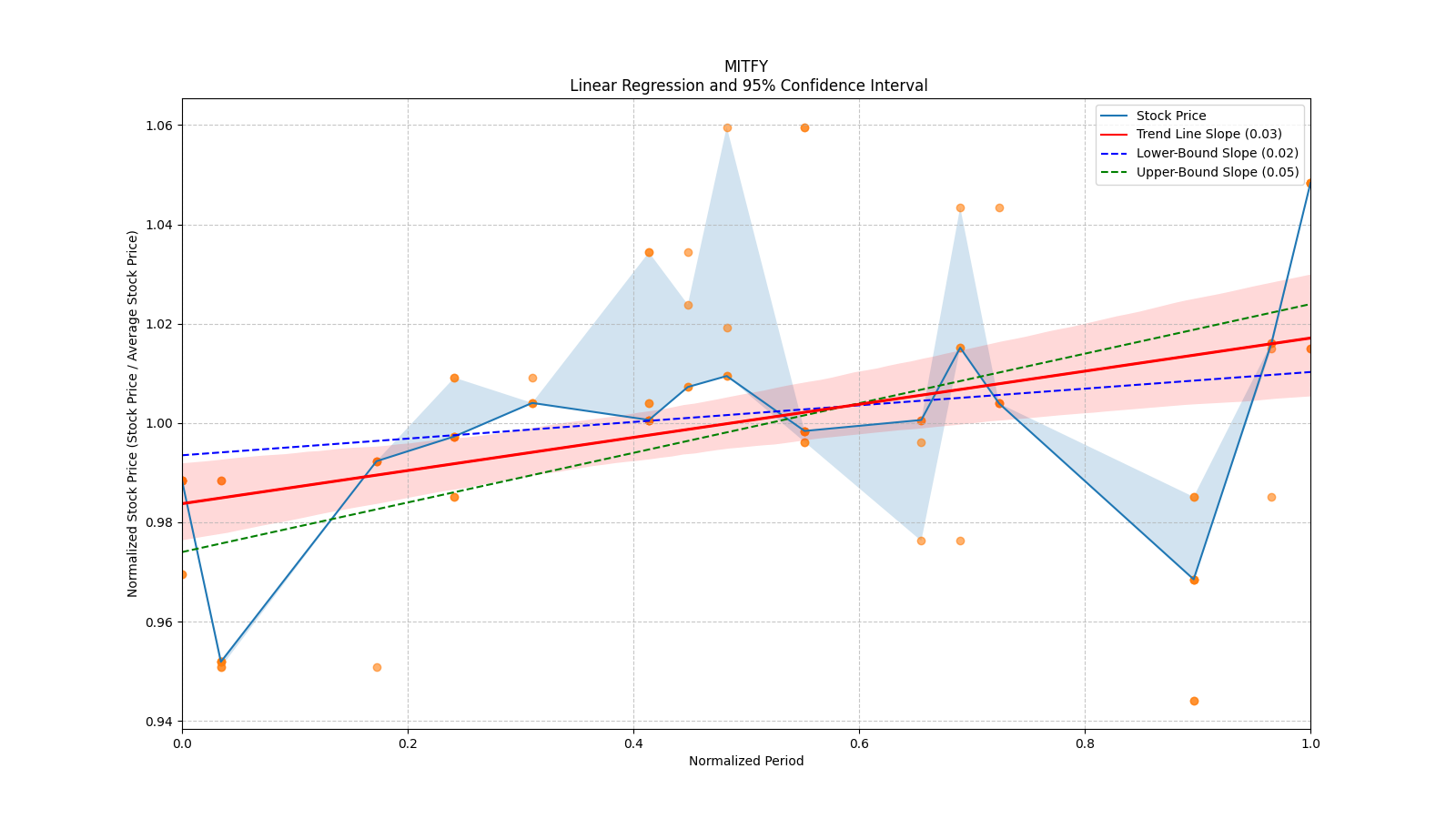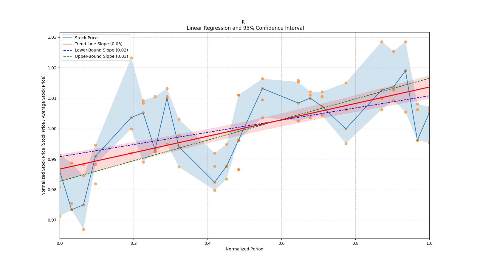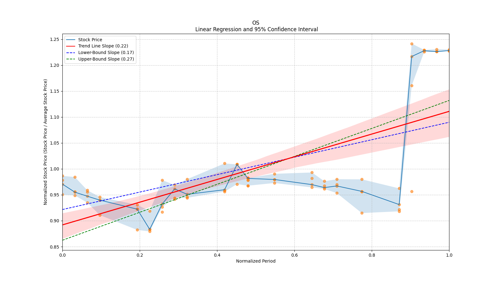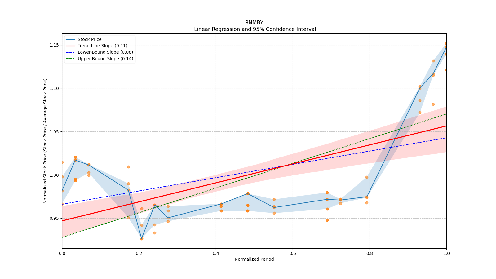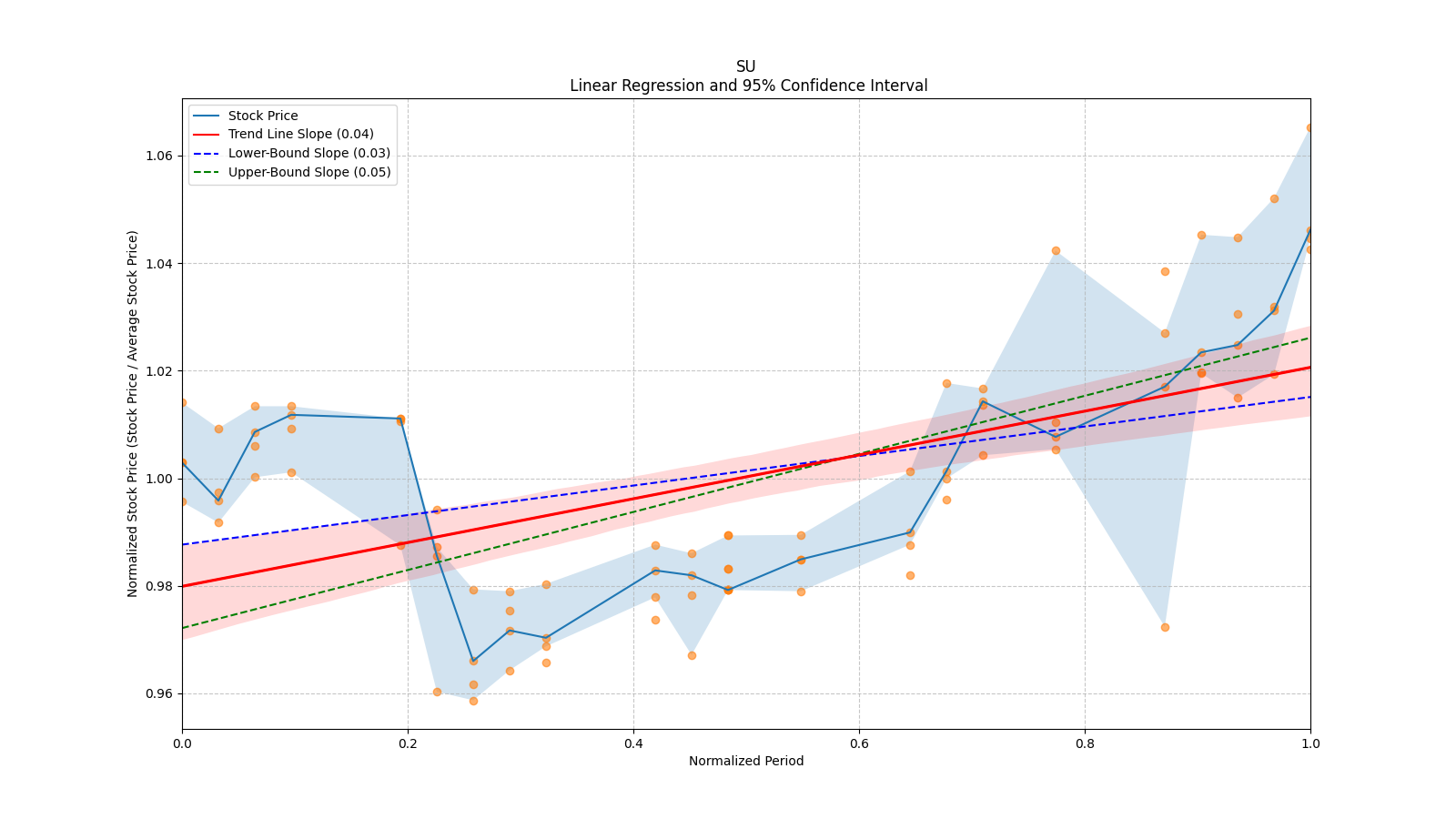 Stocks were filtered to have a high investor grade, analyzed using linear regression, and sorted by the lower-bound trendline slope. The lower-bound trendline slope has been normalized by the average stock price and calculated using a 95% confidence interval. This statistic provides a conservative estimate of stock price percentage growth, taking into account both the trends and volatility of the stock price over the past month. With these details, you can easily compare stocks by their historical performance.