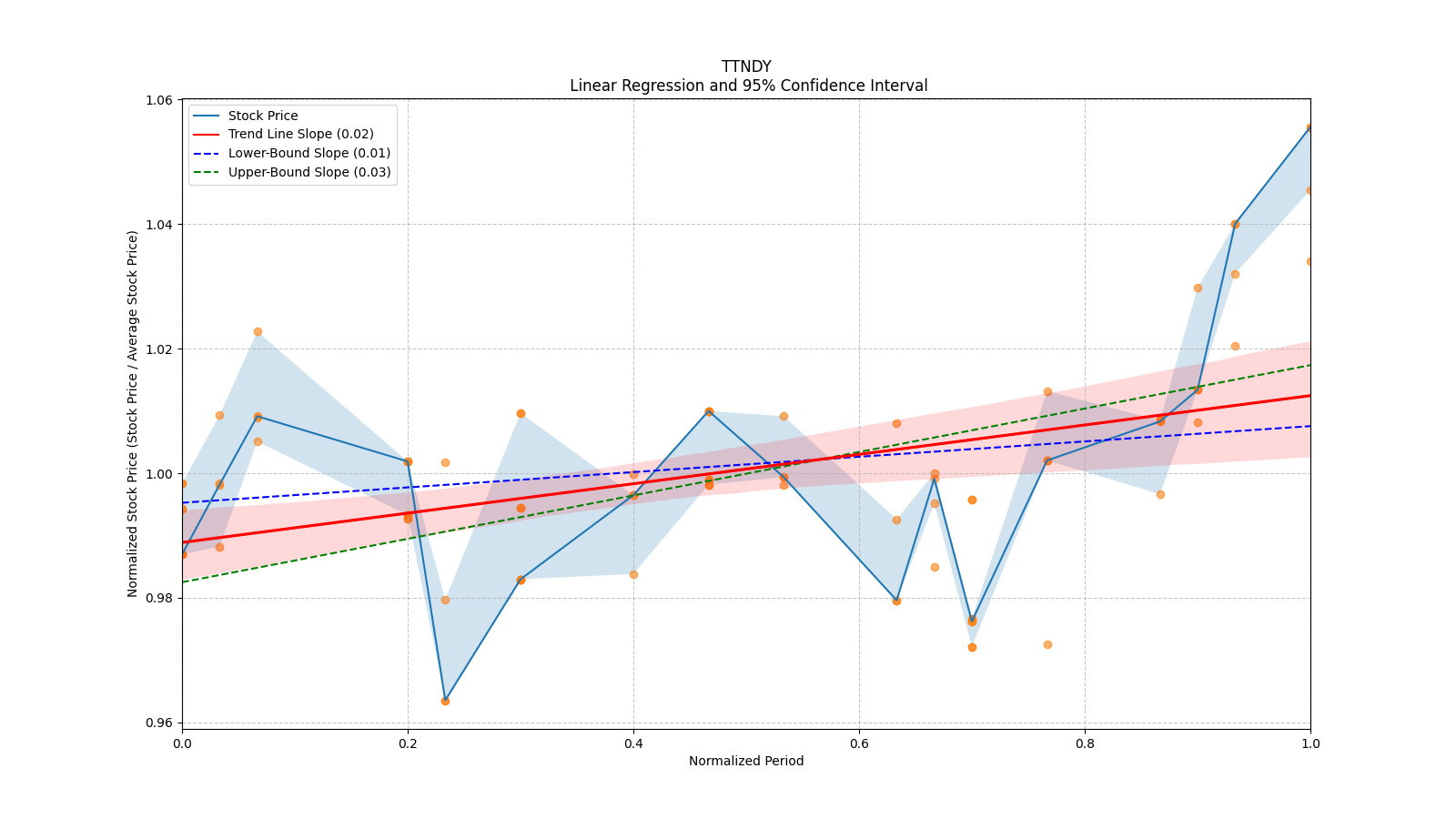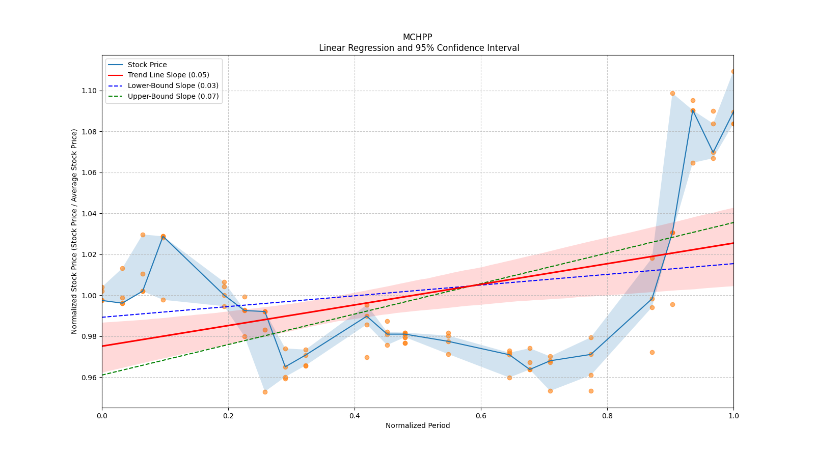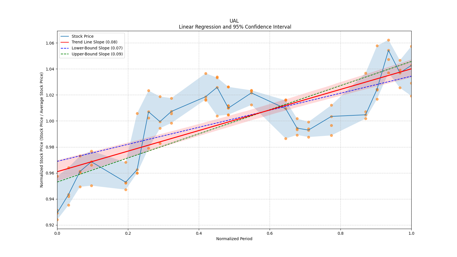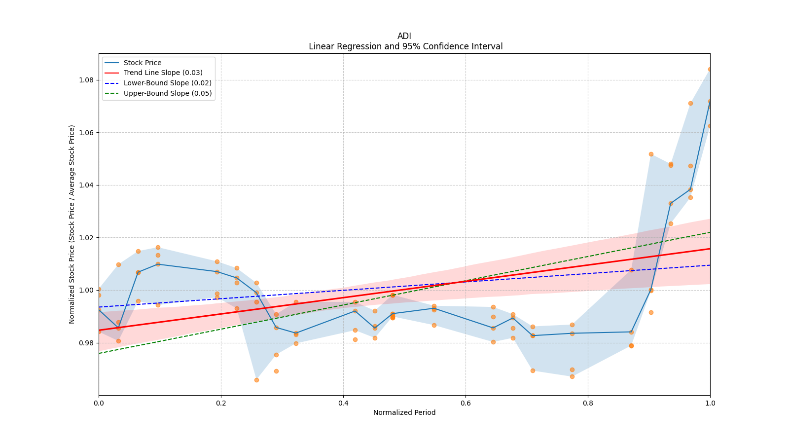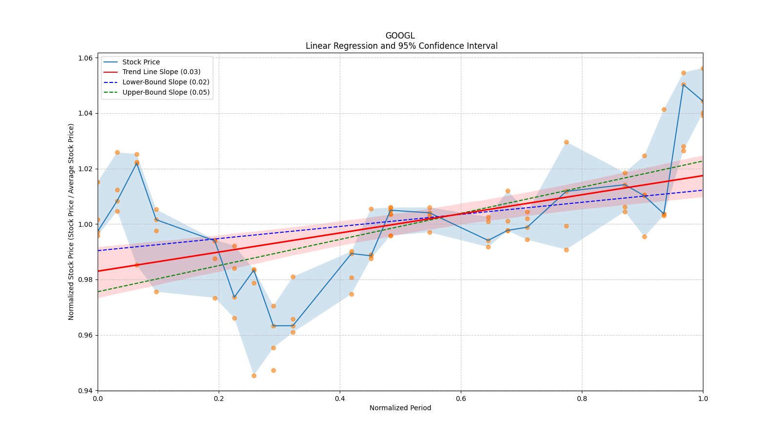 Stocks were filtered to have a high investor grade, analyzed using linear regression, and sorted by the lower-bound trendline slope. The lower-bound trendline slope has been normalized by the average stock price and calculated using a 95% confidence interval. This statistic provides a conservative estimate of stock price percentage growth, taking into account both the trends and volatility of the stock price over the past month. With these details, you can easily compare stocks by their historical performance.