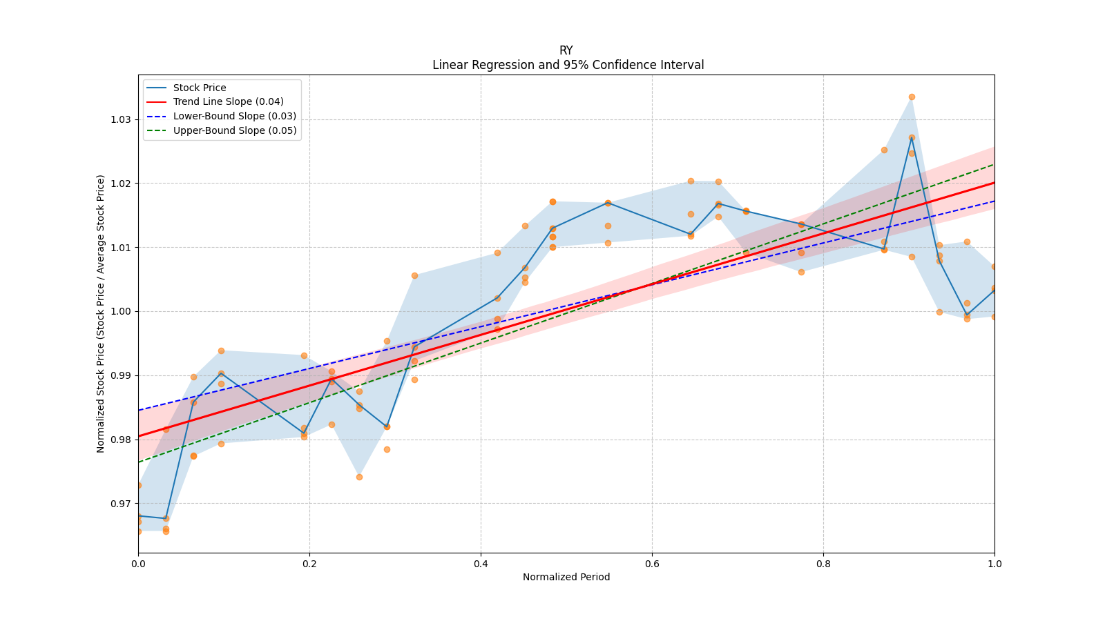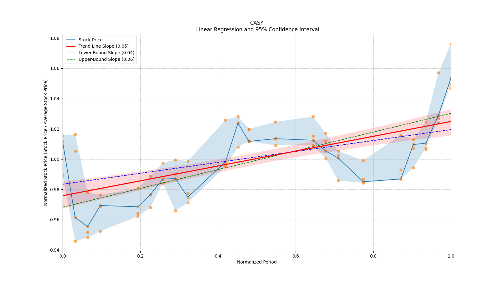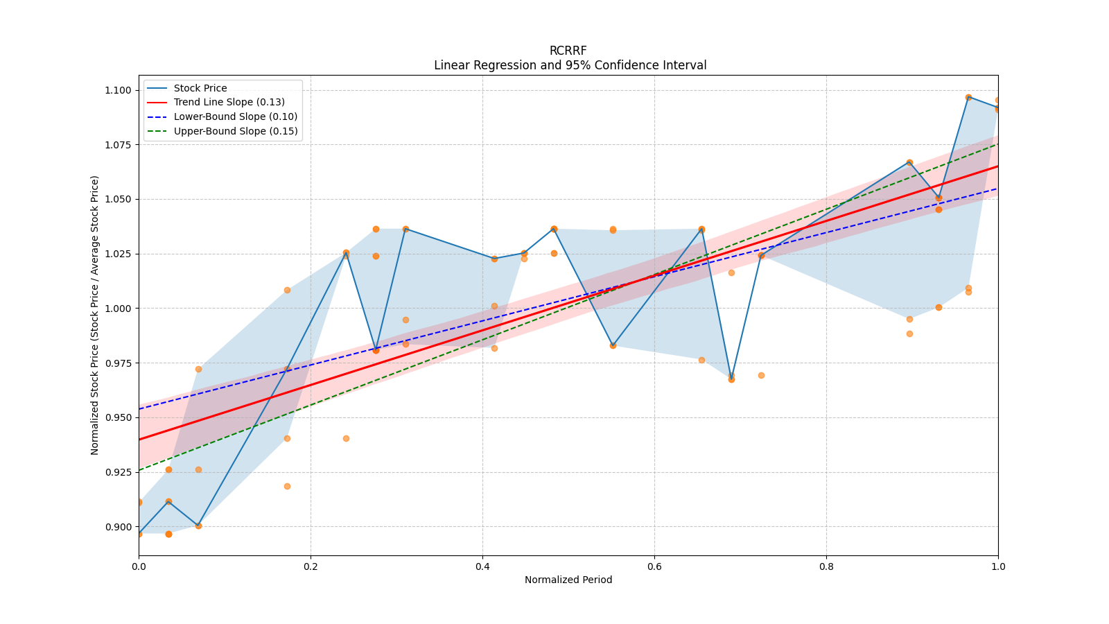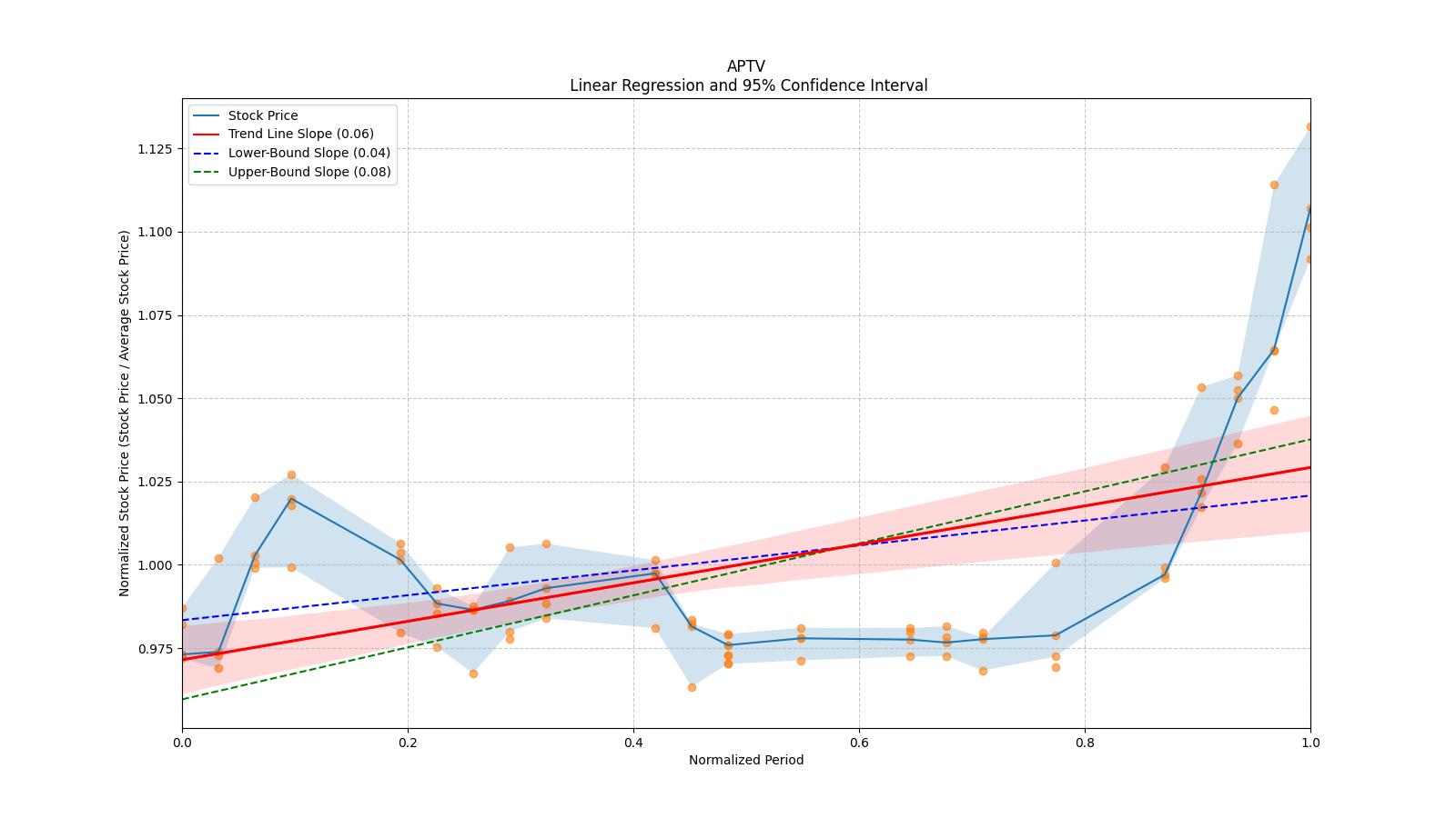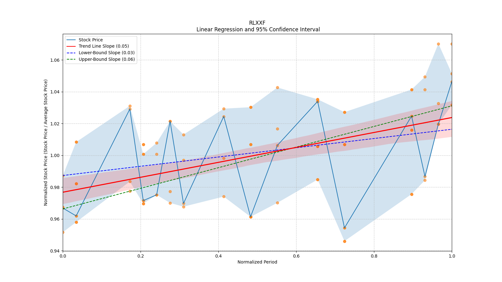 Stocks were filtered to have a high investor grade, analyzed using linear regression, and sorted by the lower-bound trendline slope. The lower-bound trendline slope has been normalized by the average stock price and calculated using a 95% confidence interval. This statistic provides a conservative estimate of stock price percentage growth, taking into account both the trends and volatility of the stock price over the past month. With these details, you can easily compare stocks by their historical performance.