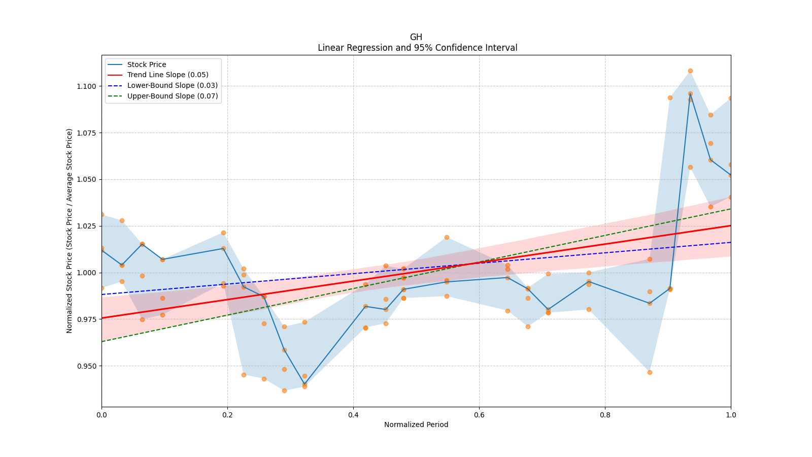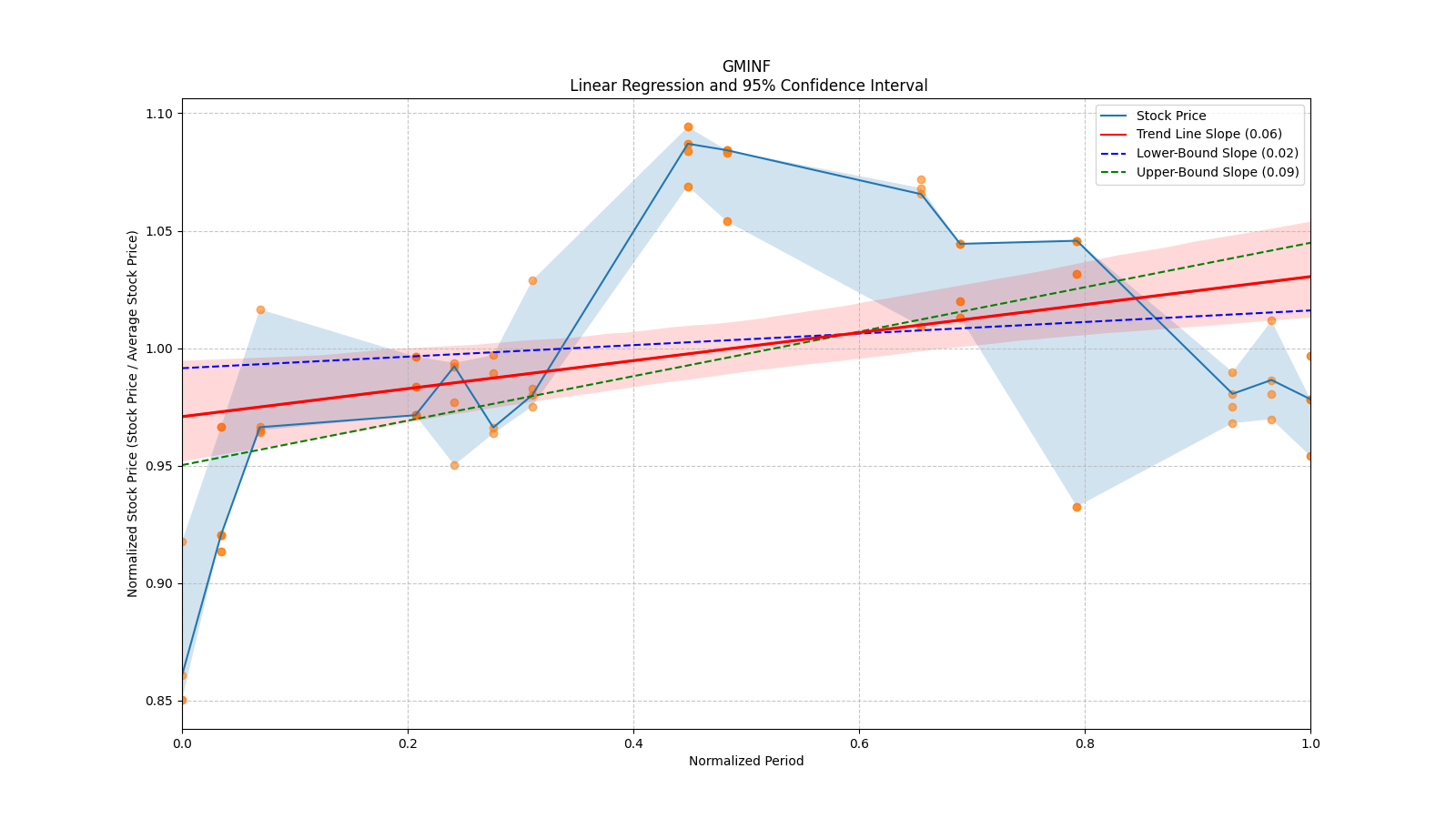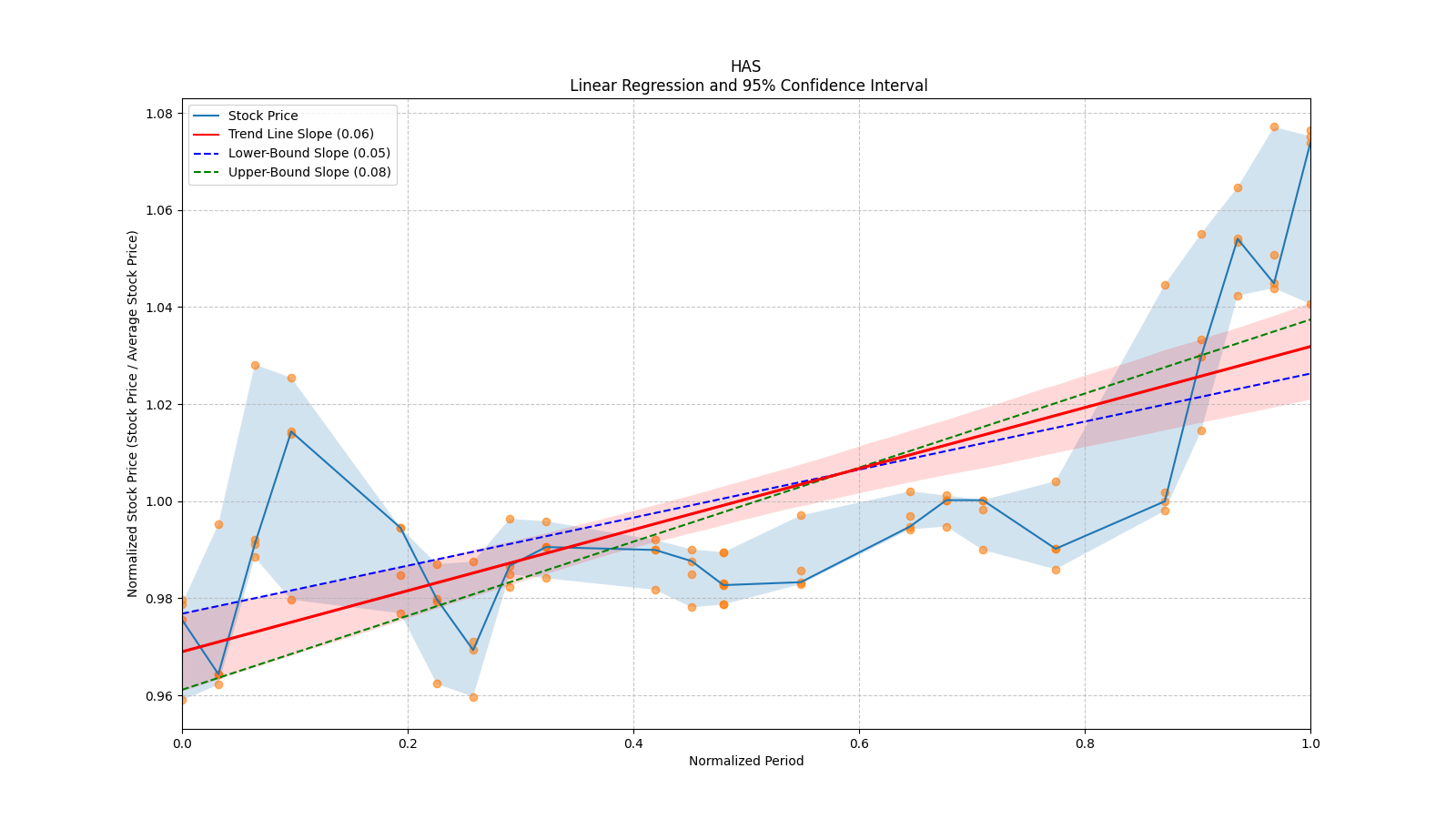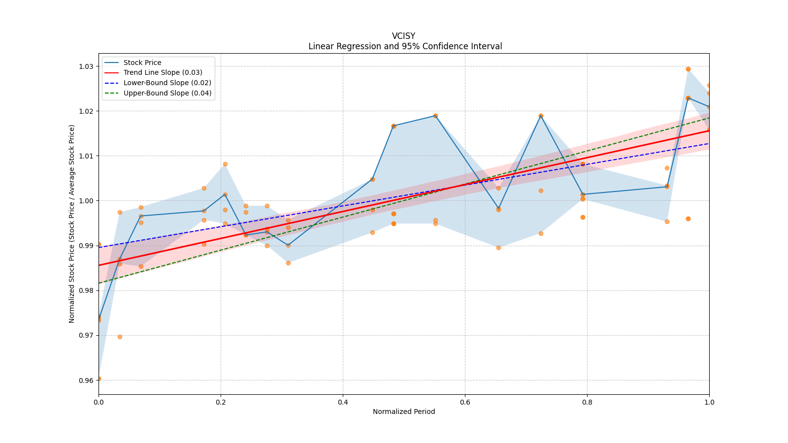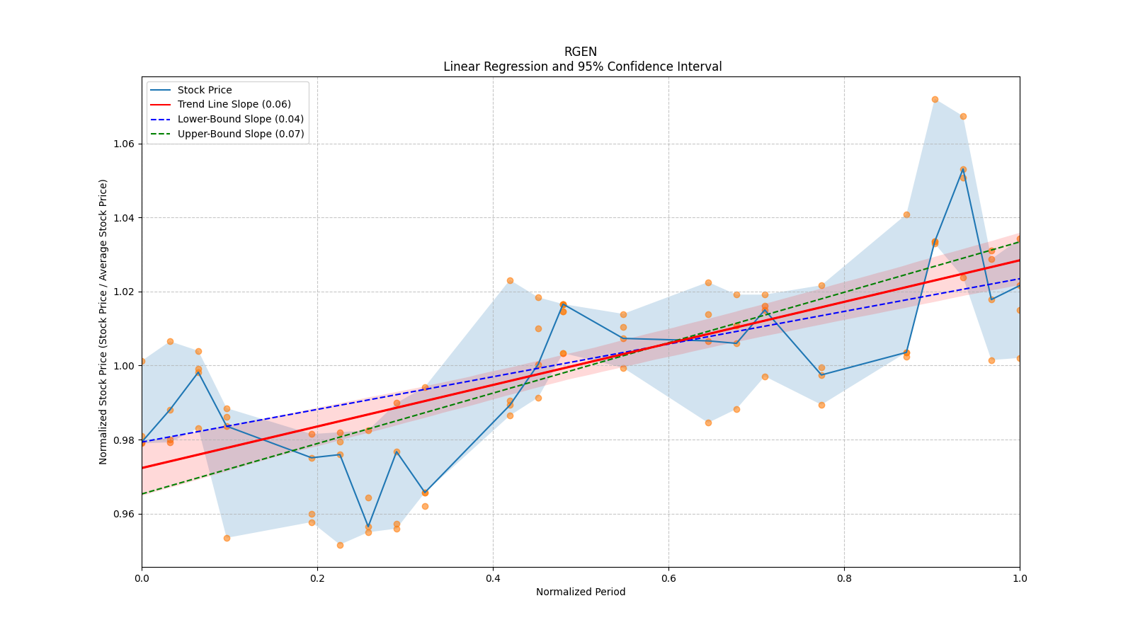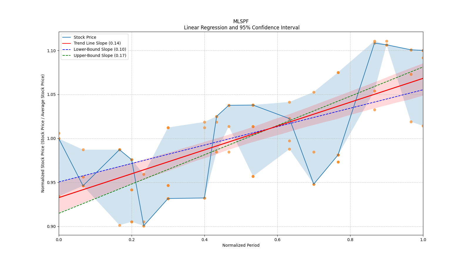Stocks were filtered to have a high investor grade, analyzed using linear regression, and sorted by the lower-bound trendline slope. The lower-bound trendline slope has been normalized by the average stock price and calculated using a 95% confidence interval. This statistic provides a conservative estimate of stock price percentage growth, taking into account both the trends and volatility of the stock price over the past month. With these details, you can easily compare stocks by their historical performance.