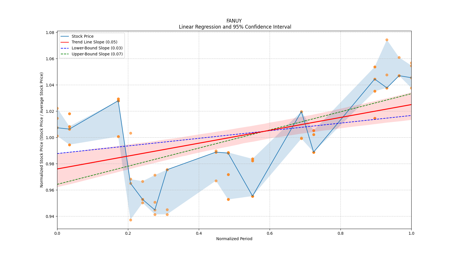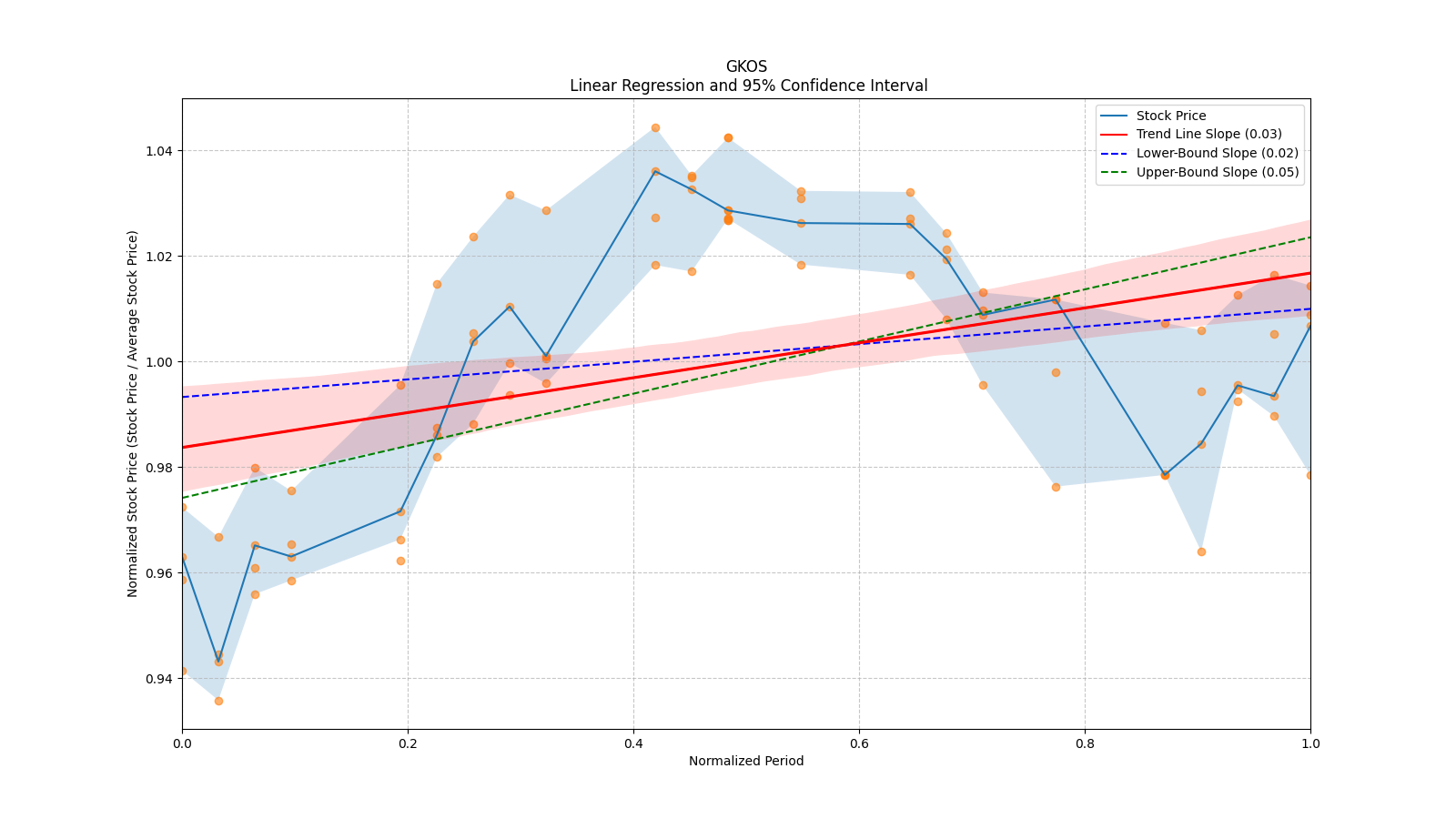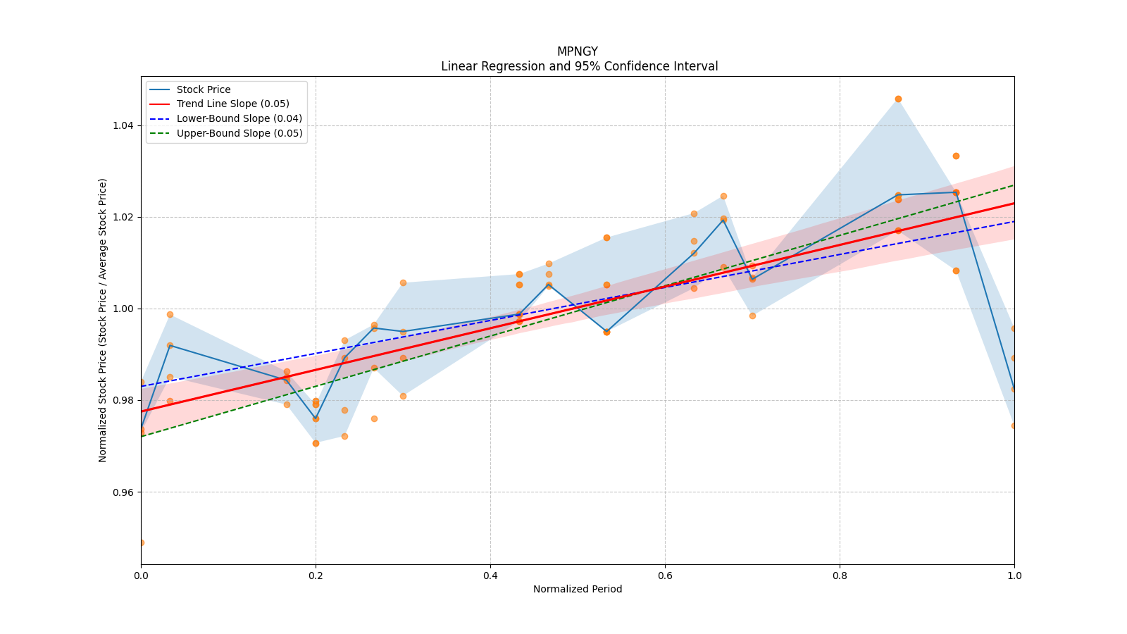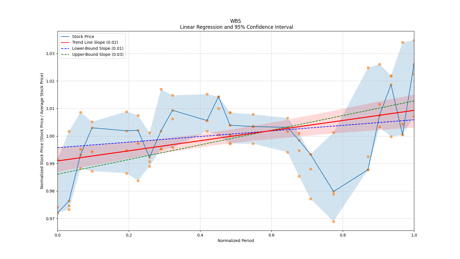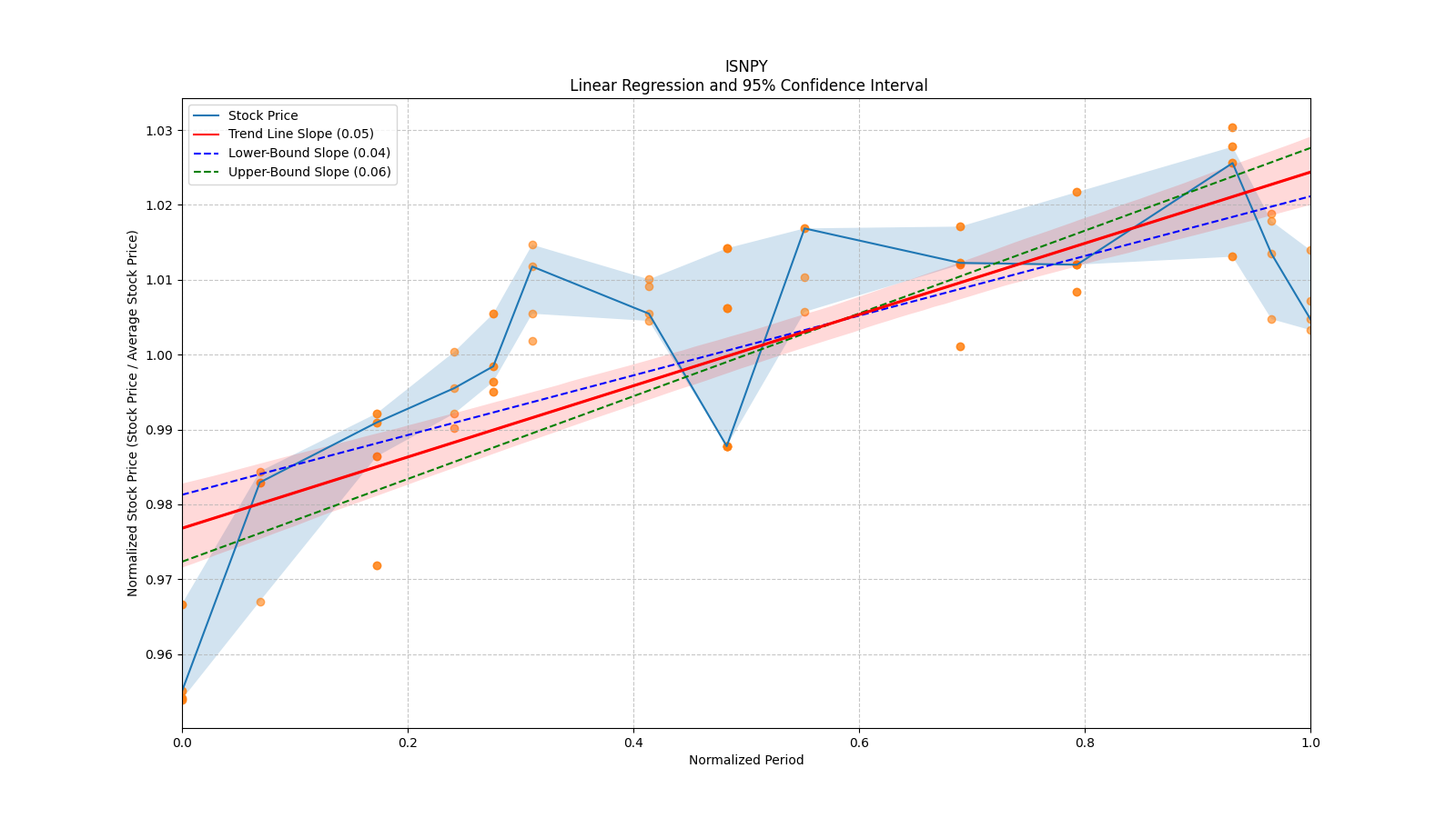 Stocks were filtered to have a high investor grade, analyzed using linear regression, and sorted by the lower-bound trendline slope. The lower-bound trendline slope has been normalized by the average stock price and calculated using a 95% confidence interval. This statistic provides a conservative estimate of stock price percentage growth, taking into account both the trends and volatility of the stock price over the past month. With these details, you can easily compare stocks by their historical performance.