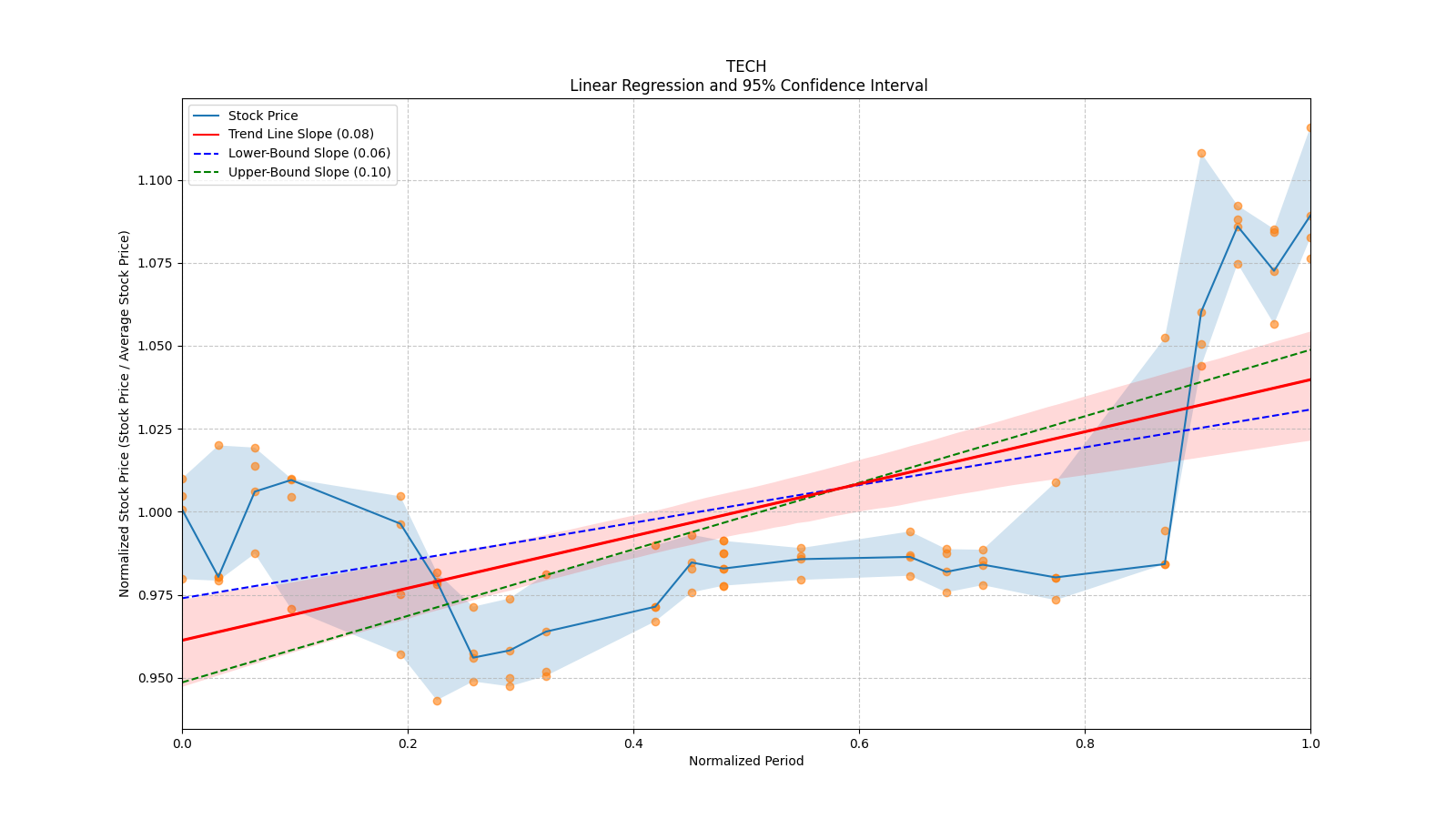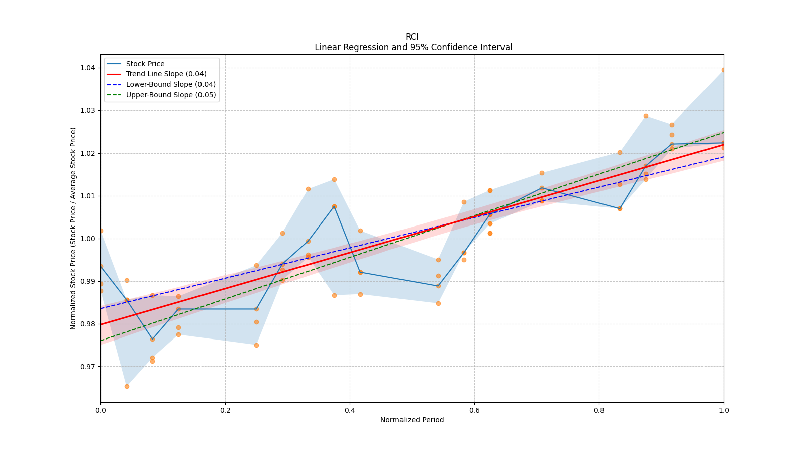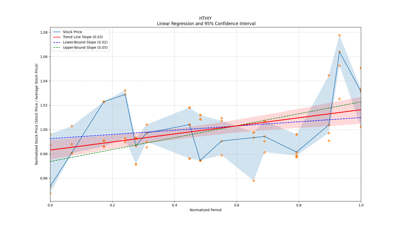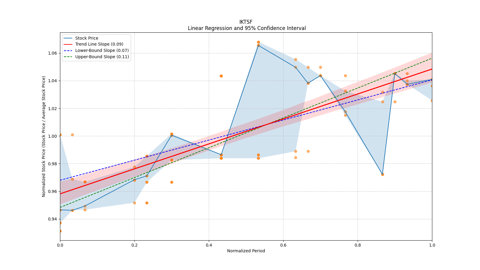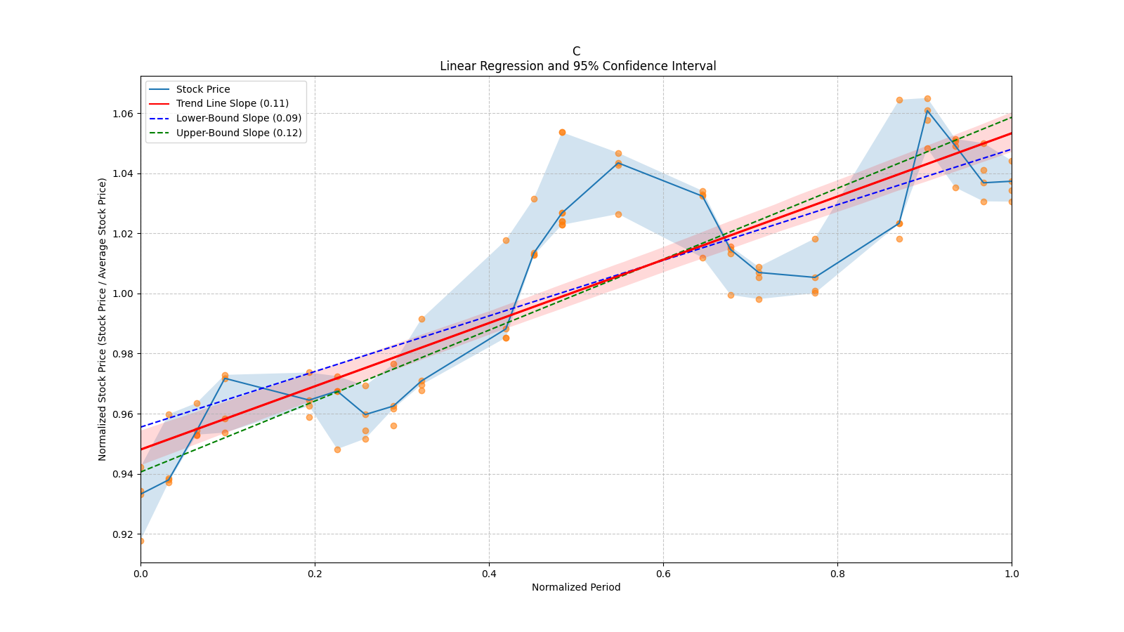 Stocks were filtered to have a high investor grade, analyzed using linear regression, and sorted by the lower-bound trendline slope. The lower-bound trendline slope has been normalized by the average stock price and calculated using a 95% confidence interval. This statistic provides a conservative estimate of stock price percentage growth, taking into account both the trends and volatility of the stock price over the past month. With these details, you can easily compare stocks by their historical performance.