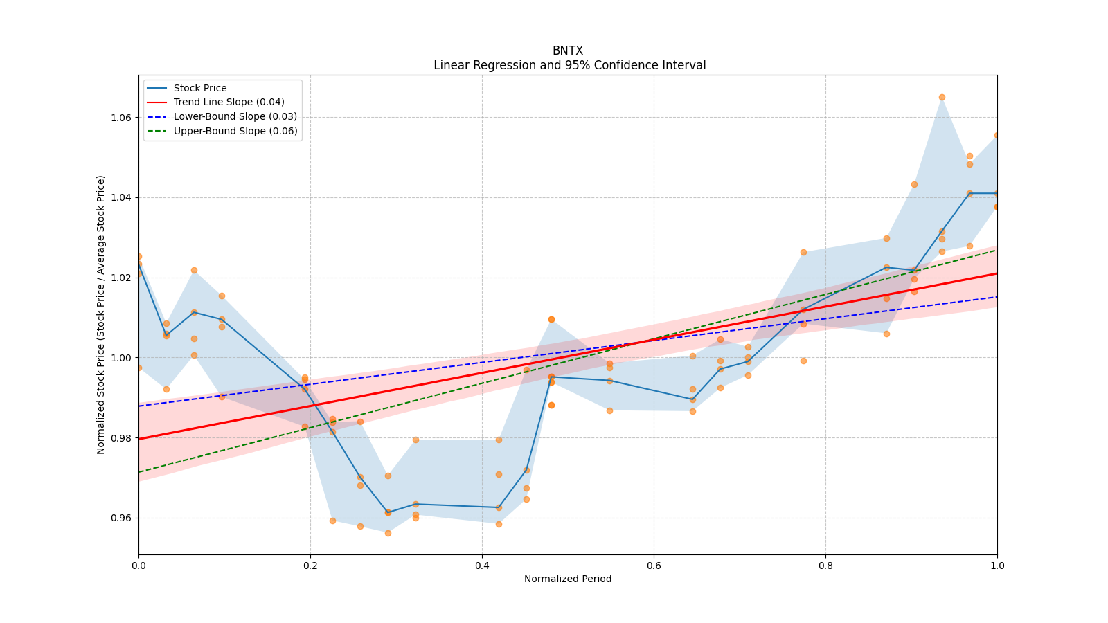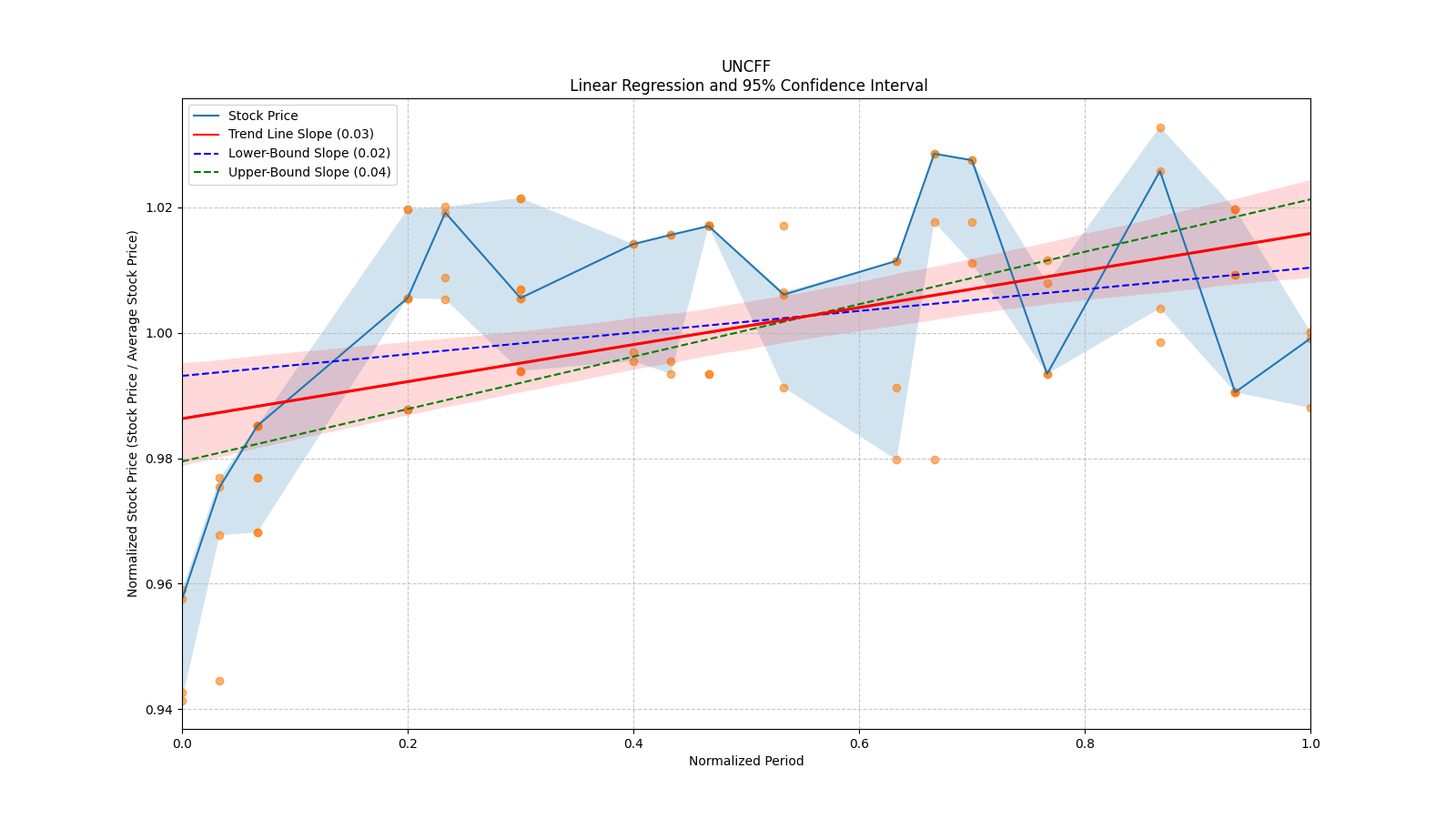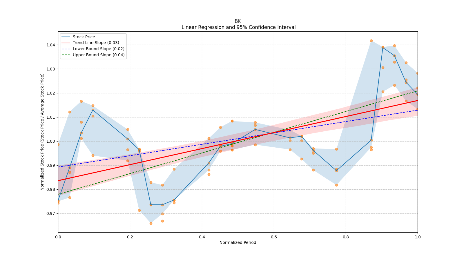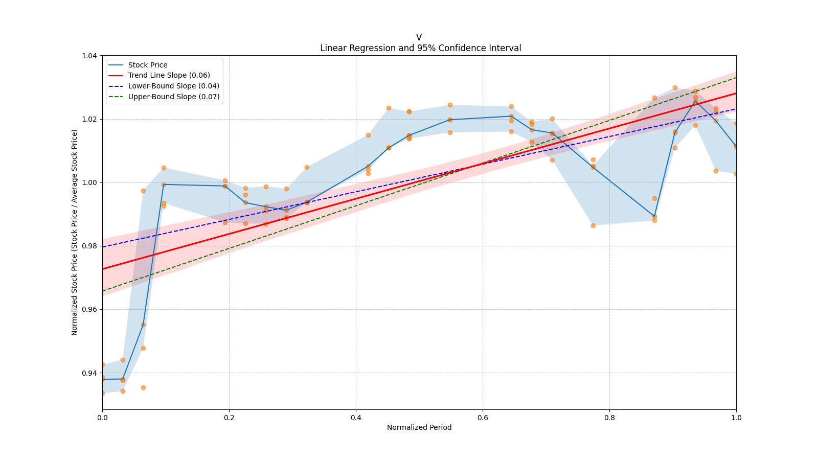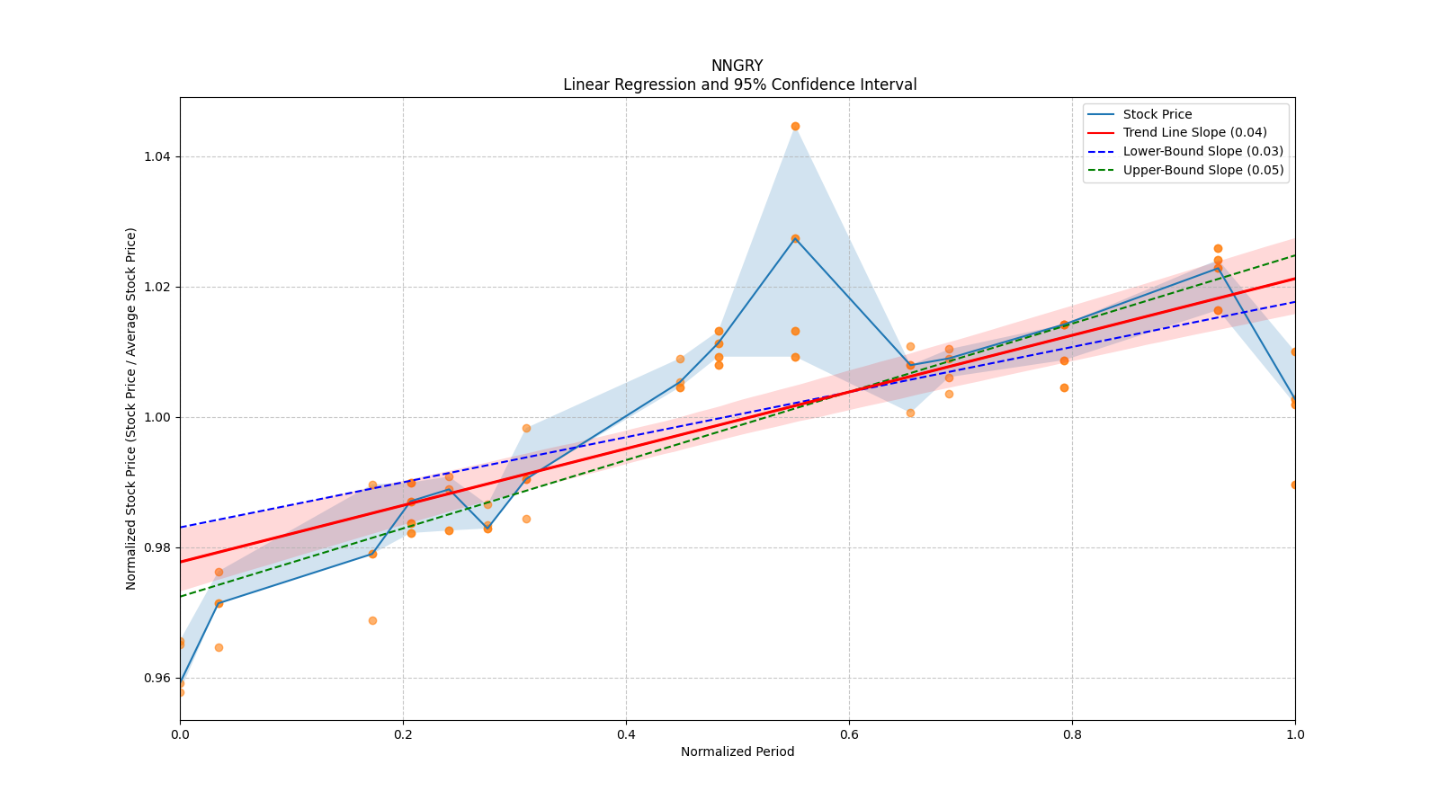 Stocks were filtered to have a high investor grade, analyzed using linear regression, and sorted by the lower-bound trendline slope. The lower-bound trendline slope has been normalized by the average stock price and calculated using a 95% confidence interval. This statistic provides a conservative estimate of stock price percentage growth, taking into account both the trends and volatility of the stock price over the past month. With these details, you can easily compare stocks by their historical performance.