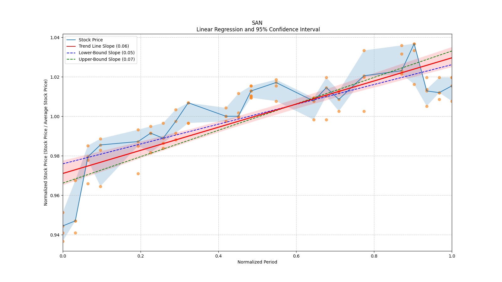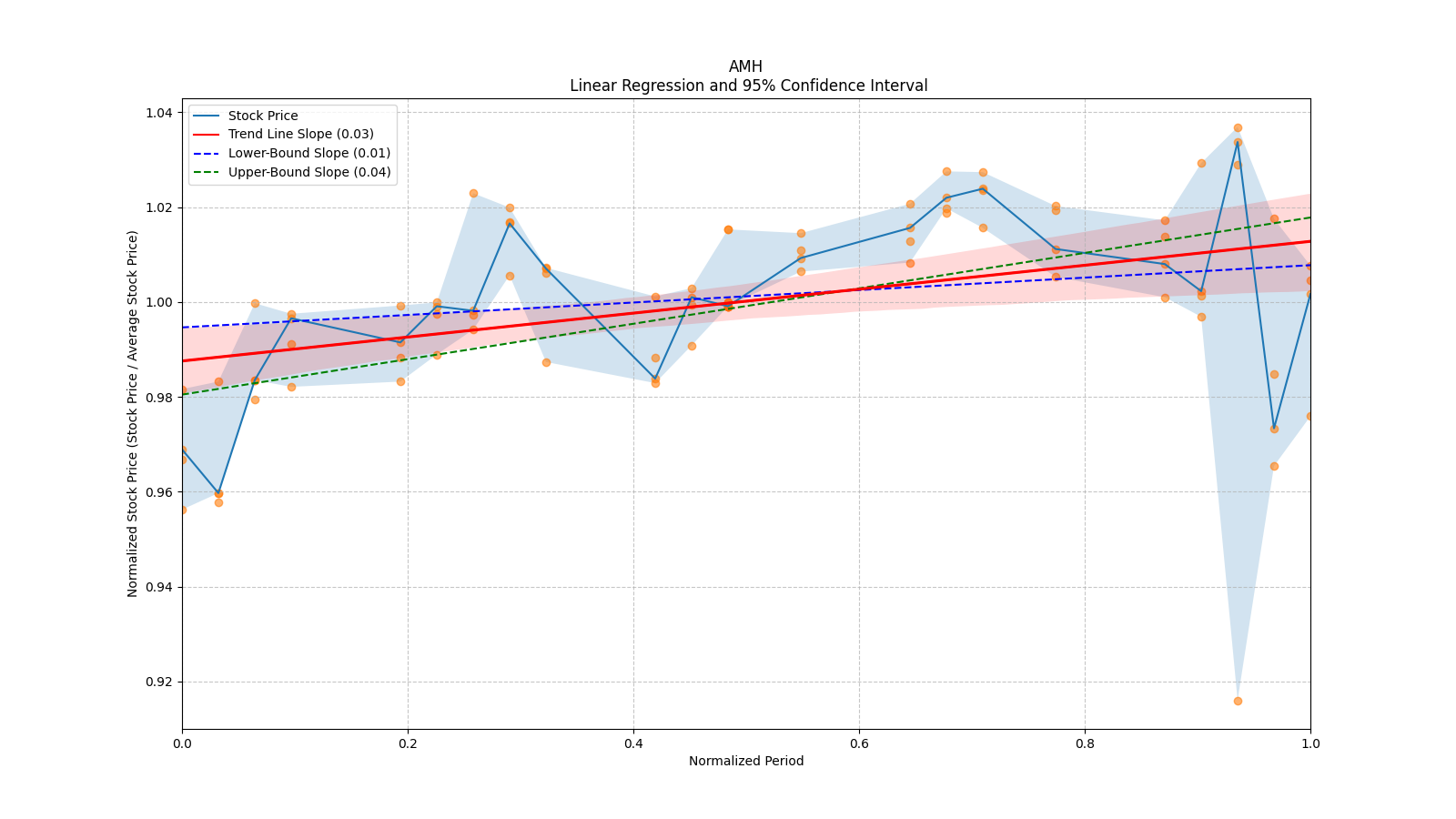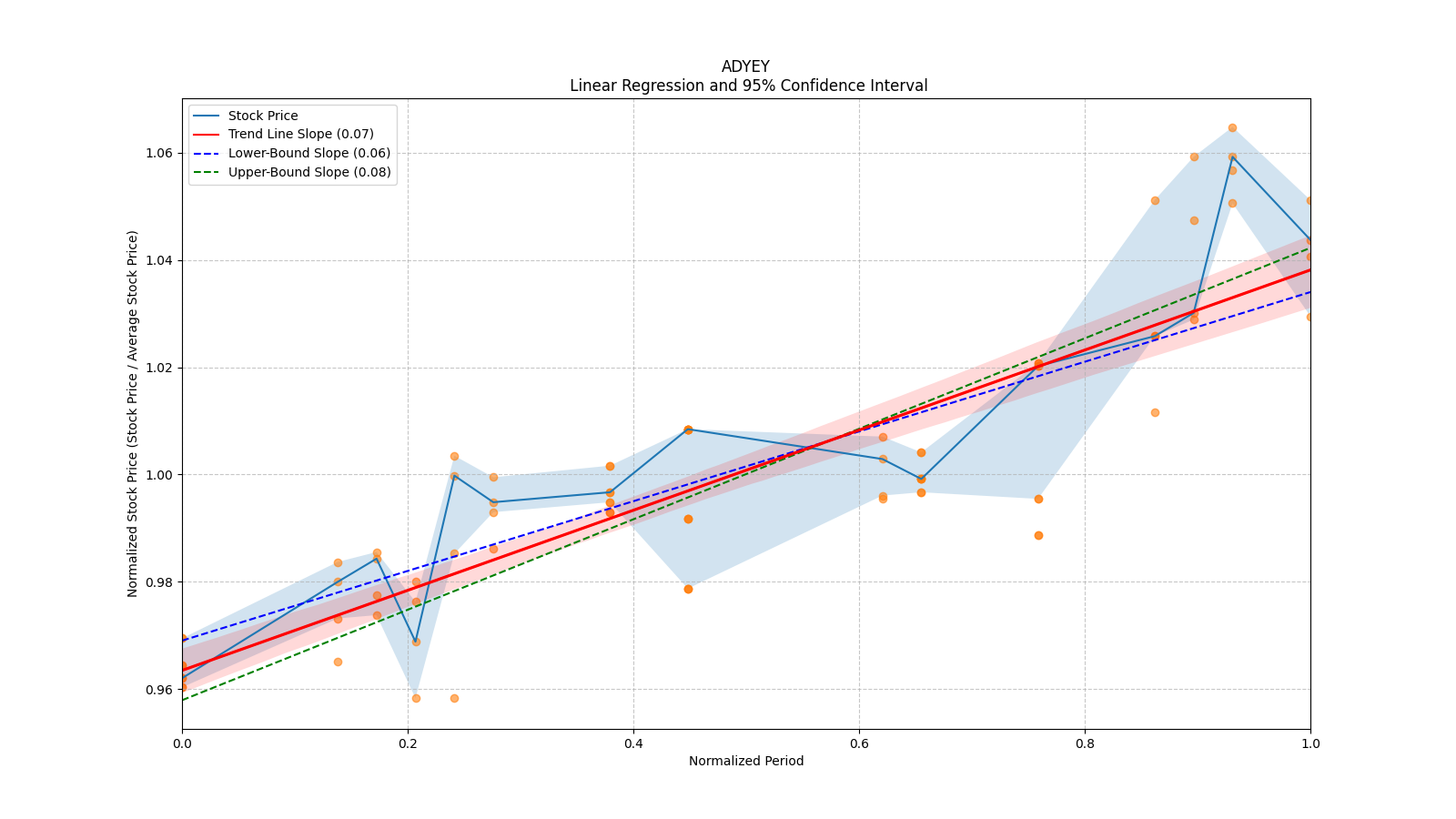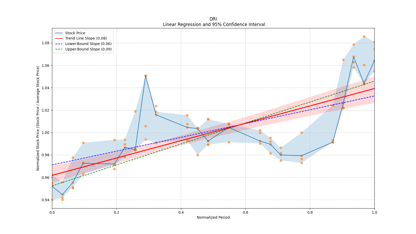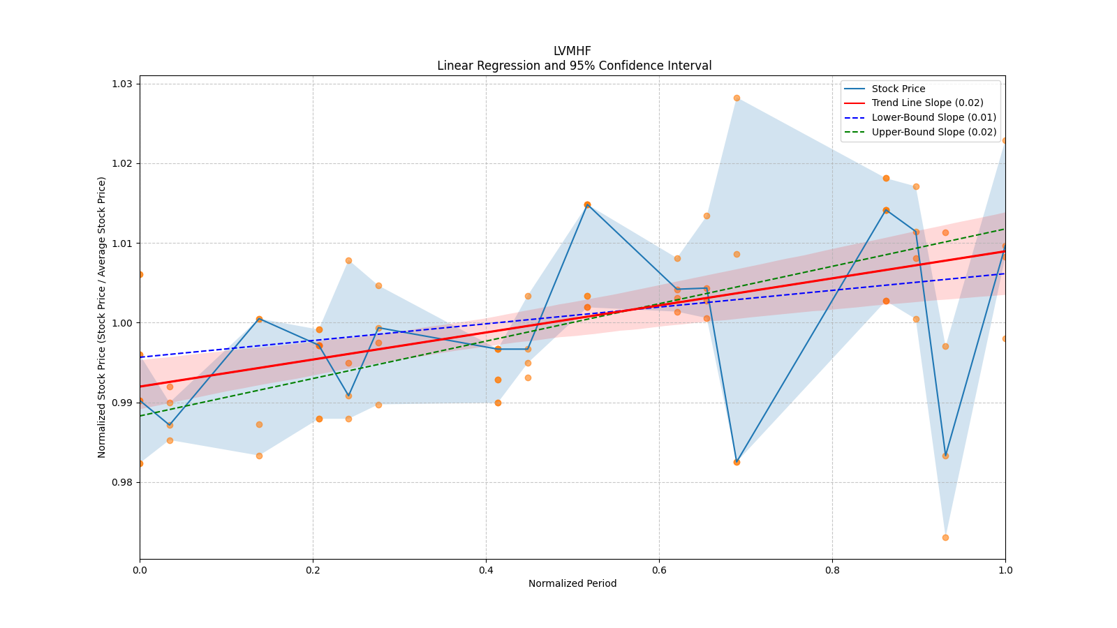 Stocks were filtered to have a high investor grade, analyzed using linear regression, and sorted by the lower-bound trendline slope. The lower-bound trendline slope has been normalized by the average stock price and calculated using a 95% confidence interval. This statistic provides a conservative estimate of stock price percentage growth, taking into account both the trends and volatility of the stock price over the past month. With these details, you can easily compare stocks by their historical performance.