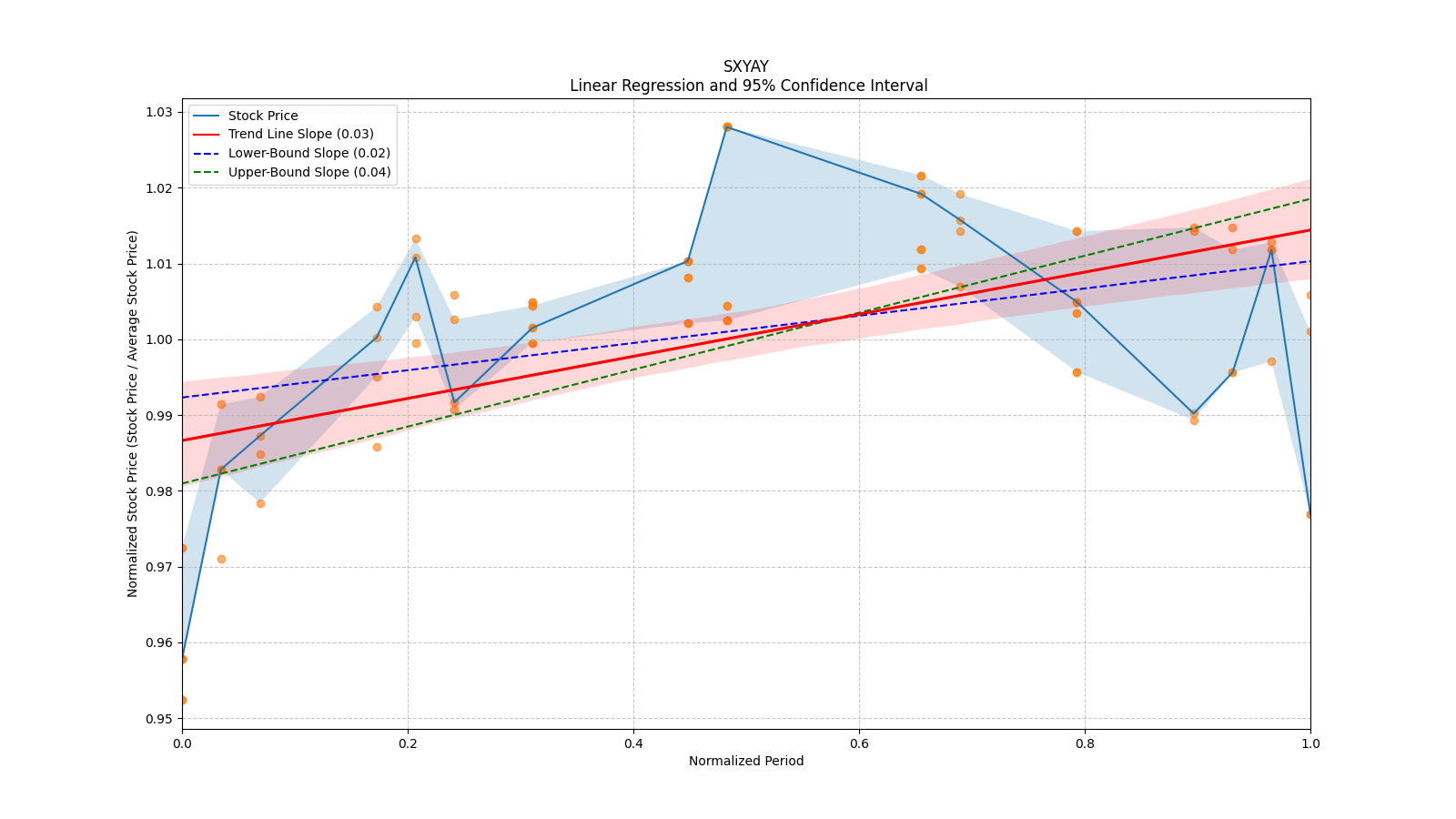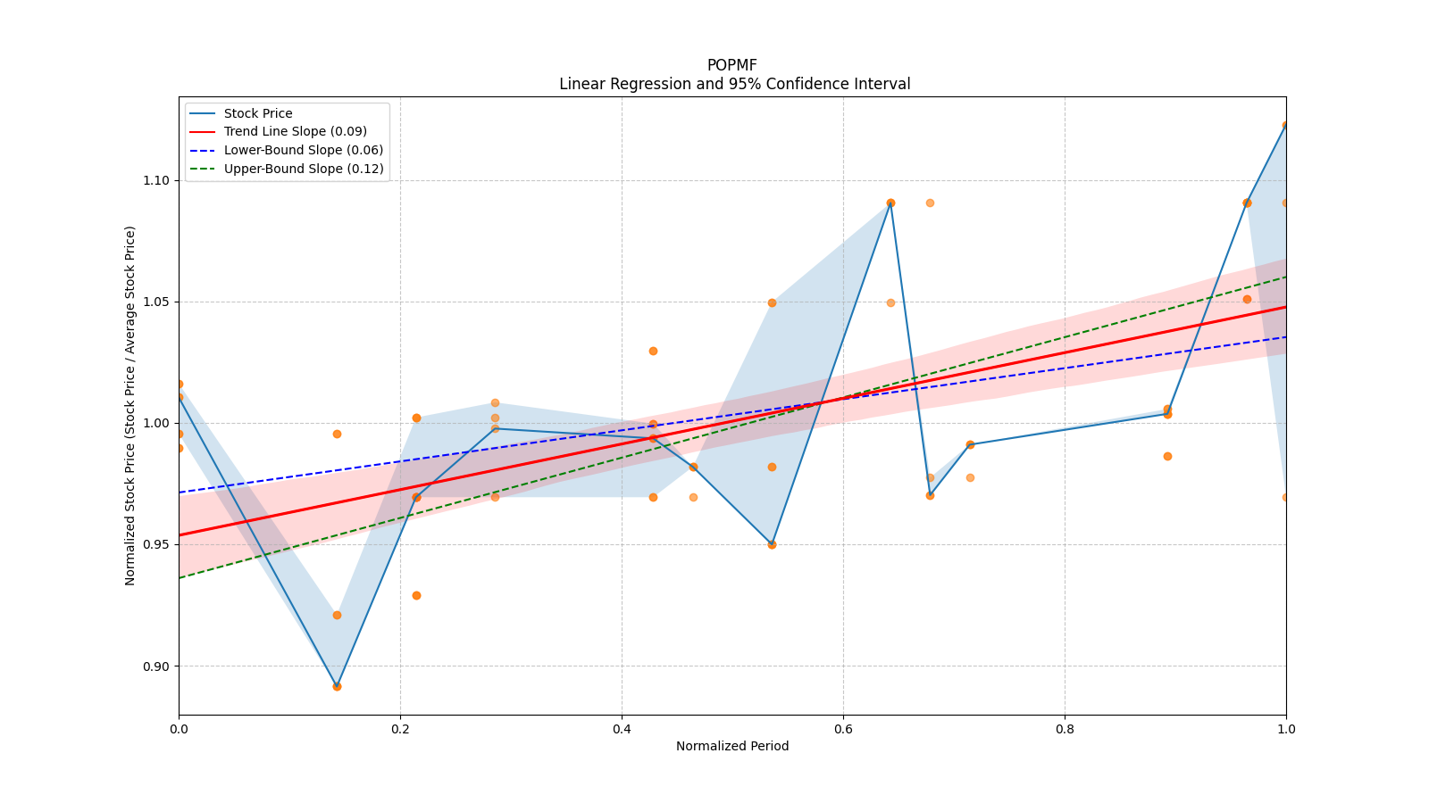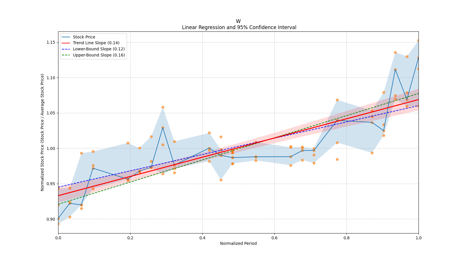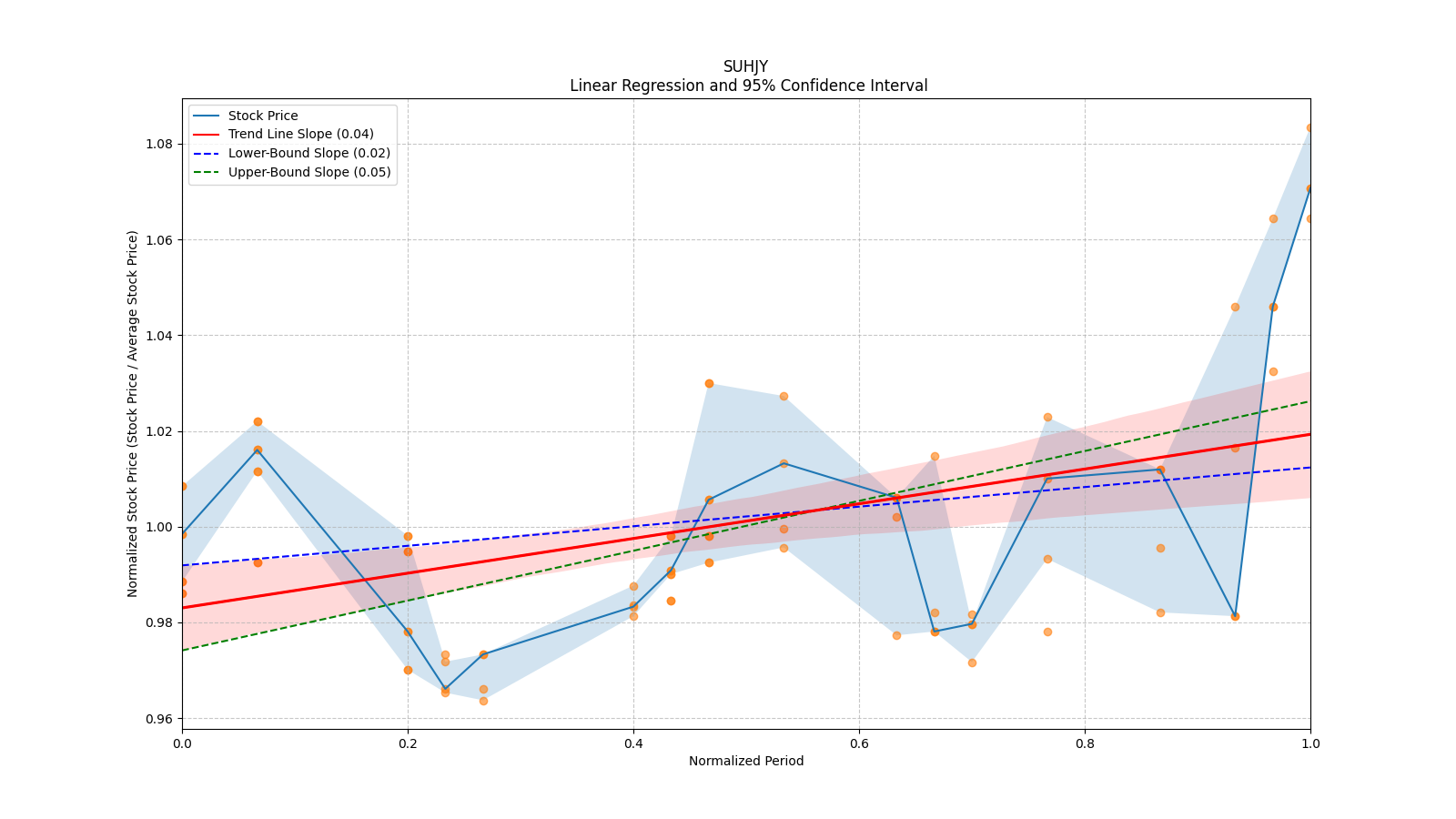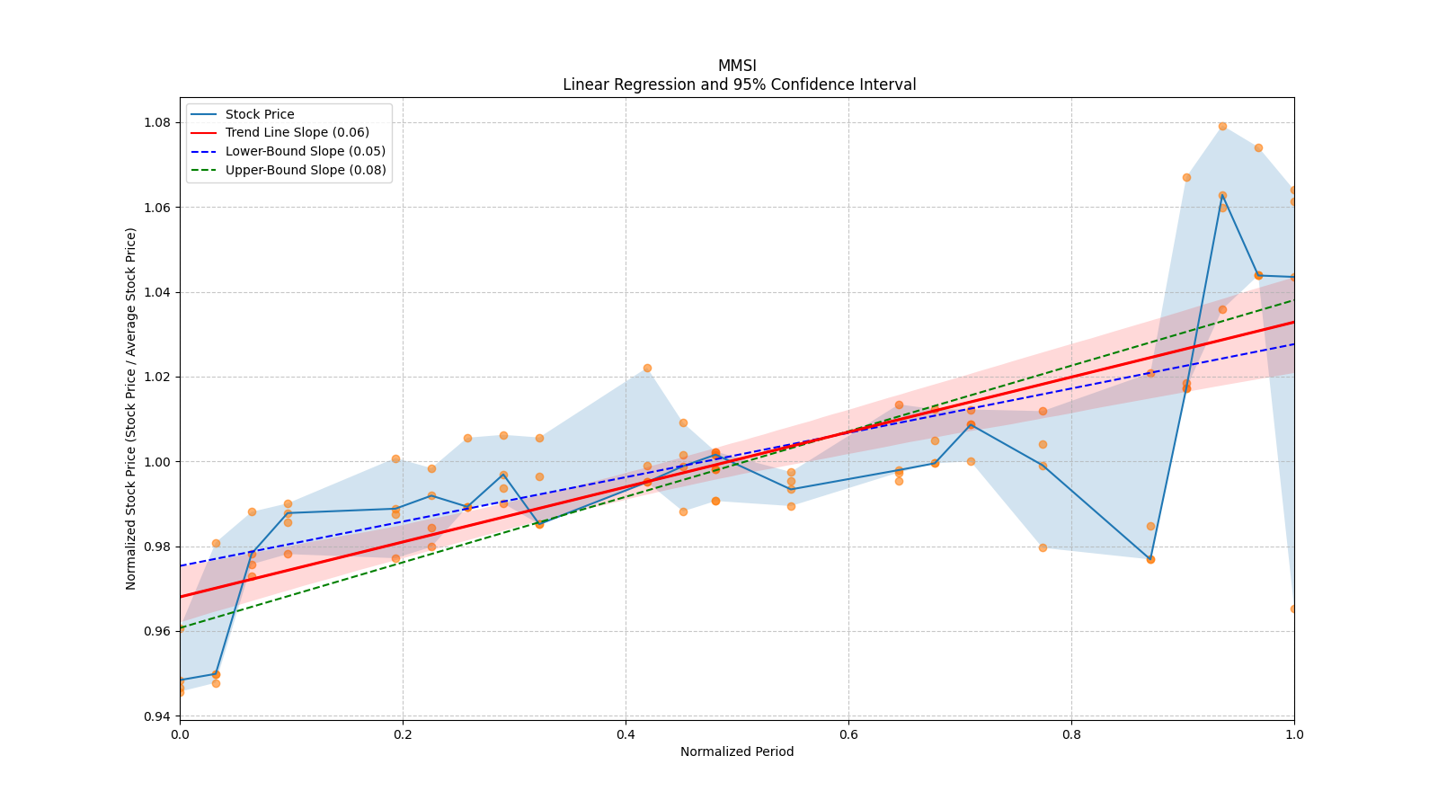 Stocks were filtered to have a high investor grade, analyzed using linear regression, and sorted by the lower-bound trendline slope. The lower-bound trendline slope has been normalized by the average stock price and calculated using a 95% confidence interval. This statistic provides a conservative estimate of stock price percentage growth, taking into account both the trends and volatility of the stock price over the past month. With these details, you can easily compare stocks by their historical performance.
